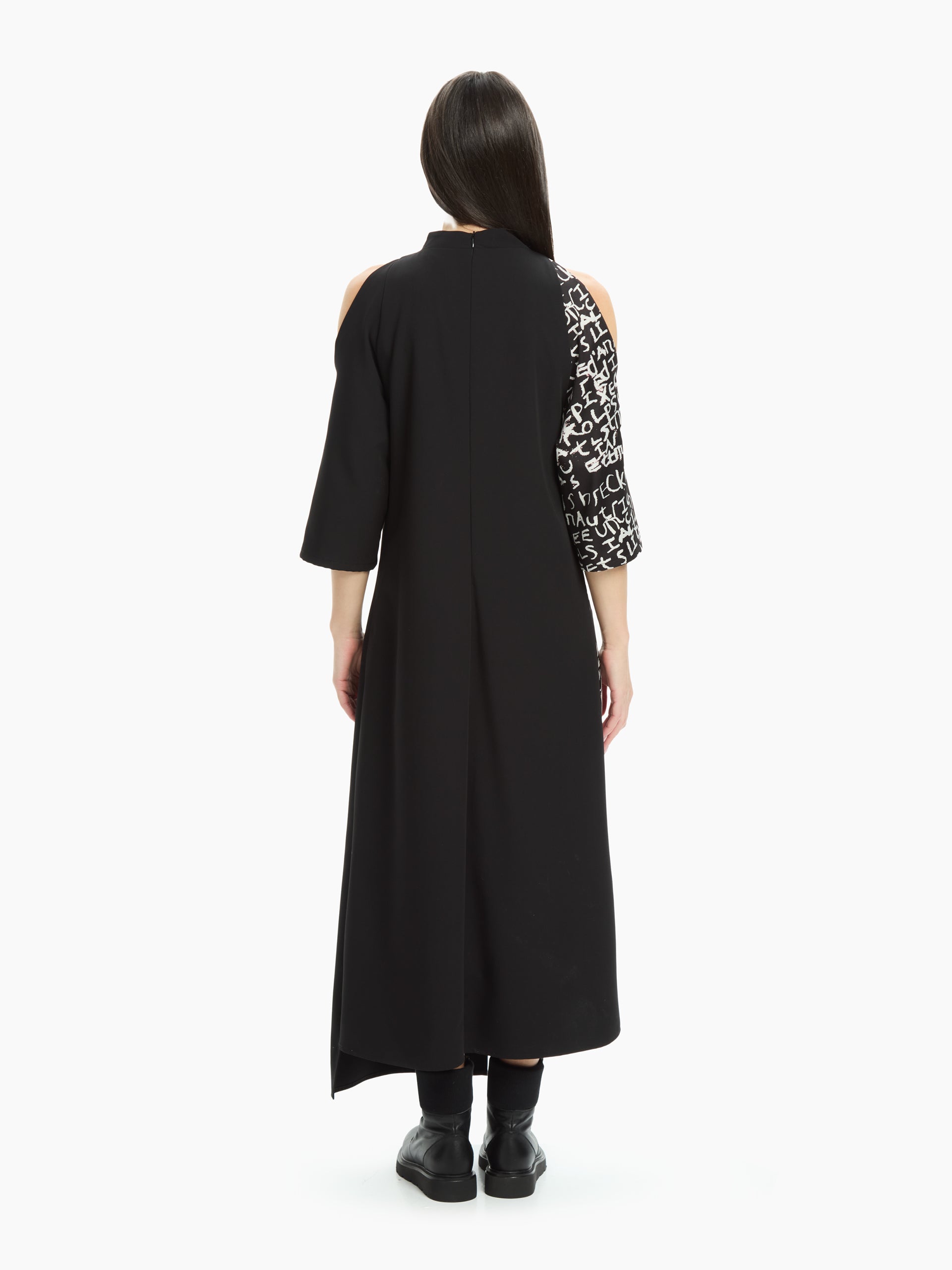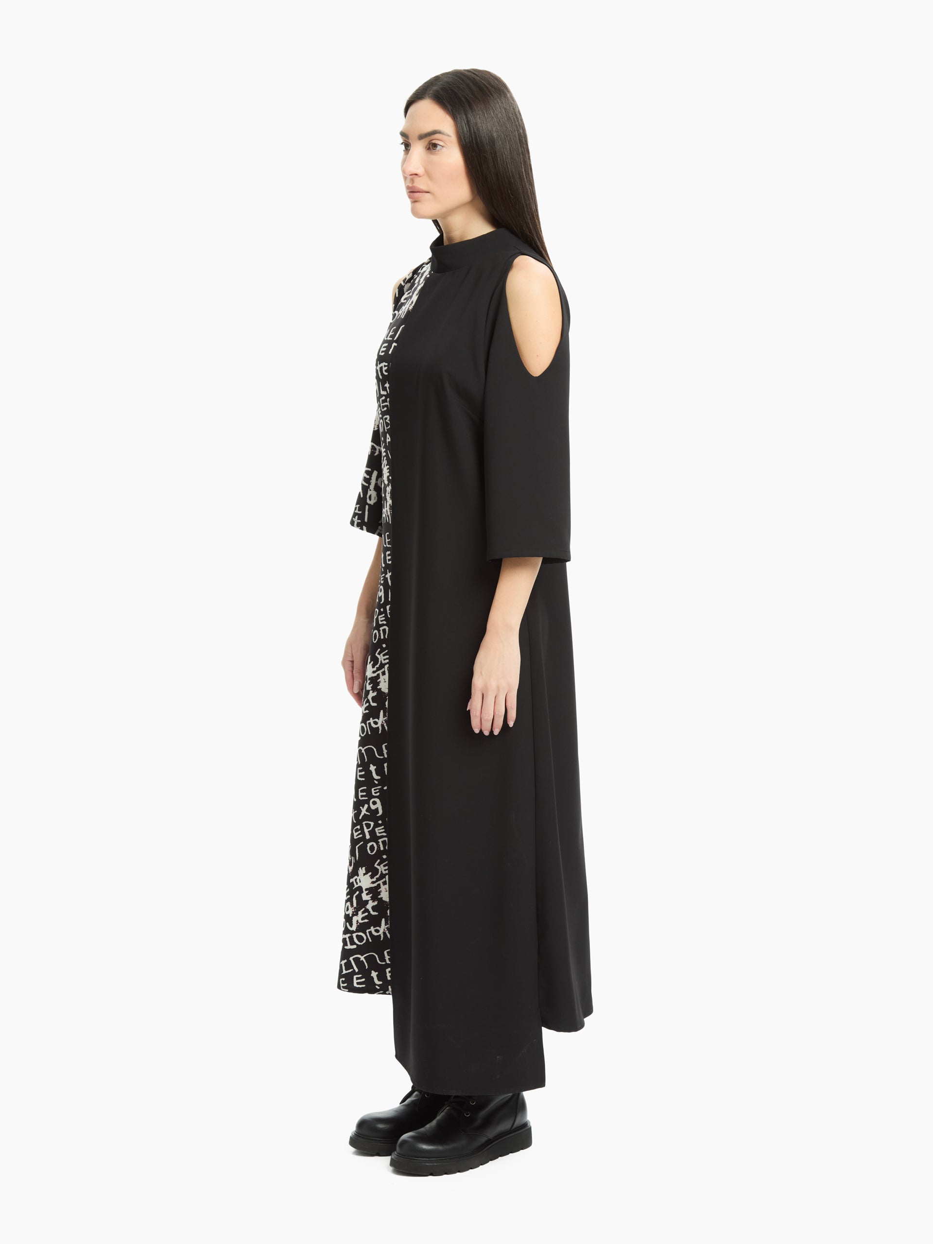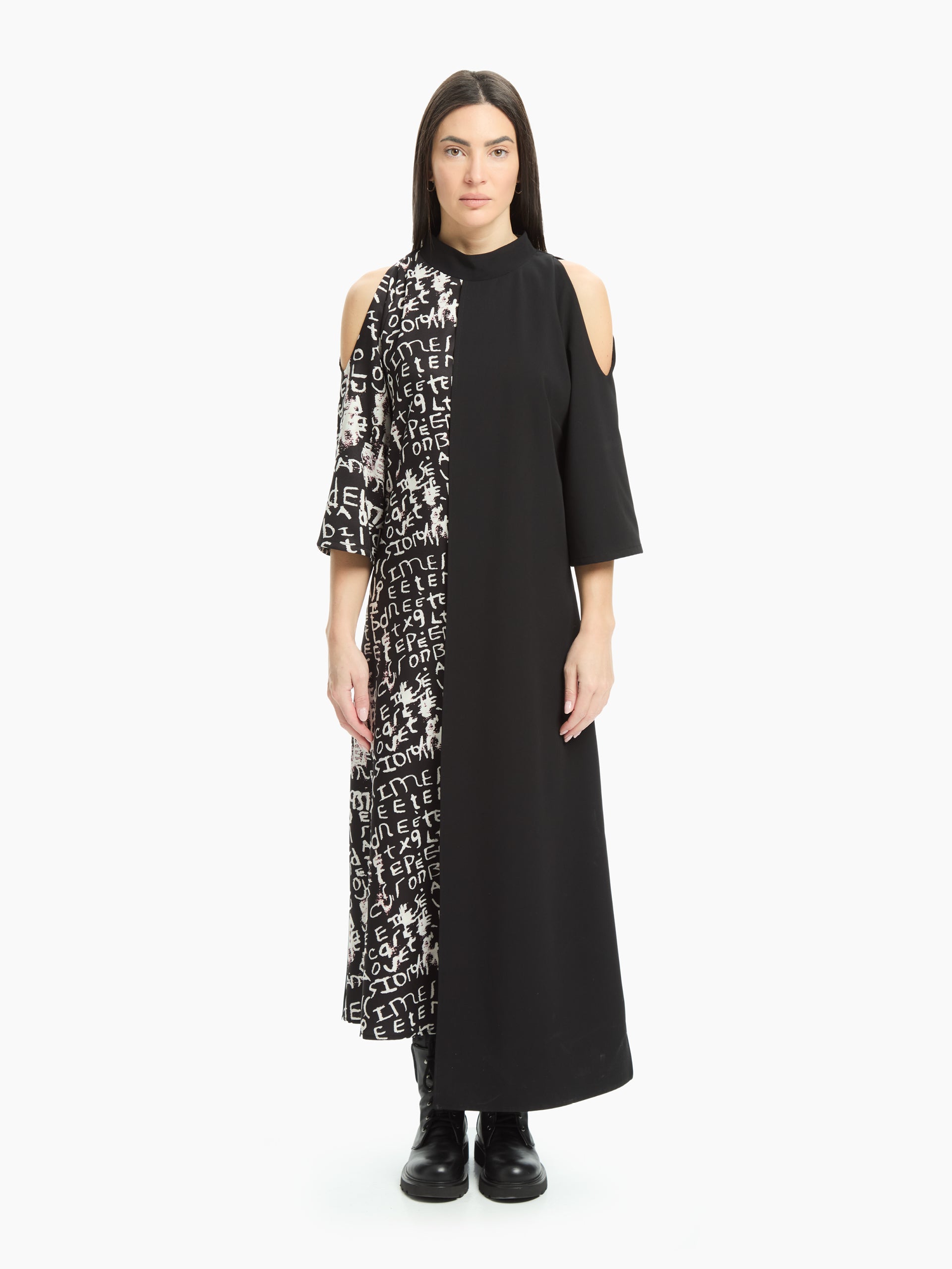 Un abito dal carattere ricercato. La costruzione asimmetrica unisce parti a tinta unita e tinta stampata, creando un contrasto visivo di forte impatto. Le aperture sulle spalle e il collo alto donano un equilibrio tra rigore e femminilità, mentre la linea fluida accompagna il movimento con naturalezza. Un capo dal design distintivo.