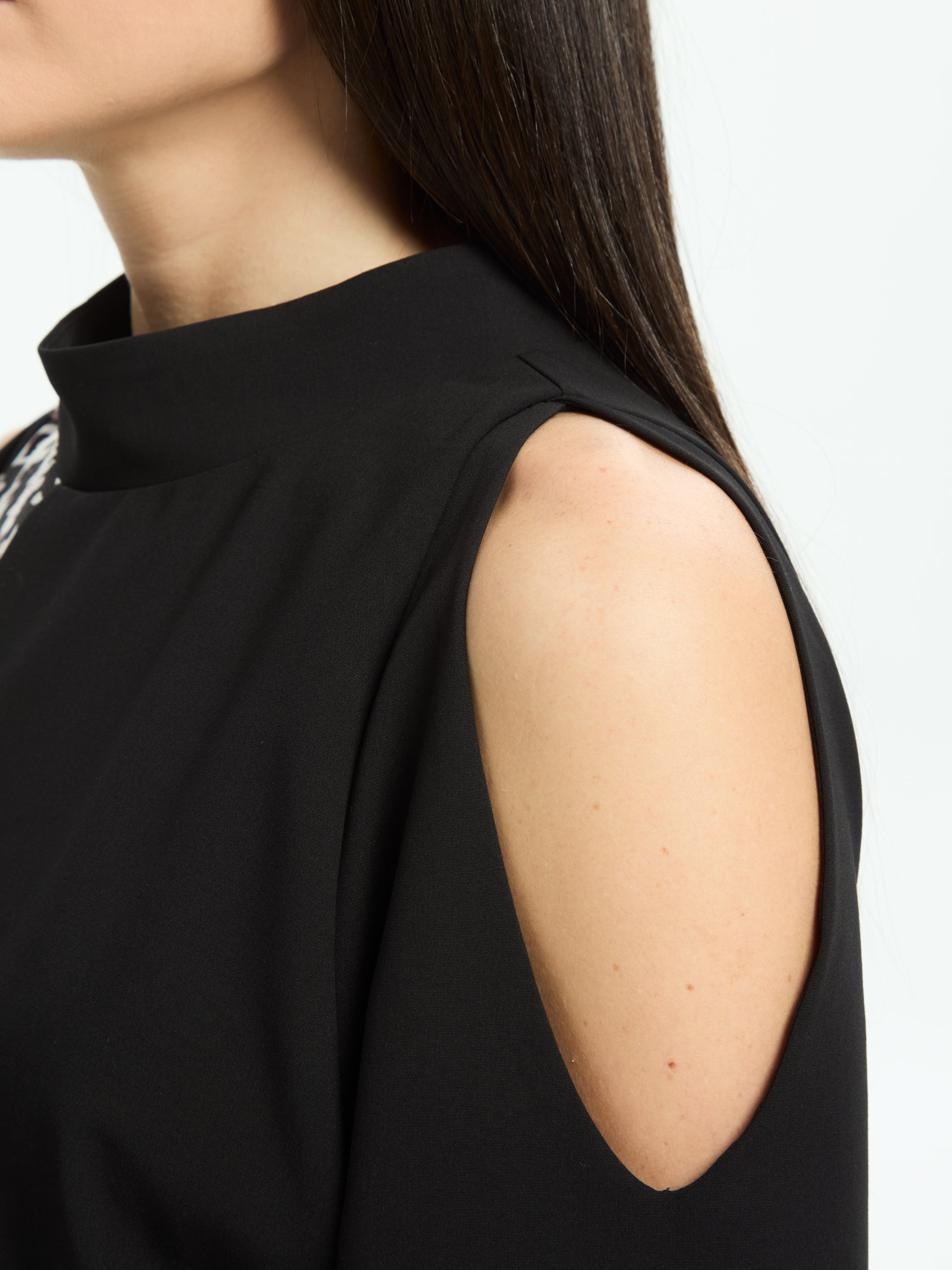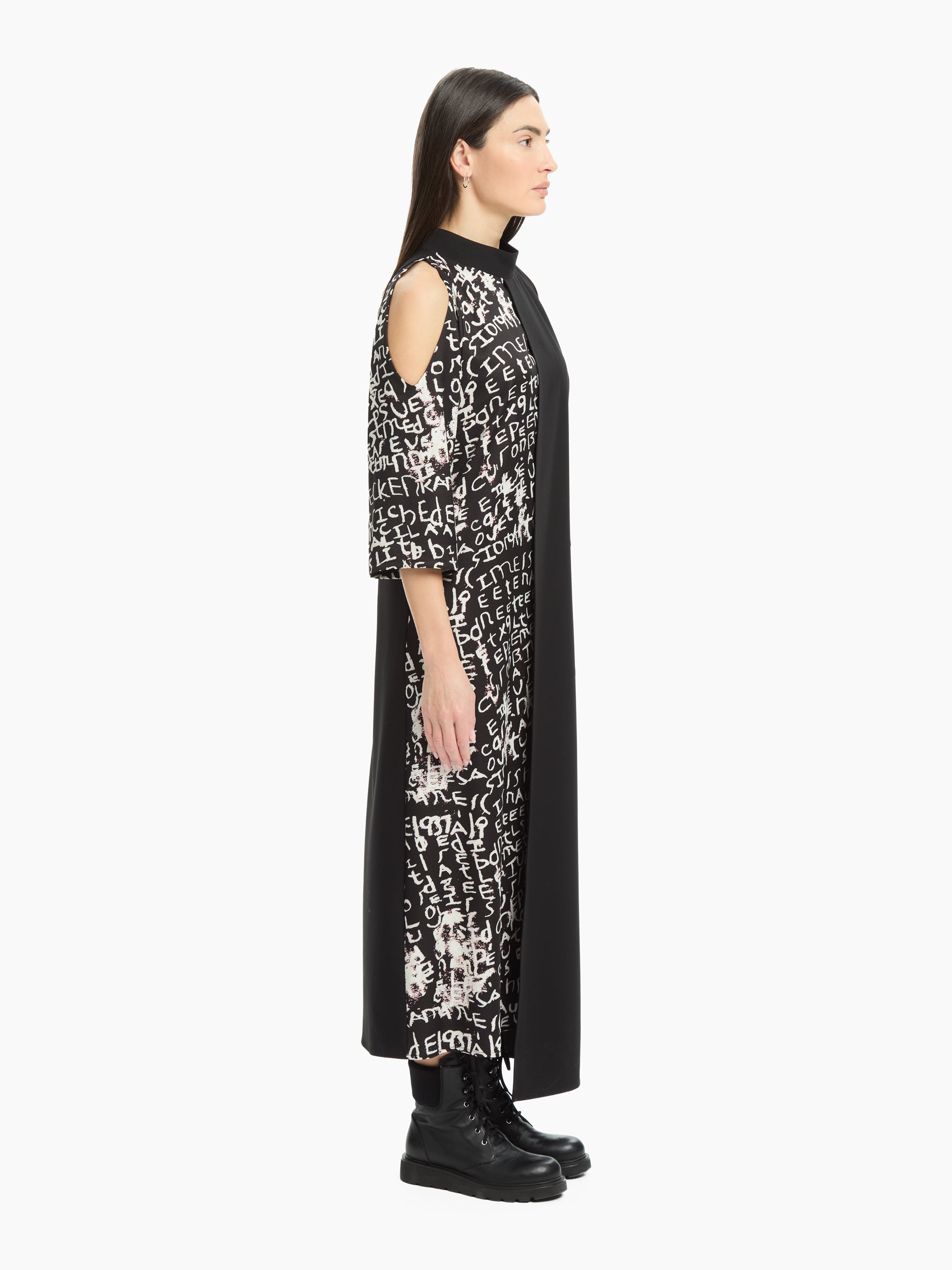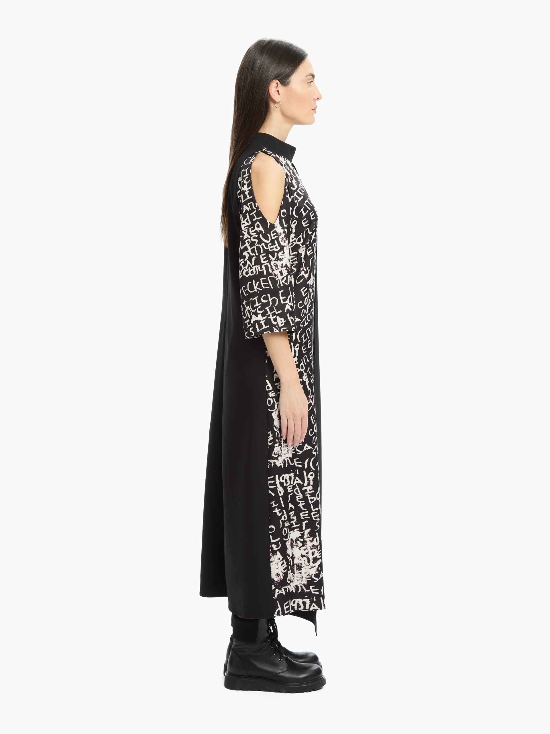 Un abito dal carattere ricercato. La costruzione asimmetrica unisce parti a tinta unita e tinta stampata, creando un contrasto visivo di forte impatto. Le aperture sulle spalle e il collo alto donano un equilibrio tra rigore e femminilità, mentre la linea fluida accompagna il movimento con naturalezza. Un capo dal design distintivo.