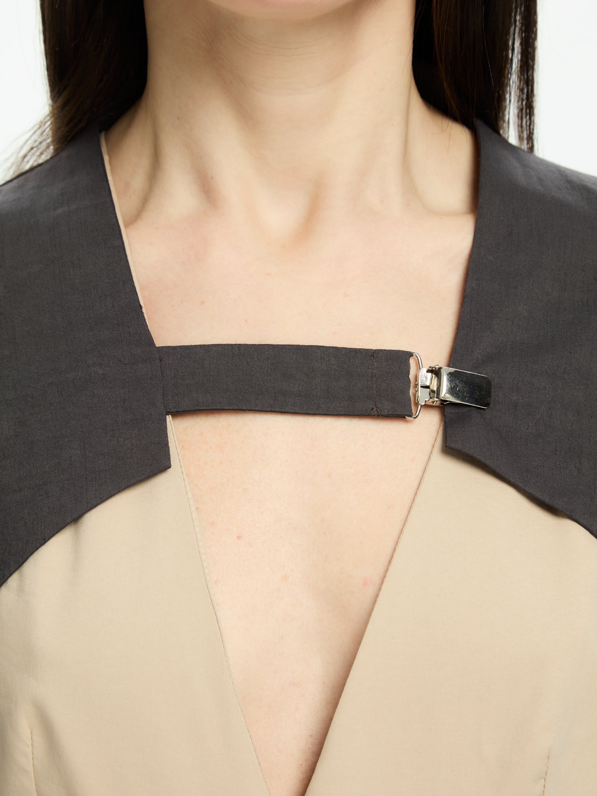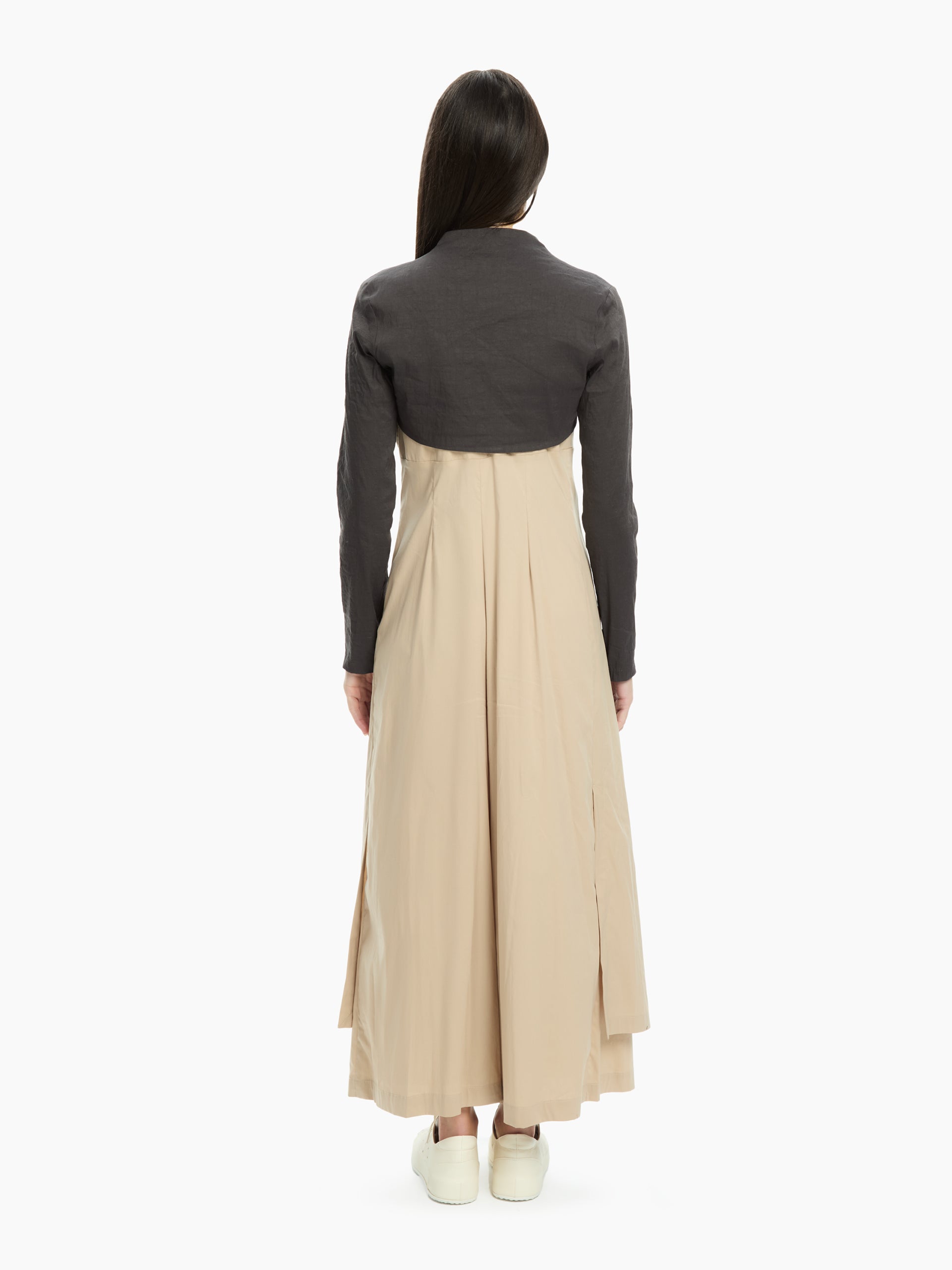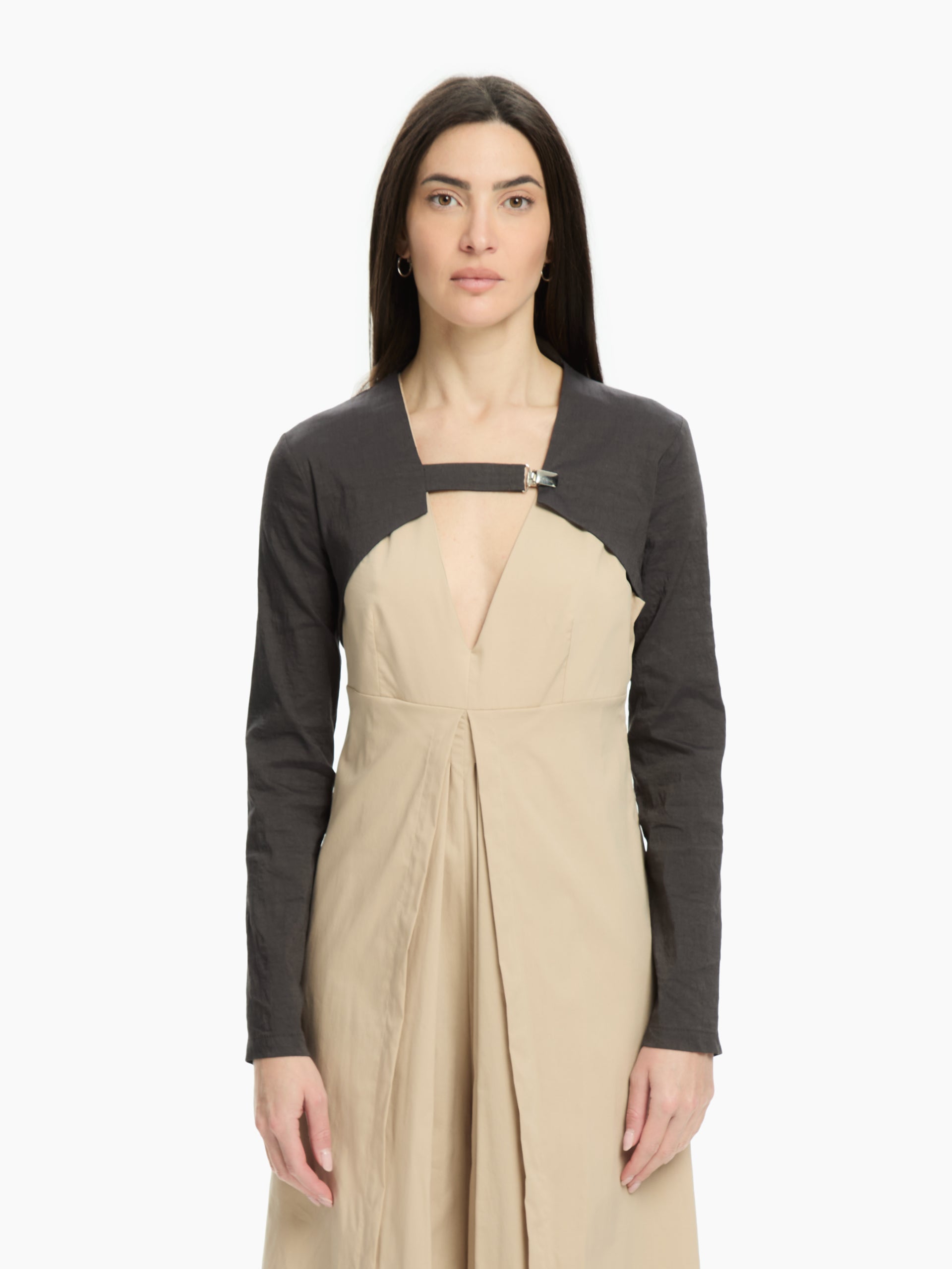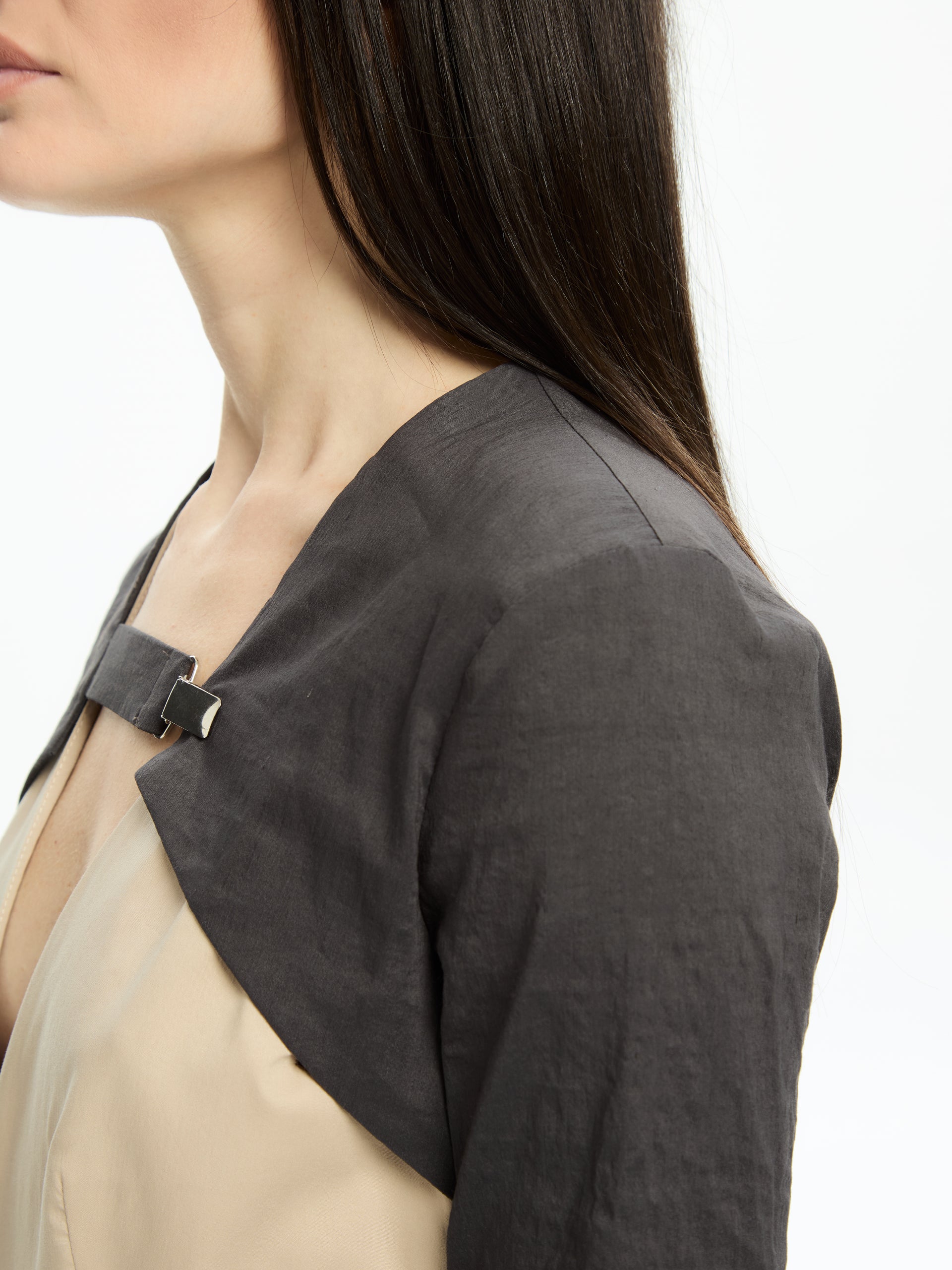 Coprispalla in misto lino e viscosa con linea strutturata e scollo squadrato. Chiusura frontale a clip metallica. Vestibilità regular.