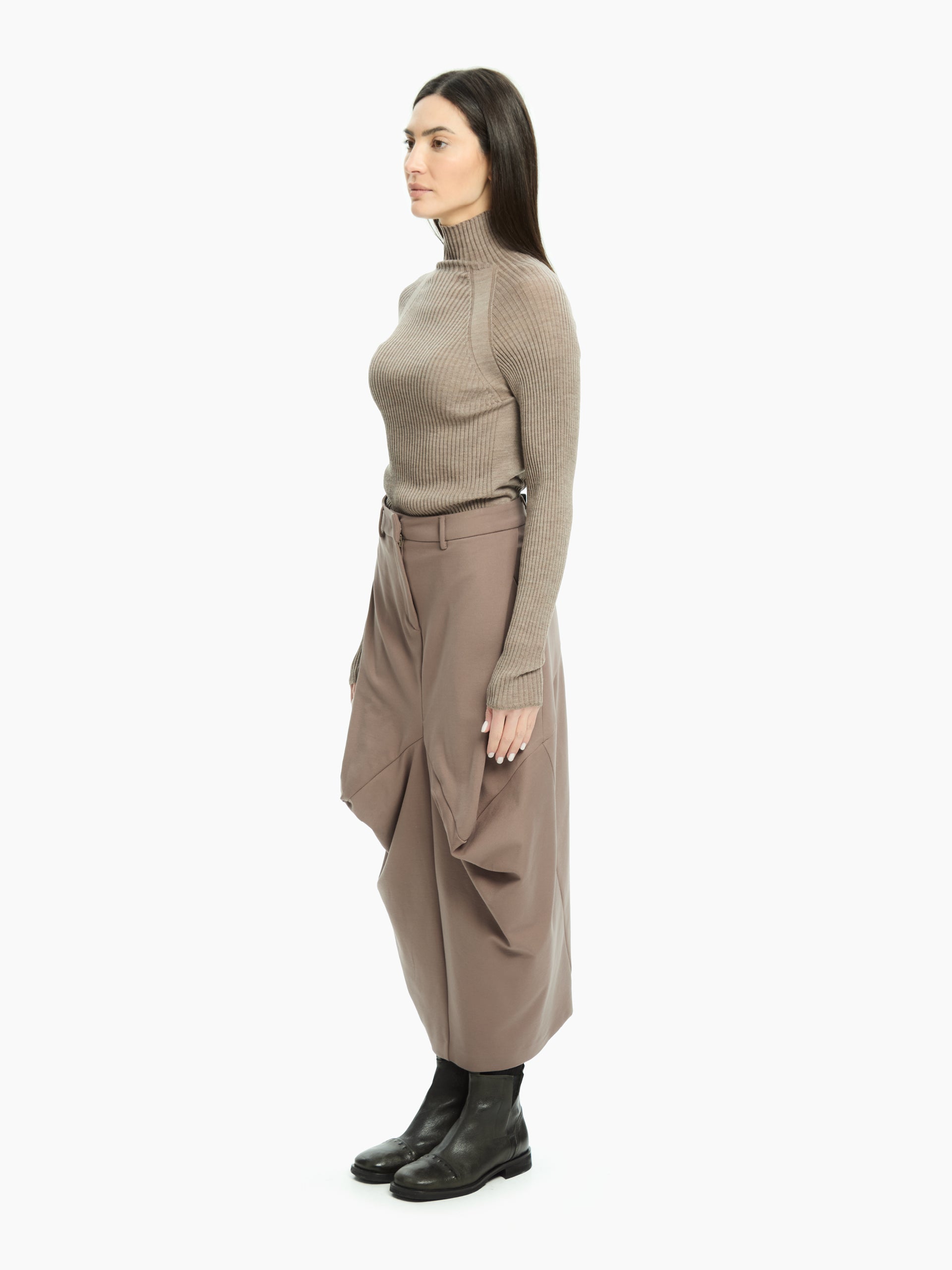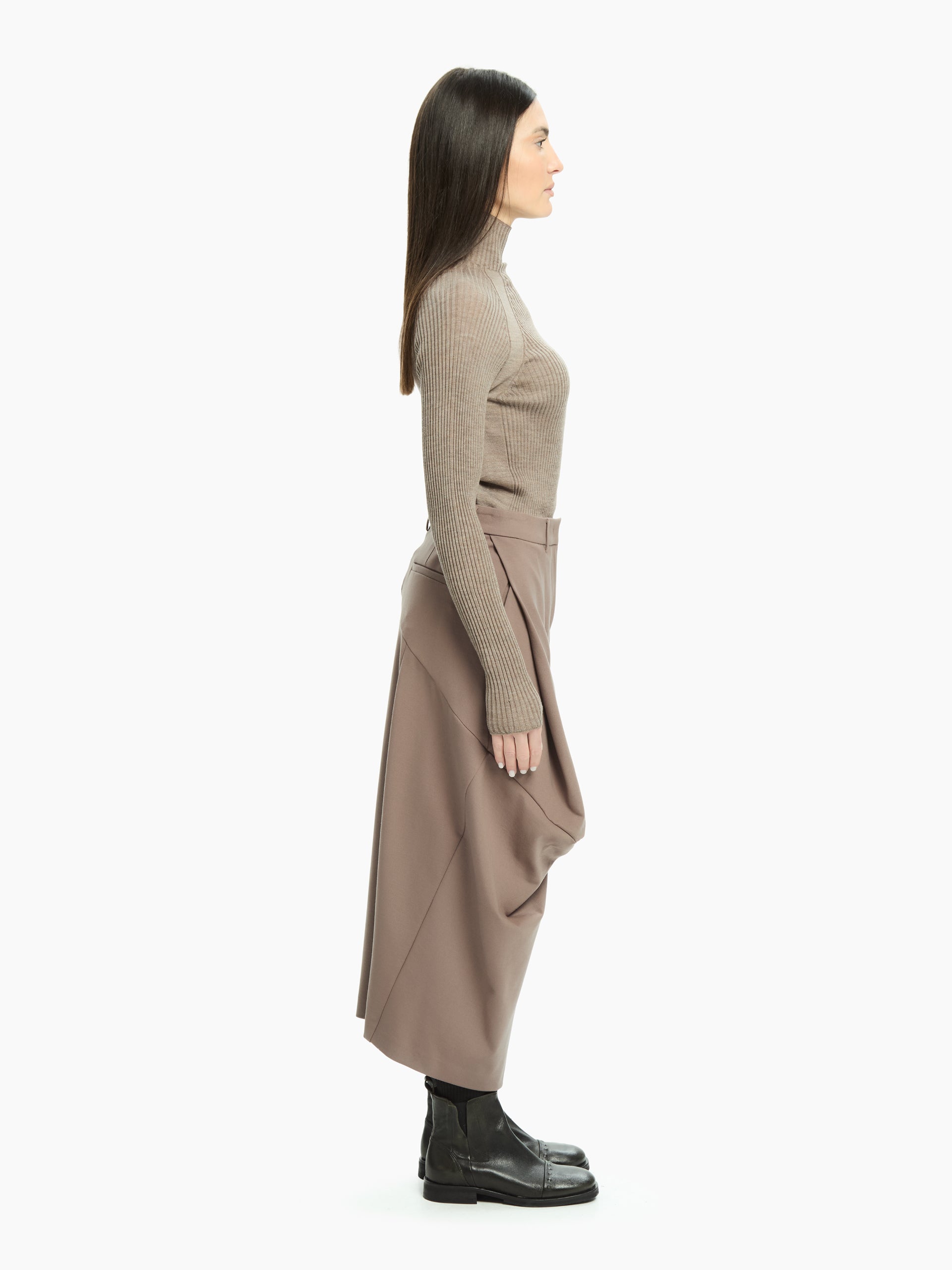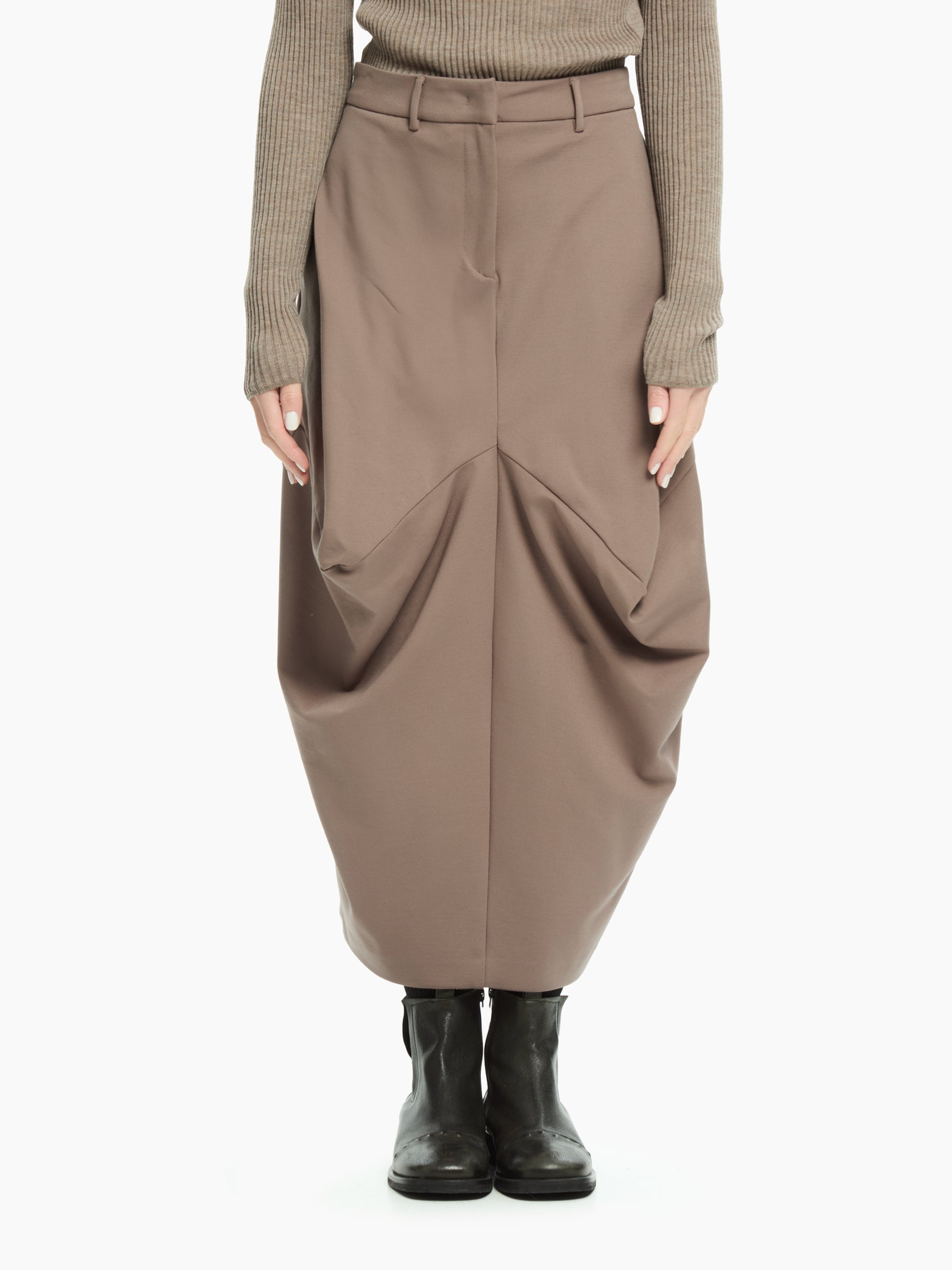 Questa gonna lunga ridefinisce il volume attraverso un gioco di pieghe architettoniche che modellano la silhouette con un carattere scultoreo e contemporaneo. La costruzione geometrica enfatizza il movimento del tessuto, creando un equilibrio tra struttura e fluidità che la rende un capo distintivo e sofisticato, ideale per look ricercati dal minimalismo materico.