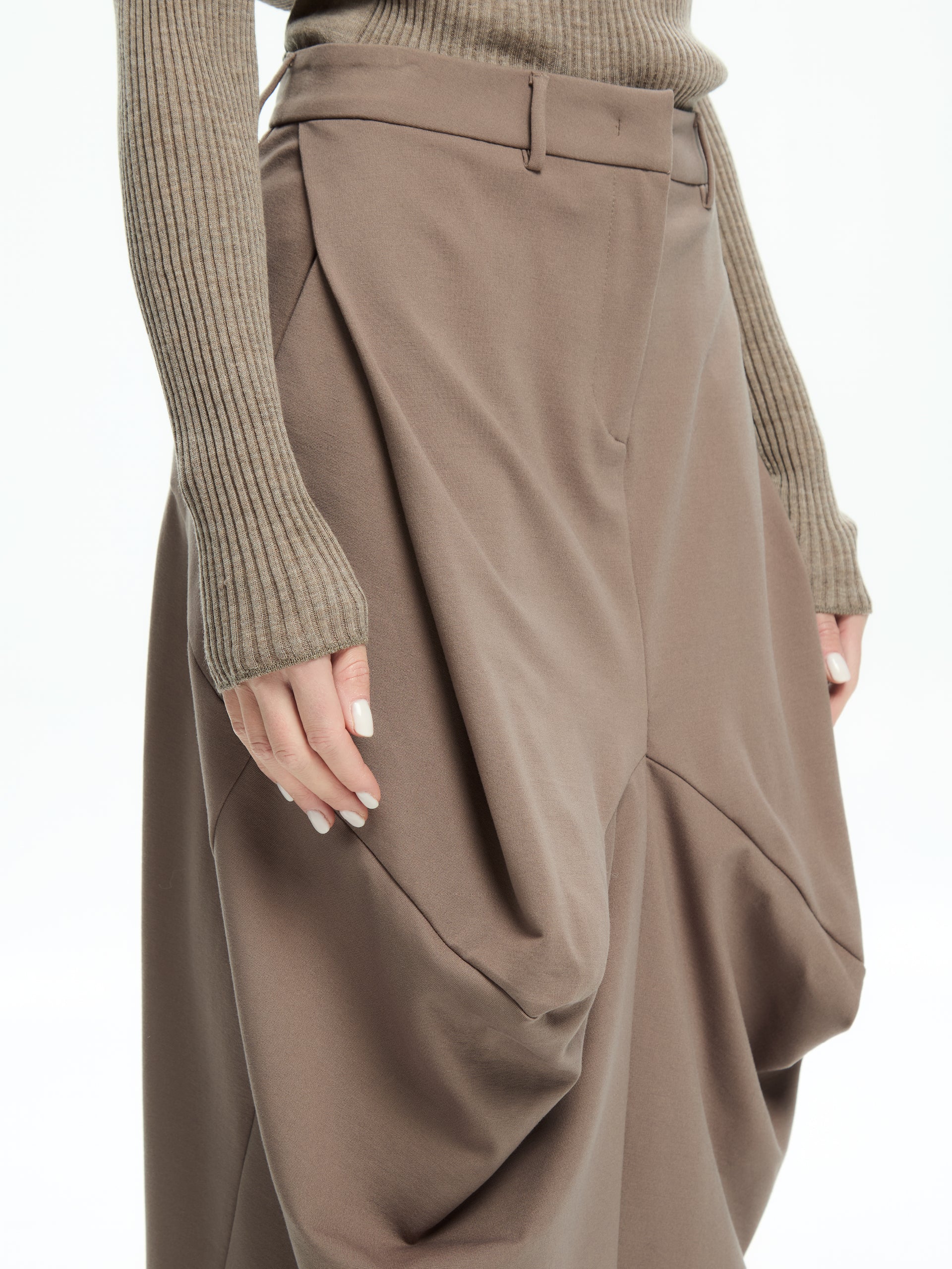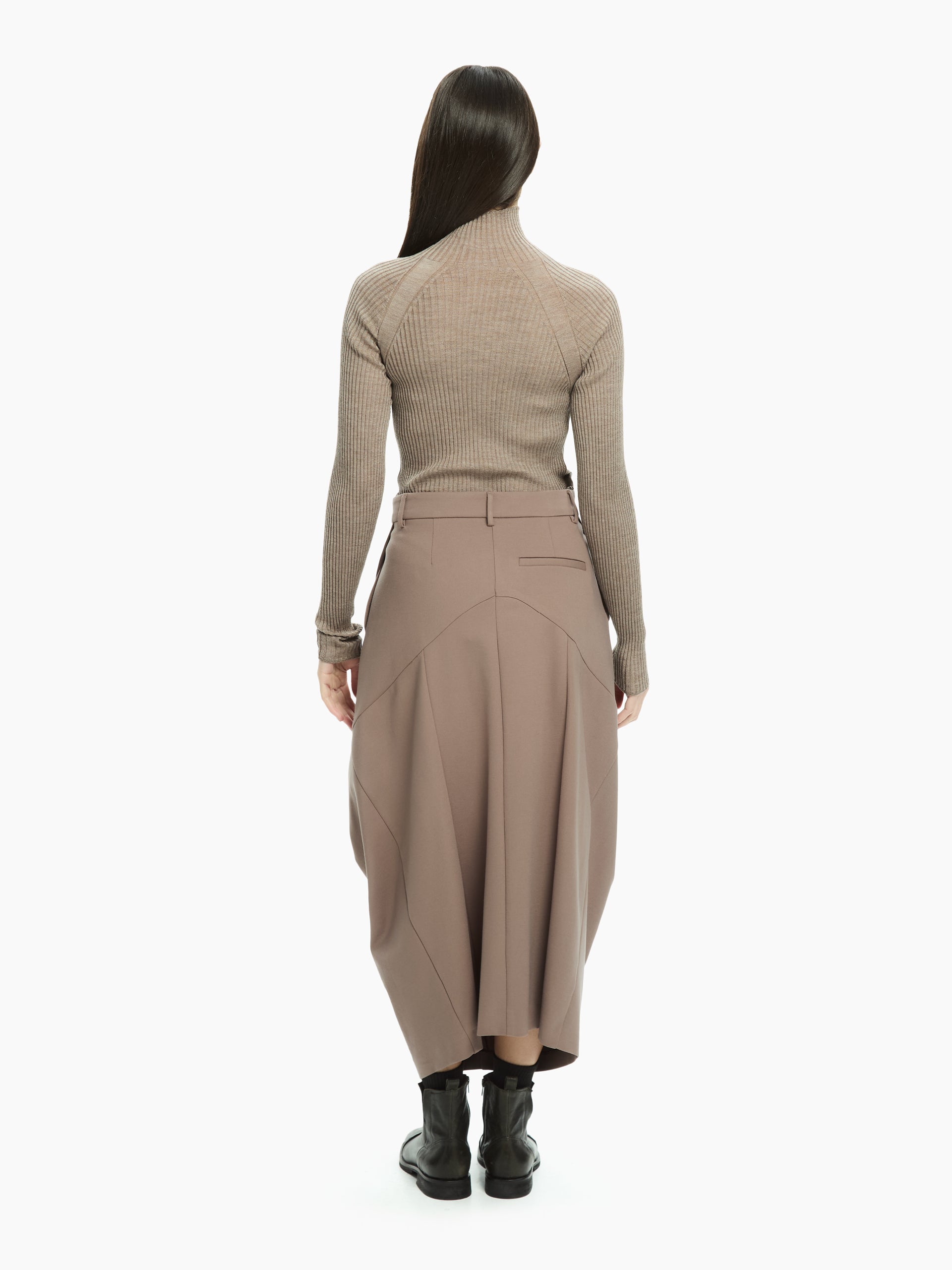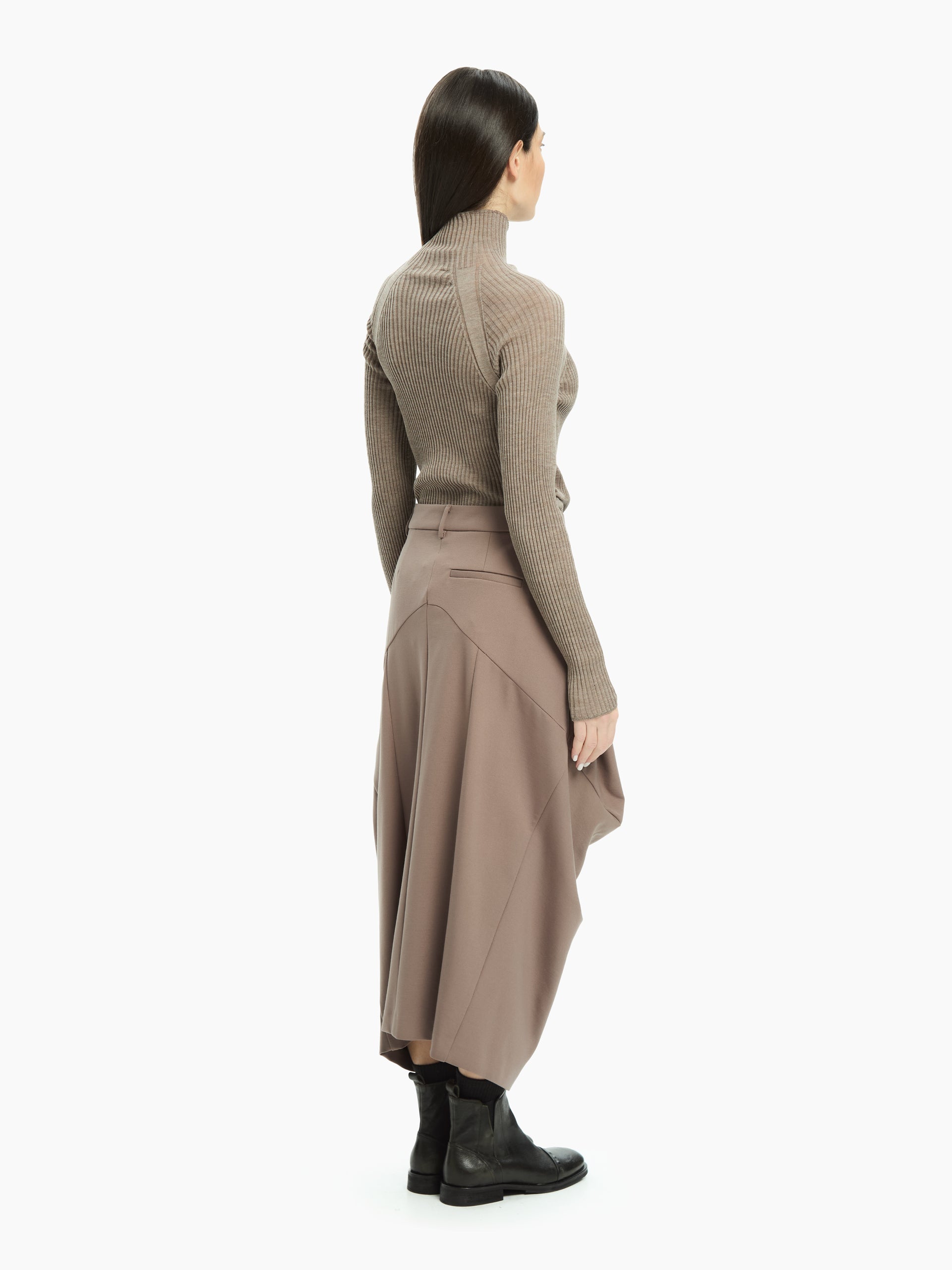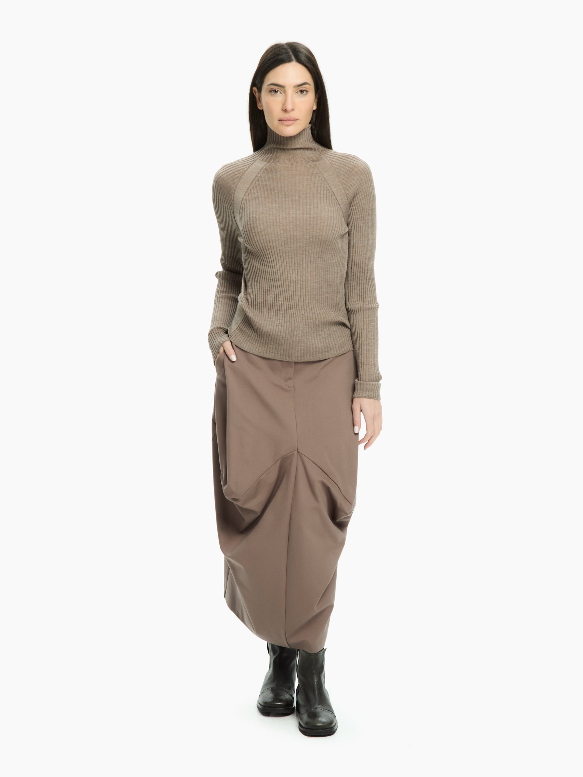Questa gonna lunga ridefinisce il volume attraverso un gioco di pieghe architettoniche che modellano la silhouette con un carattere scultoreo e contemporaneo. La costruzione geometrica enfatizza il movimento del tessuto, creando un equilibrio tra struttura e fluidità che la rende un capo distintivo e sofisticato, ideale per look ricercati dal minimalismo materico.
