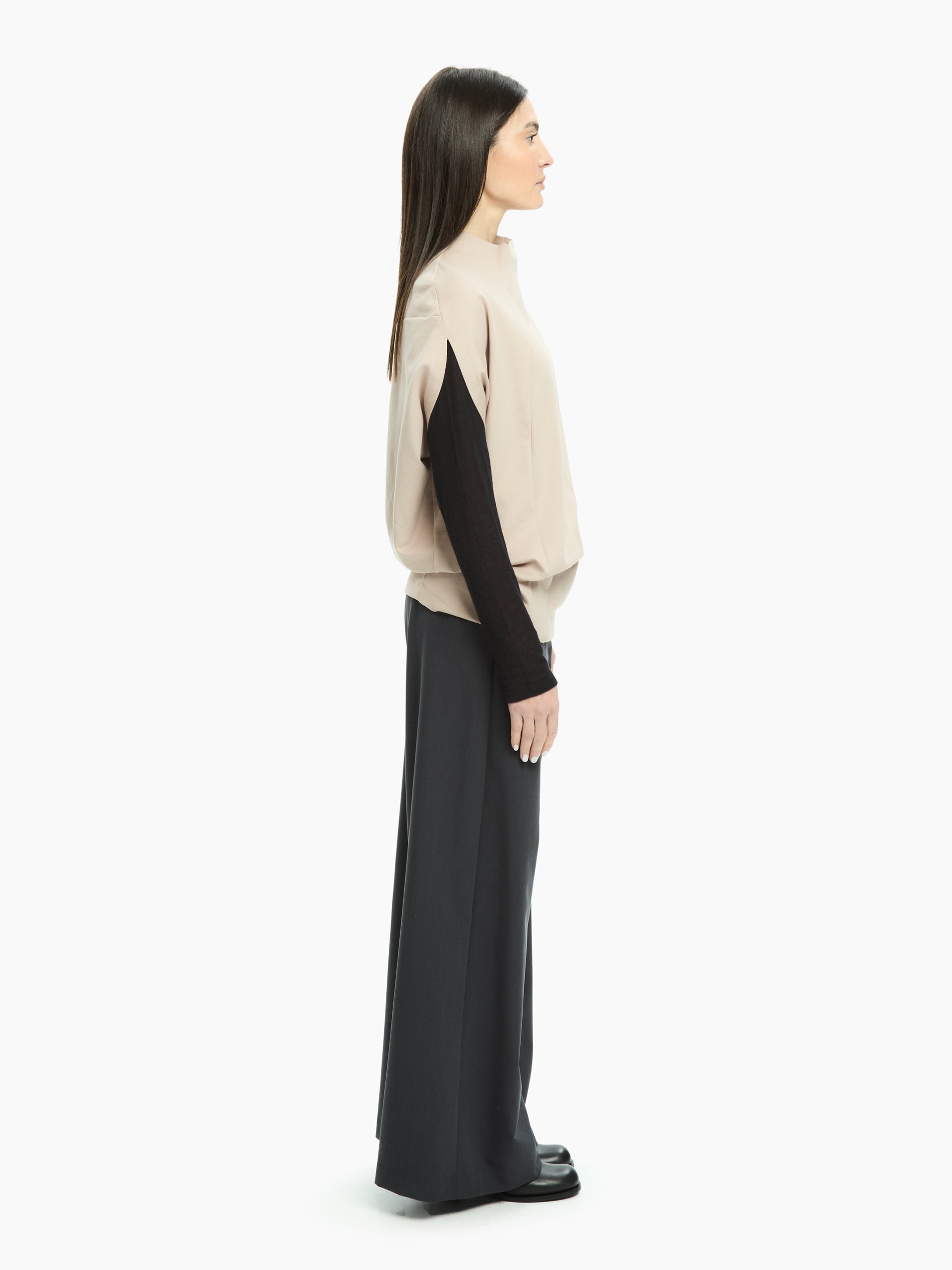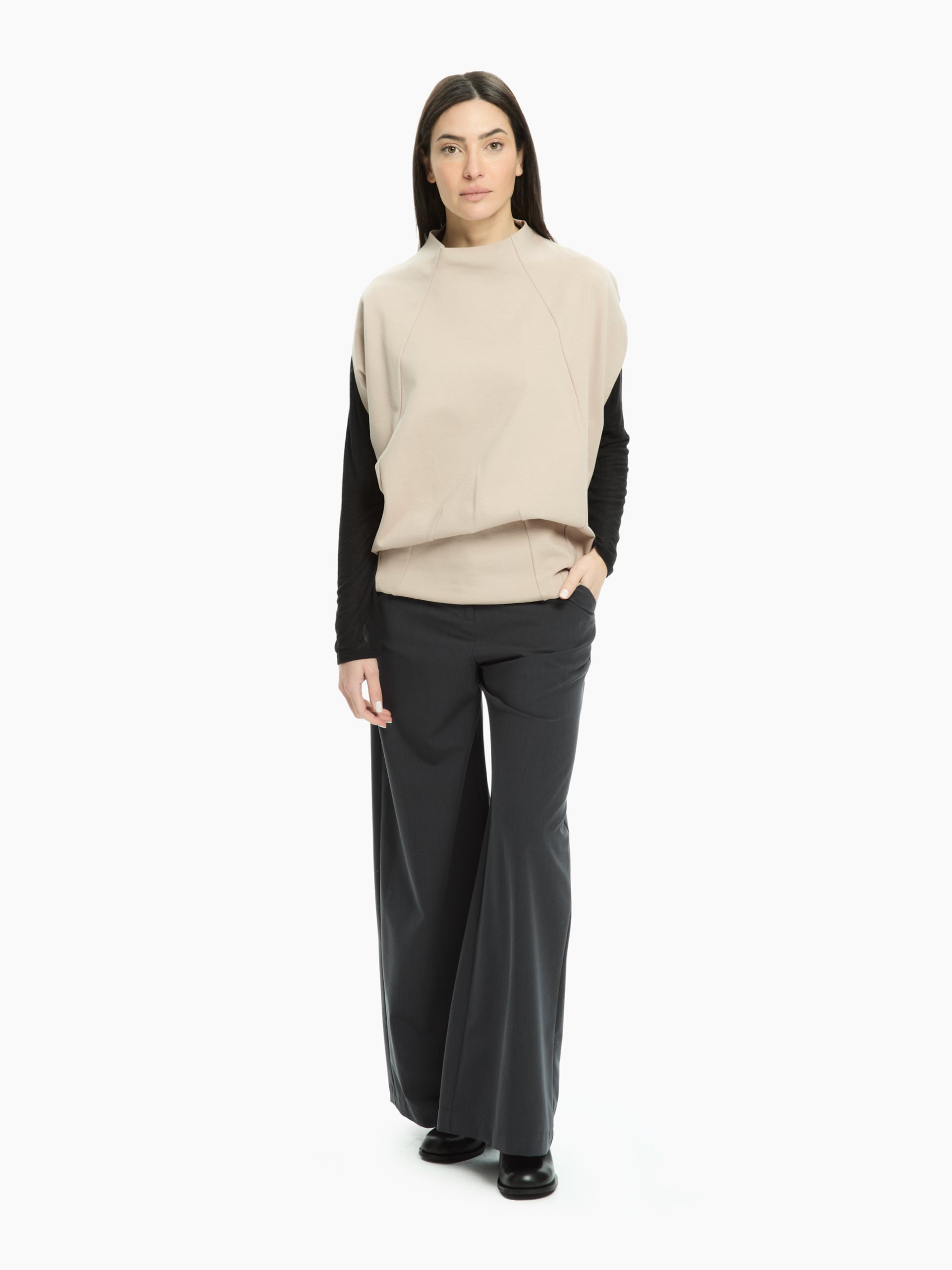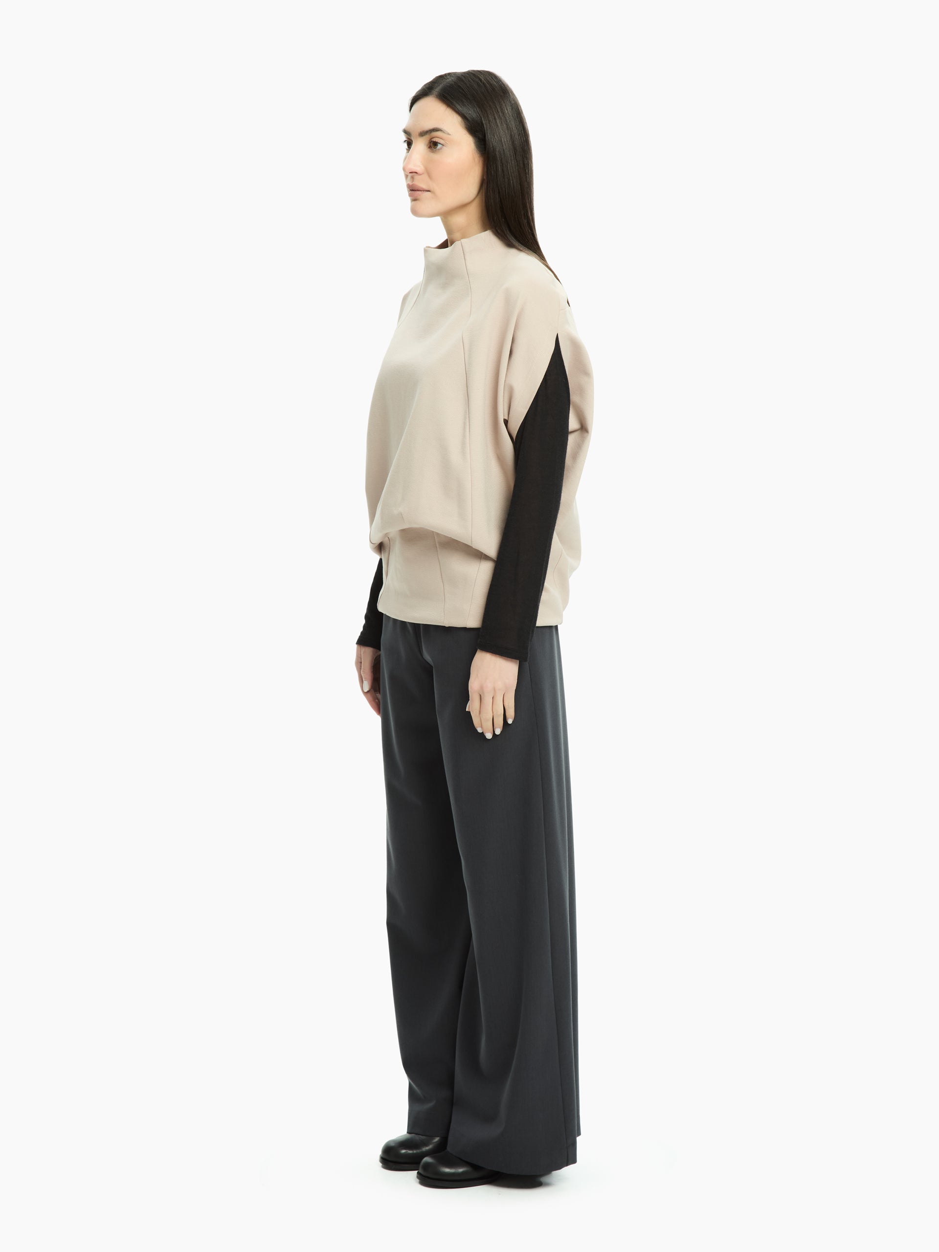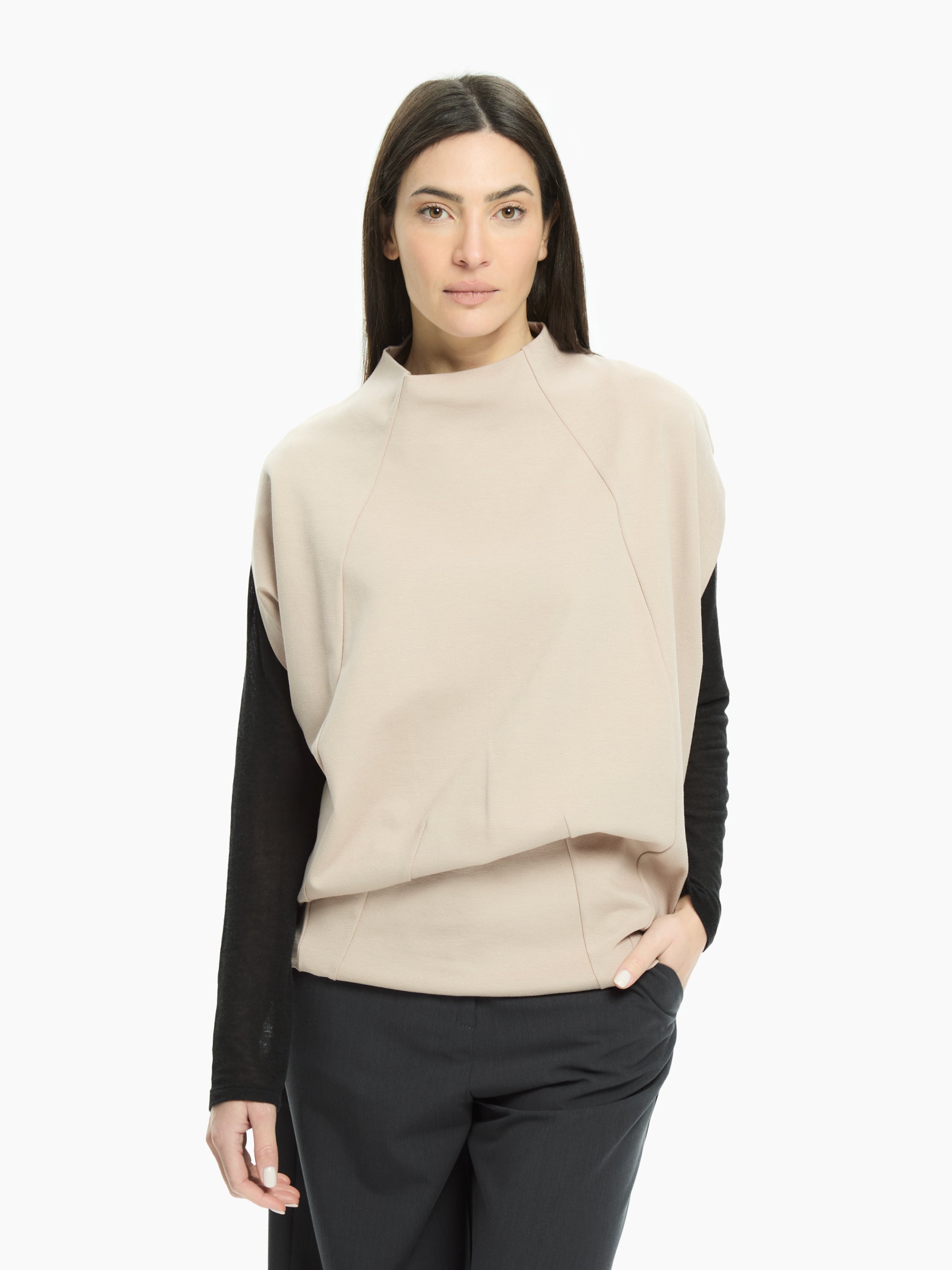 Moderna, essenziale e dal carattere architettonico, questa maglia gioca con volumi morbidi e linee precise per un’estetica ricercata e contemporanea. La costruzione strutturata del busto crea una silhouette pulita e definita, mentre le maniche aggiungono profondità e movimento al design. Lo scollo morbido e leggermente rialzato incornicia il viso con naturalezza, rendendo il capo ideale per look minimal ma dall’impronta decisa.