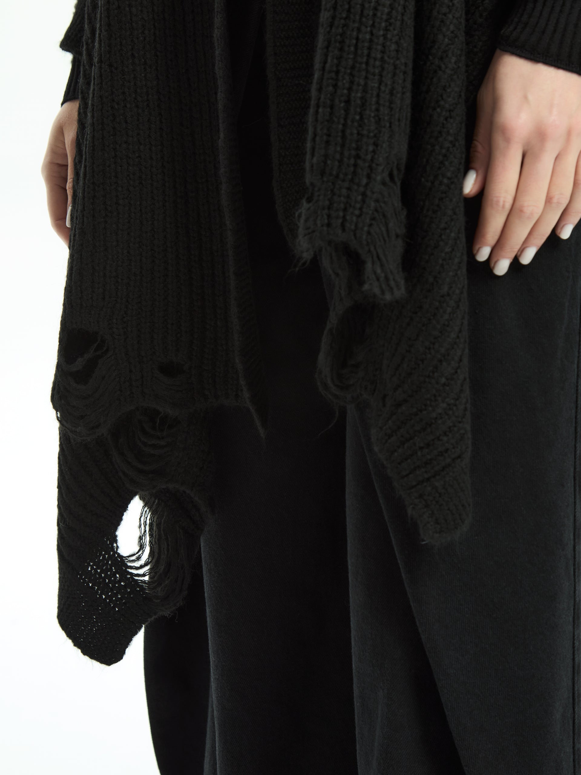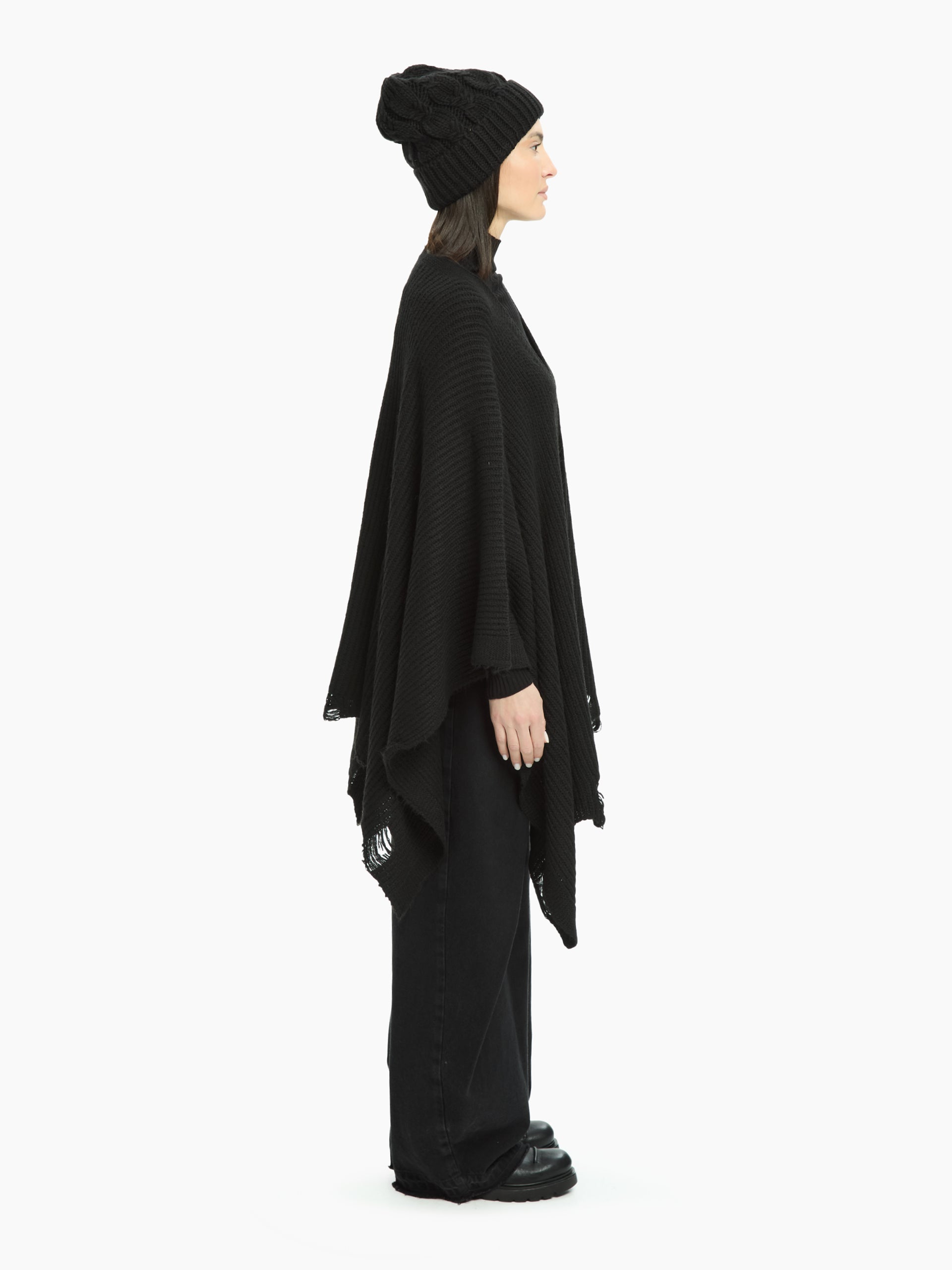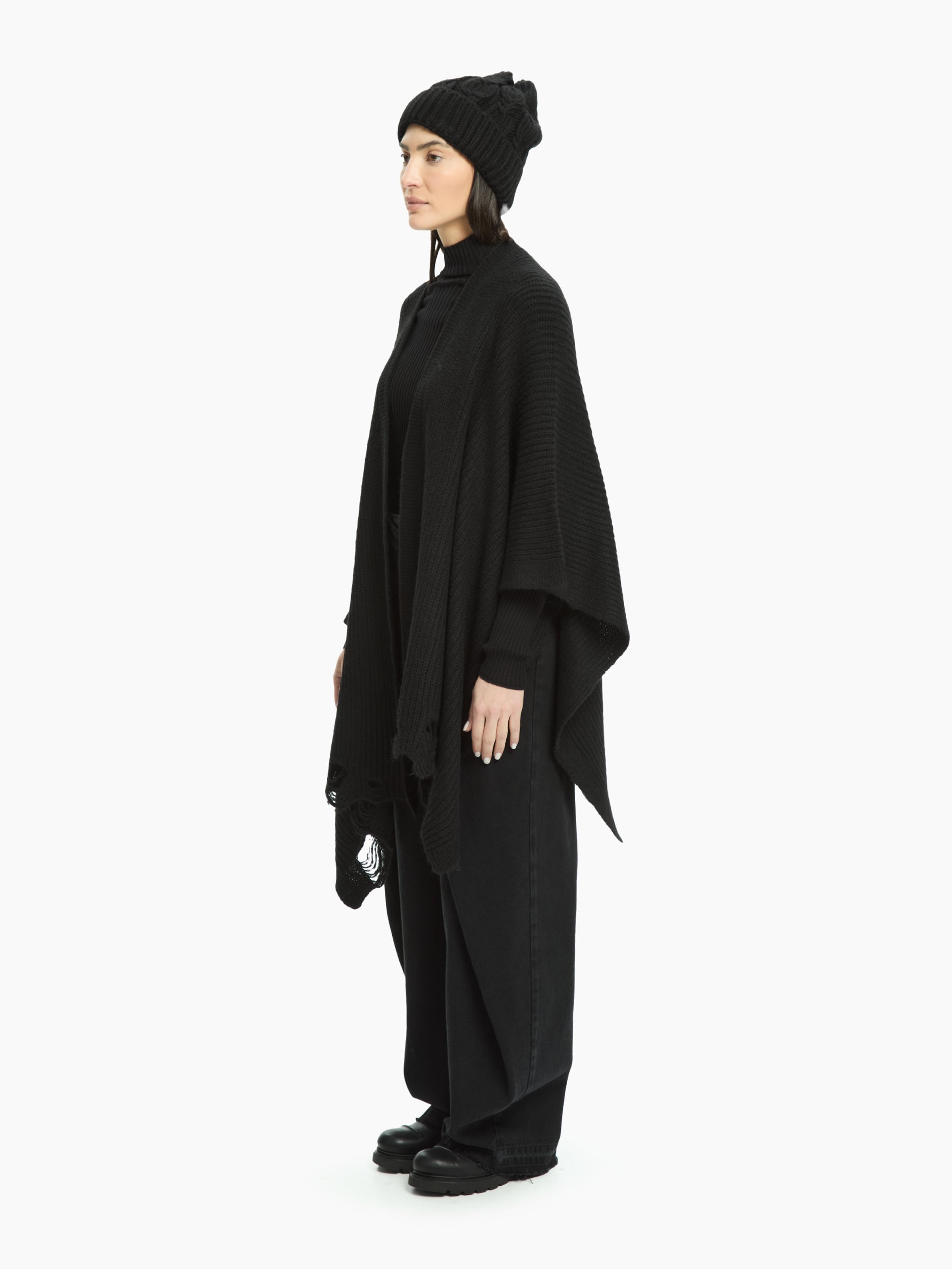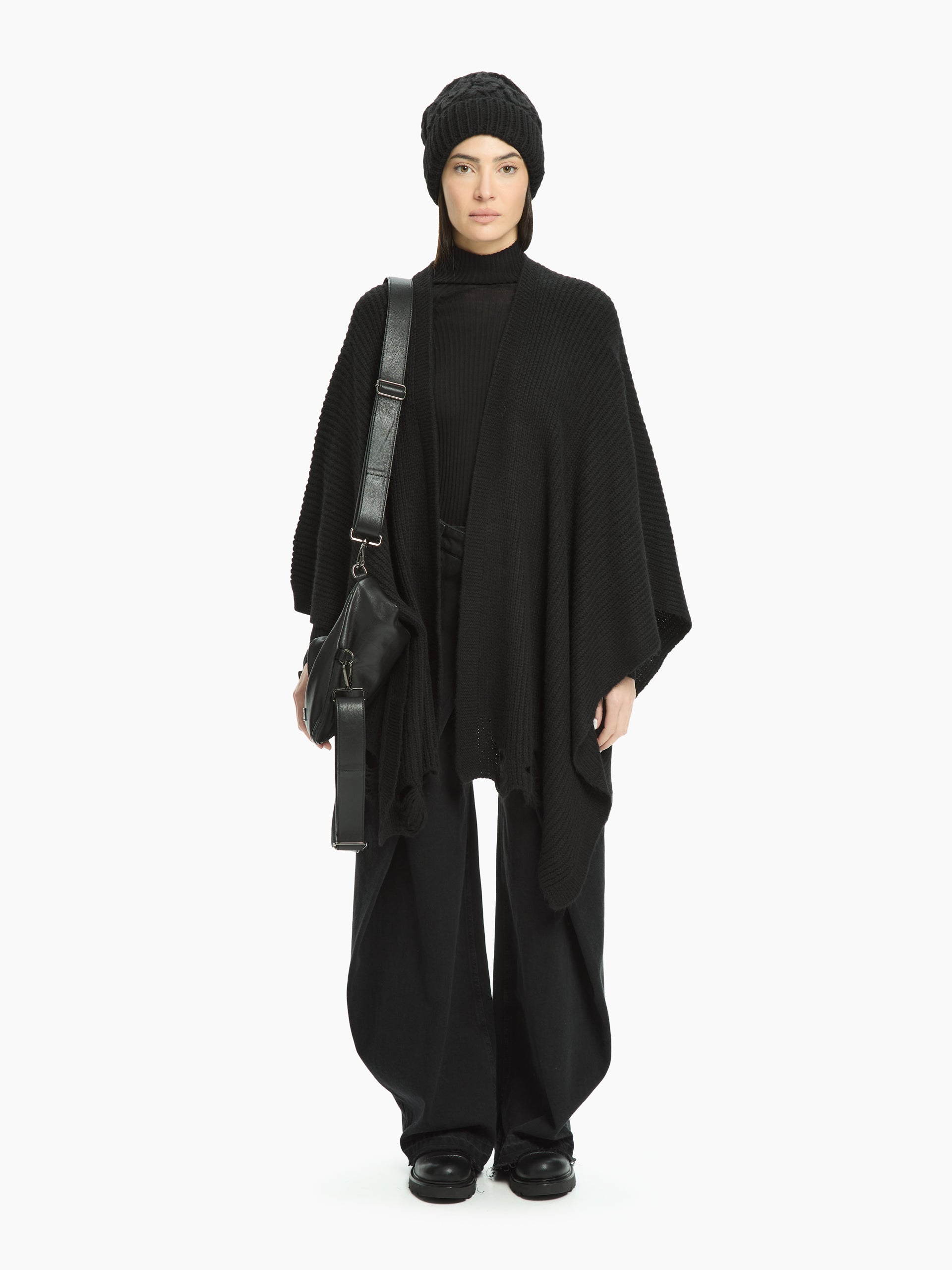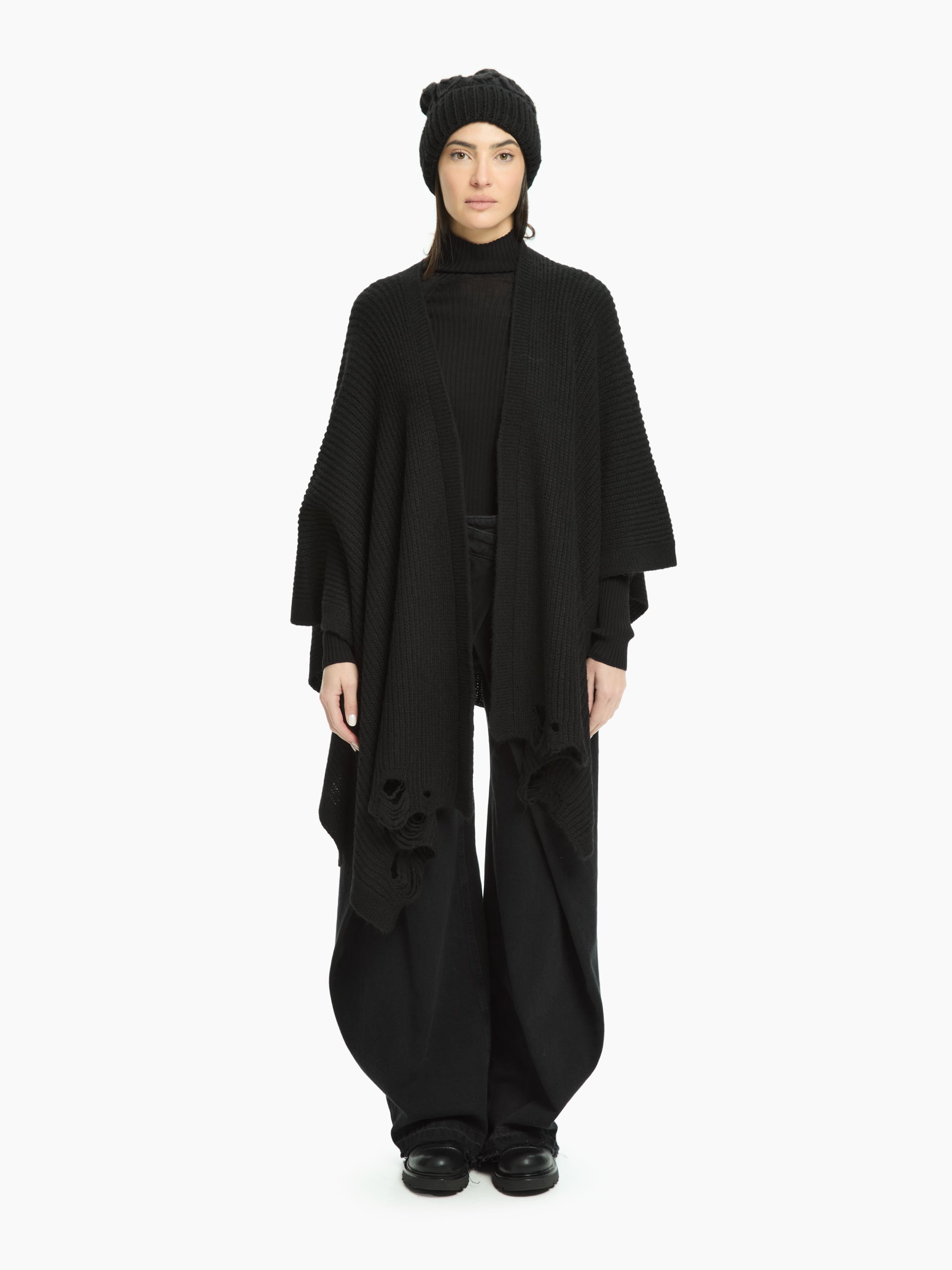 Avvolgente e scenografica, questa mantella IXOS interpreta la maglieria con un’estetica contemporanea e vissuta. La texture a coste larghe si apre in un drappeggio naturale, mentre i bordi volutamente irregolari aggiungono un tocco materico e autentico che rende il capo unico nel suo genere.