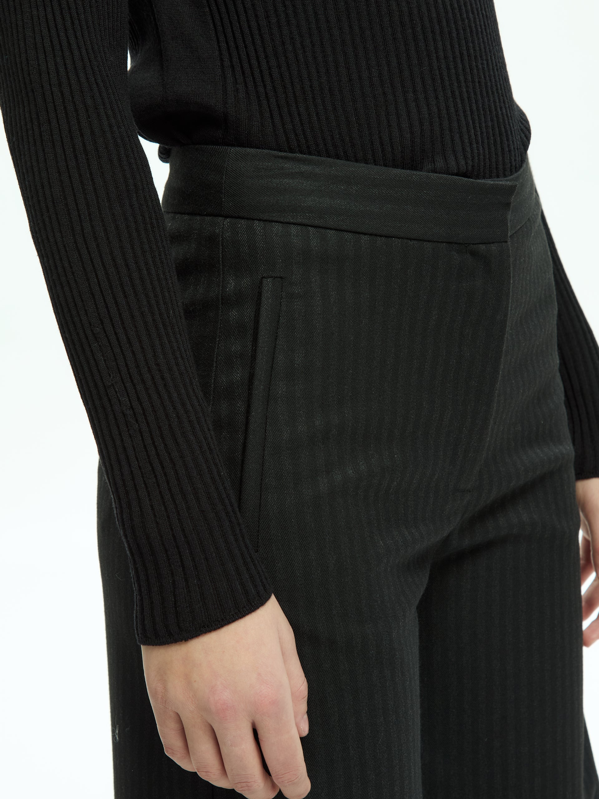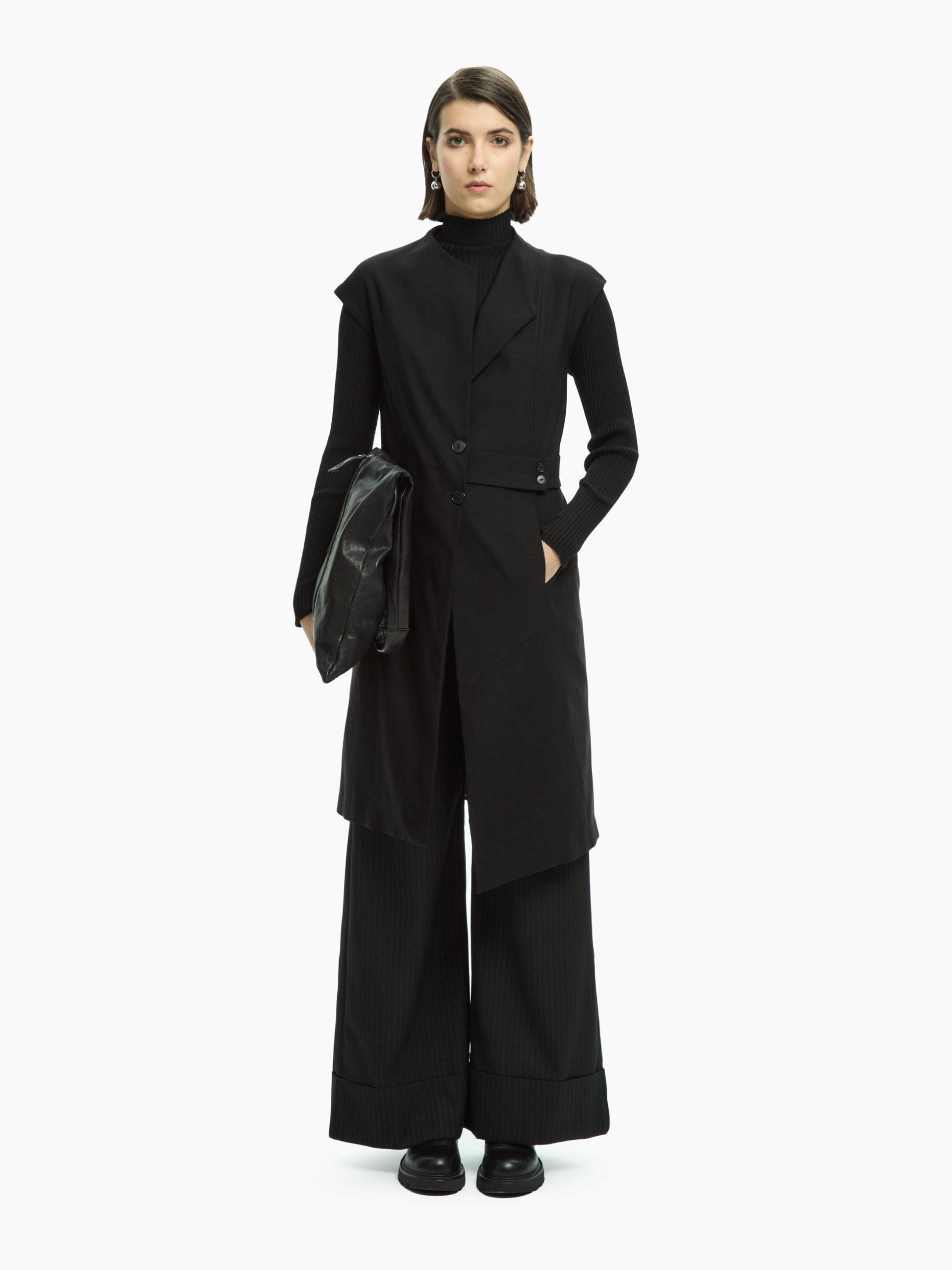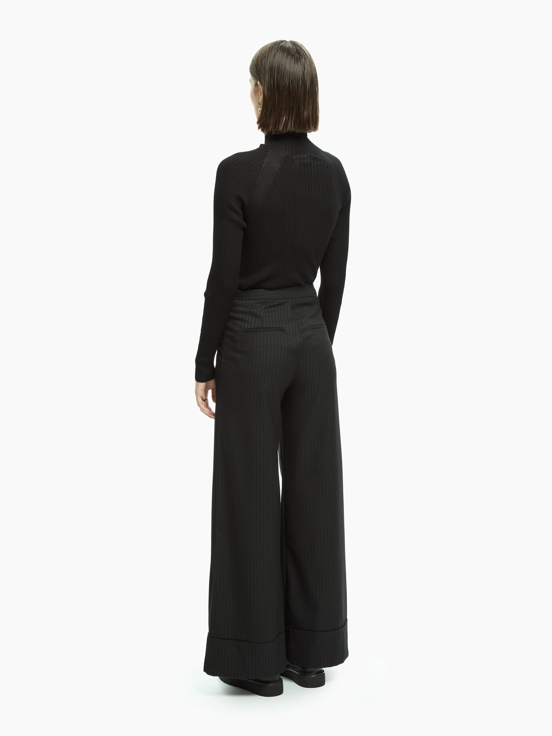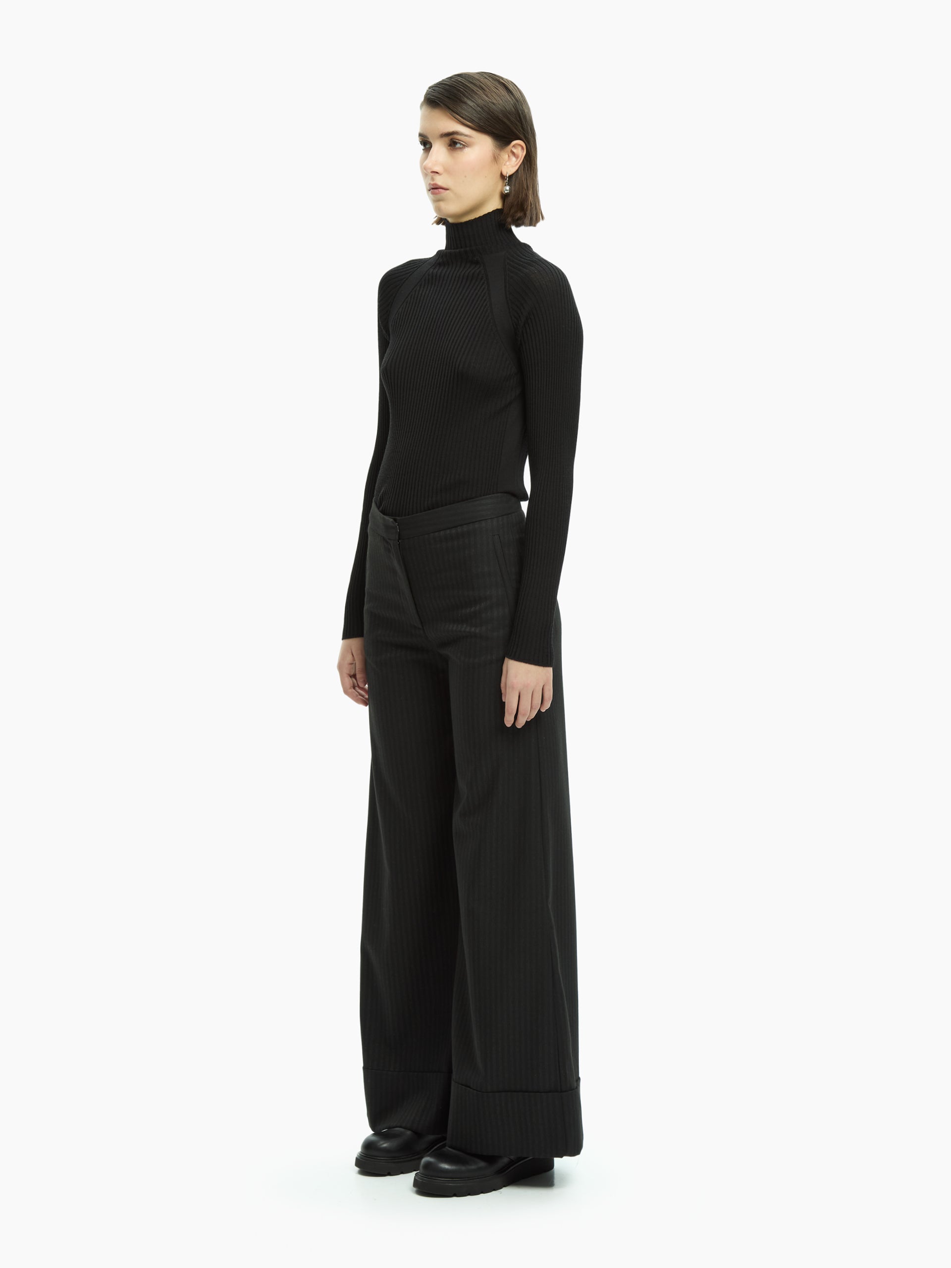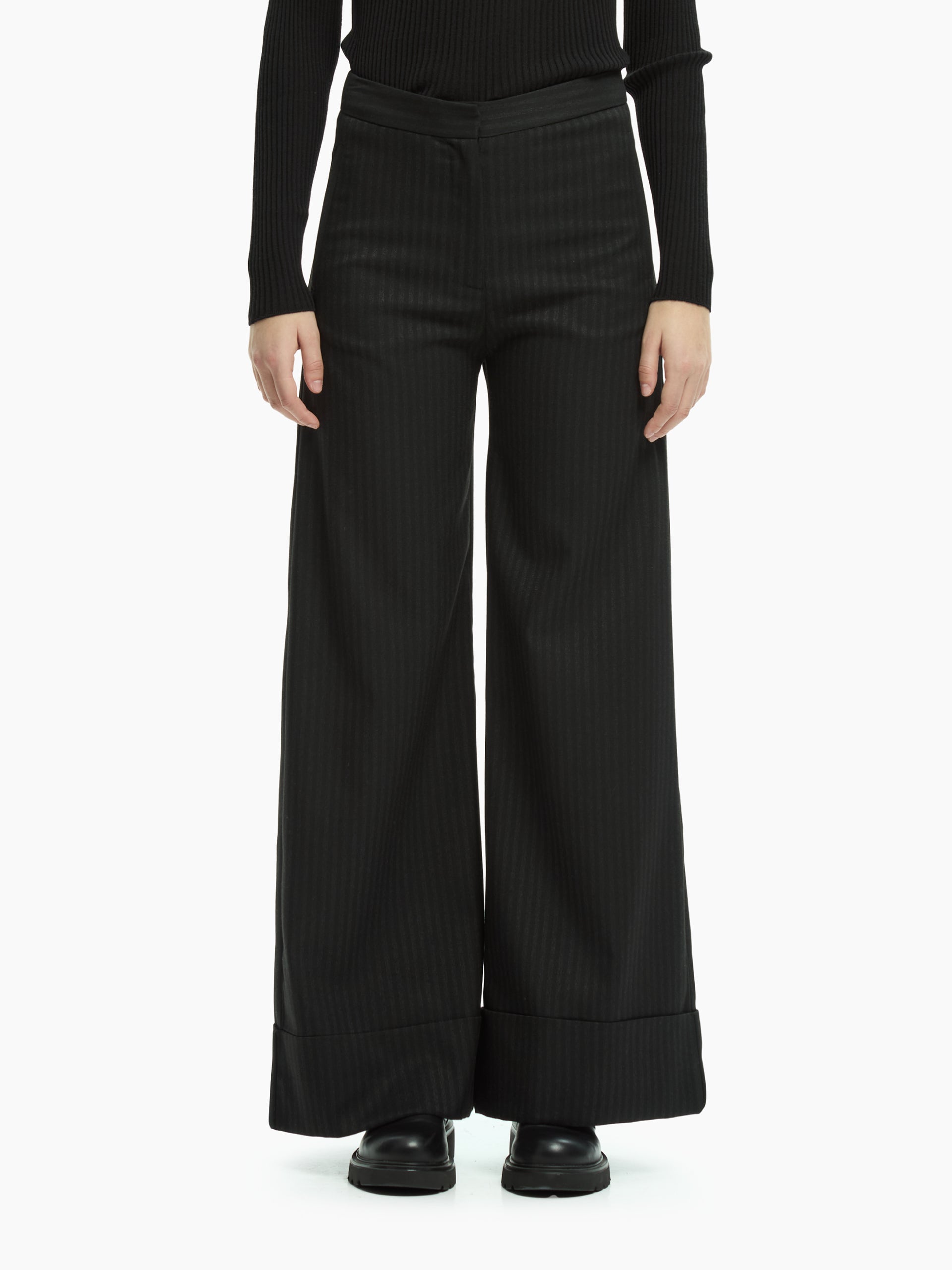 Un capo che declina il pantalone classico in una versione contemporanea e rigorosa. La gamba ampia scende fluida dal bacino, costruendo una silhouette allungata e bilanciata, mentre la struttura sartoriale mantiene una linea pulita e controllata. Il dettaglio del fondo ampio rafforza il carattere deciso del modello, pensato per dialogare con capi aderenti o volumi stratificati. Ideali per look urbani dal gusto essenziale e sofisticato.