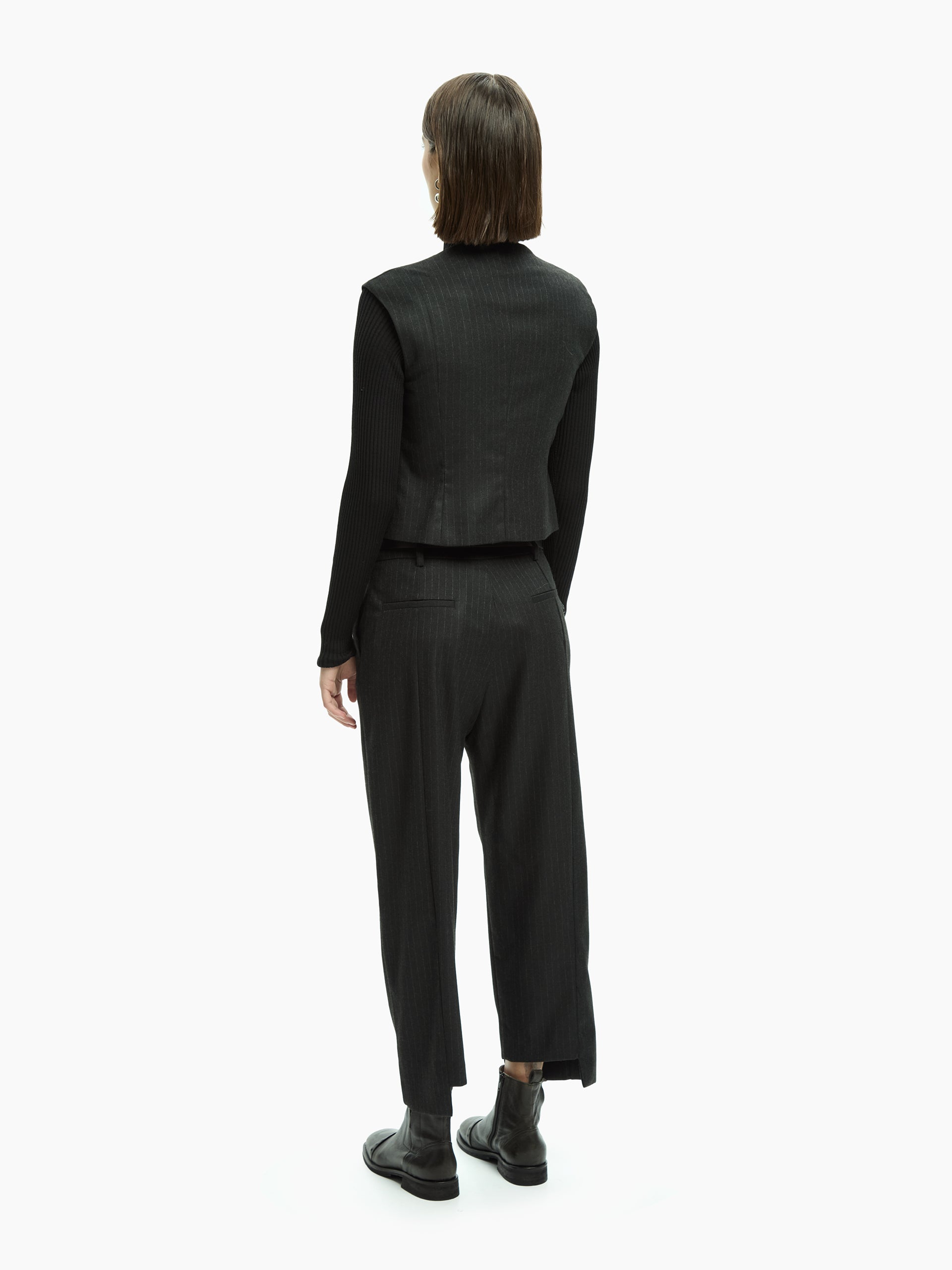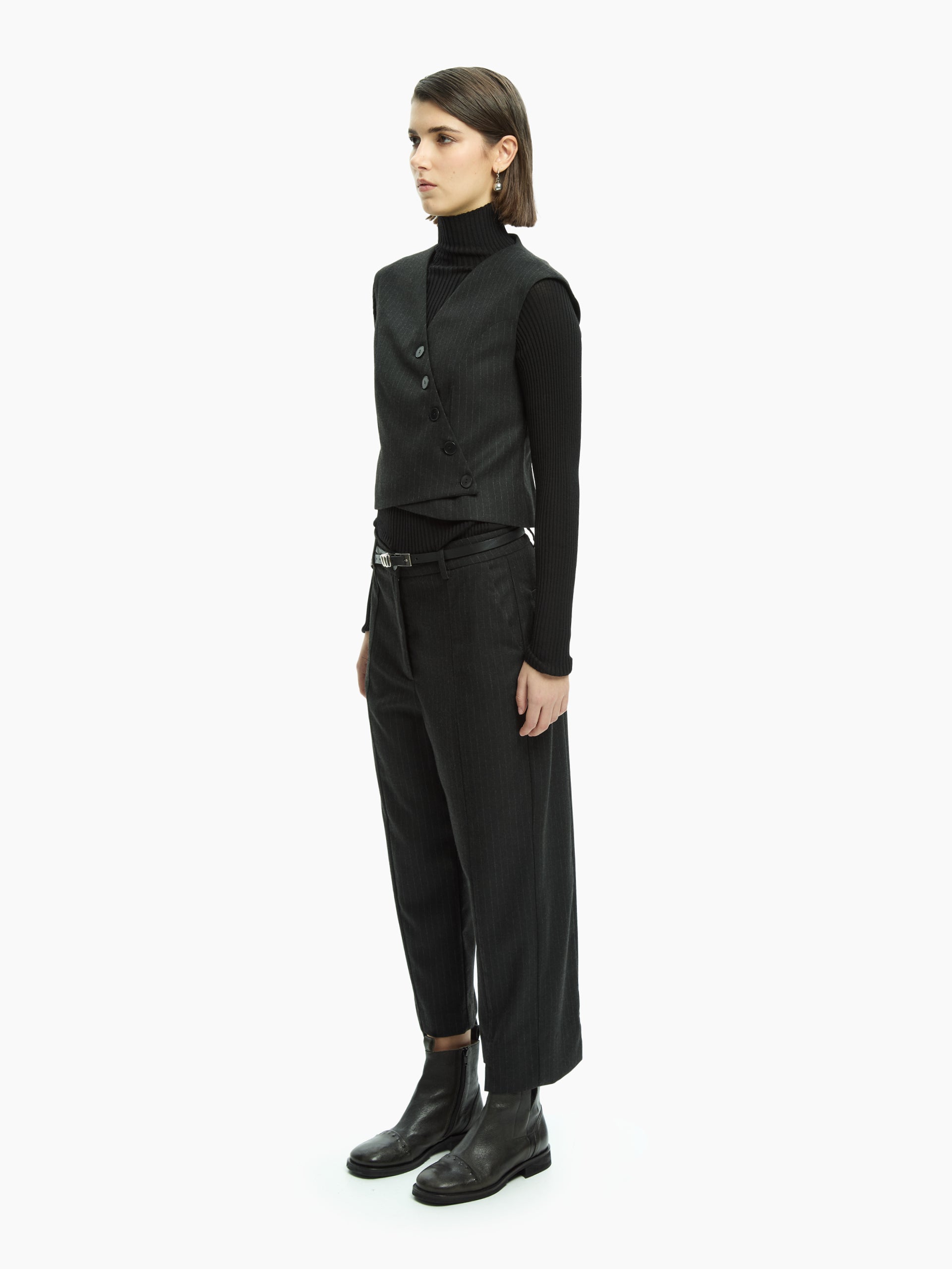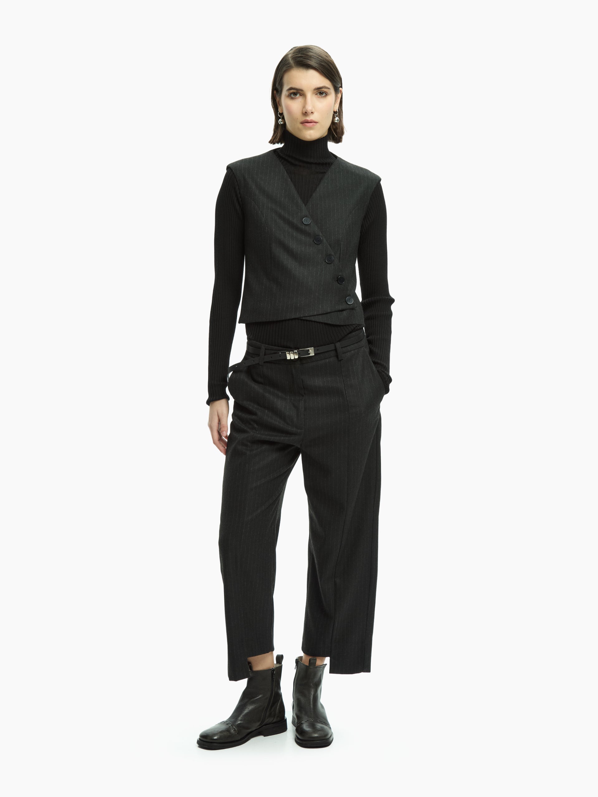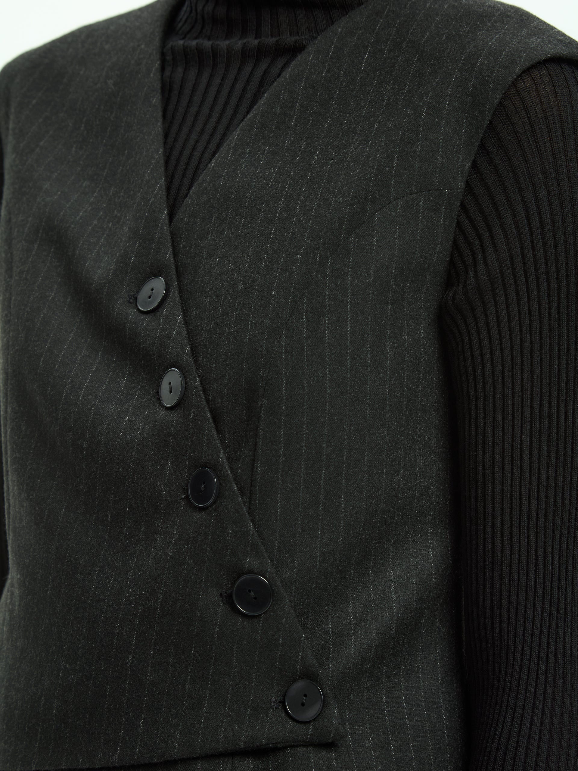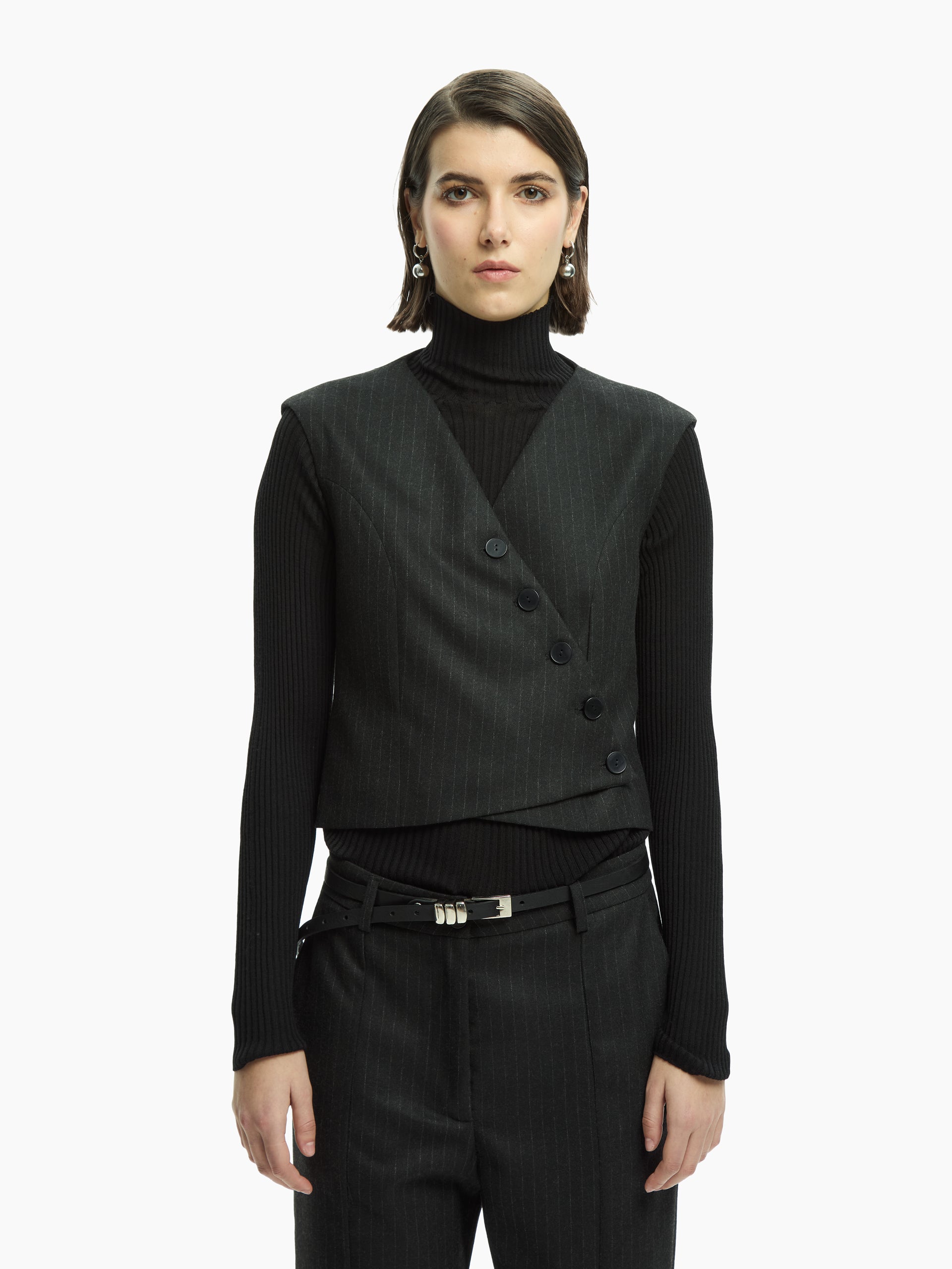 Un capo che reinterpreta il linguaggio sartoriale in chiave contemporanea. La chiusura decentrata e il taglio asimmetrico definiscono una silhouette pulita ma dinamica, pensata per dialogare con capi aderenti o volumi più morbidi. La linea essenziale e la struttura compatta conferiscono al gilet un carattere deciso, ideale per costruire look stratificati dal gusto raffinato.