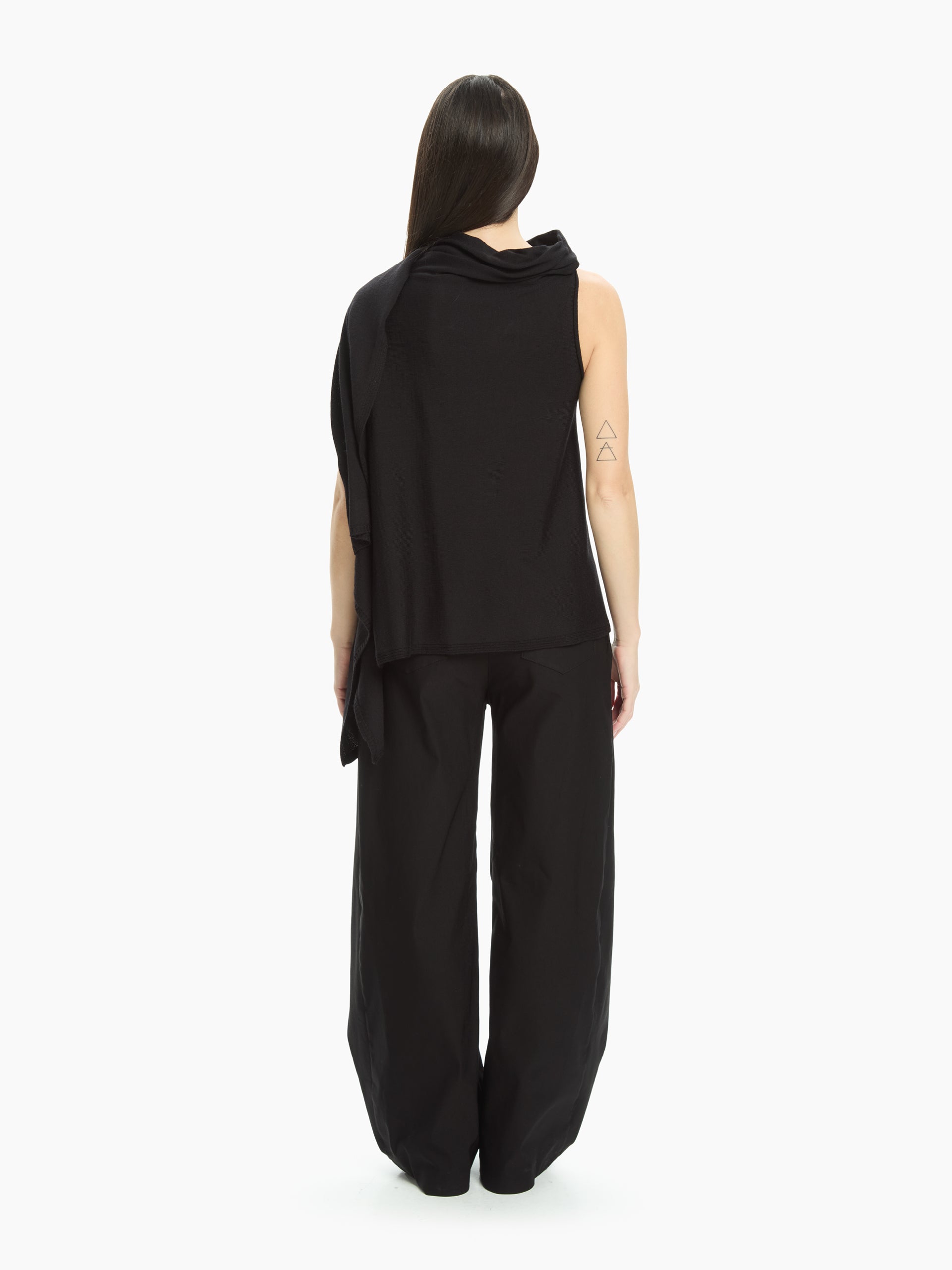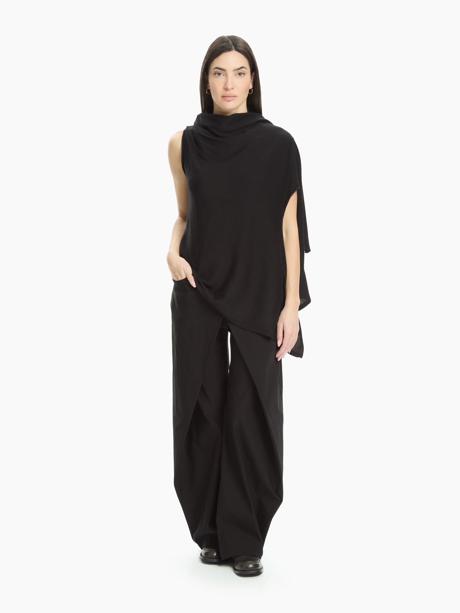 - Collo ampio e morbido, portabile con drappeggio frontale o spostato lateralmente per un effetto più scultoreo.