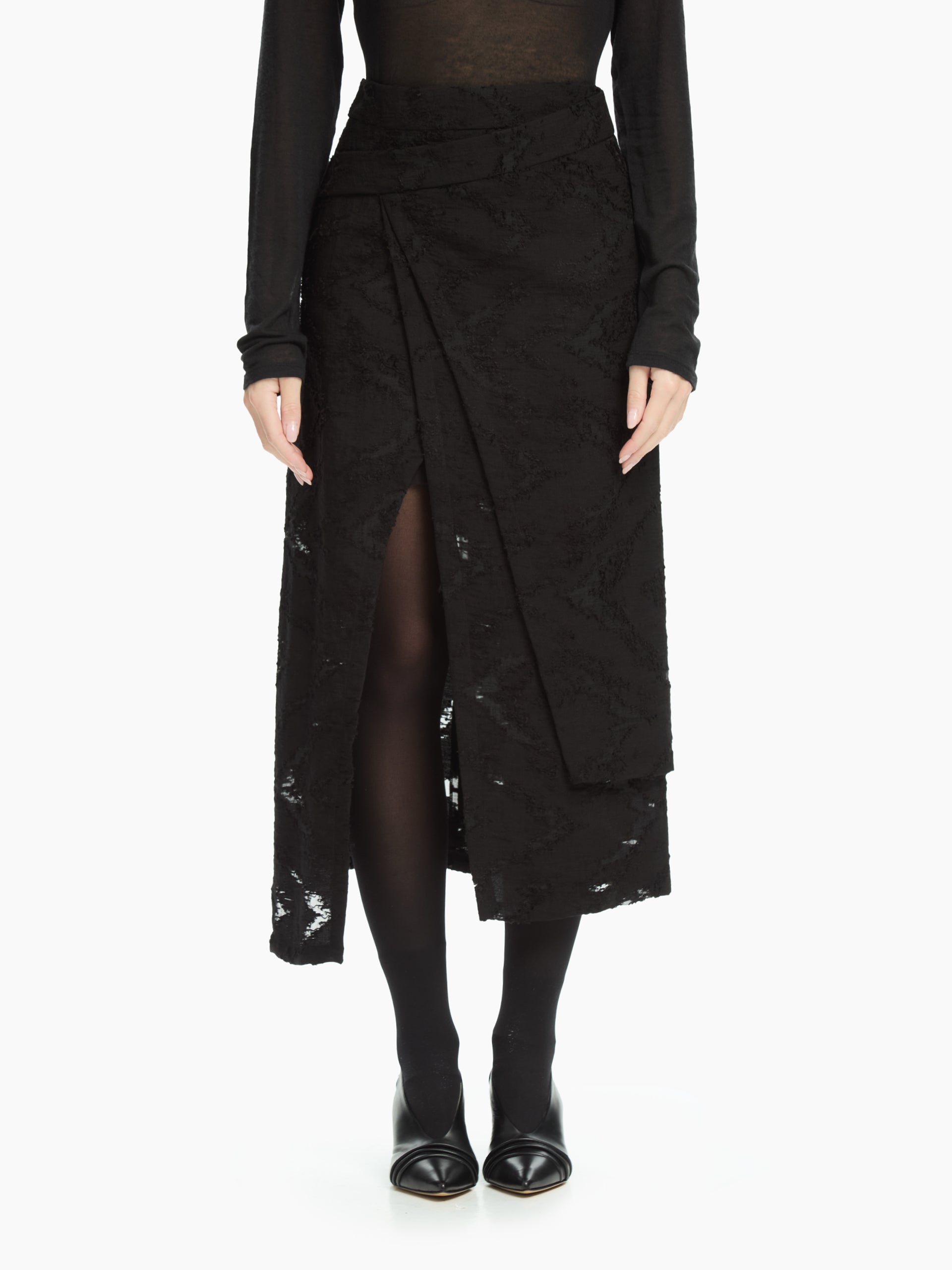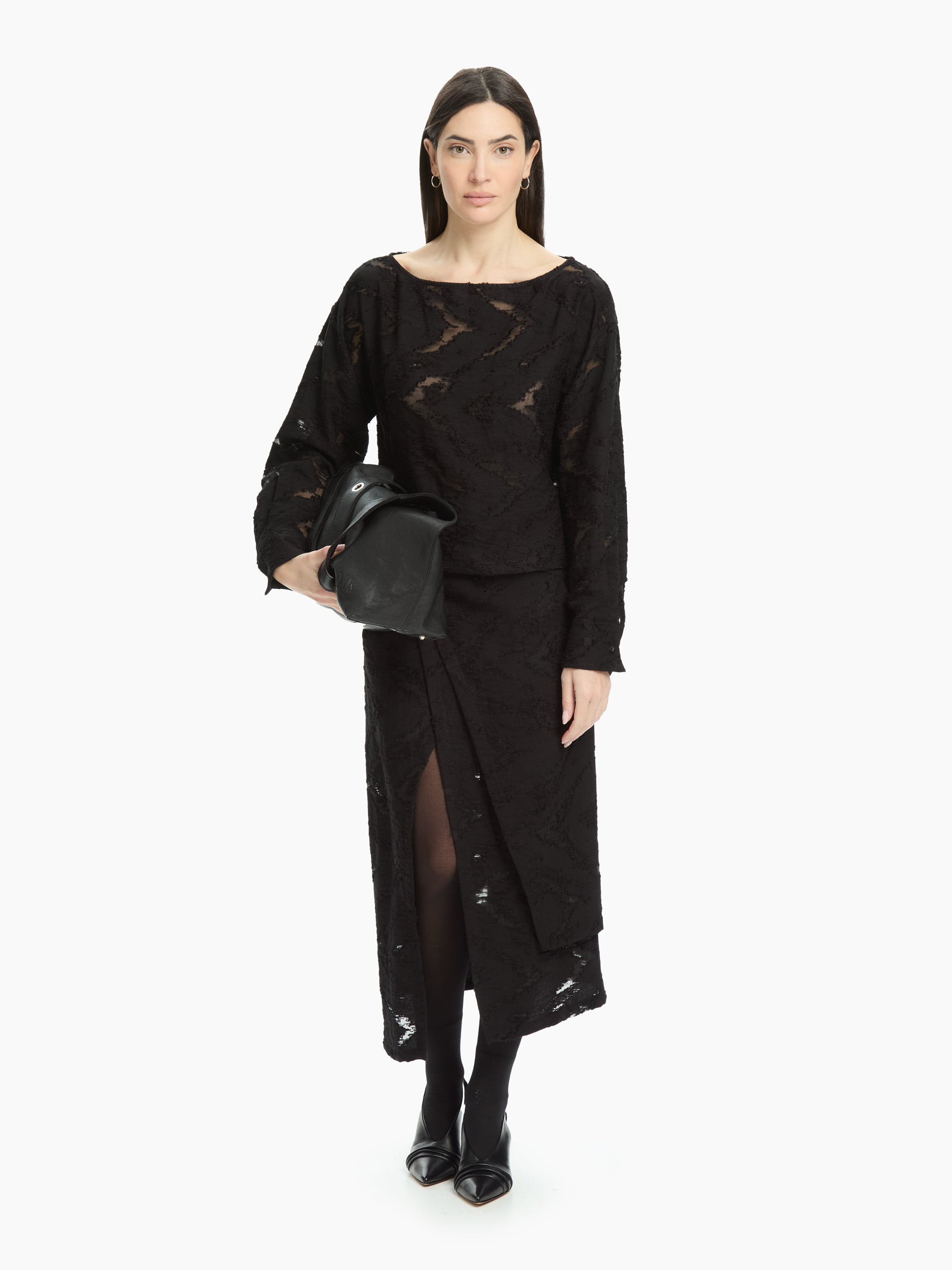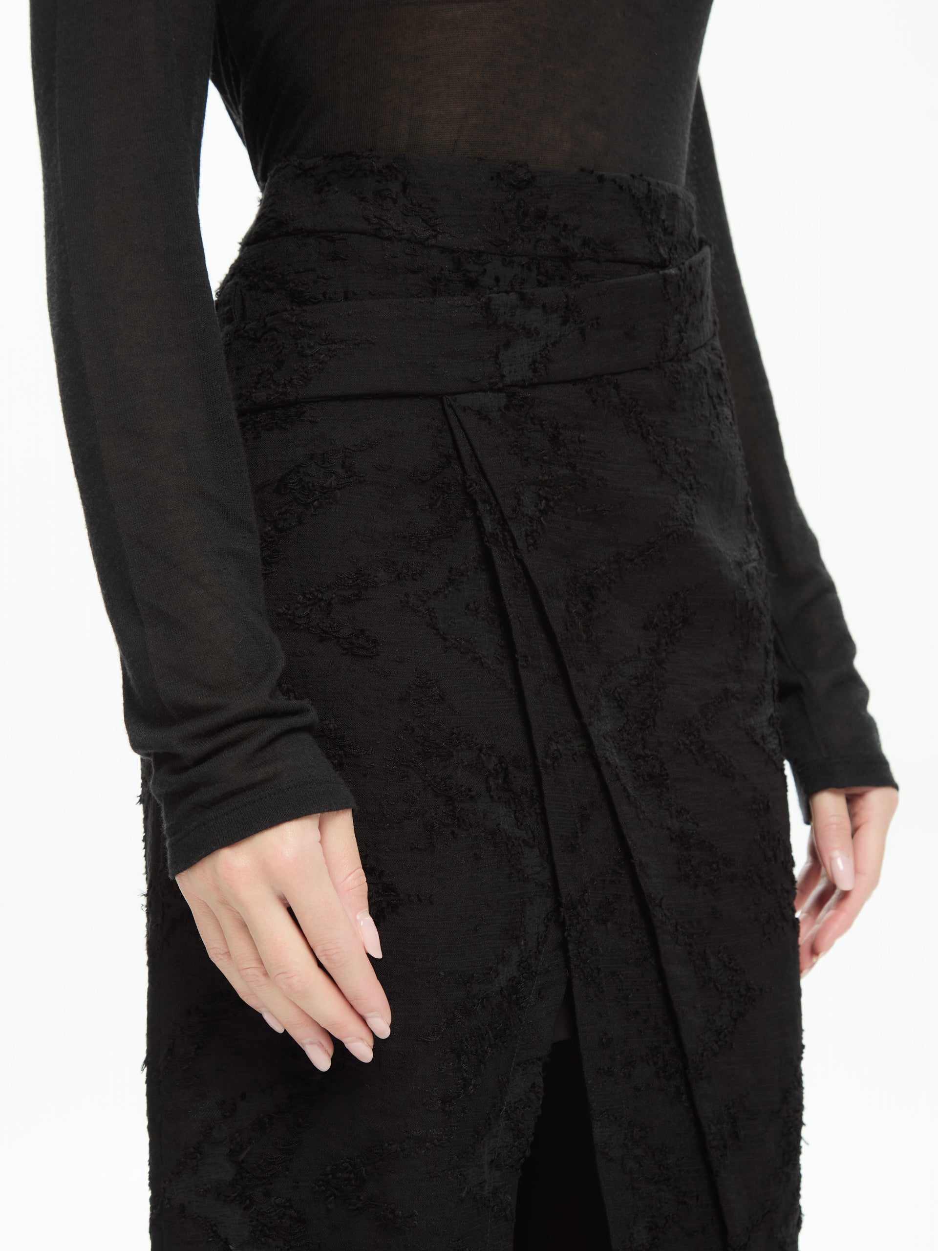 Il pannello frontale asimmetrico, elemento iconico del modello, crea un raffinato gioco di sovrapposizioni e una linea avvolgente che slancia la silhouette. La vita alta strutturata sottolinea il punto vita, mentre la lunghezza midi dona equilibrio e versatilità. Lo spacco centrale, parzialmente nascosto dal pannello, rende il movimento fluido e aggiunge un tocco femminile e audace.