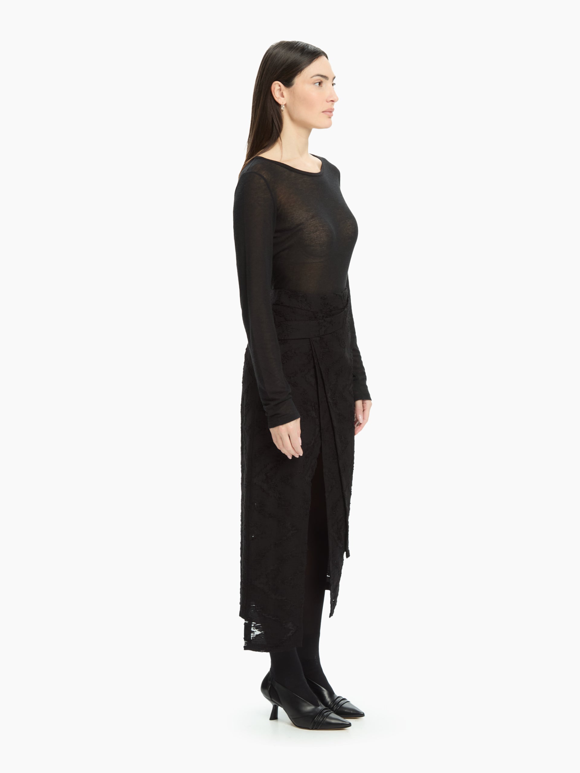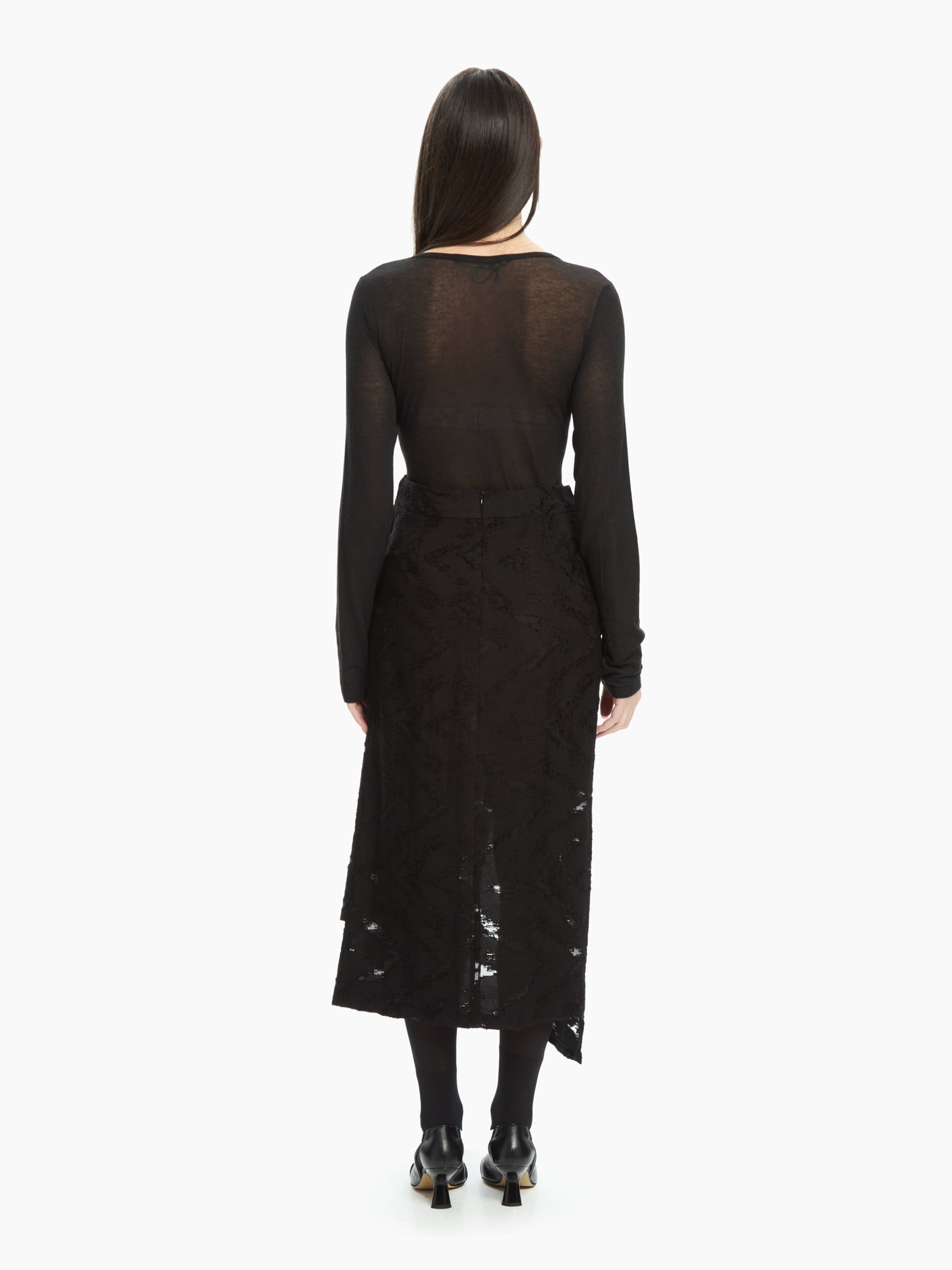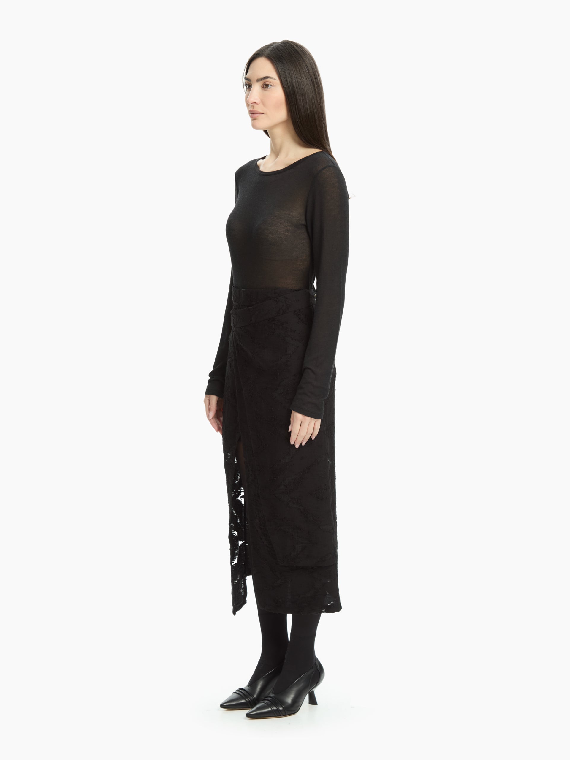 Il pannello frontale asimmetrico, elemento iconico del modello, crea un raffinato gioco di sovrapposizioni e una linea avvolgente che slancia la silhouette. La vita alta strutturata sottolinea il punto vita, mentre la lunghezza midi dona equilibrio e versatilità. Lo spacco centrale, parzialmente nascosto dal pannello, rende il movimento fluido e aggiunge un tocco femminile e audace.