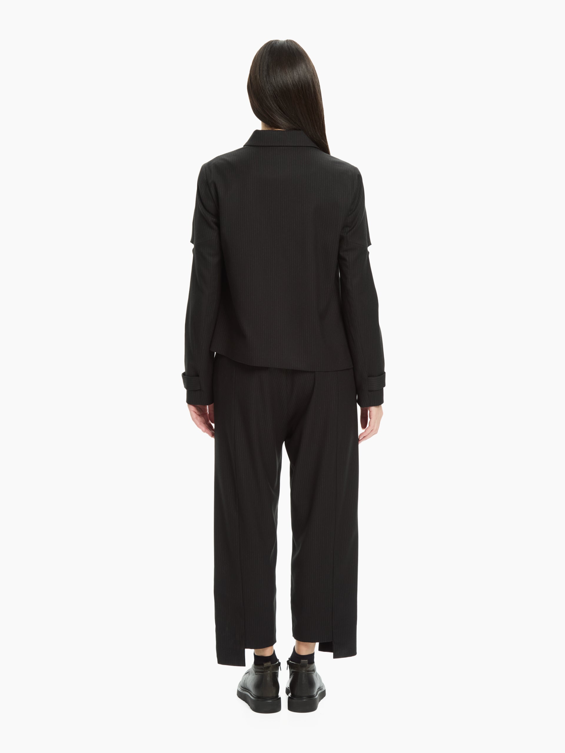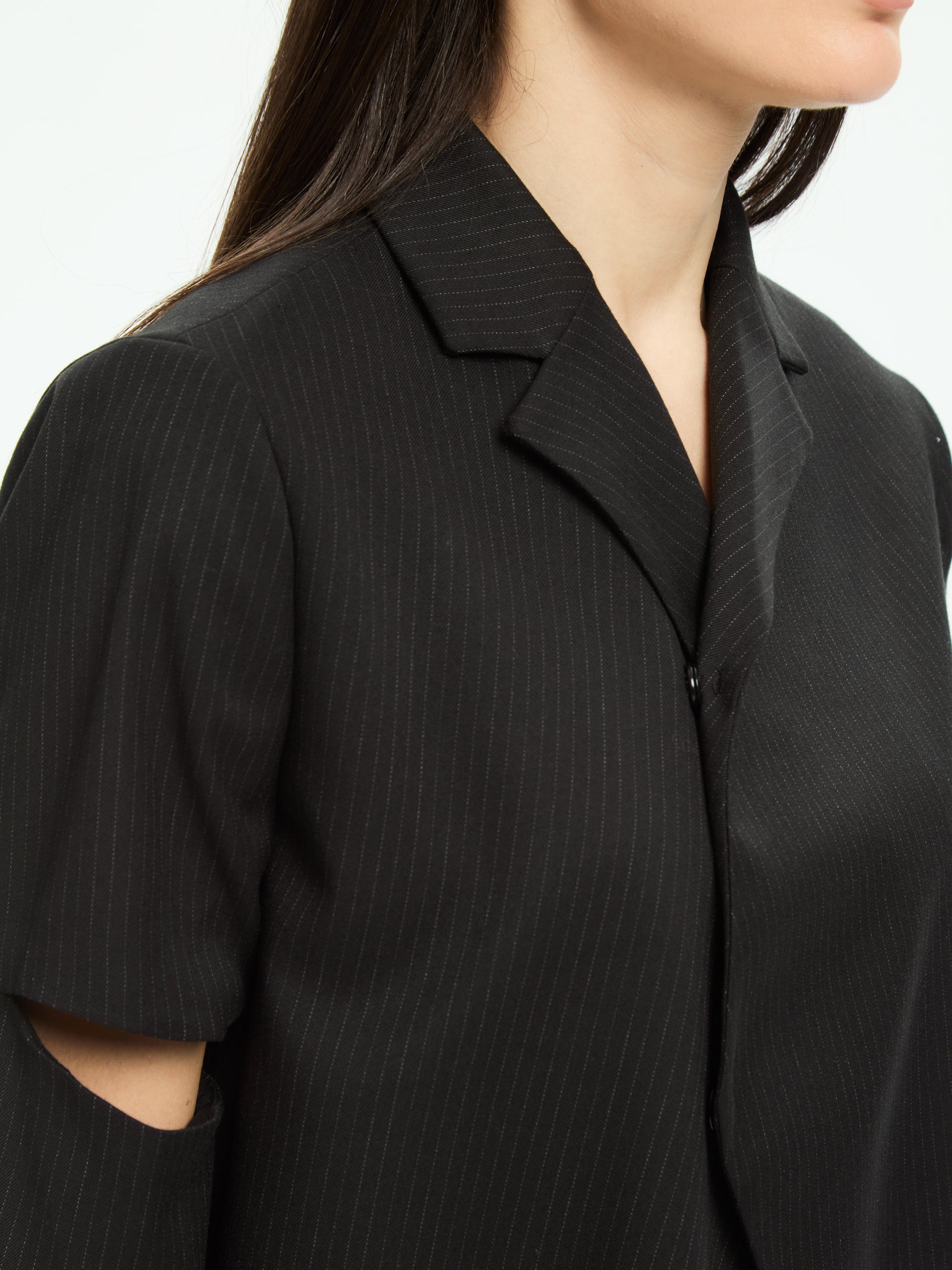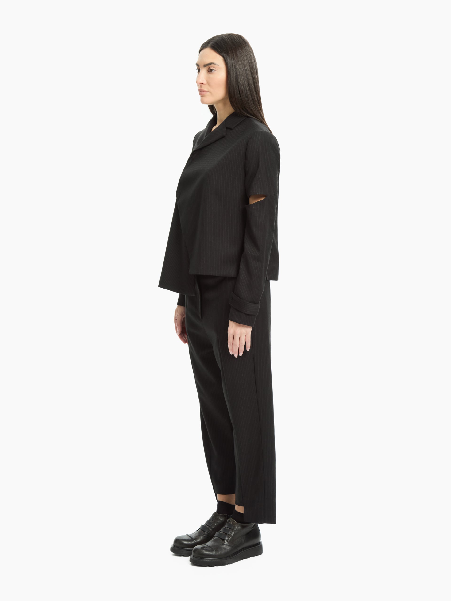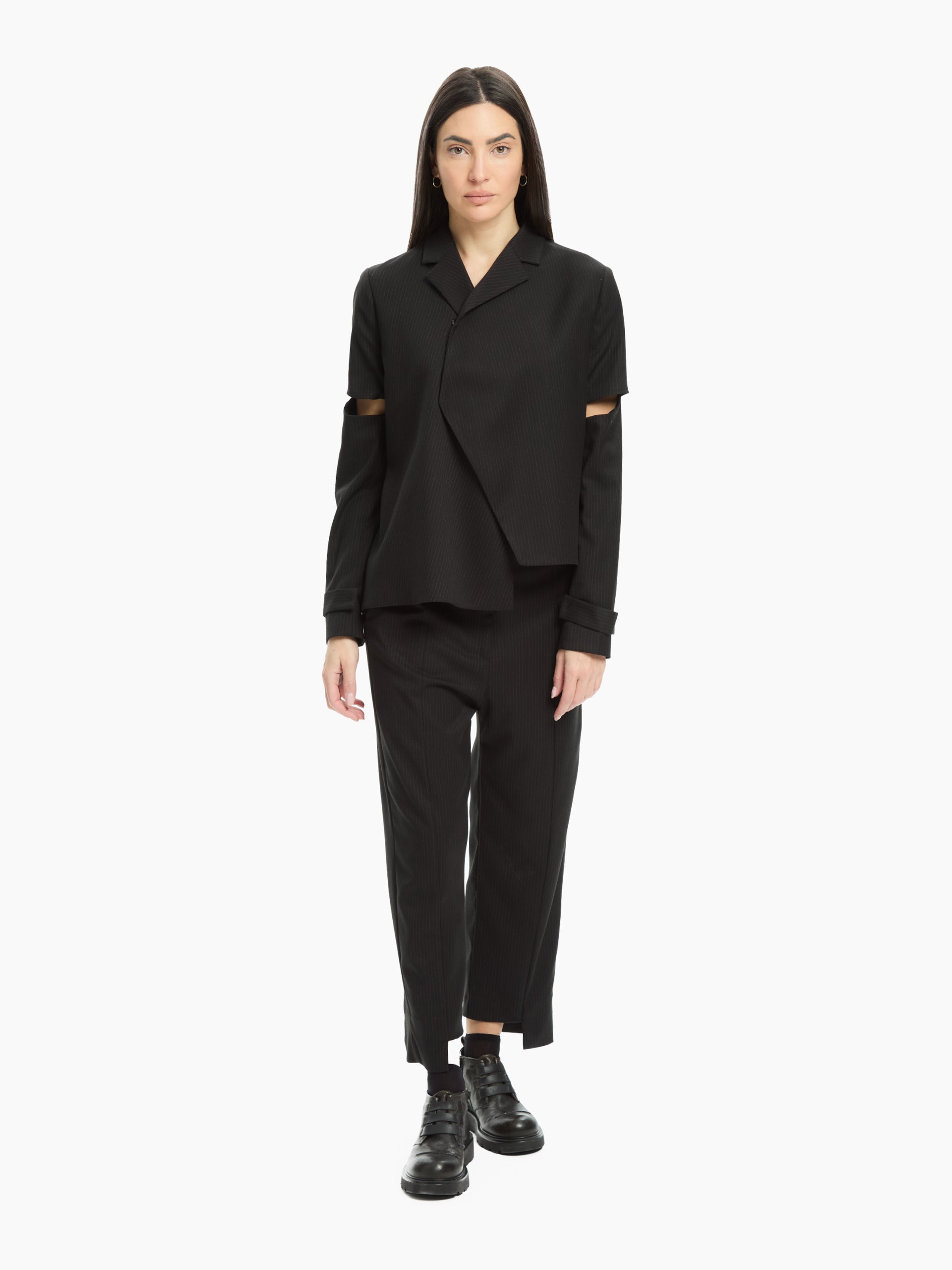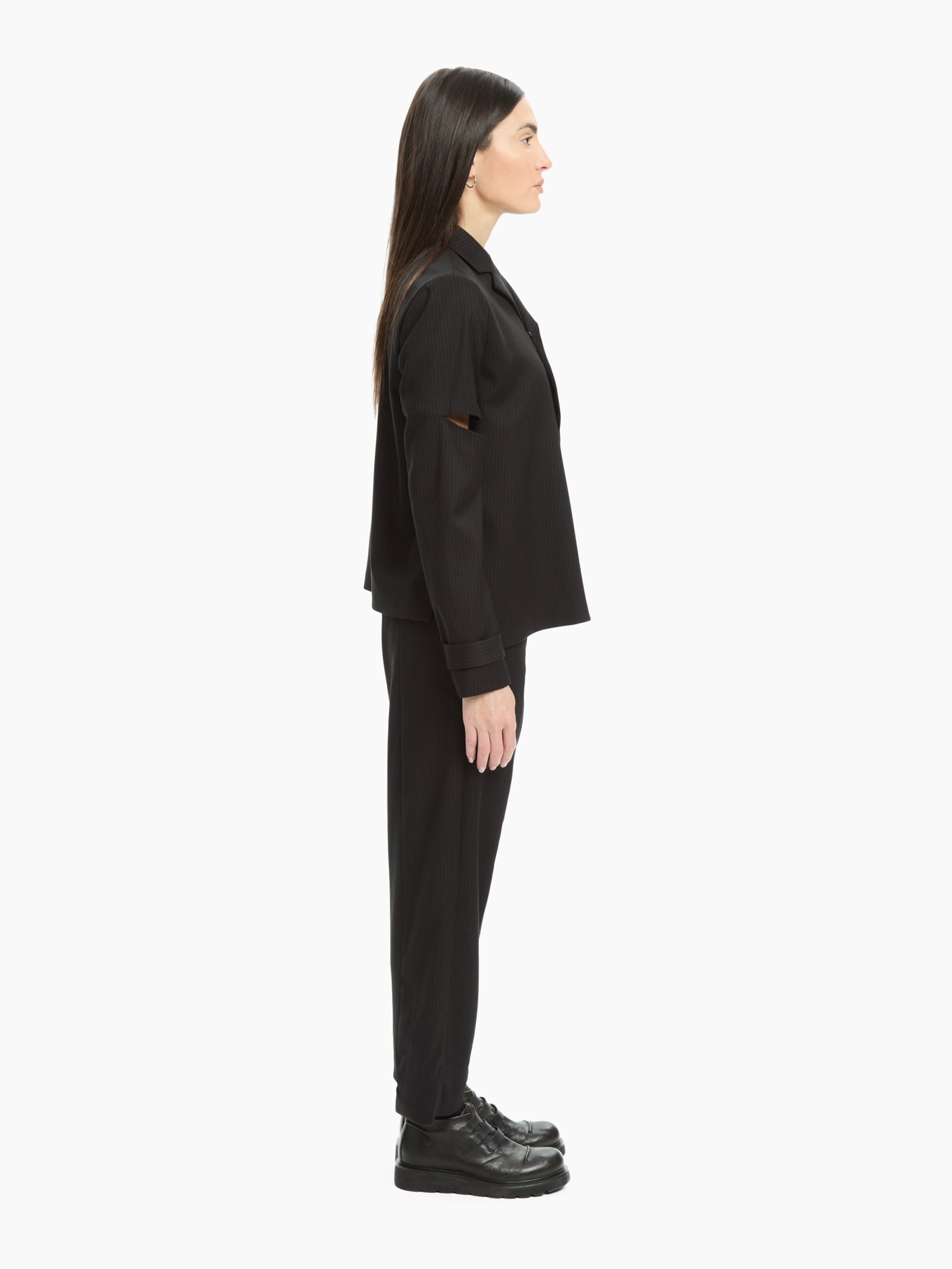 Un capo che sovverte i codici classici della sartoria con un tocco contemporaneo. La costruzione asimmetrica e i cut-out sulle maniche aggiungono un dettaglio inaspettato e audace, mentre la linea fluida mantiene un’eleganza essenziale. Una giacca dal carattere deciso, pensata per look urbani e sofisticati.