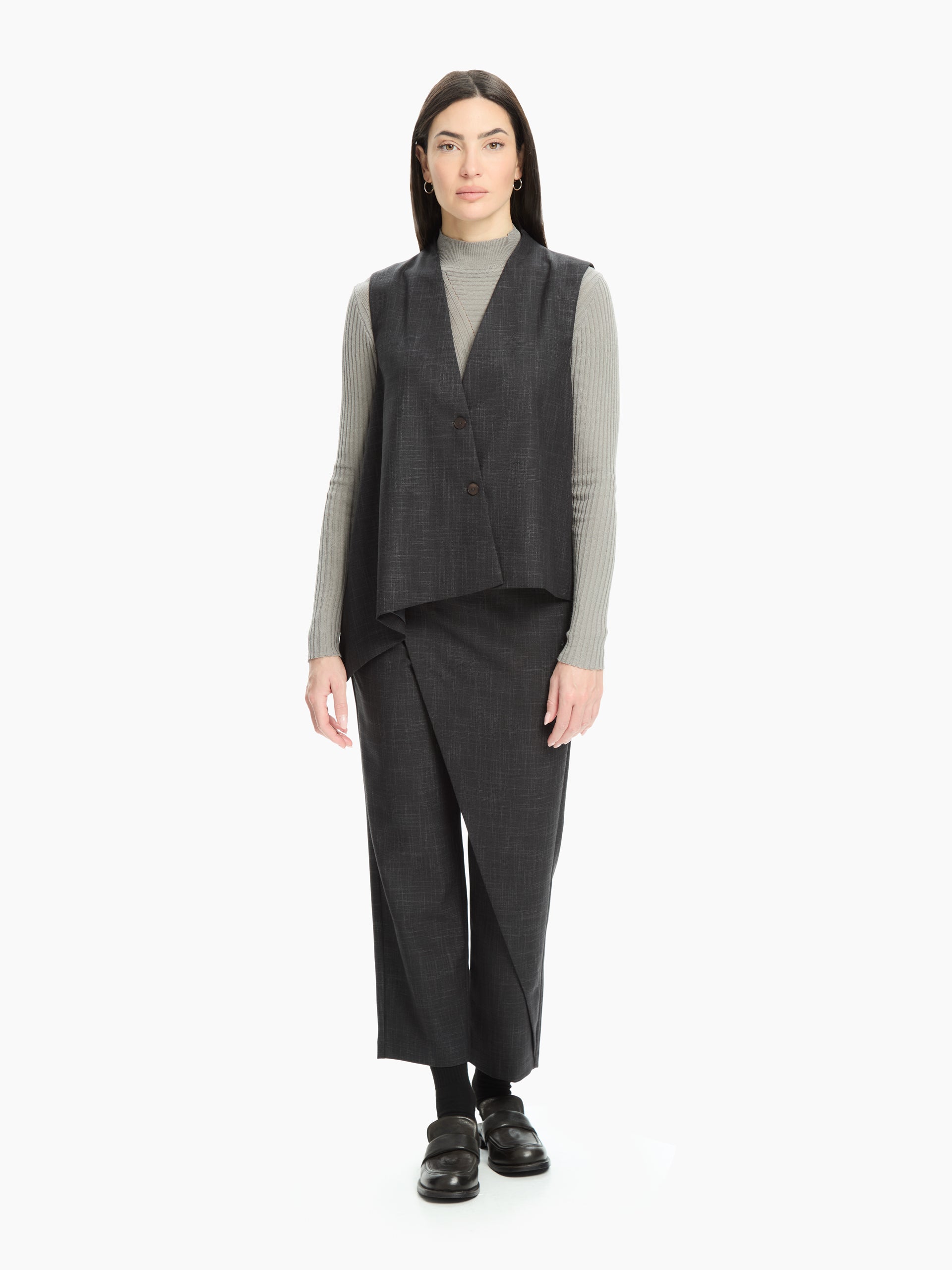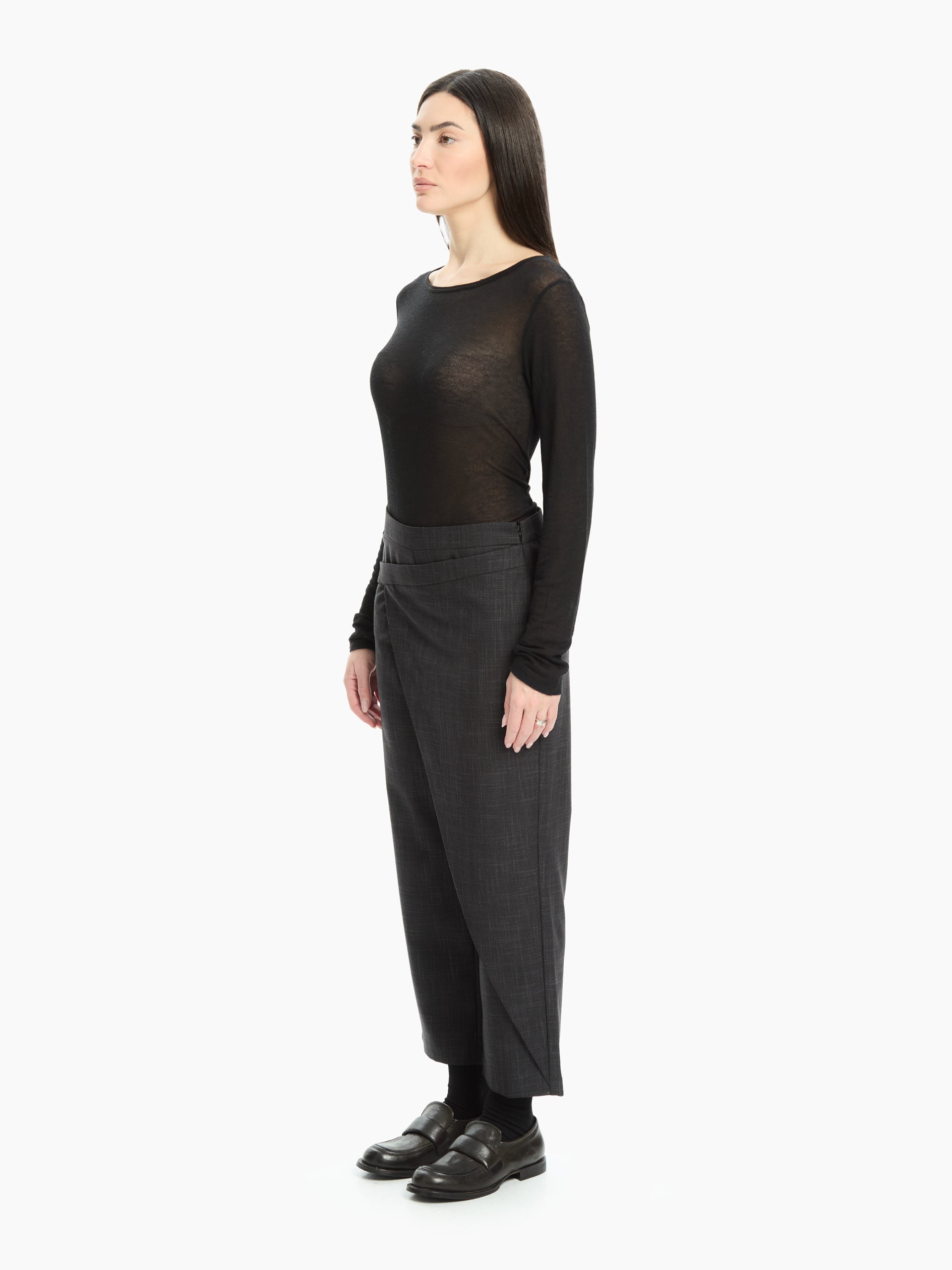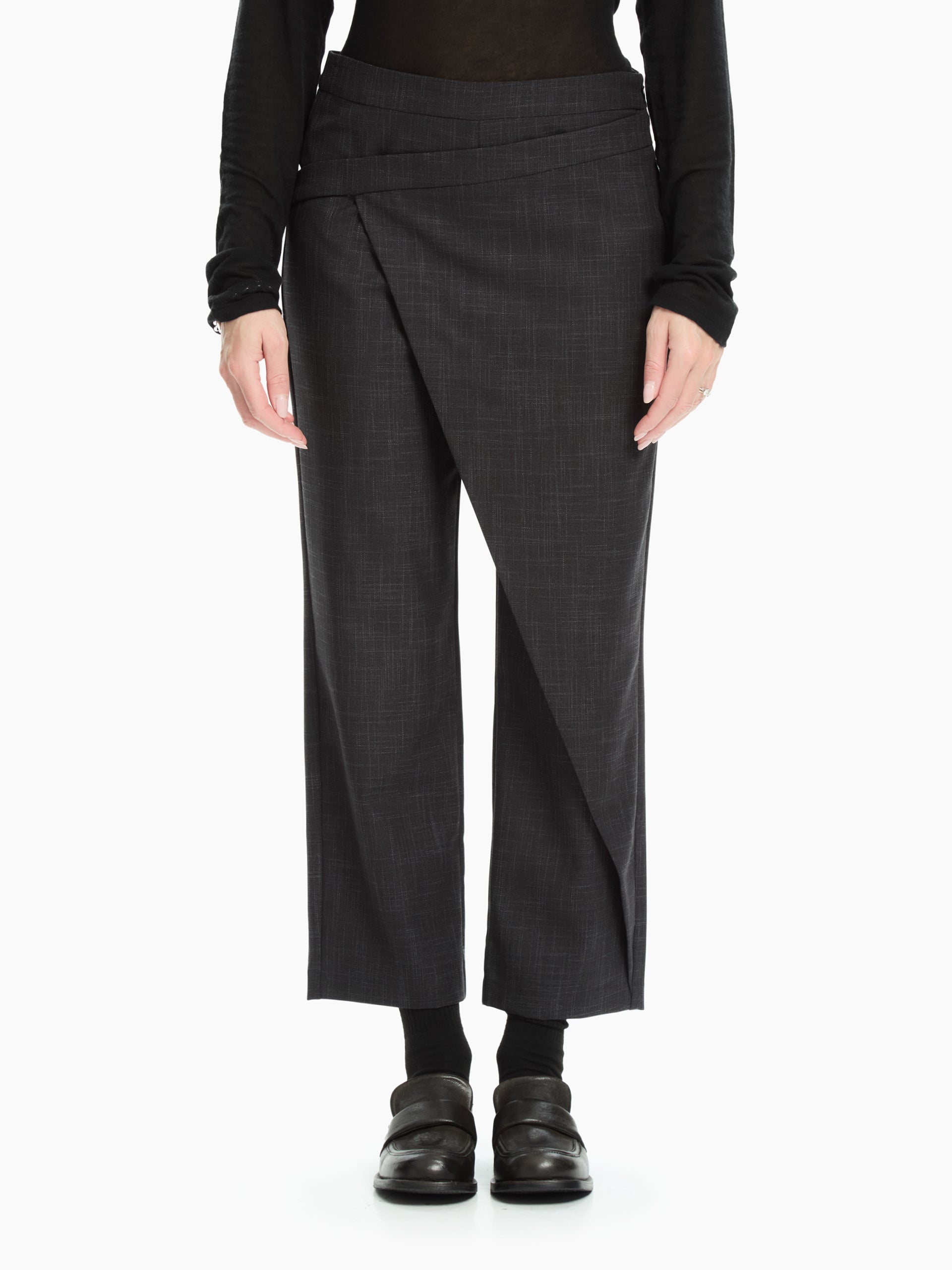 Pantalone che unisce linee pulite e design contemporaneo, perfetto per chi cerca un capo sofisticato con un tocco creativo. Pannello frontale asimmetrico che crea un effetto sovrapposto elegante, donando movimento e ricercatezza alla silhouette.