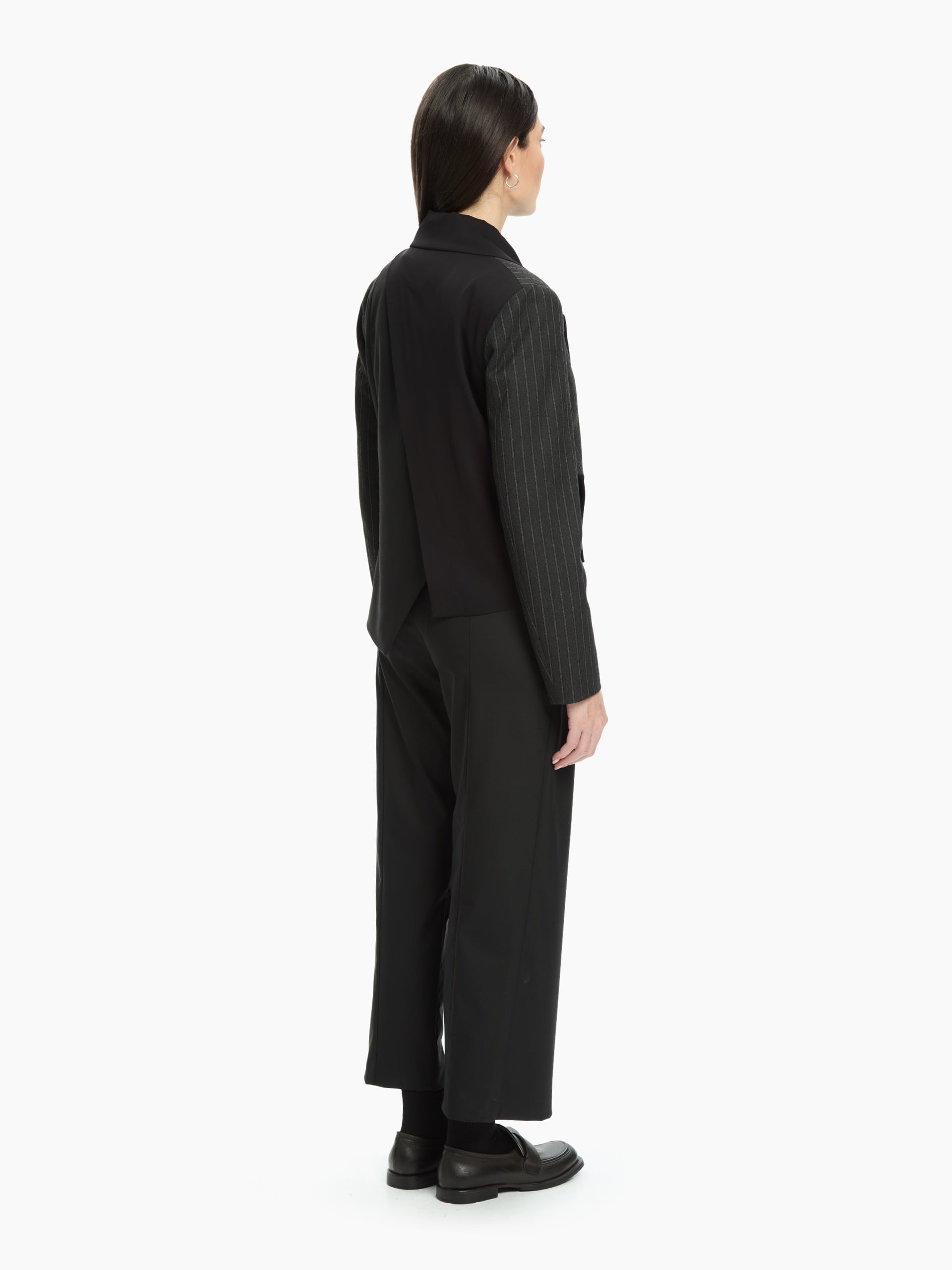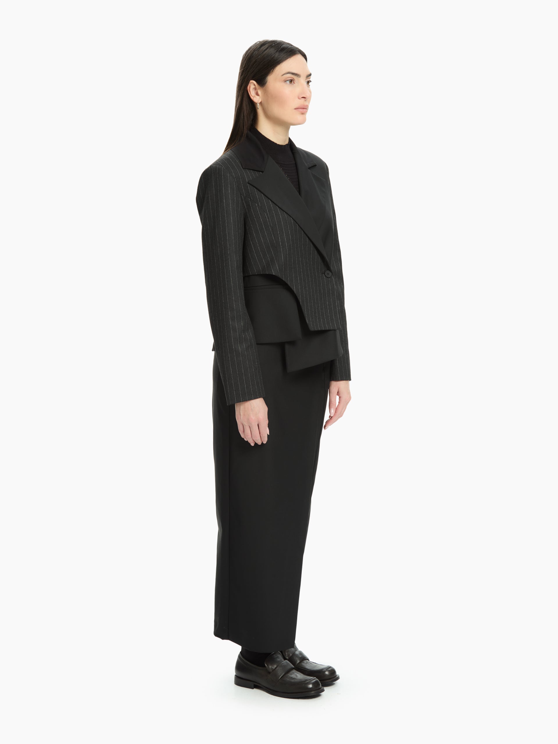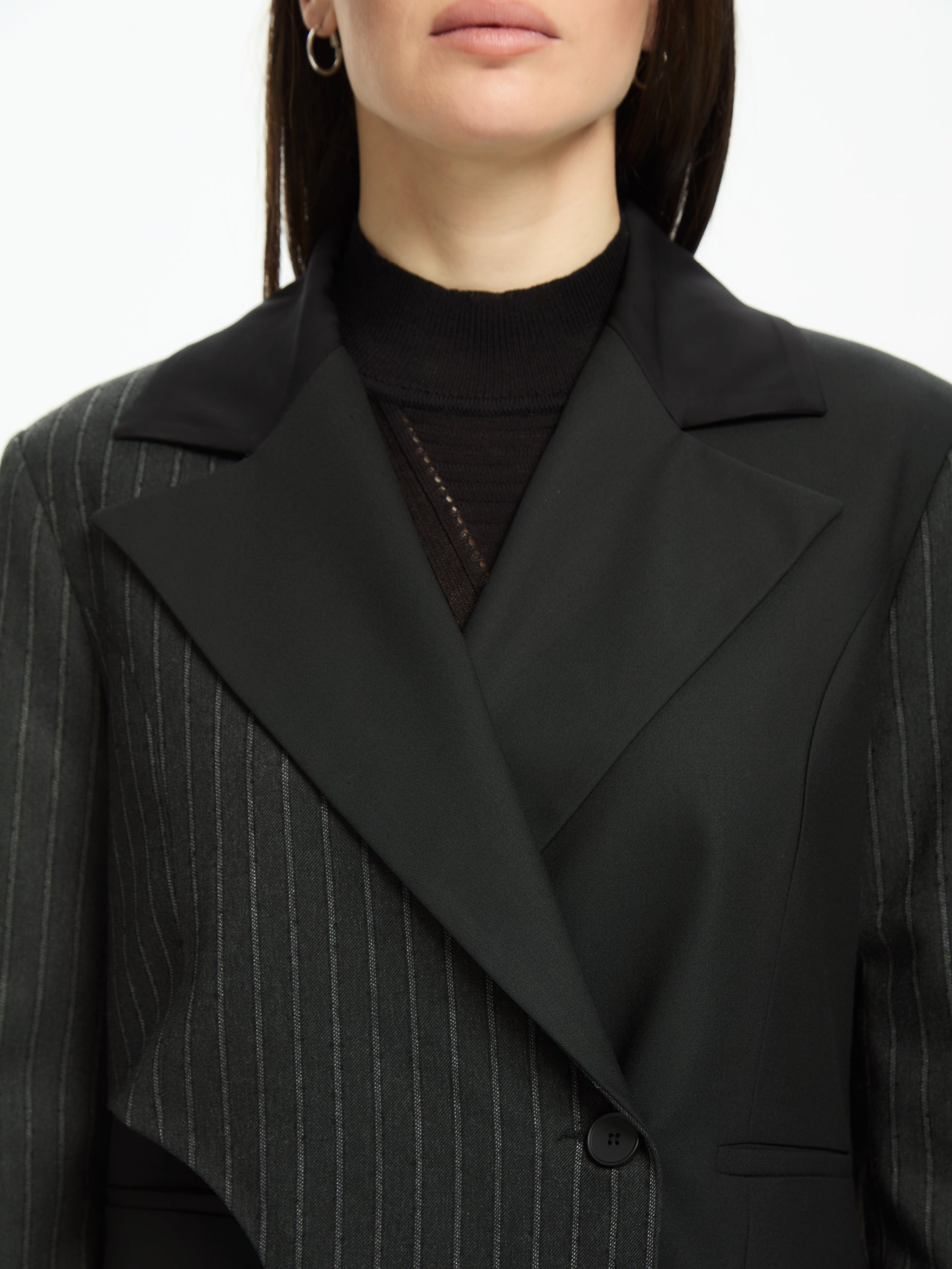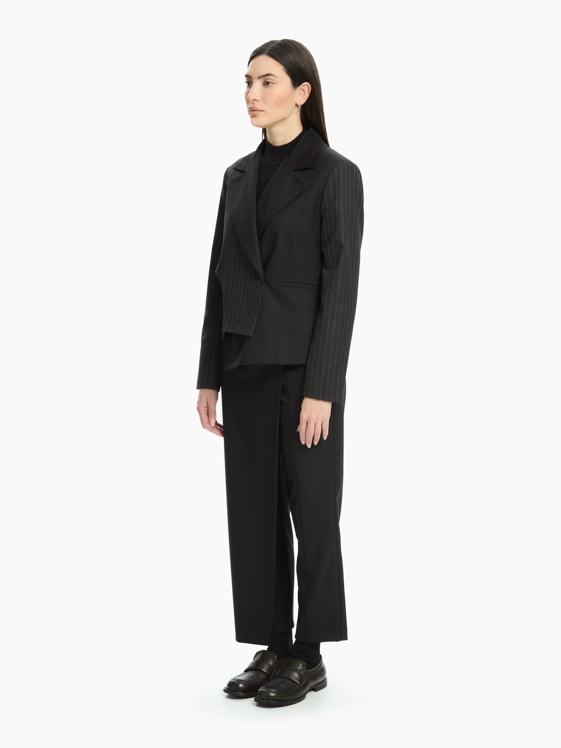 Giacca dal design contemporaneo unisce eleganza sartoriale e carattere urbano. Presenta un gioco di pannelli asimmetrici che creano volumi moderni e una silhouette raffinata. Il corpo della giacca combina superfici lisce con inserti a micro-righe verticali, aggiungendo profondità e contrasto visivo. Il rever ampio e la linea strutturata valorizzano la figura, mentre il taglio leggermente corto dona un look deciso e attuale.