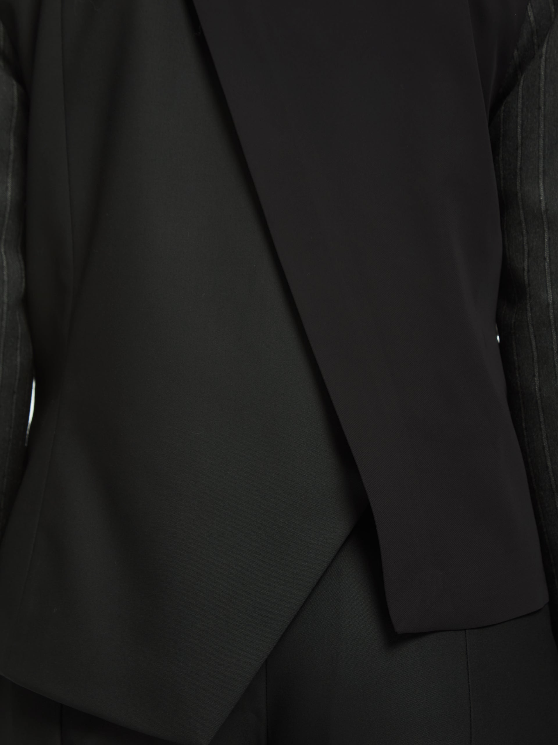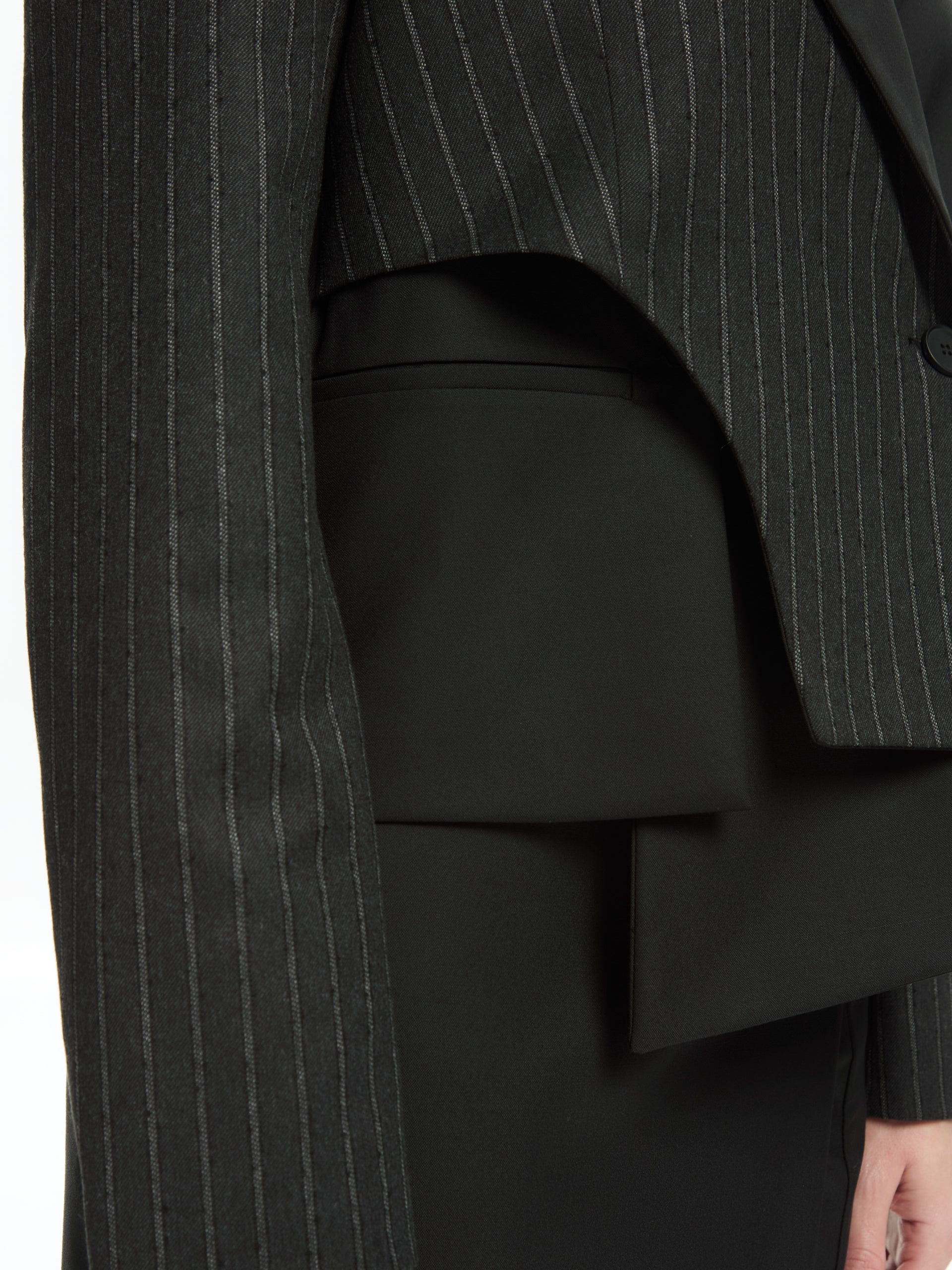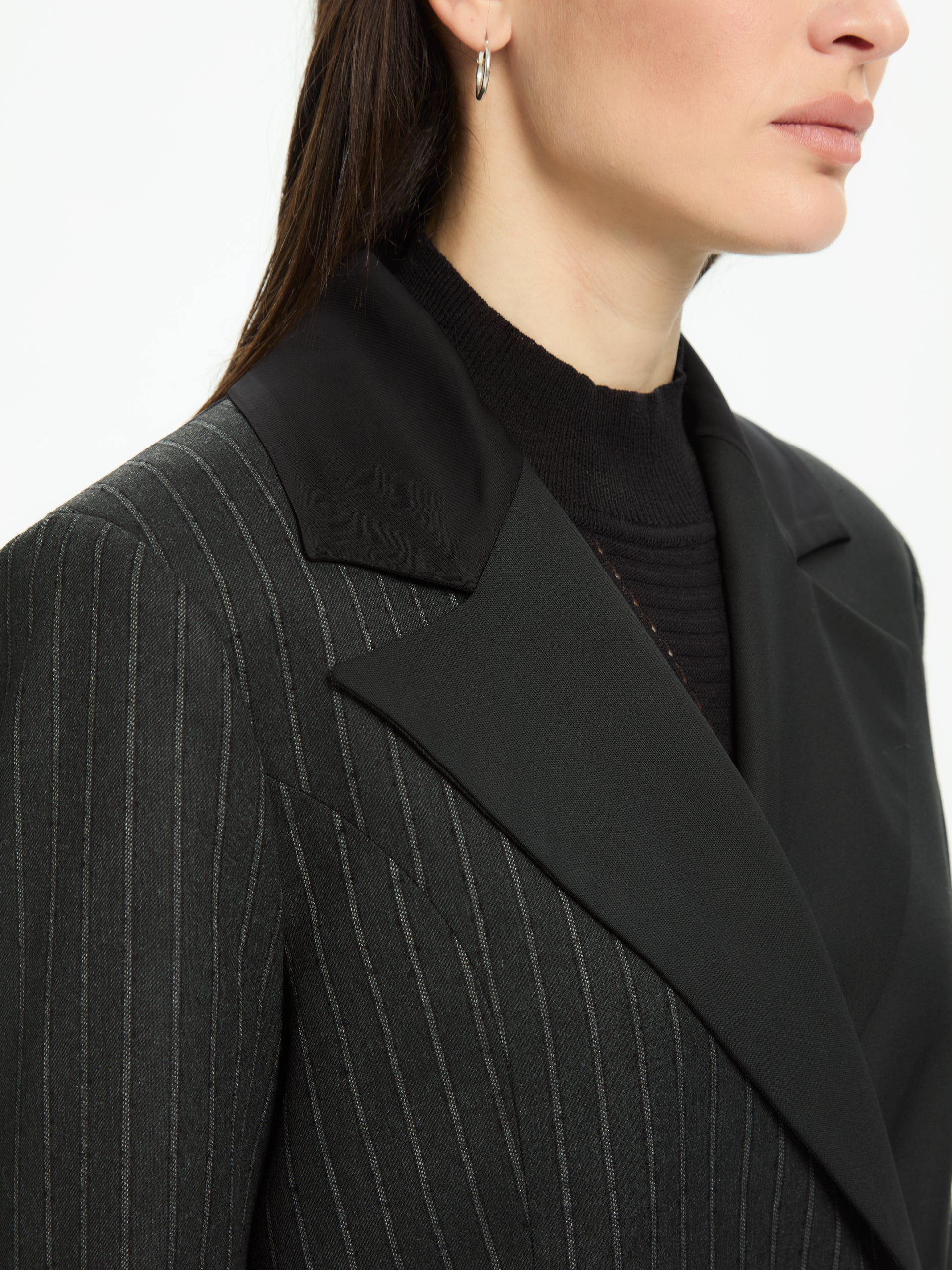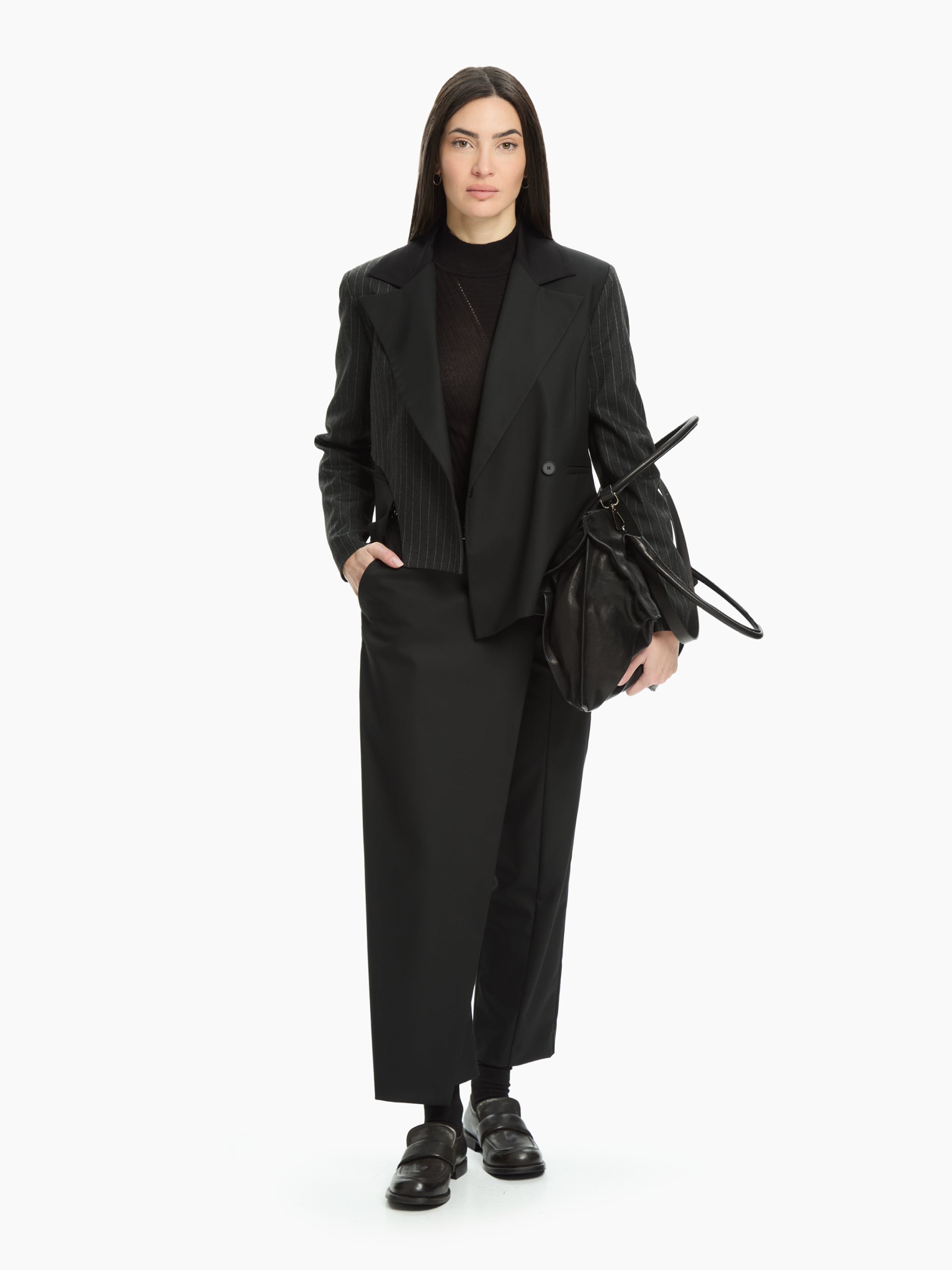 Giacca dal design contemporaneo unisce eleganza sartoriale e carattere urbano. Presenta un gioco di pannelli asimmetrici che creano volumi moderni e una silhouette raffinata. Il corpo della giacca combina superfici lisce con inserti a micro-righe verticali, aggiungendo profondità e contrasto visivo. Il rever ampio e la linea strutturata valorizzano la figura, mentre il taglio leggermente corto dona un look deciso e attuale.