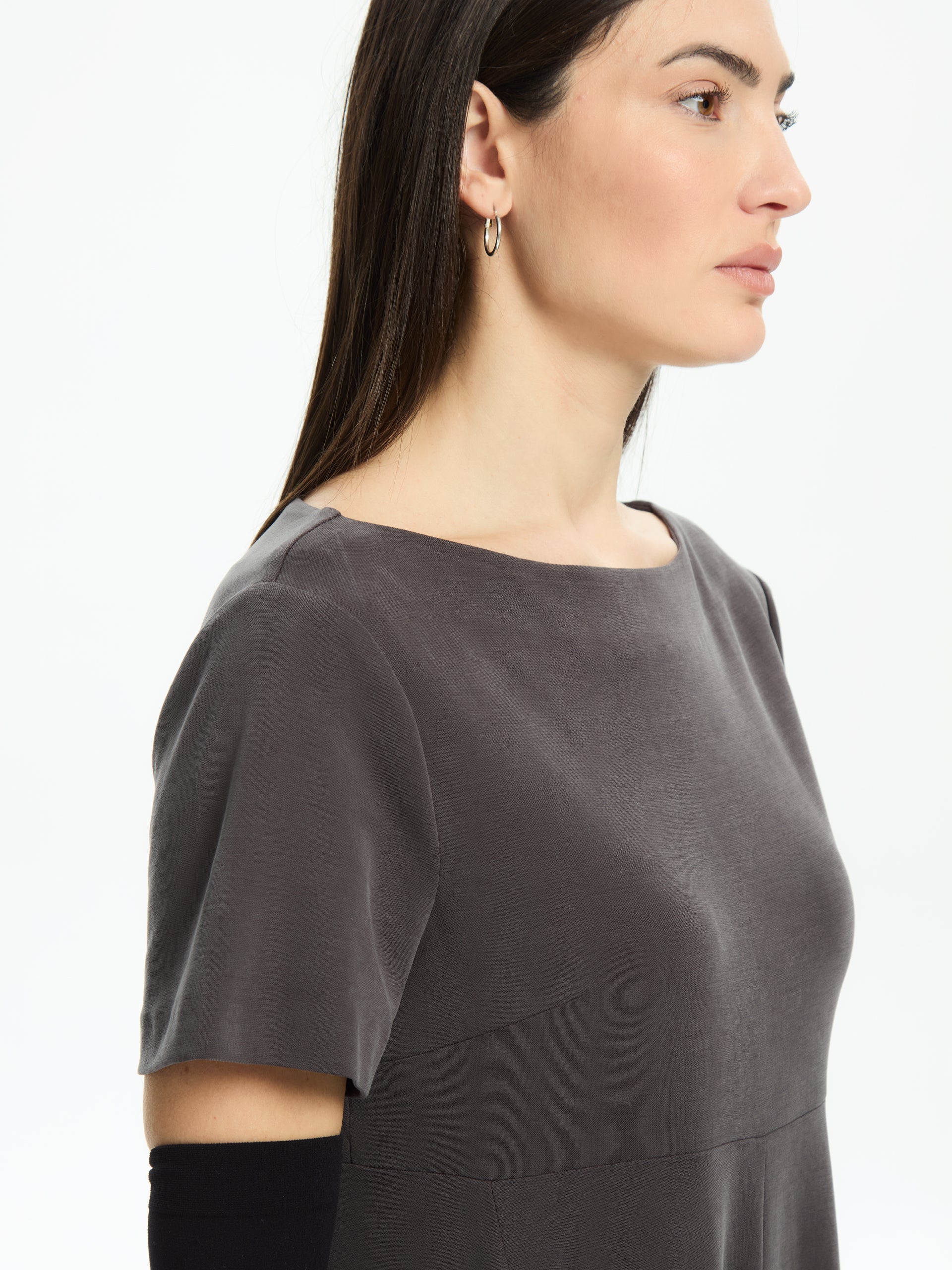 - Scollo rotondo pulito e maniche corte che donano equilibrio alla silhouette.