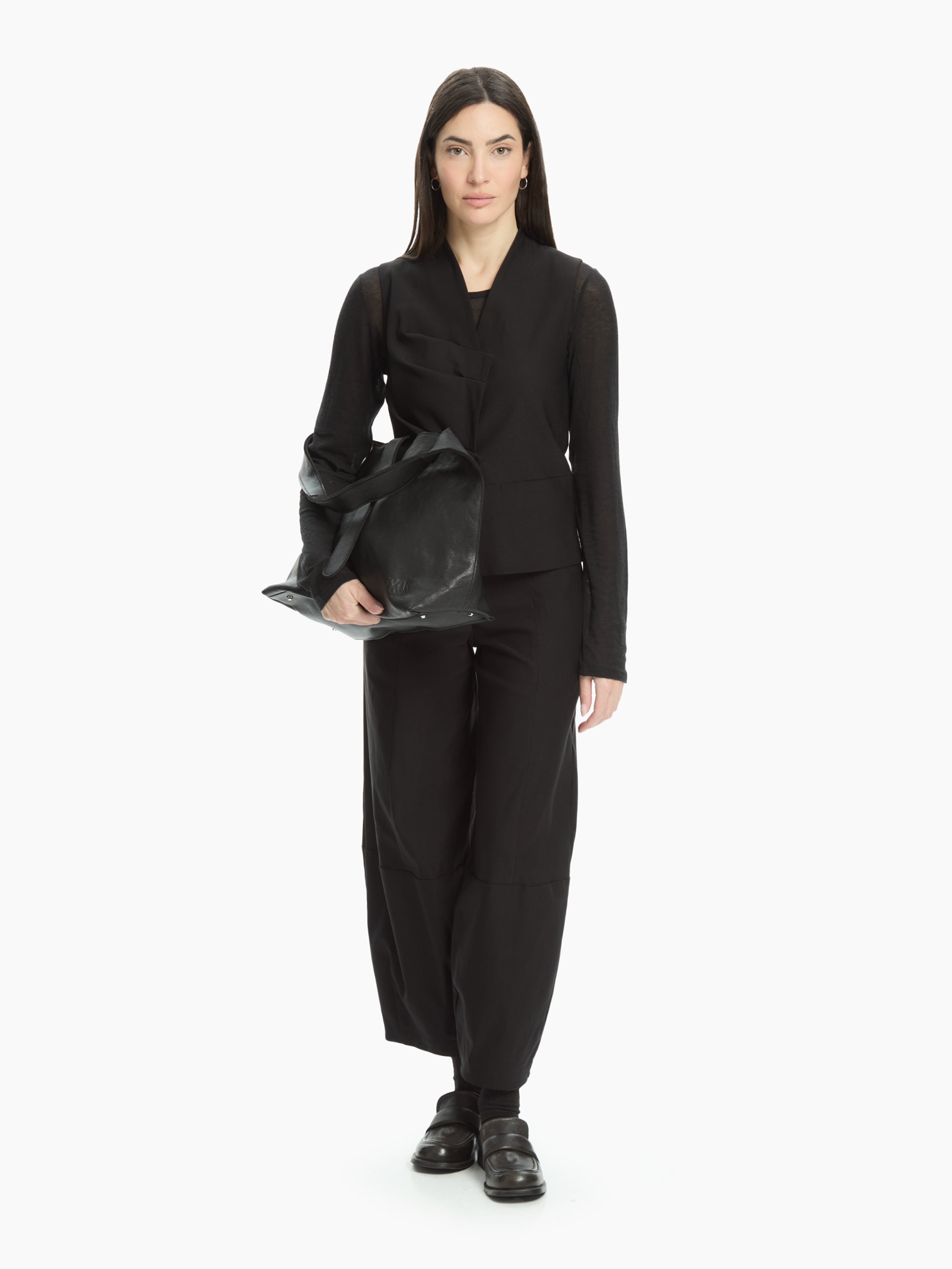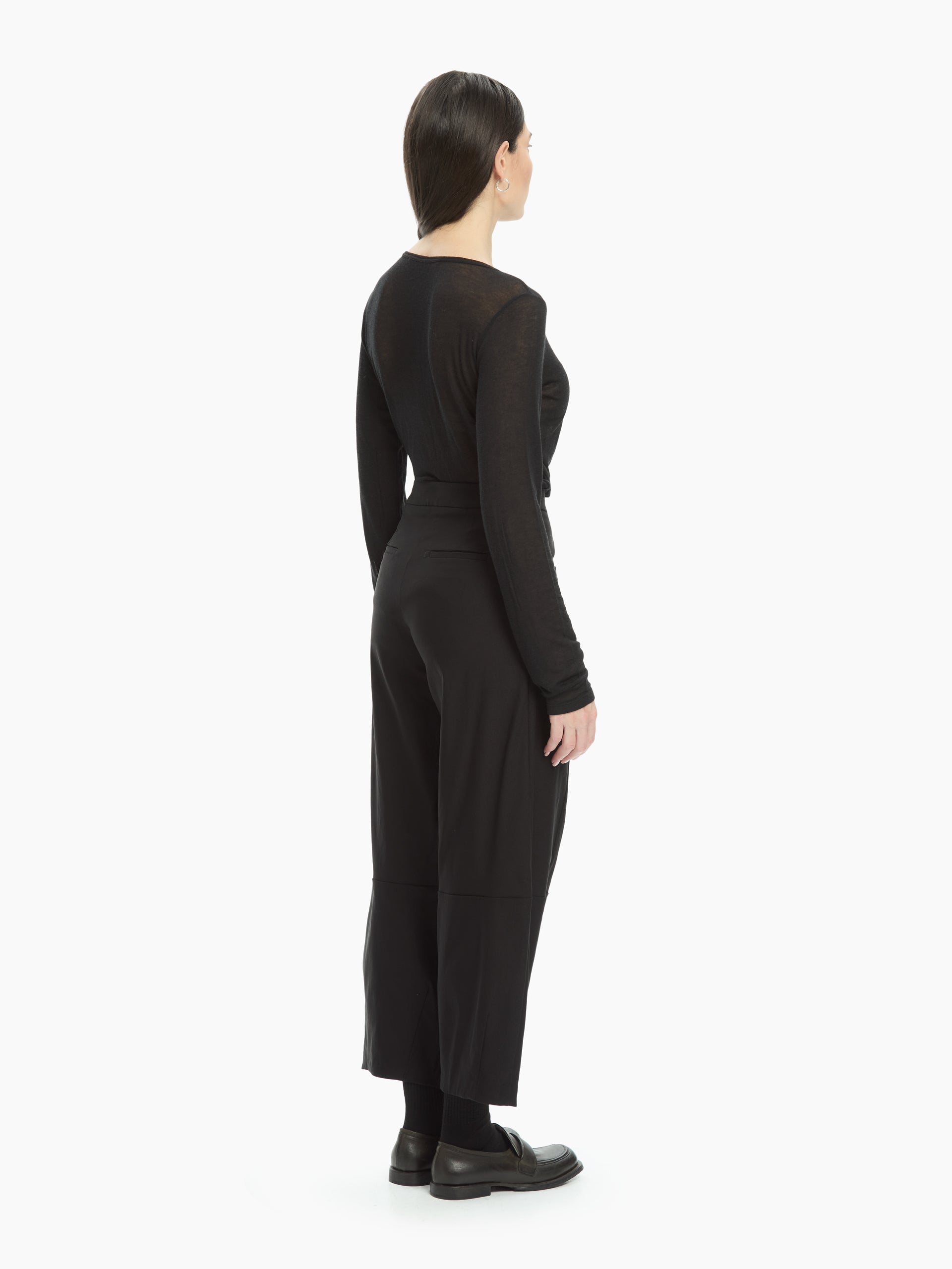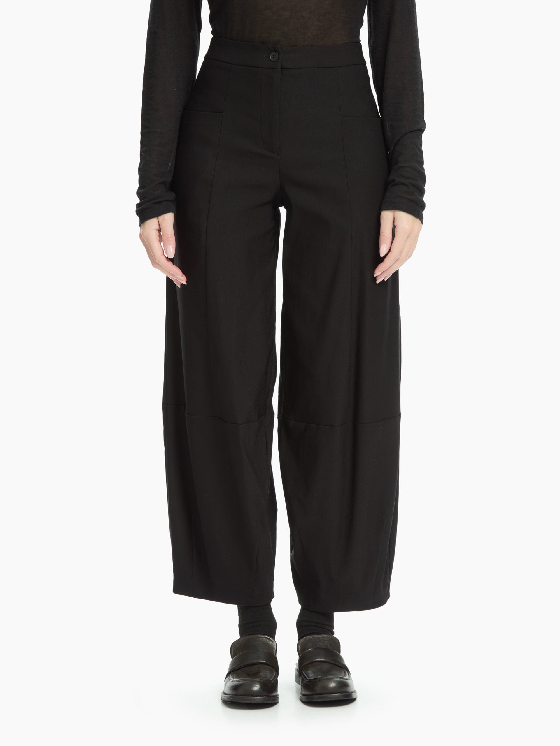 Pantalone che unisce un design contemporaneo a un comfort quotidiano grazie alla sua linea morbida e leggermente voluminosa. La vita alta con chiusura a bottone scolpisce la silhouette, mentre le cuciture orizzontali e verticali lungo la gamba aggiungono carattere e un effetto strutturato discreto ma distintivo.