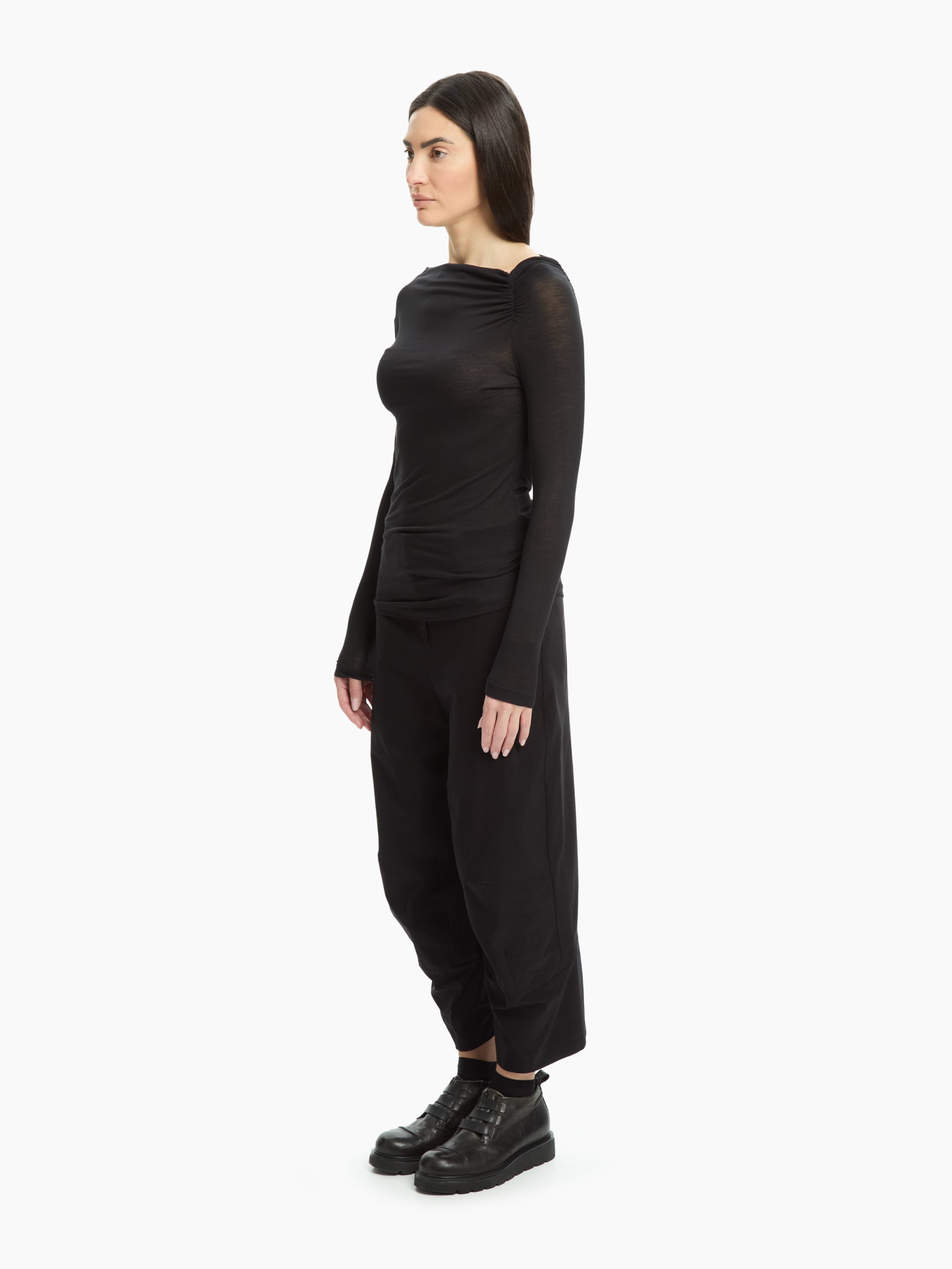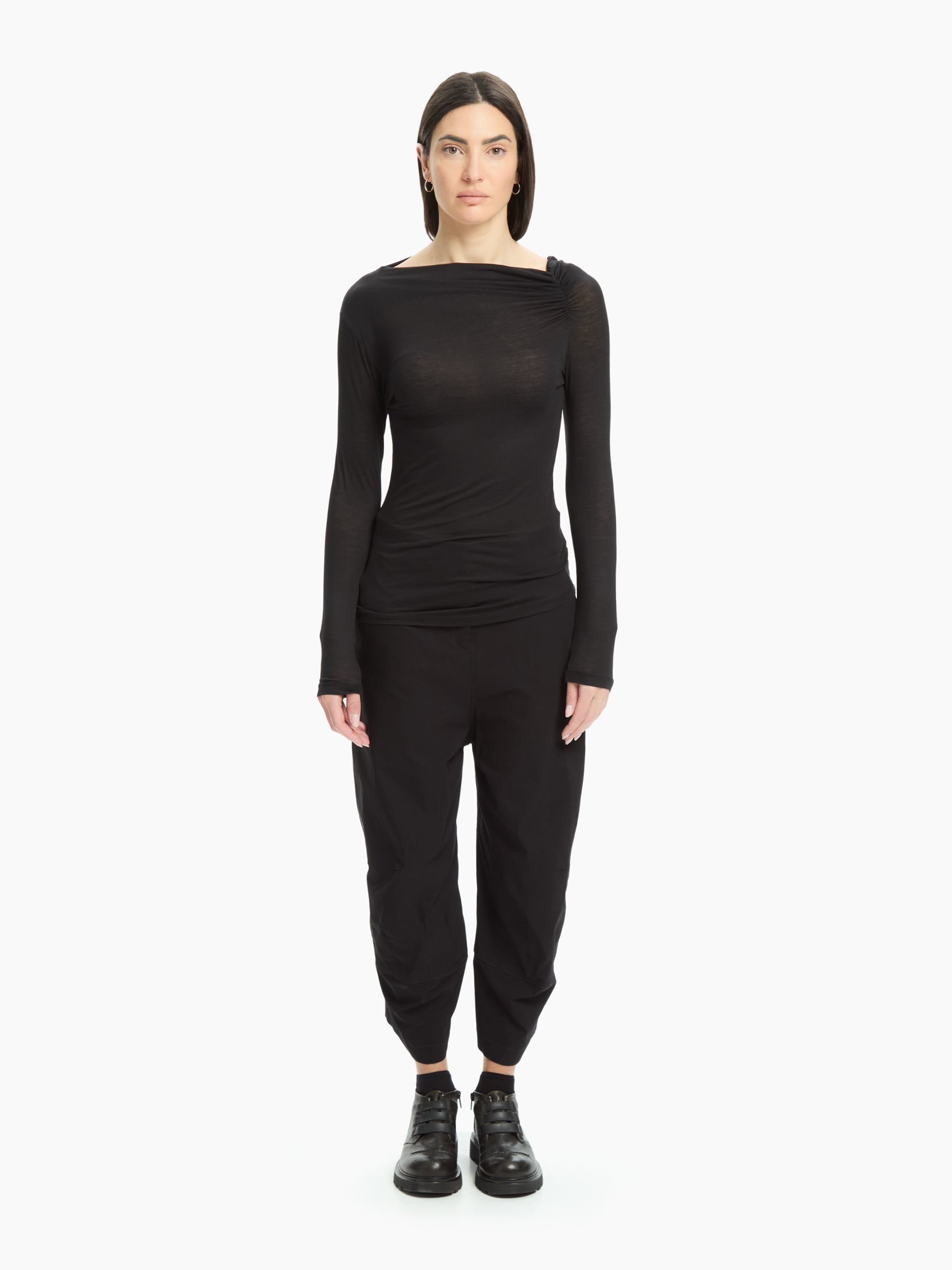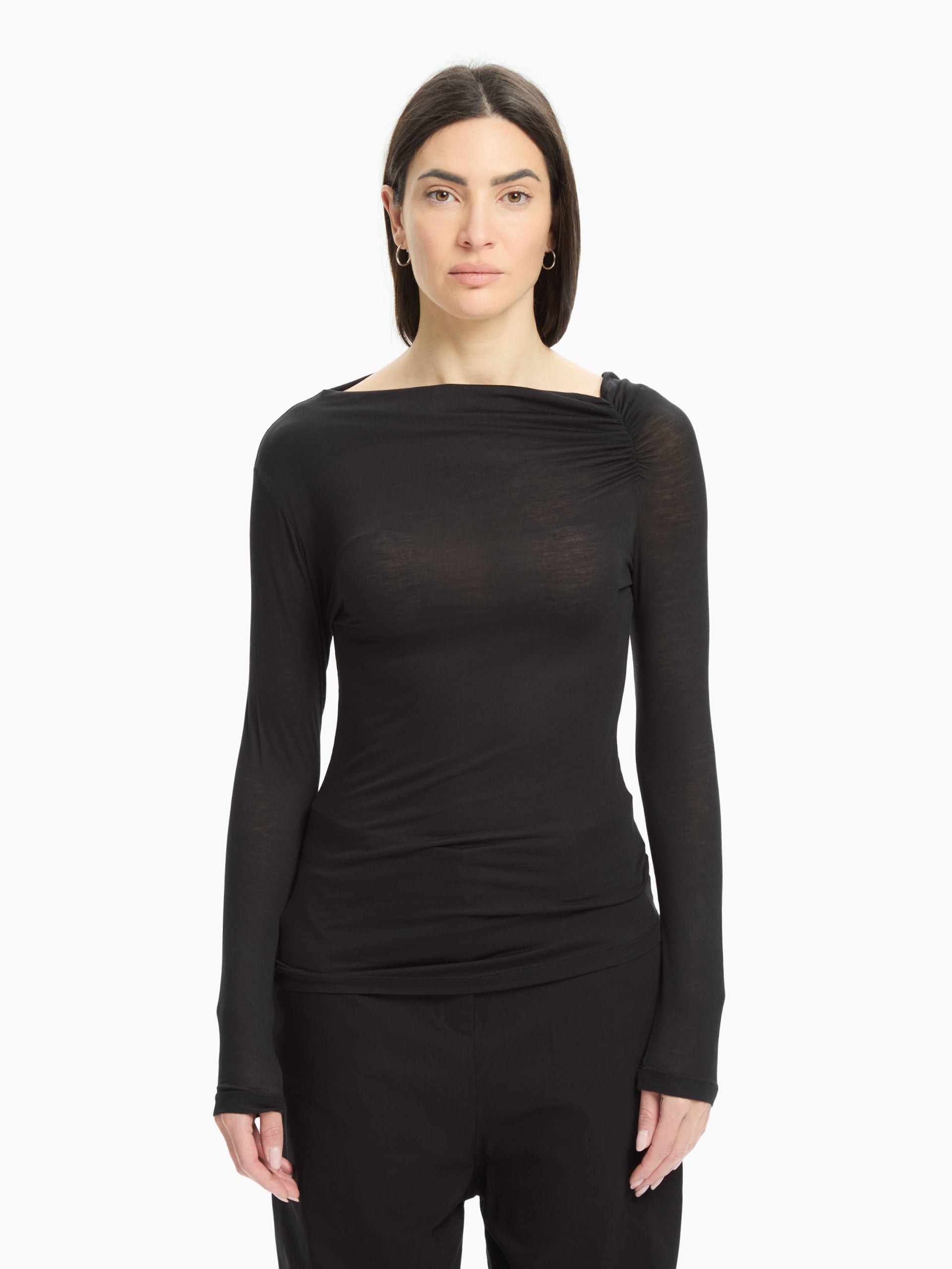 Un top essenziale dal design raffinato e contemporaneo. Realizzato in misto modal e lana, unisce leggerezza e morbidezza in un fit asciutto che valorizza la silhouette. Il drappeggio sulla spalla aggiunge un dettaglio femminile e dinamico, mentre la linea pulita lo rende perfetto per look urbani e stratificati.