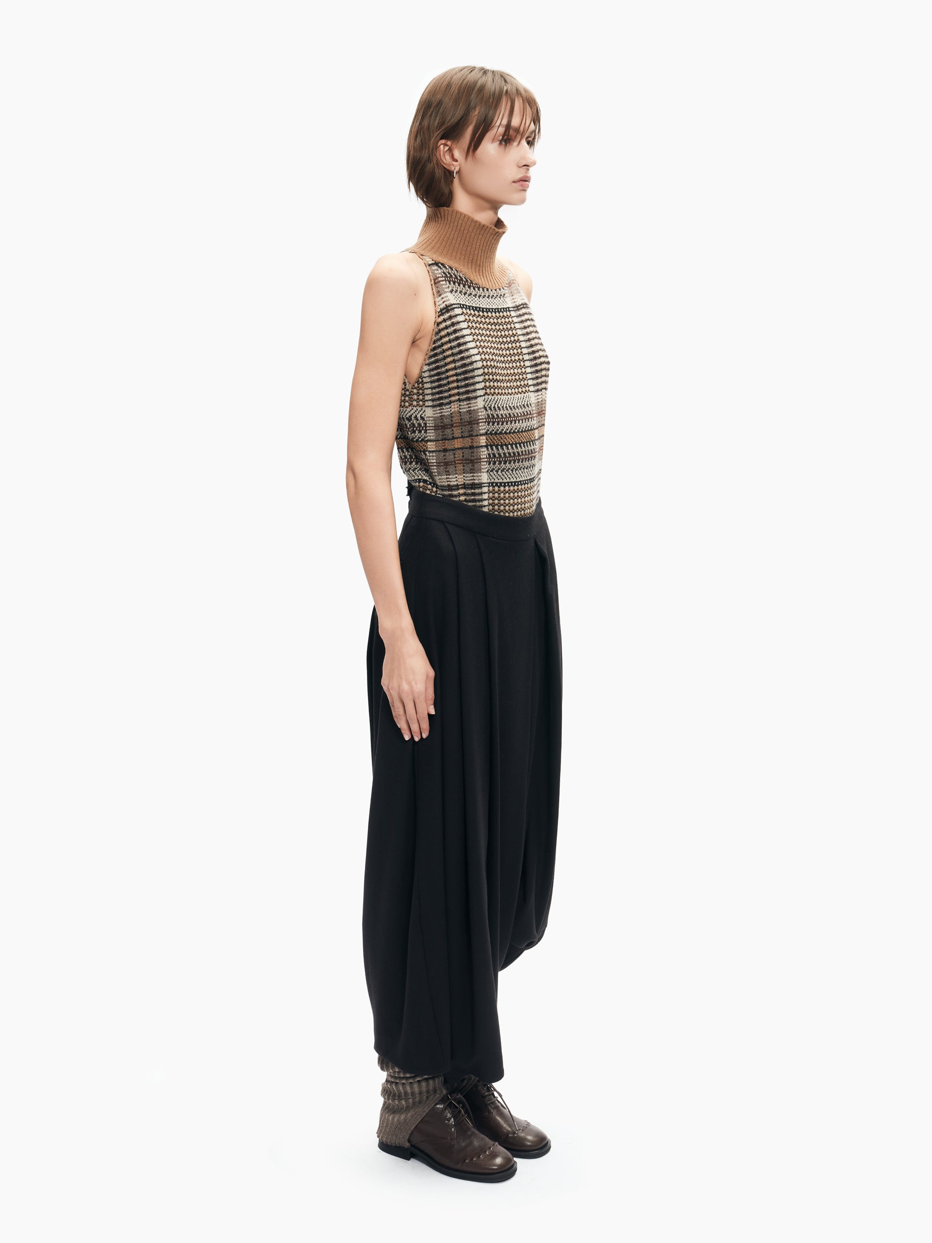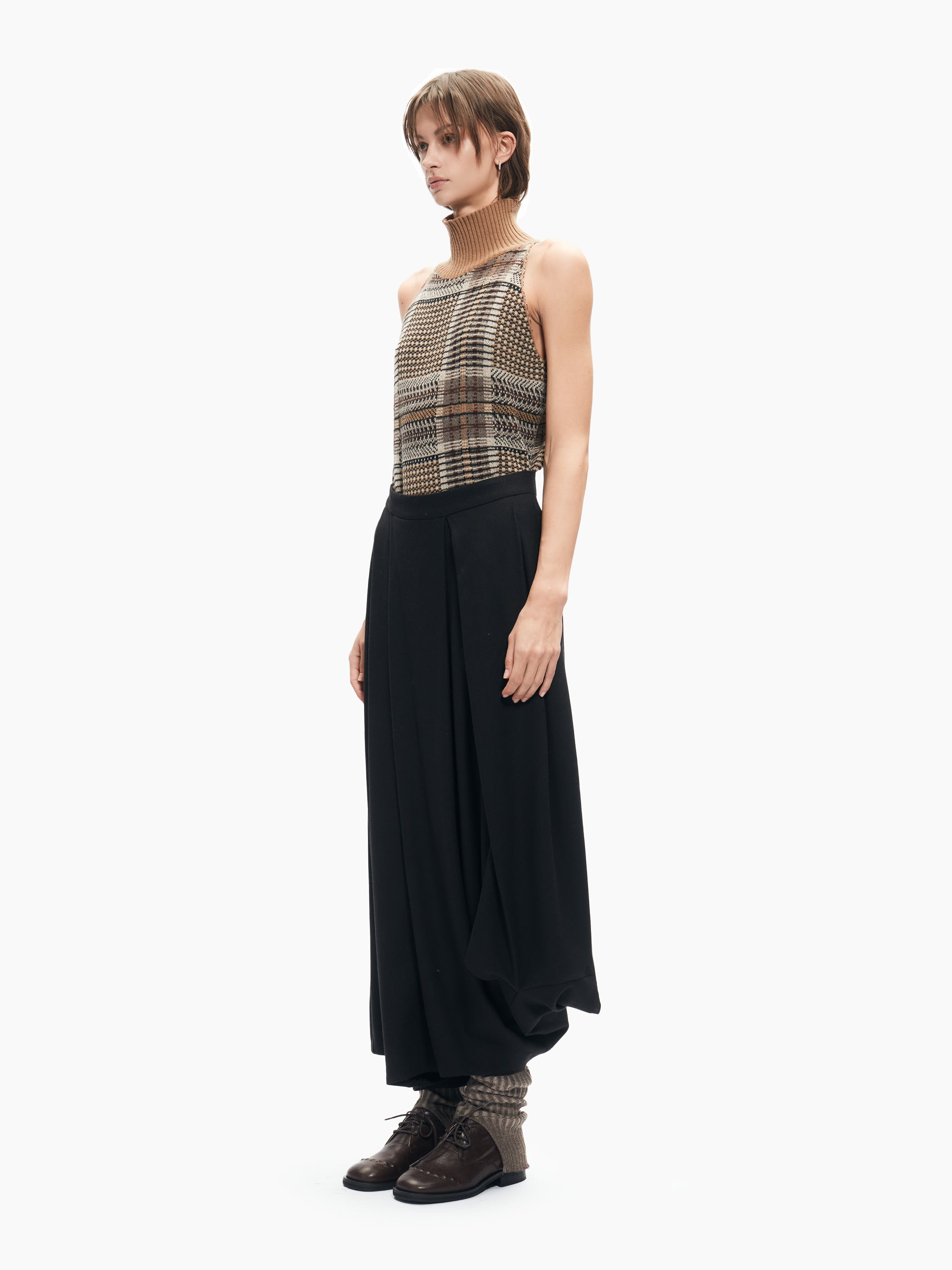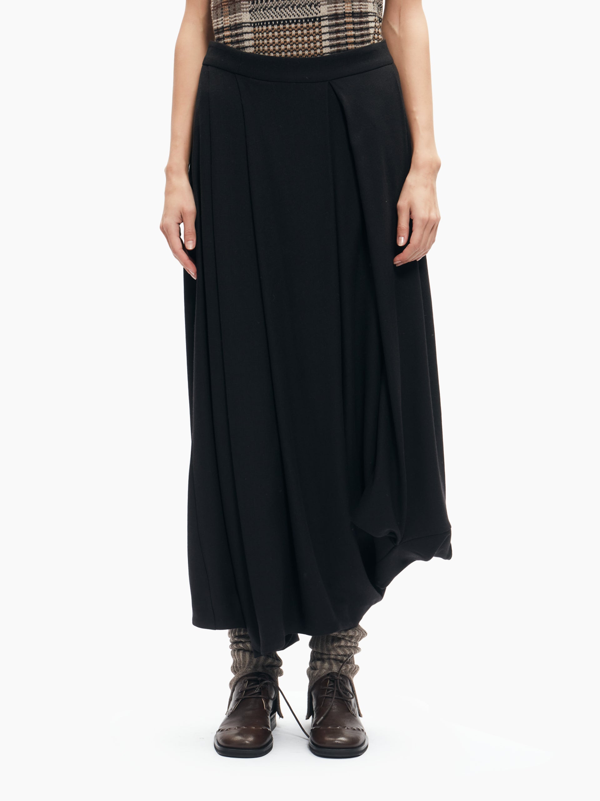 Questa gonna pantalone unisce leggerezza e struttura attraverso un volume morbido che accompagna il movimento con naturalezza. La vita liscia e pulita valorizza la silhouette, mentre le pieghe frontali creano profondità e slancio verticale. Il fondo ampio e irregolare dona un carattere contemporaneo, rendendo il capo versatile e ricercato.