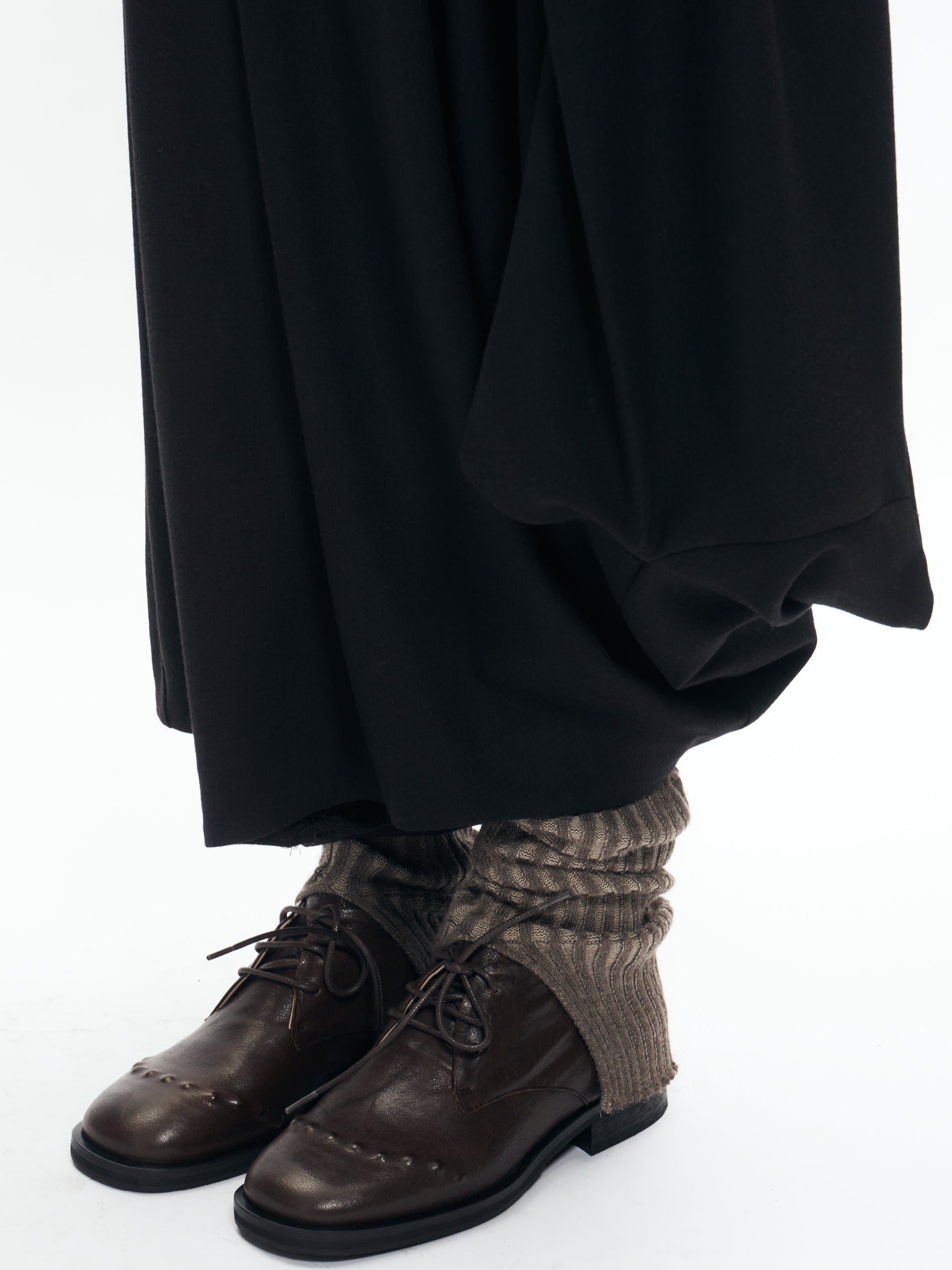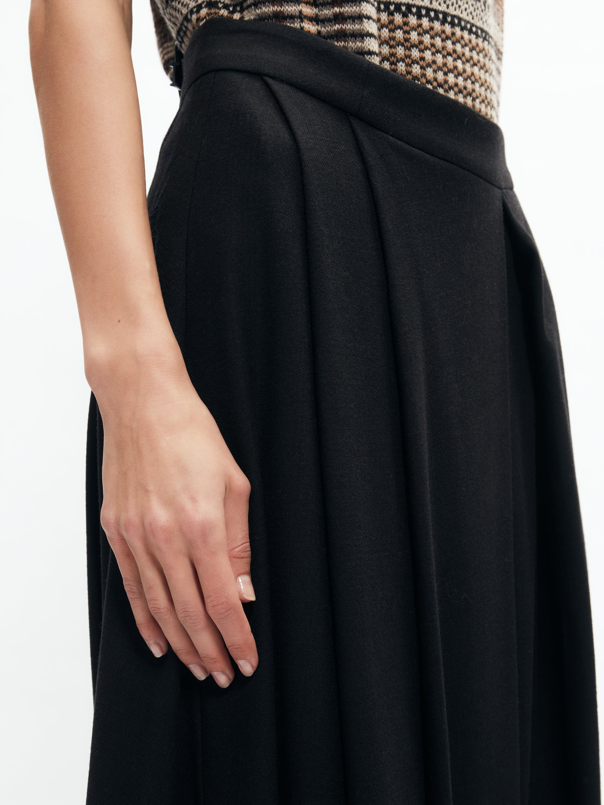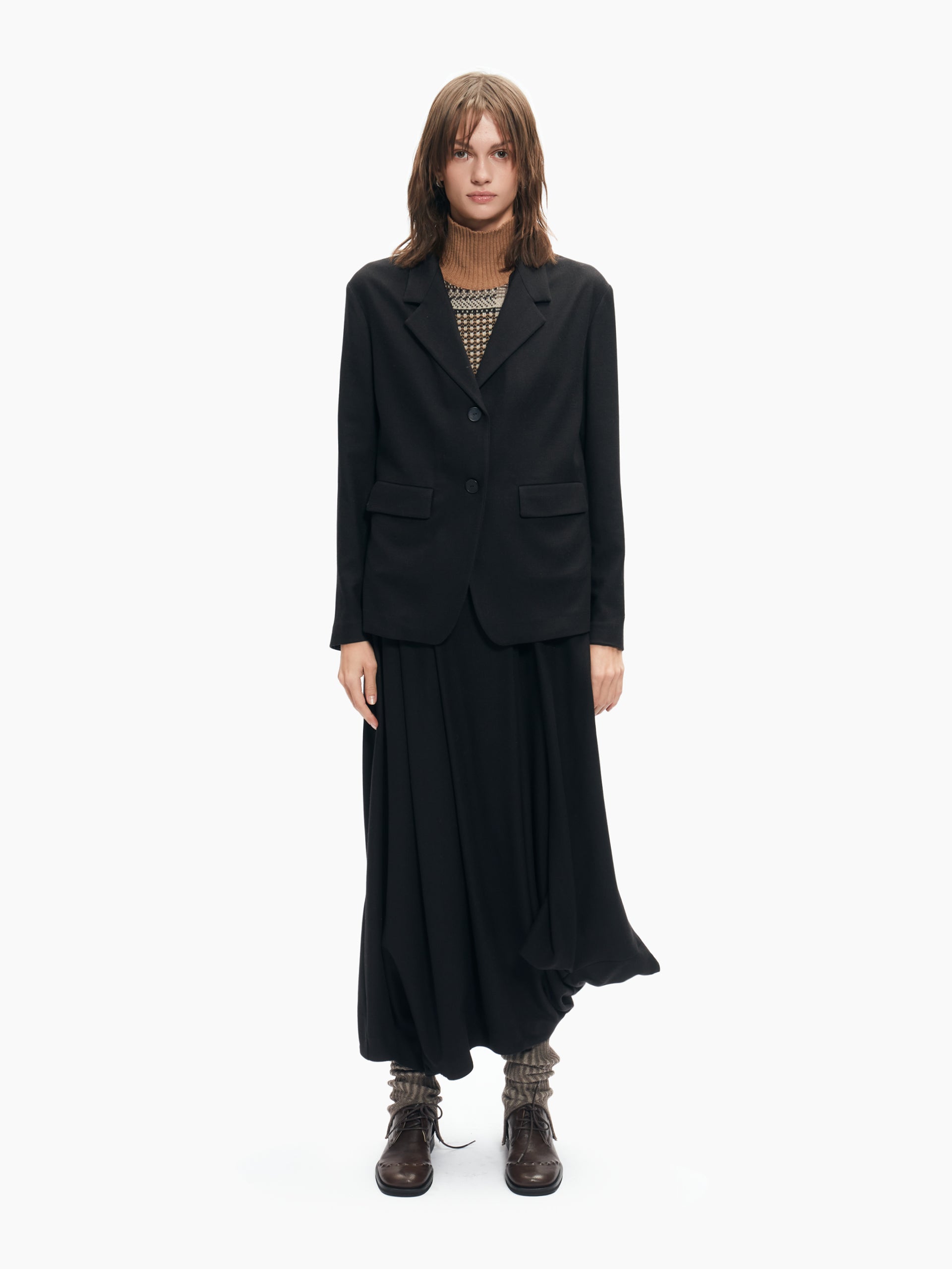 Questa gonna pantalone unisce leggerezza e struttura attraverso un volume morbido che accompagna il movimento con naturalezza. La vita liscia e pulita valorizza la silhouette, mentre le pieghe frontali creano profondità e slancio verticale. Il fondo ampio e irregolare dona un carattere contemporaneo, rendendo il capo versatile e ricercato.
