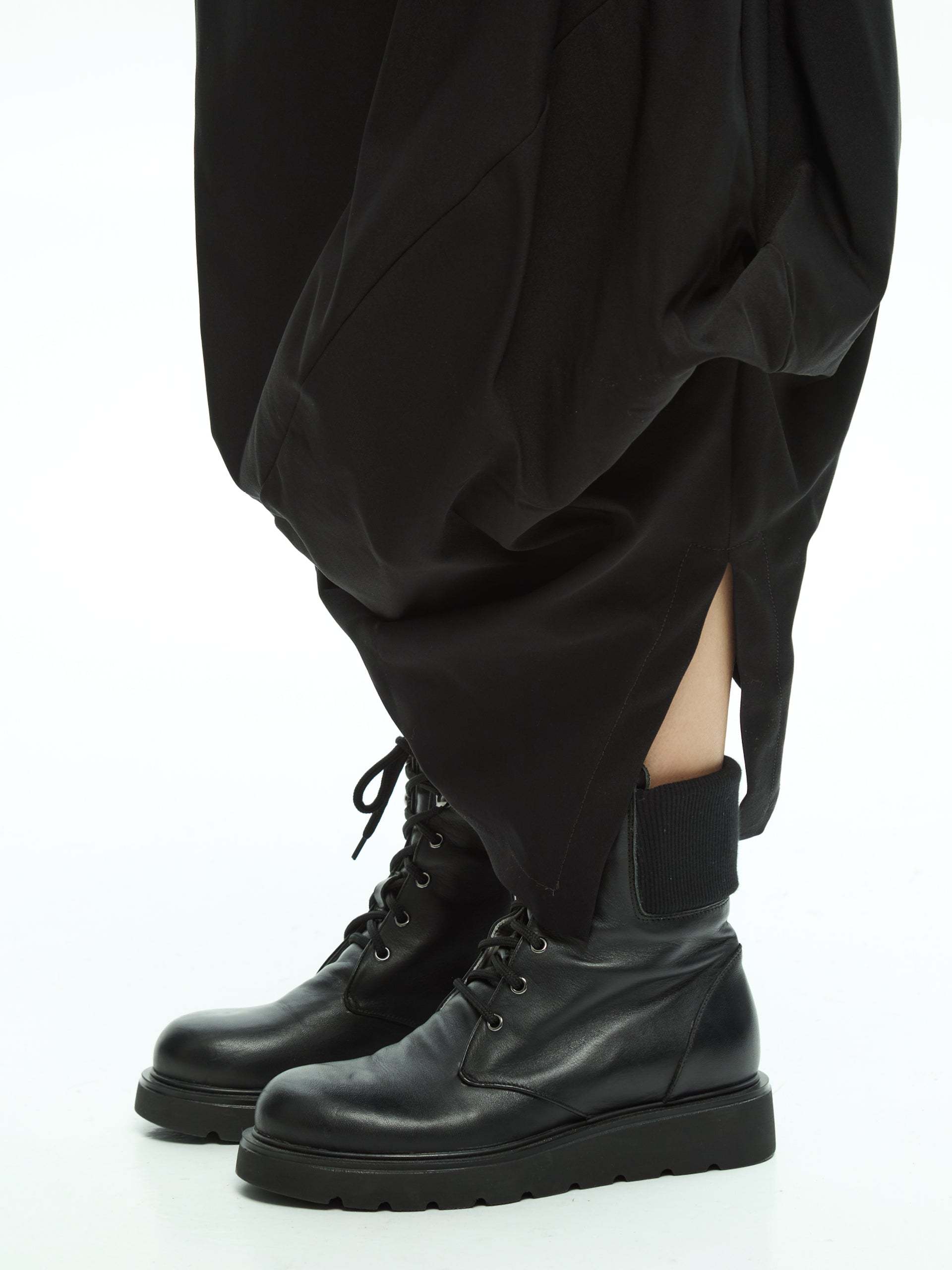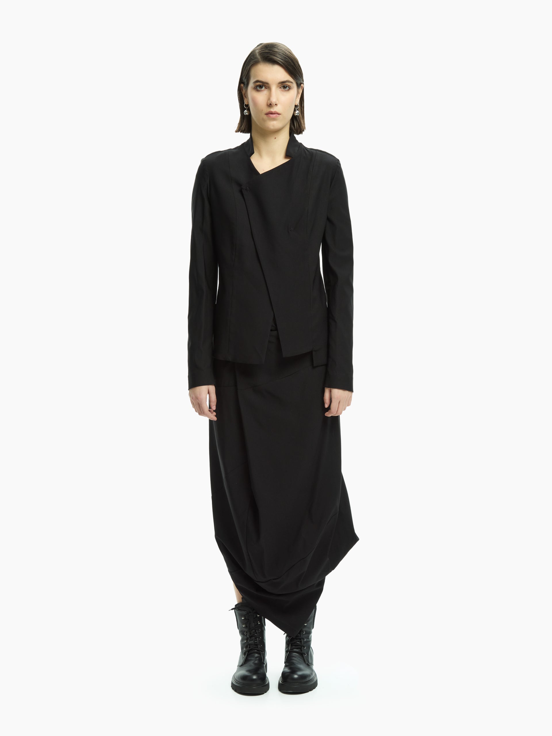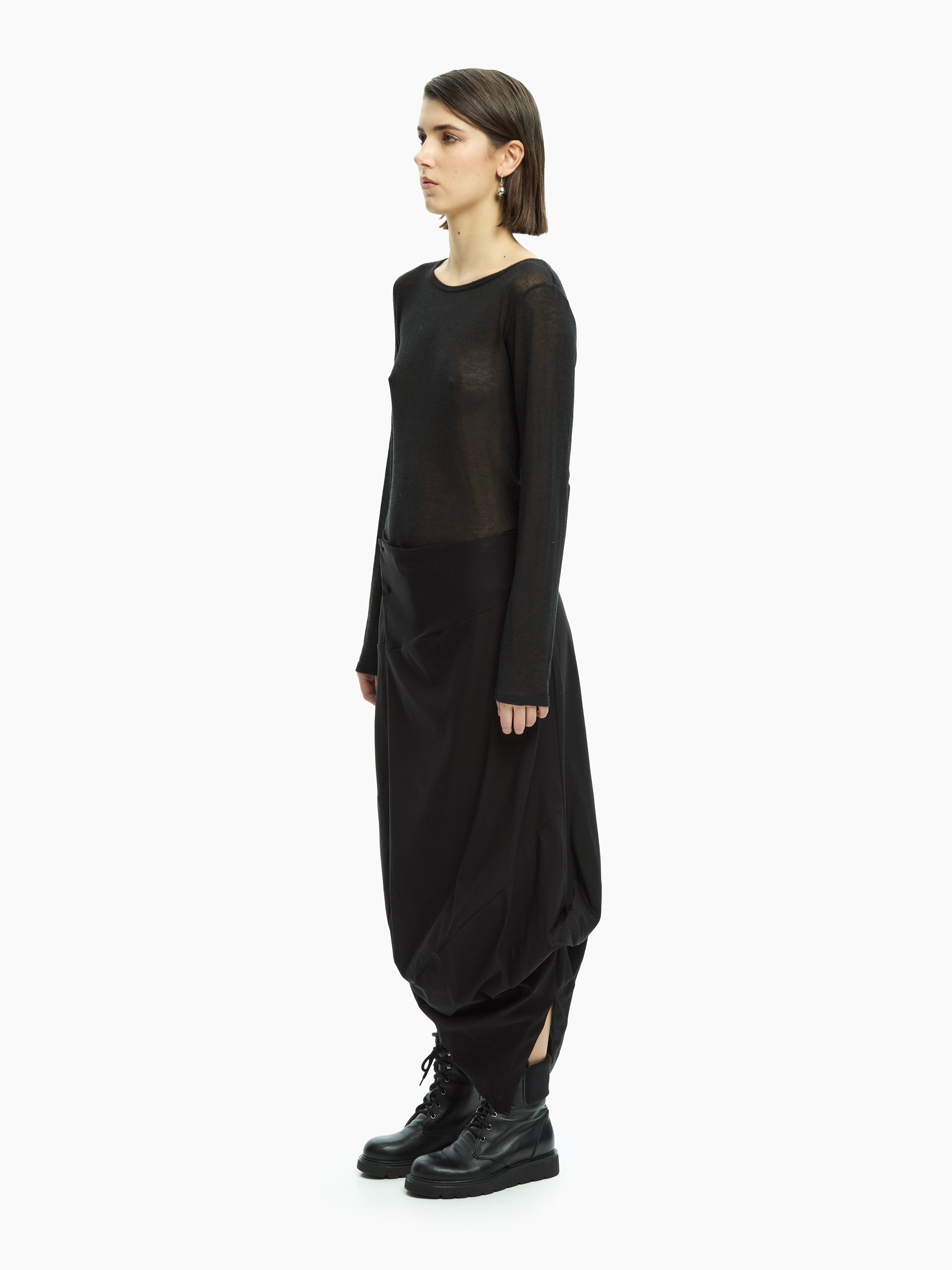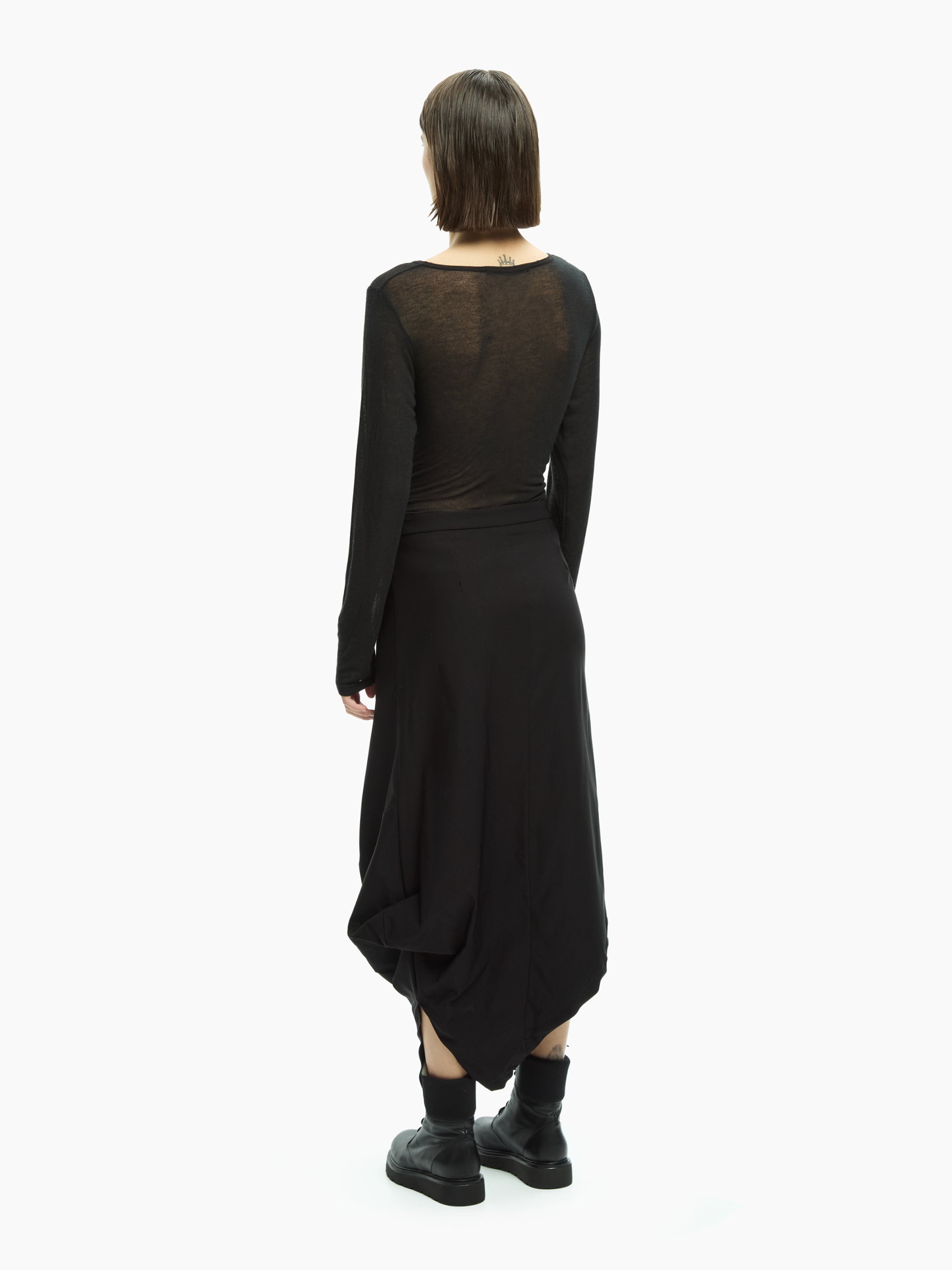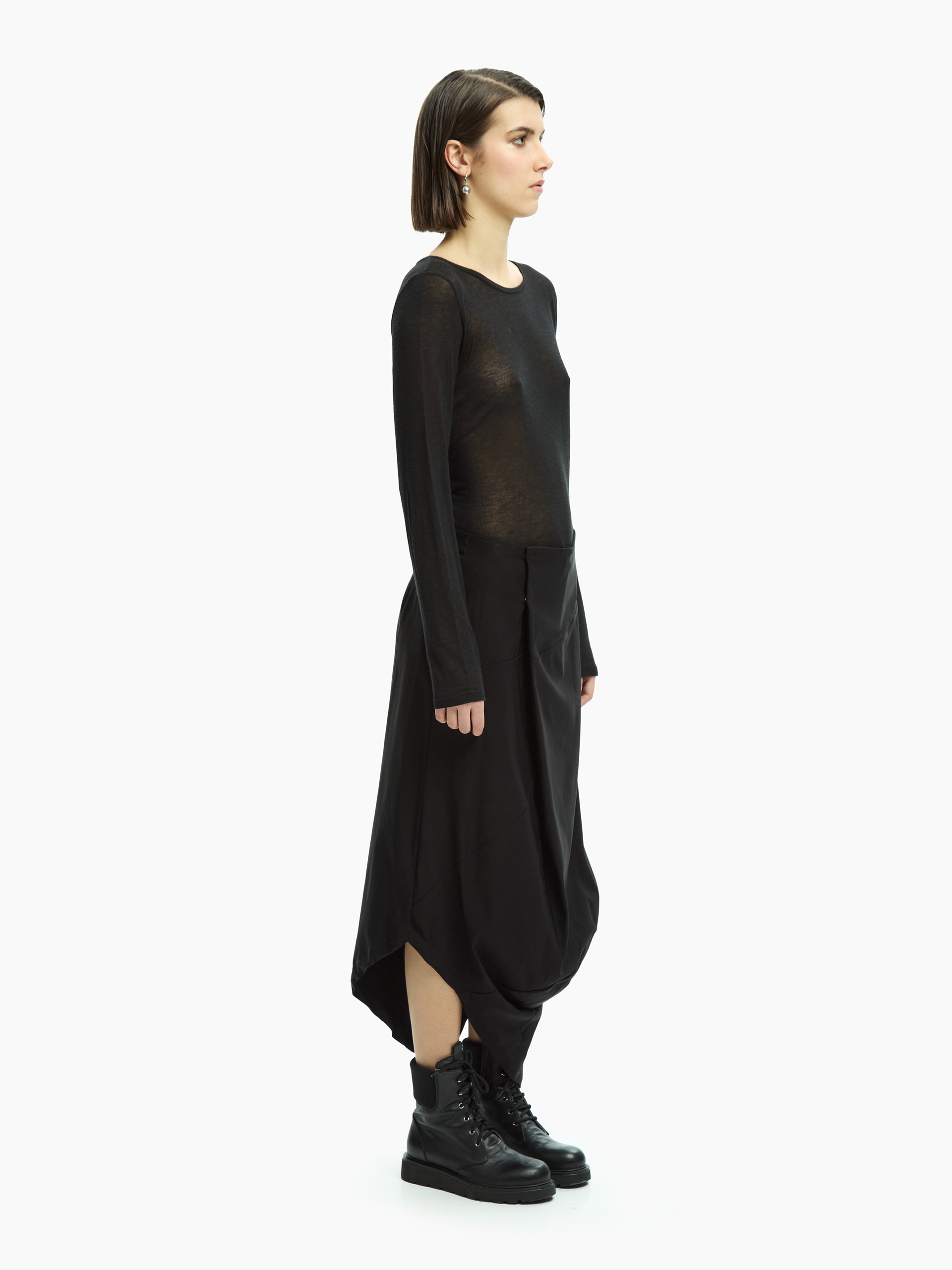 Gonna dal design contemporaneo e distintivo, caratterizzata da una costruzione asimmetrica che genera volumi morbidi e un movimento naturale. La linea avvolgente scende fluida lungo la silhouette, creando un equilibrio raffinato tra essenzialità e ricerca formale.