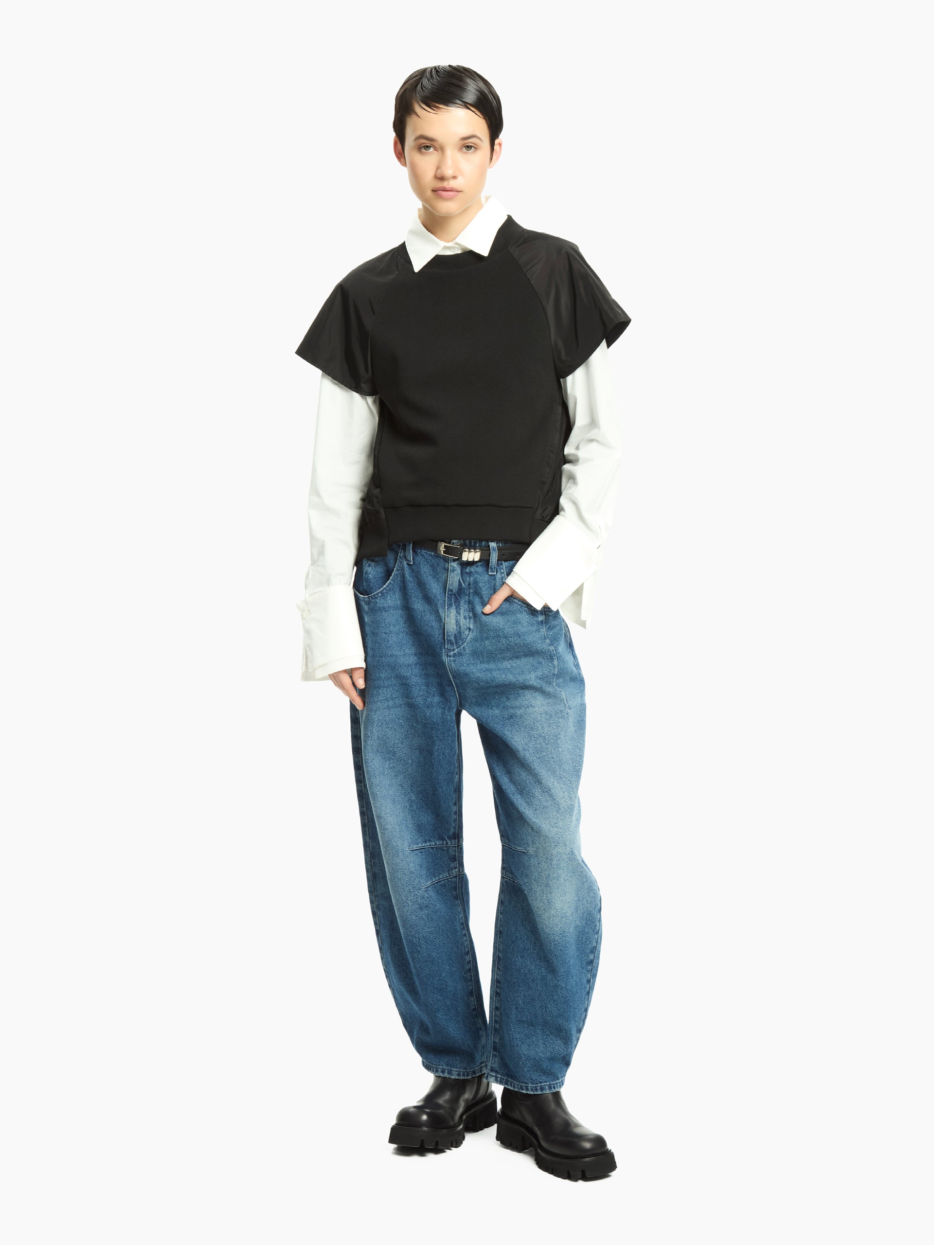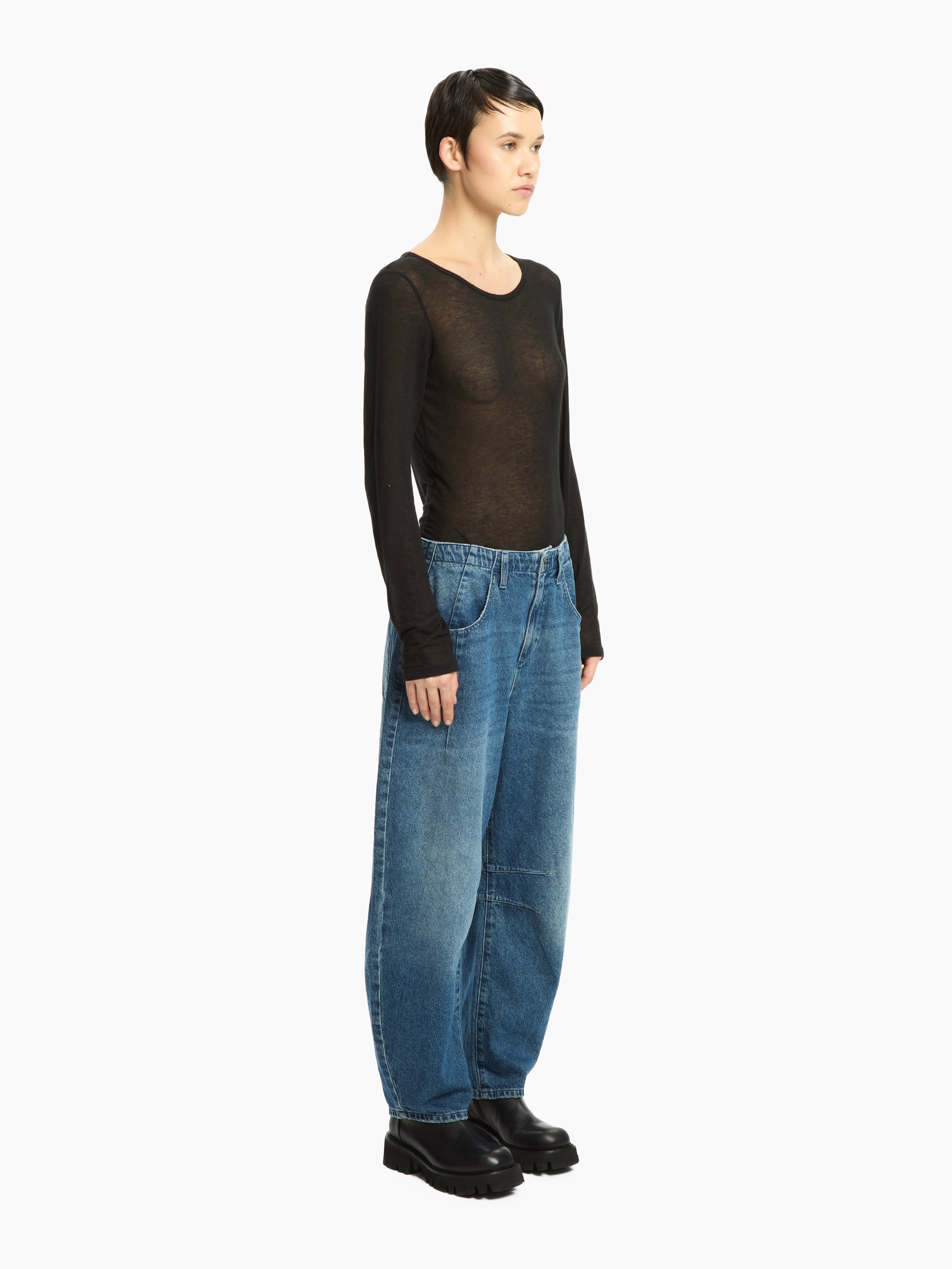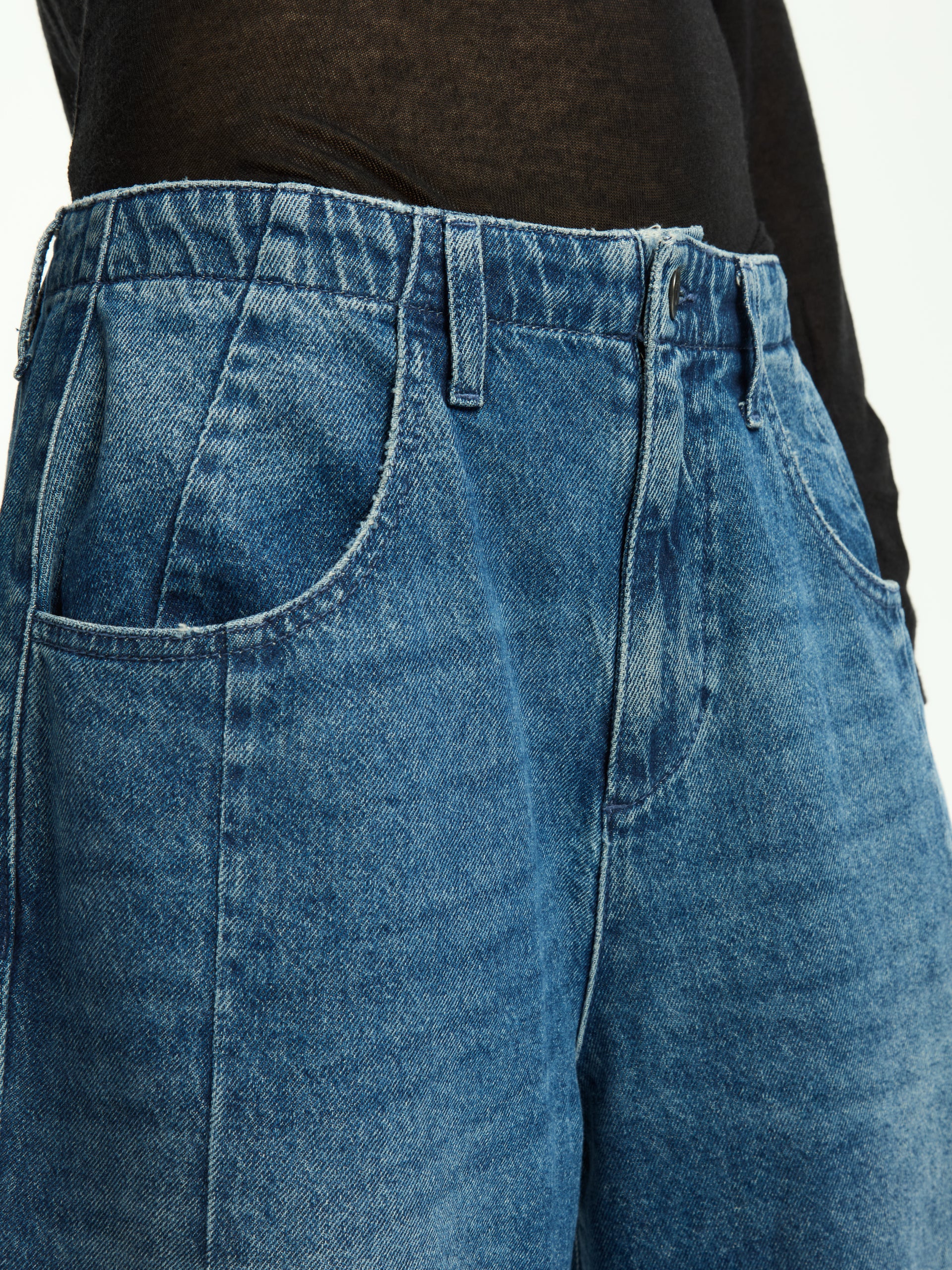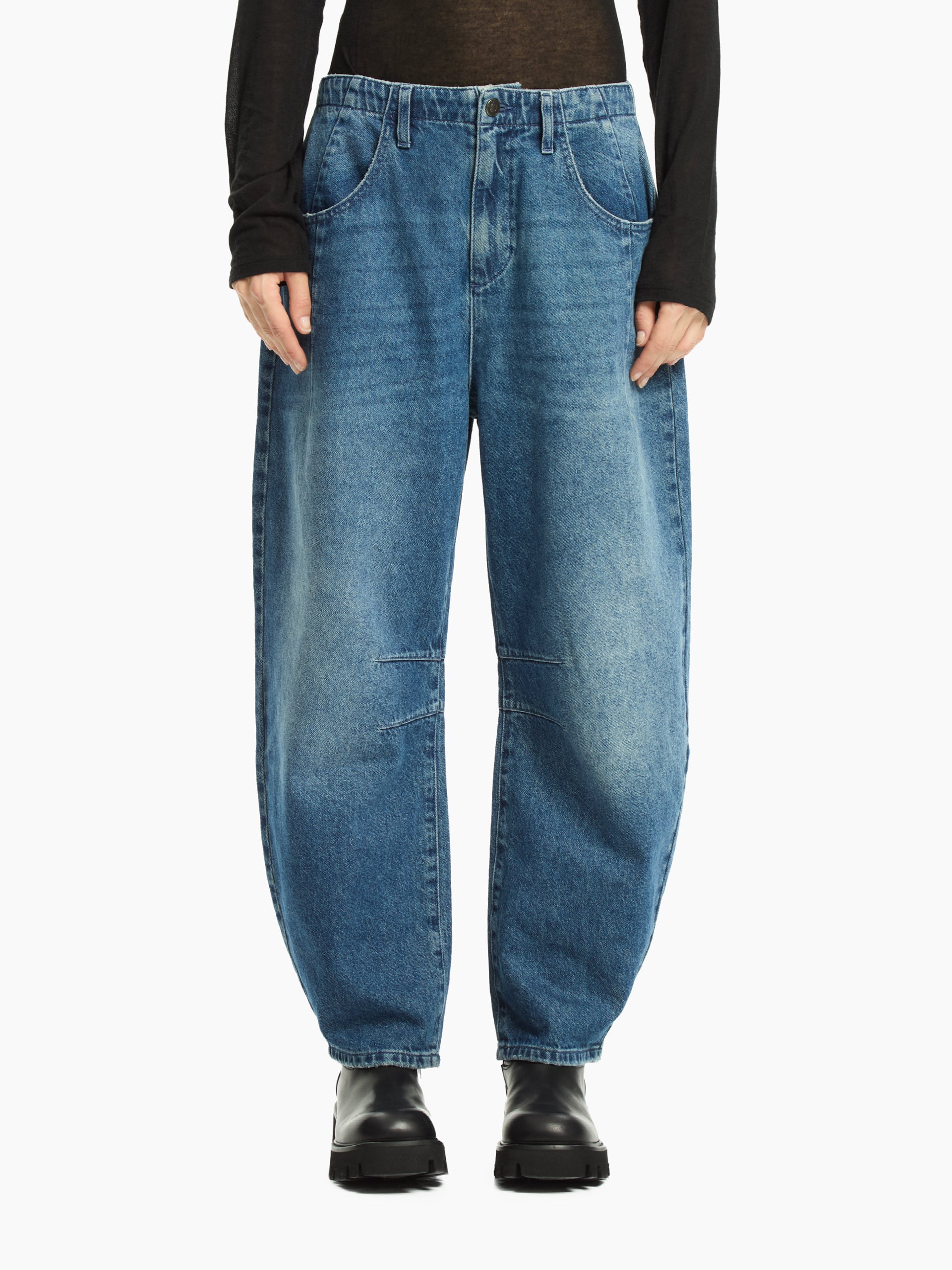 Il jeans Aprile reinterpreta il classico denim con un’attitudine contemporanea e decisa. Caratterizzato da un lavaggio effetto vintage e da una silhouette ampia e rilassata, si distingue per i dettagli unici che ne sottolineano il carattere urbano. Le cuciture a vista e la struttura leggermente balloon donano volume e personalità al look.