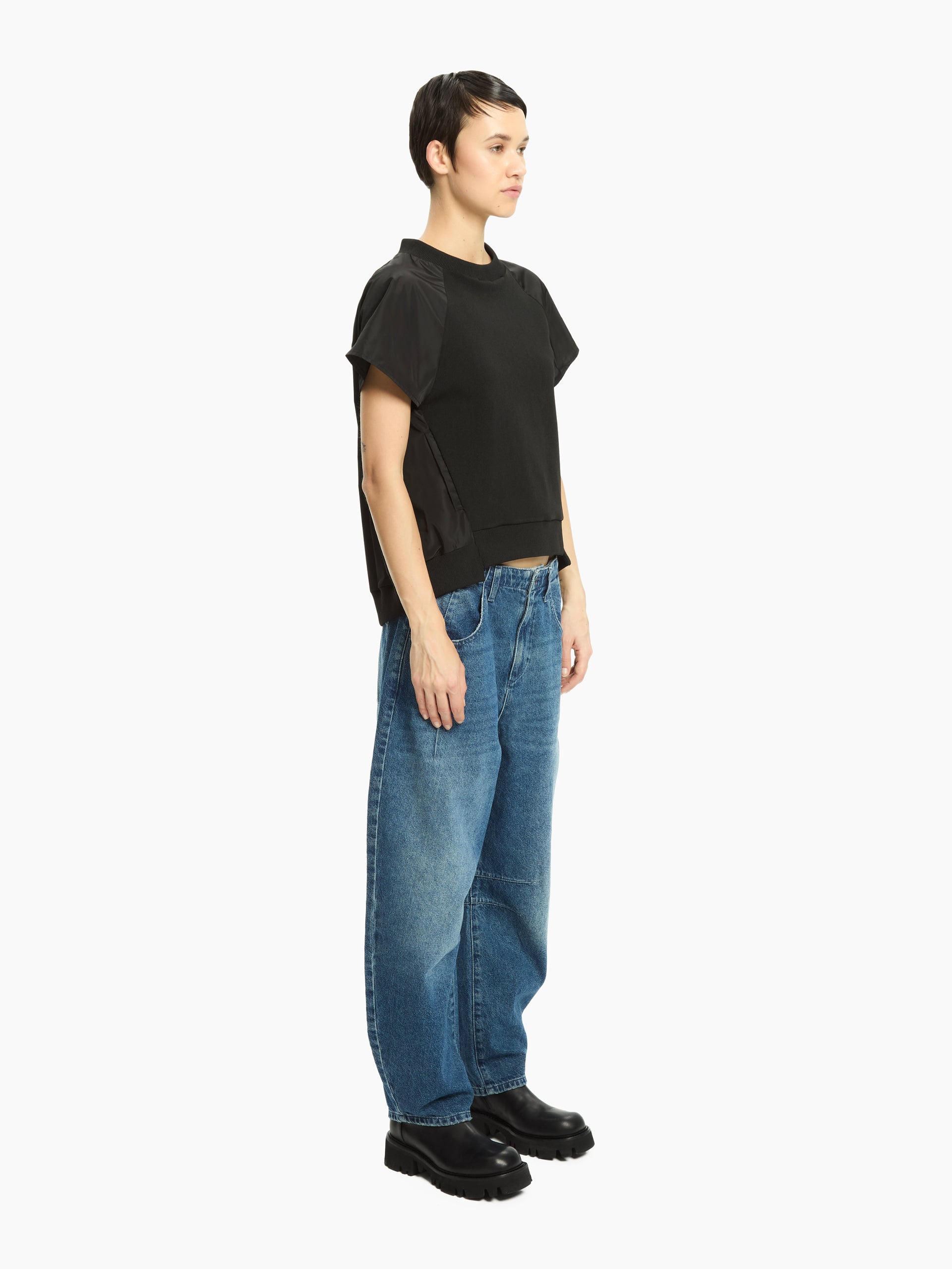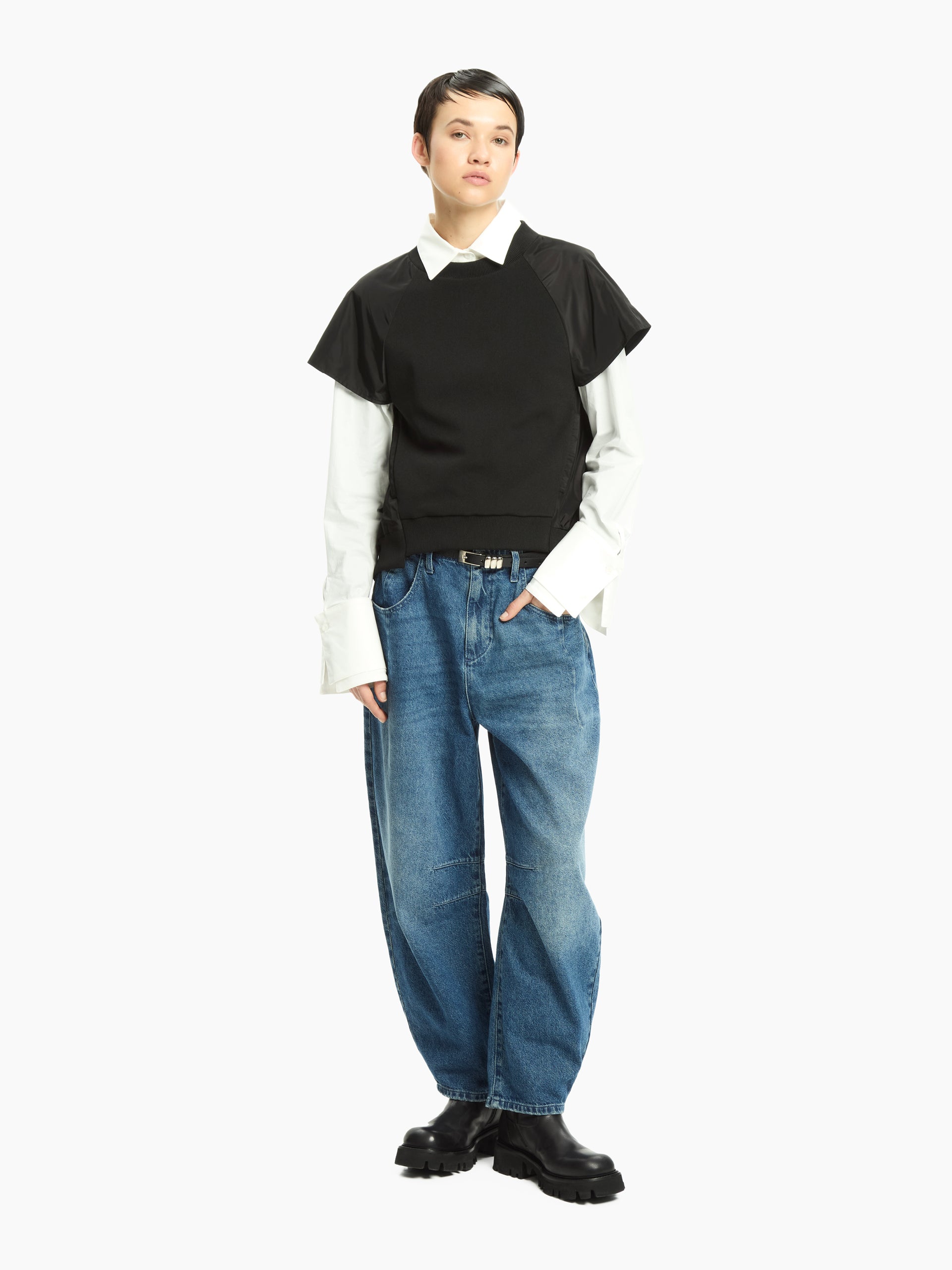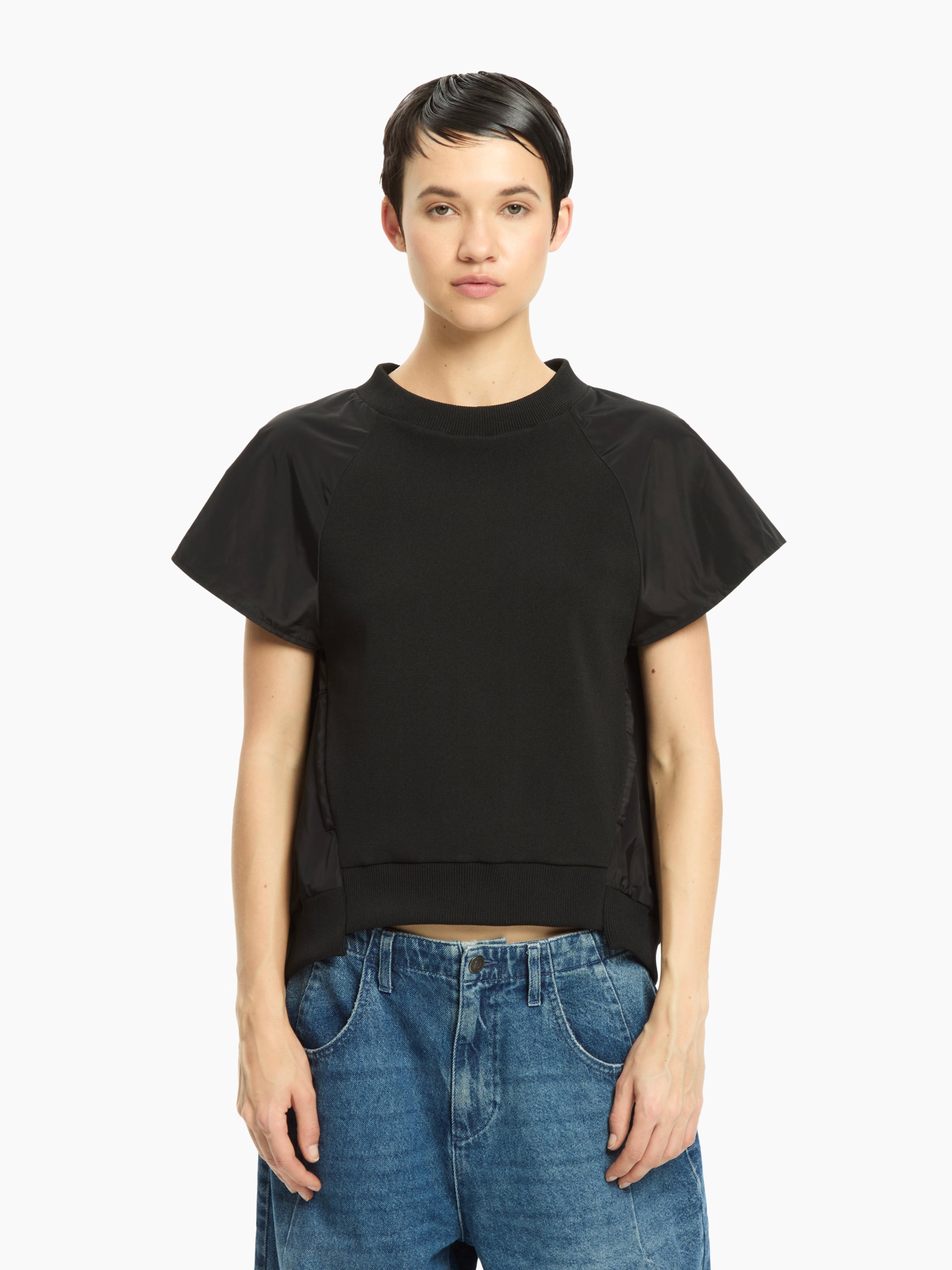 La maglia Febbraio combina linee pulite ed eleganza contemporanea. Le maniche corte ampie in tessuto leggero creano un piacevole contrasto con il corpo più strutturato, dando movimento e originalità al capo. Il collo a coste aggiunge un dettaglio sportivo e moderno, rendendola perfetta per look sia casual che più ricercati.