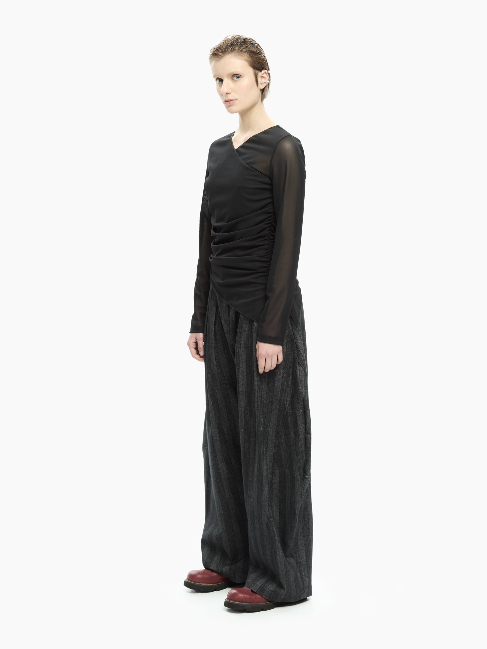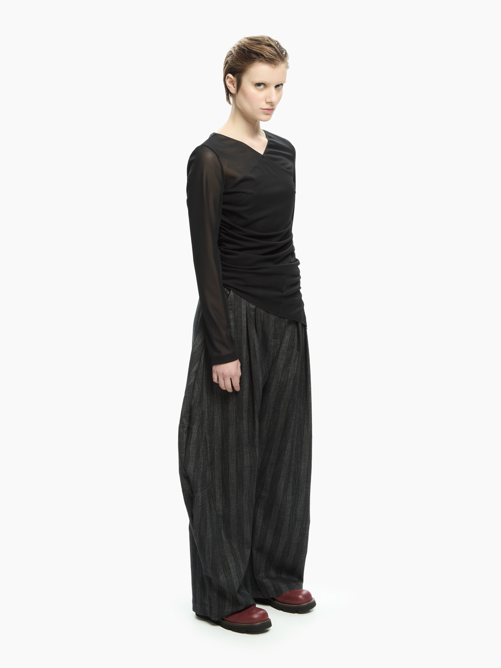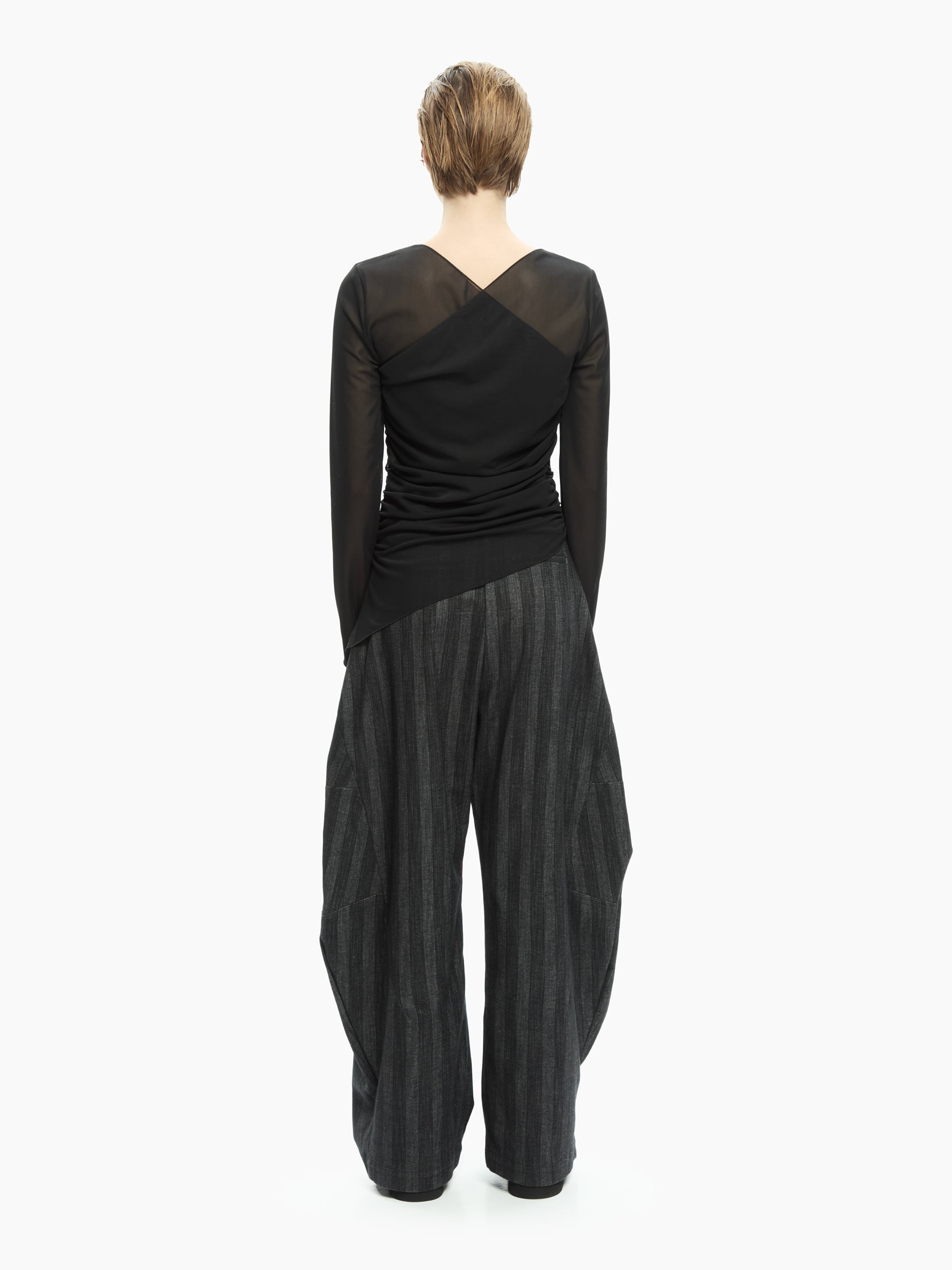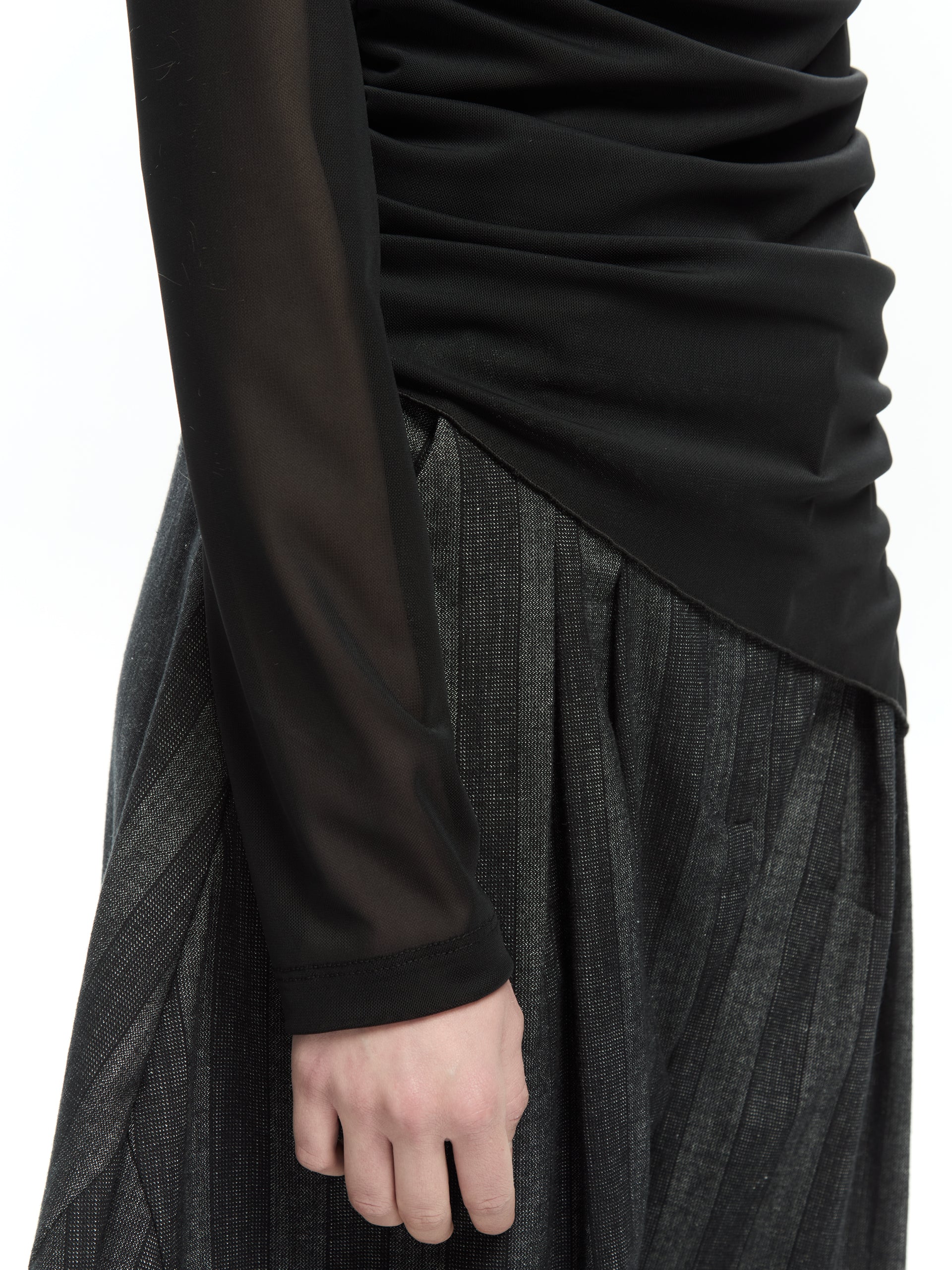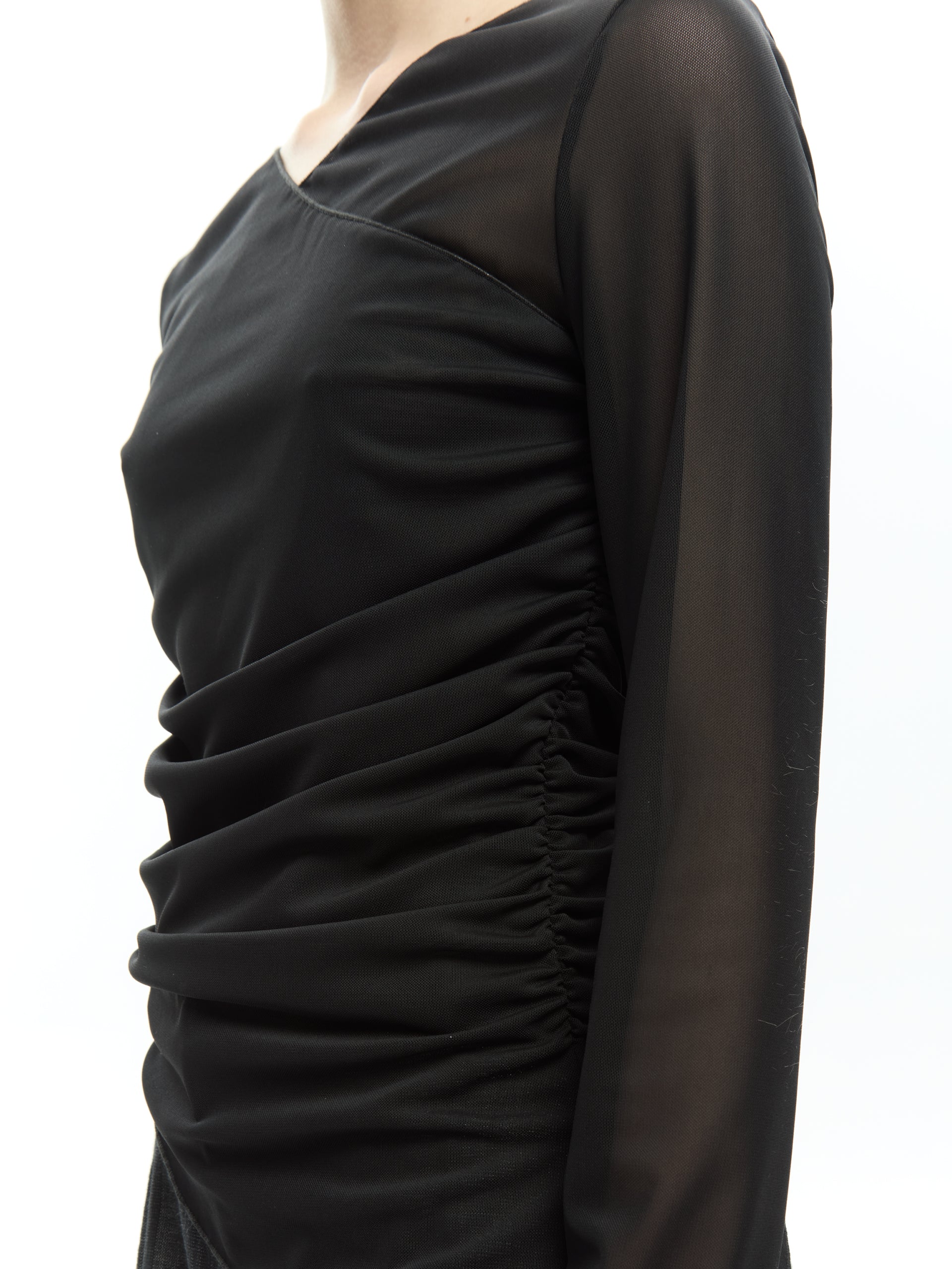 Trasparenze leggere e linee incrociate definiscono un capo sofisticato e contemporaneo. Il tessuto in tulle stretch crea un effetto velato sul décolleté e sulle maniche, mentre il drappeggio laterale scolpisce la silhouette con un movimento morbido e dinamico.