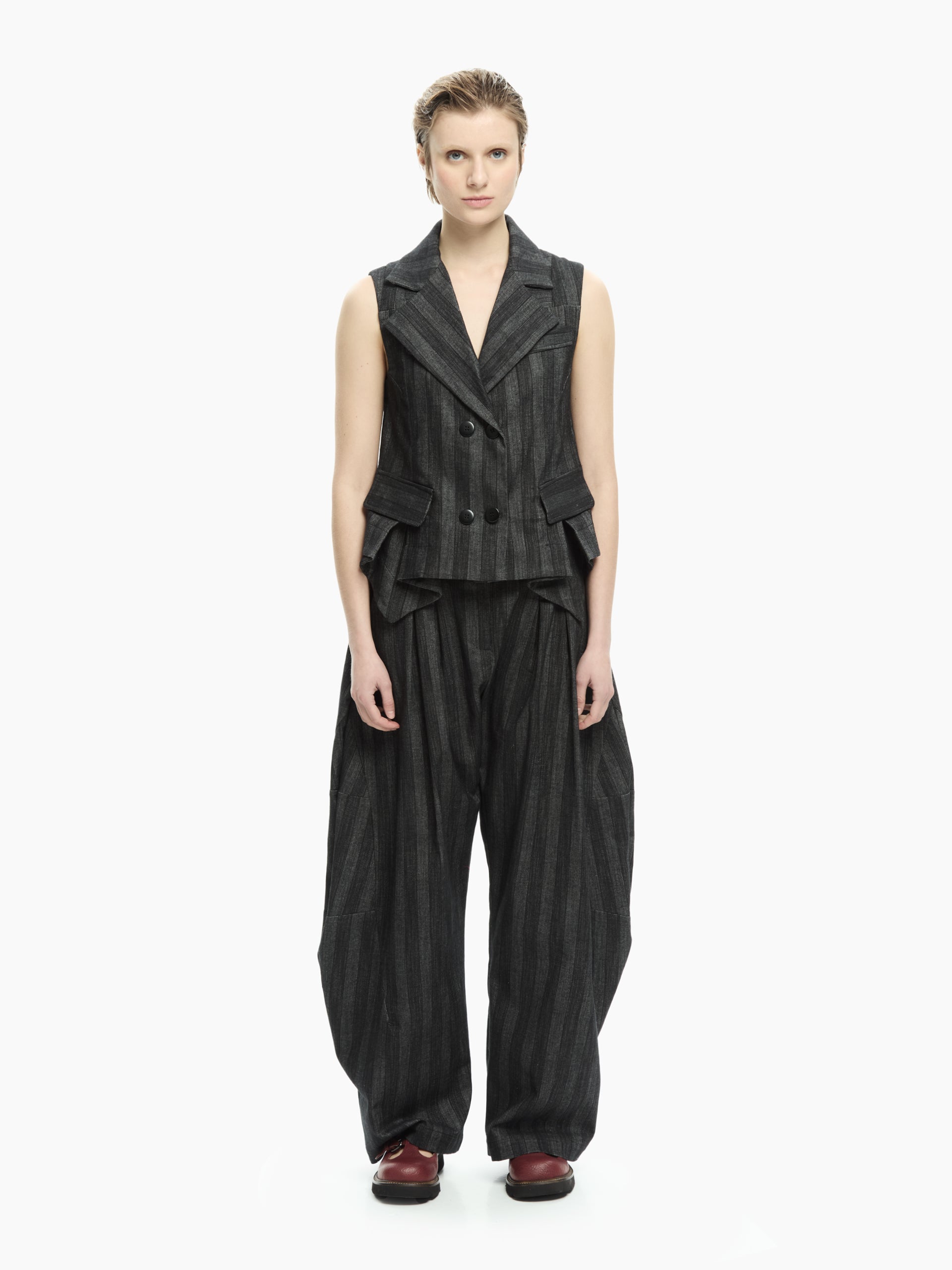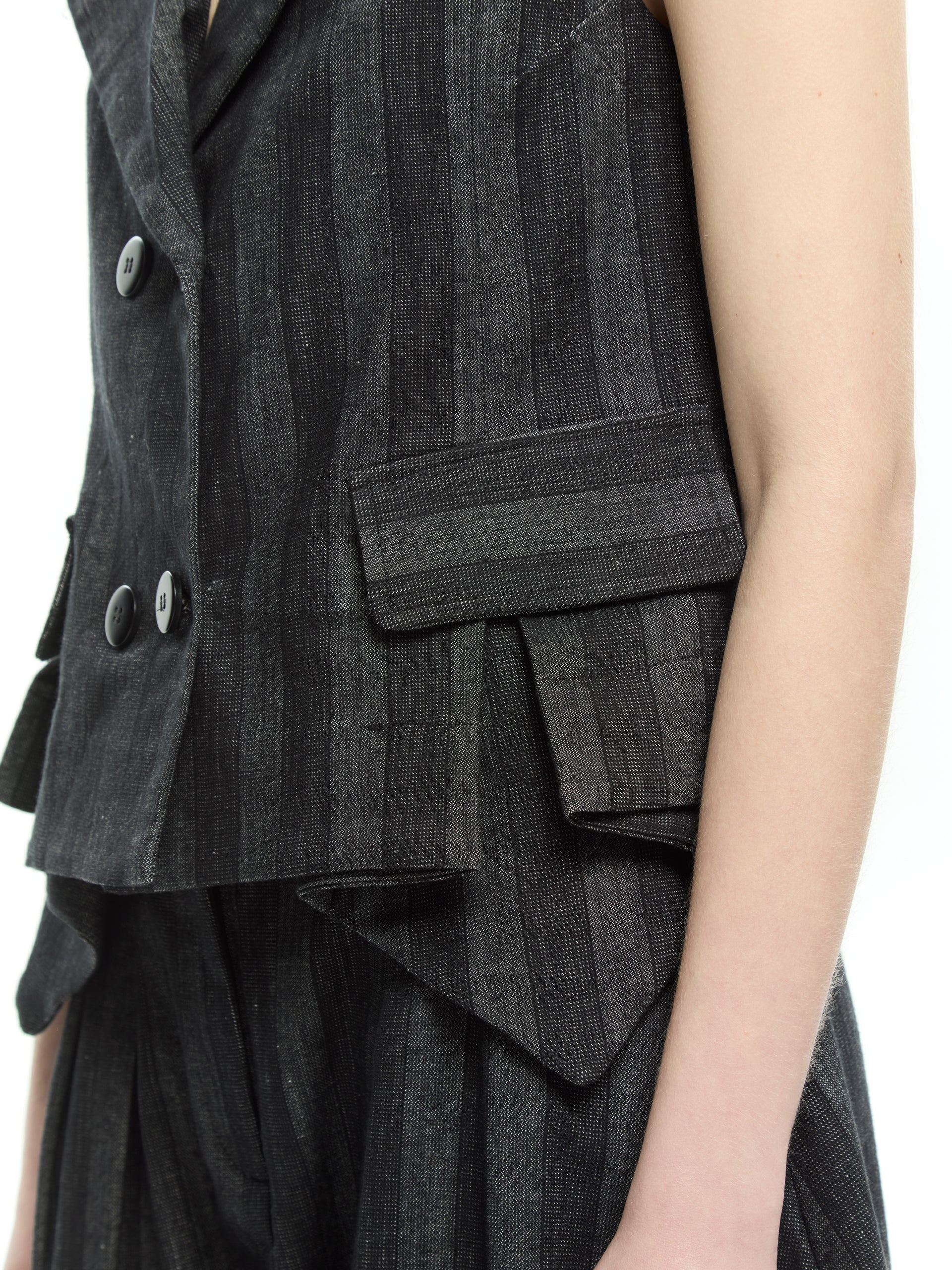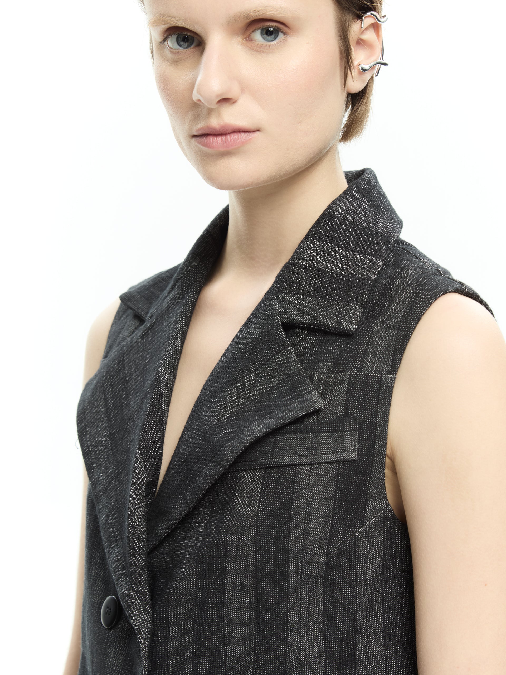 Un capo dalla costruzione sartoriale che reinterpreta il classico gilet in chiave contemporanea. La linea aderente valorizza la silhouette mentre il motivo gessato e i dettagli strutturati donano carattere e raffinatezza al look.