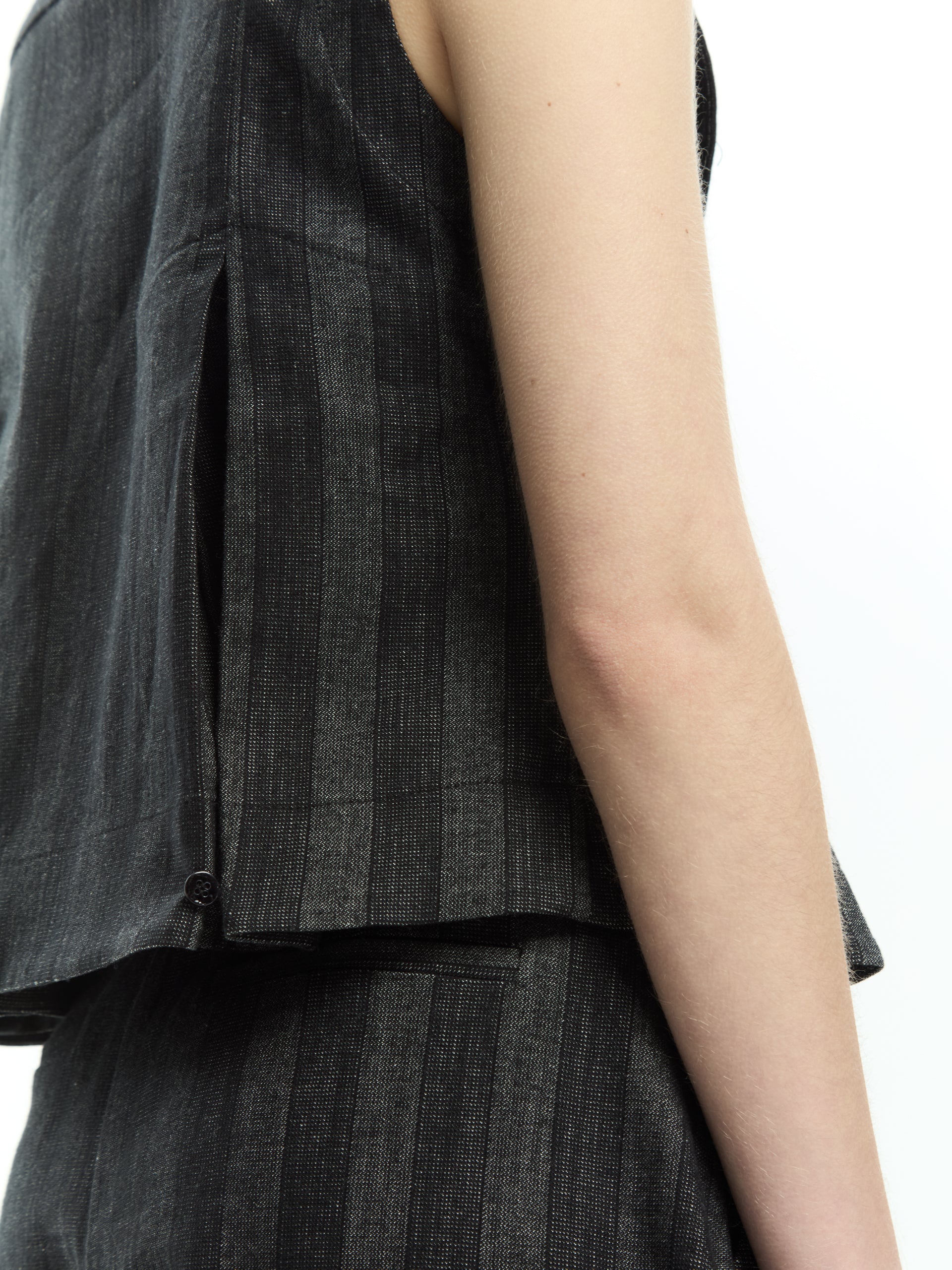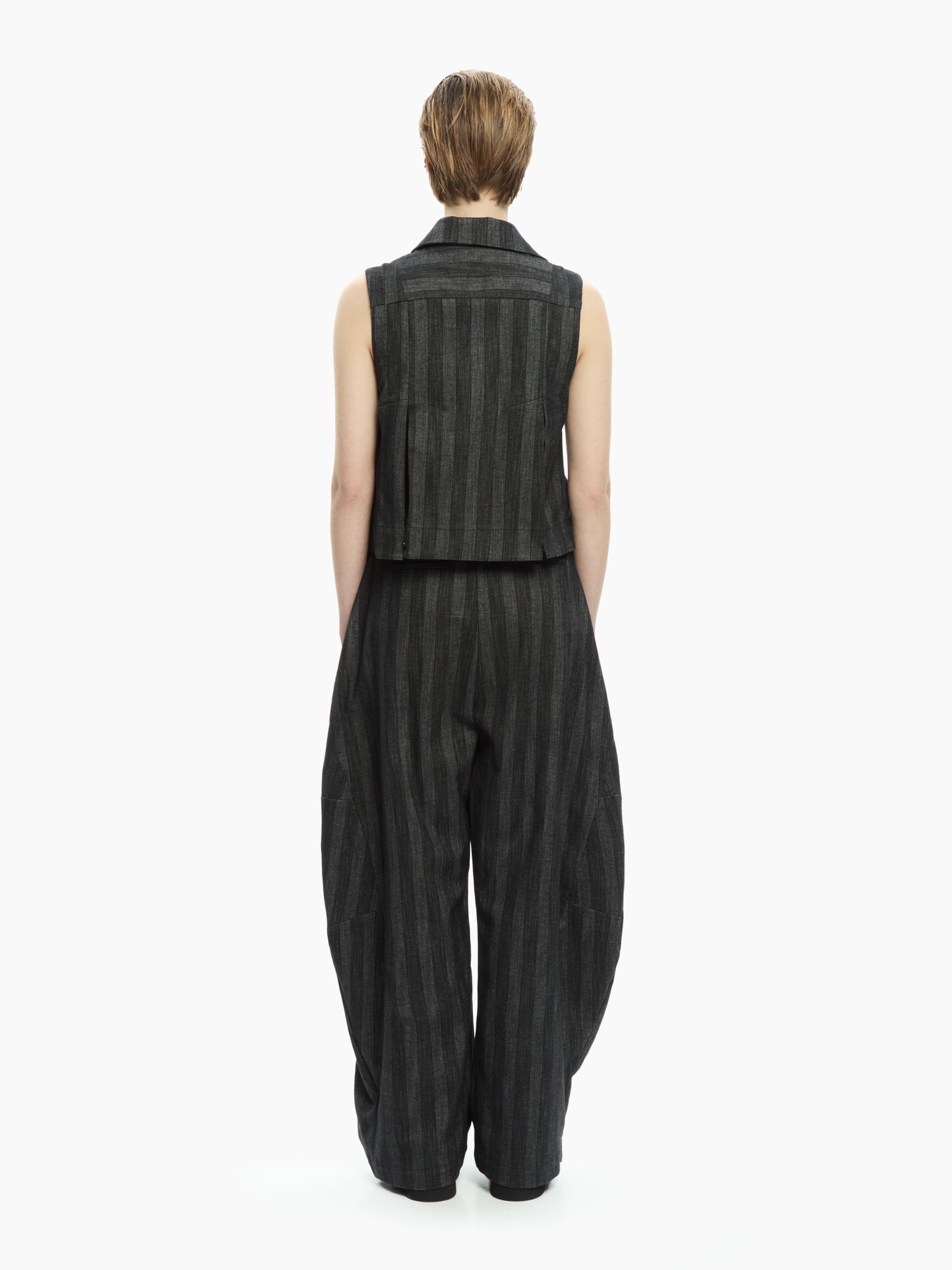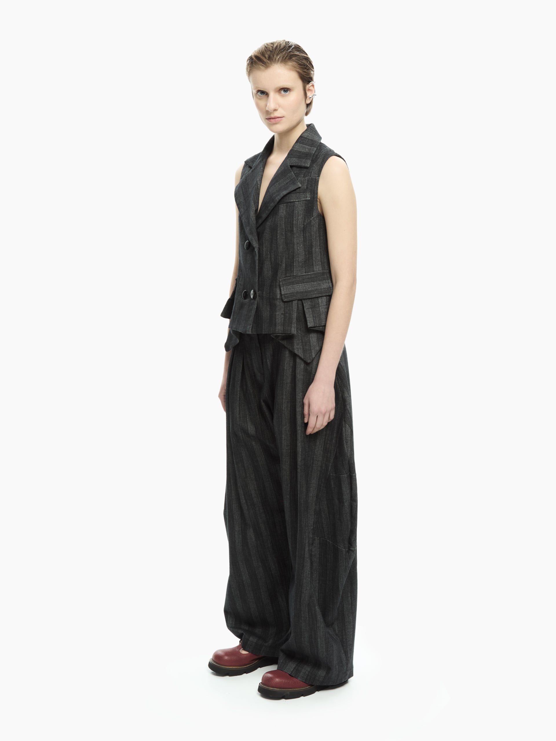 Un capo dalla costruzione sartoriale che reinterpreta il classico gilet in chiave contemporanea. La linea aderente valorizza la silhouette mentre il motivo gessato e i dettagli strutturati donano carattere e raffinatezza al look.