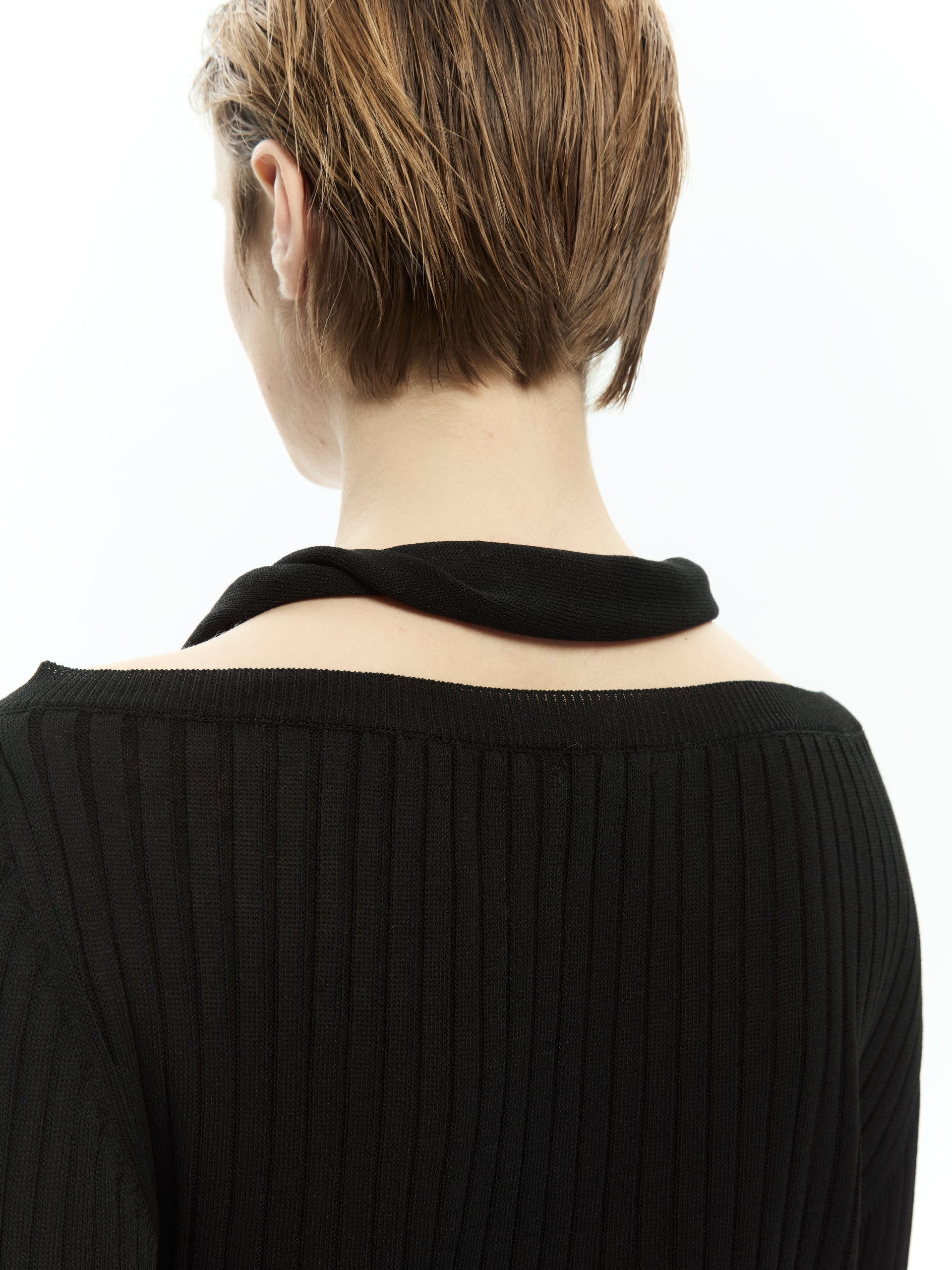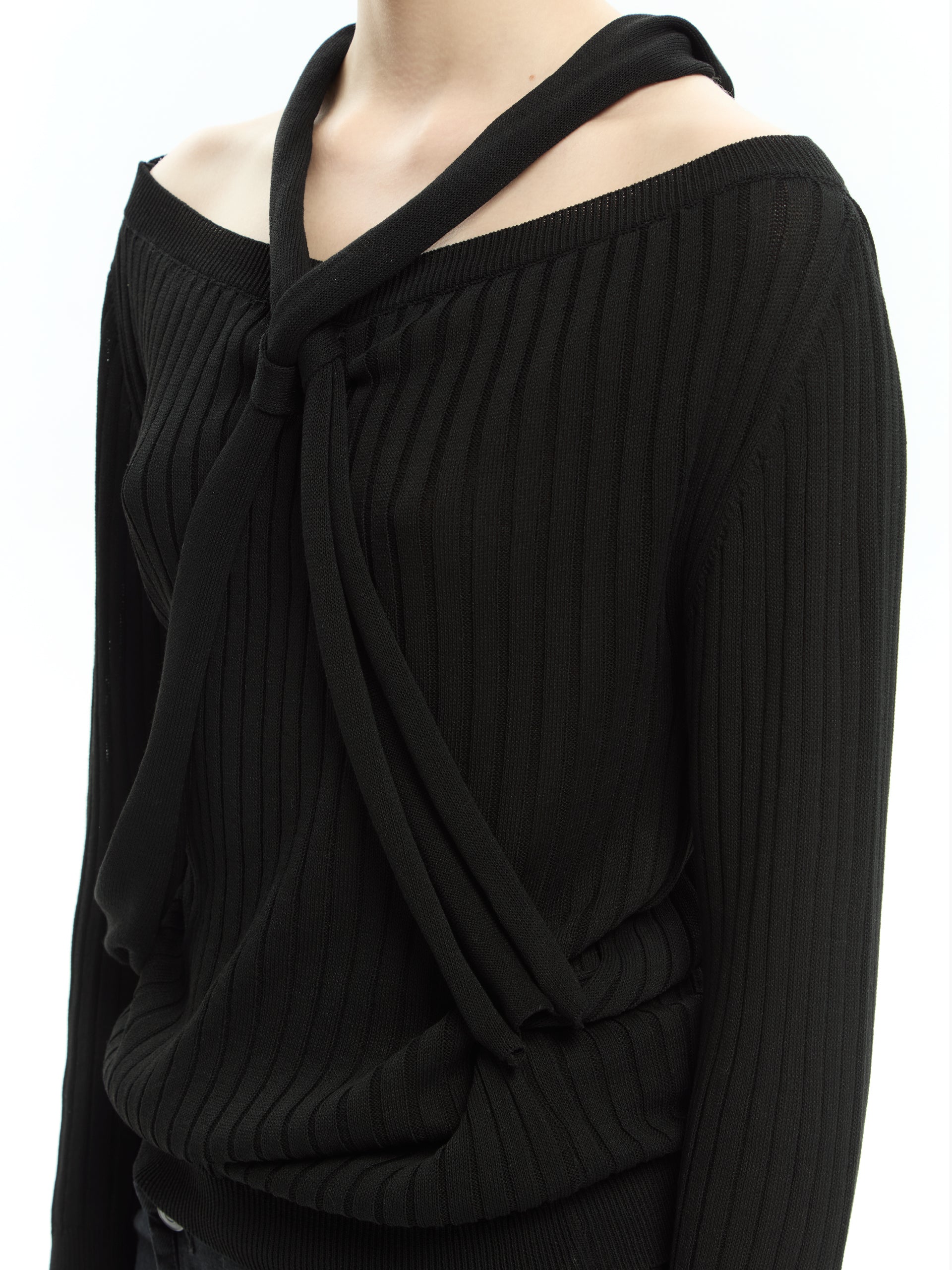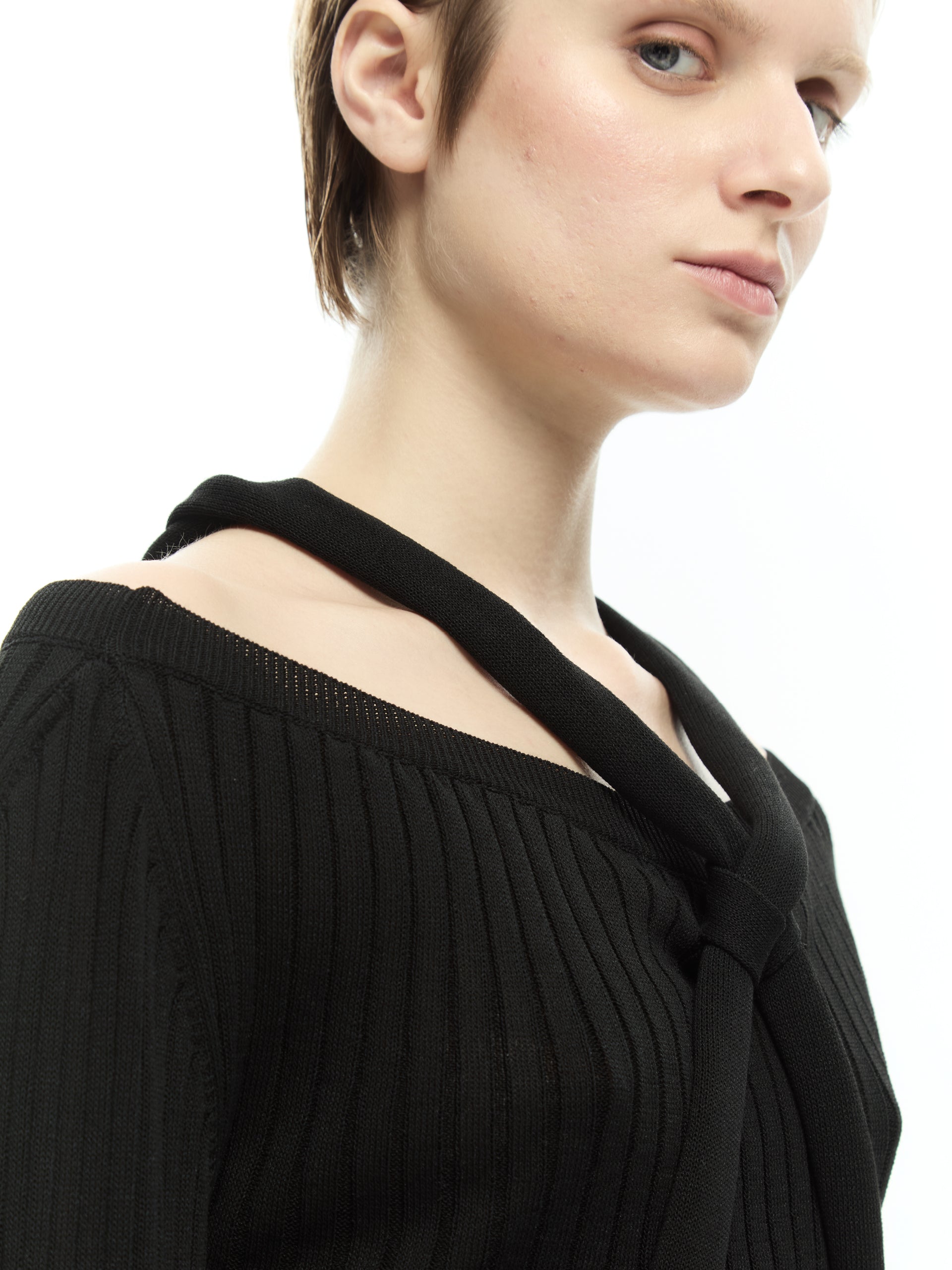 Linee essenziali e un dettaglio grafico che definisce il carattere del capo. La lavorazione a coste verticali valorizza la silhouette, mentre la fascia annodata che attraversa il décolleté e il busto crea un effetto asimmetrico sofisticato e contemporaneo. Perfetta per costruire look minimal ma ricercati.