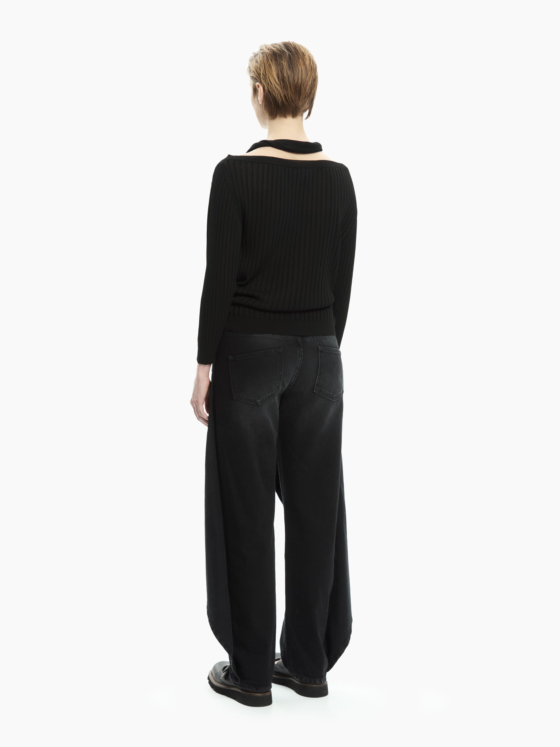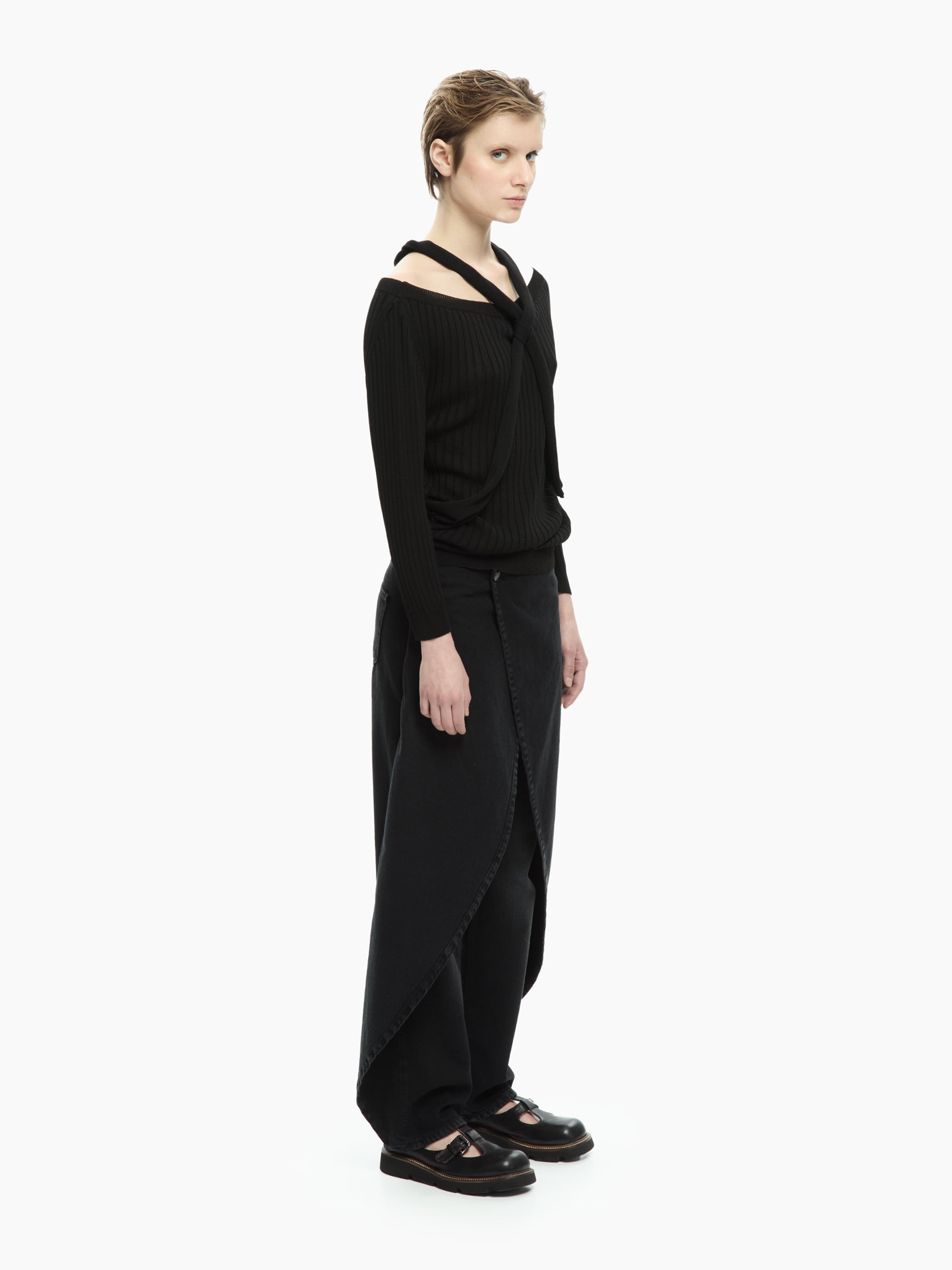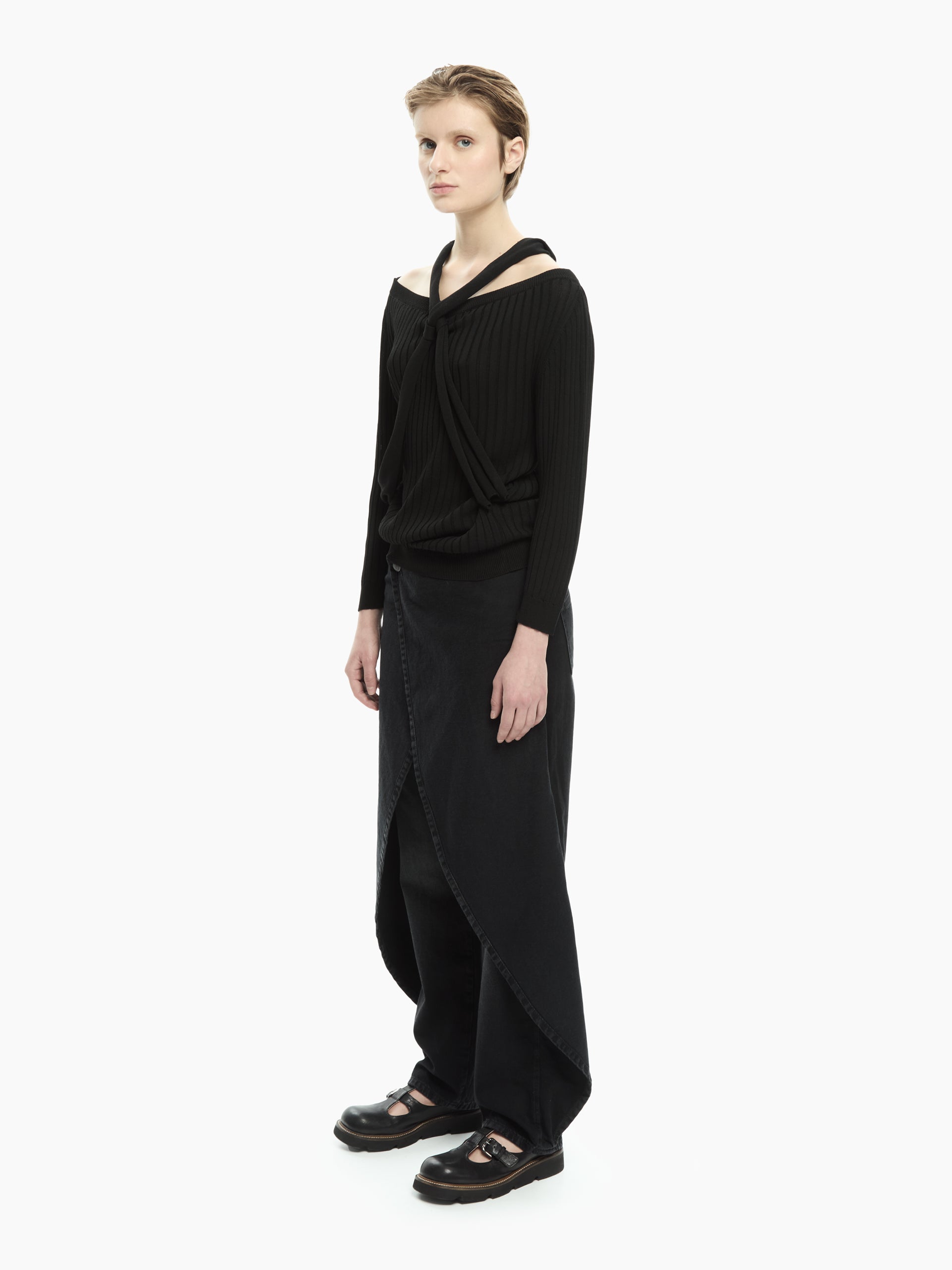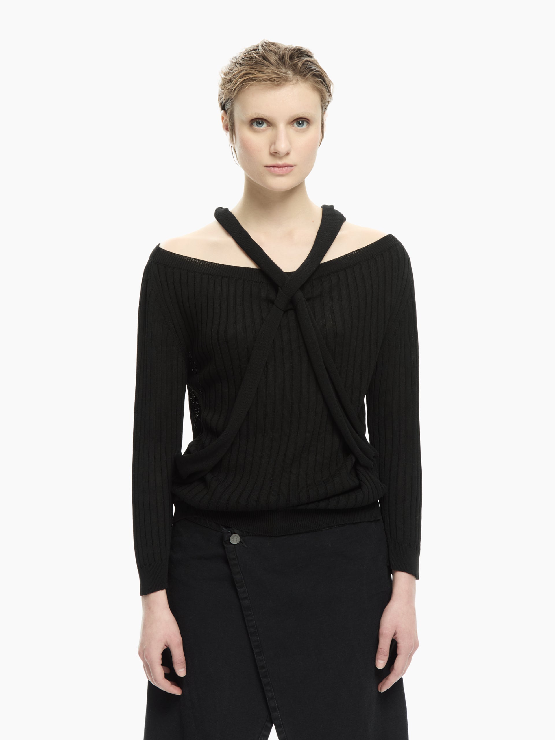 Linee essenziali e un dettaglio grafico che definisce il carattere del capo. La lavorazione a coste verticali valorizza la silhouette, mentre la fascia annodata che attraversa il décolleté e il busto crea un effetto asimmetrico sofisticato e contemporaneo. Perfetta per costruire look minimal ma ricercati.