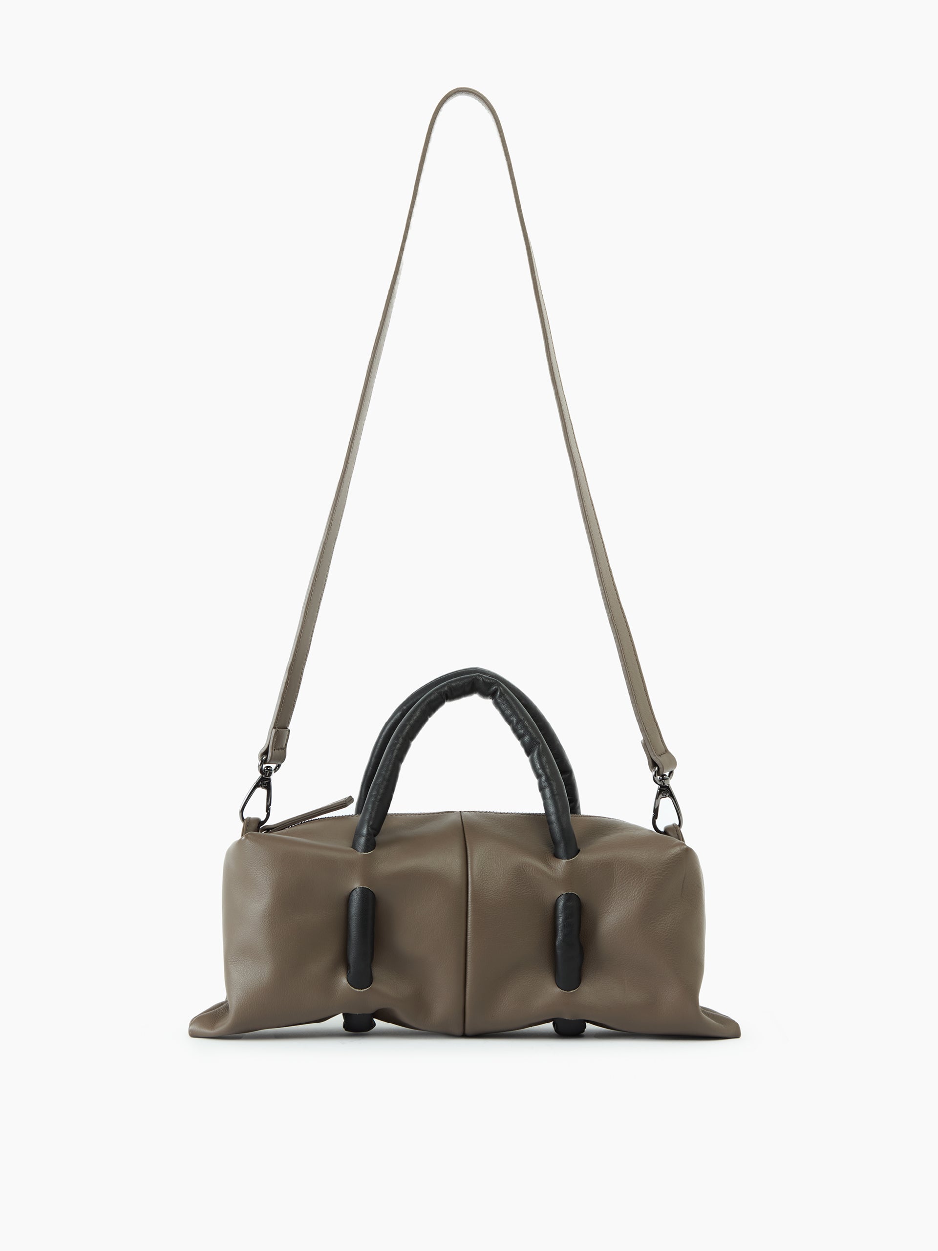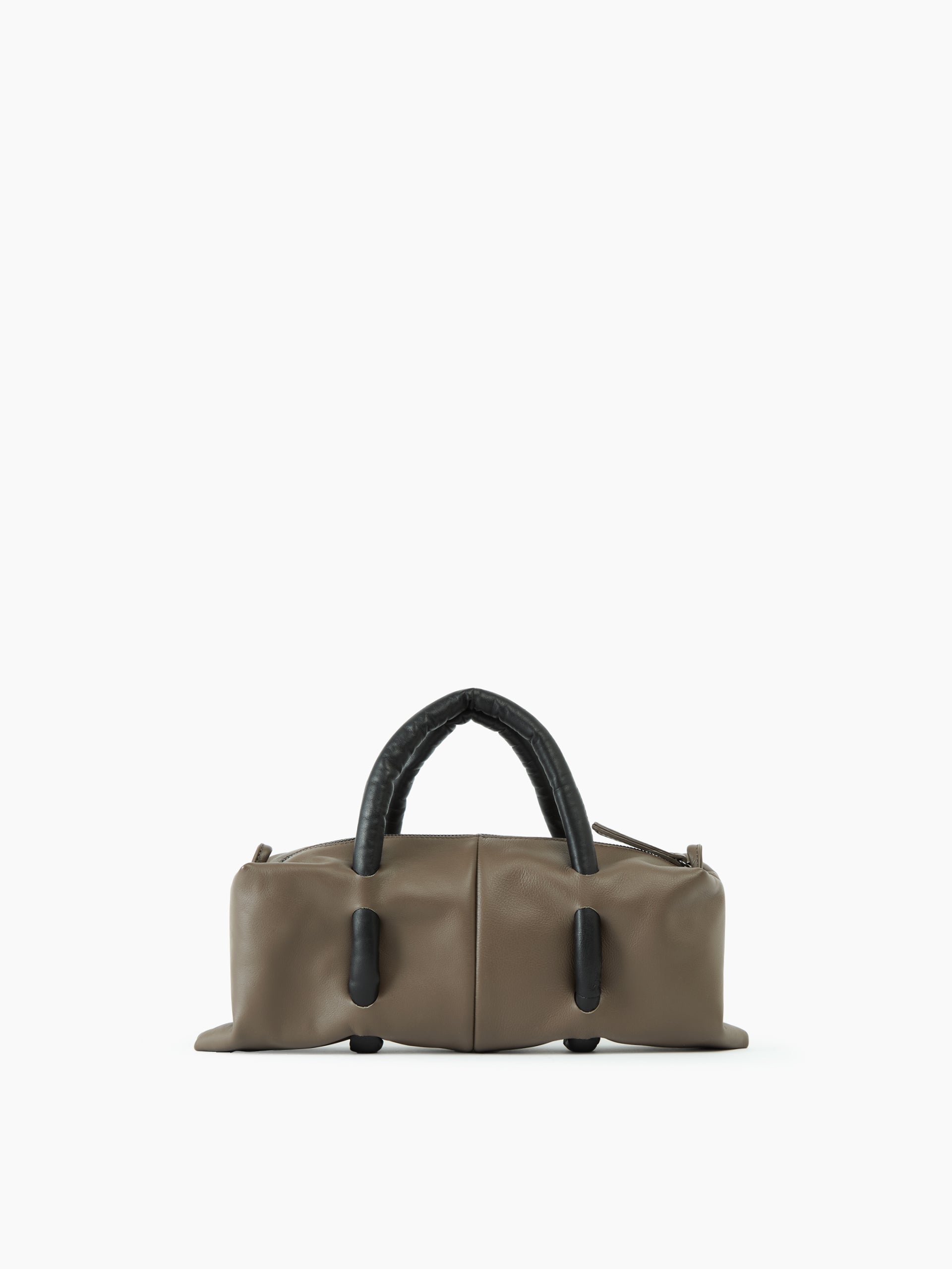 Questa borsa in morbida pelle unisce struttura e morbidezza in un design dal carattere deciso. Le forme soffici sono interrotte da elementi tubolari che modellano la superficie creando giochi di volume e un aspetto scultoreo.