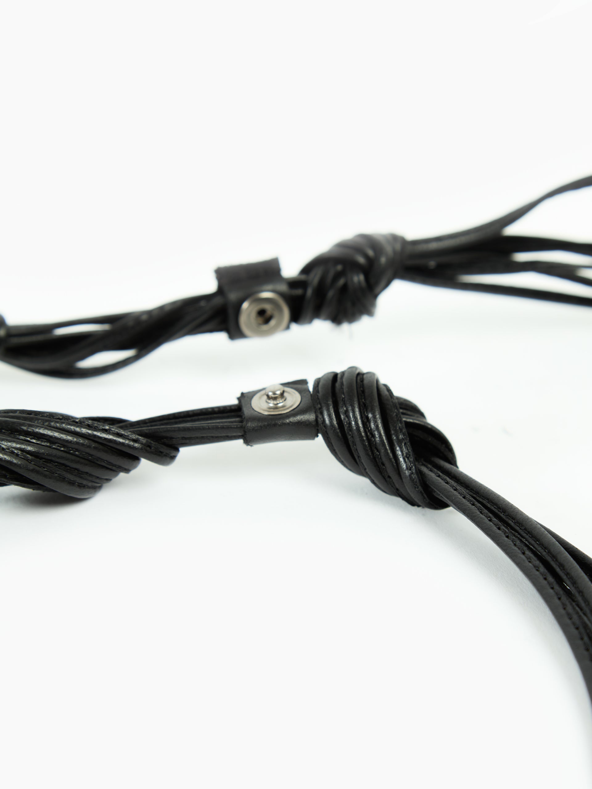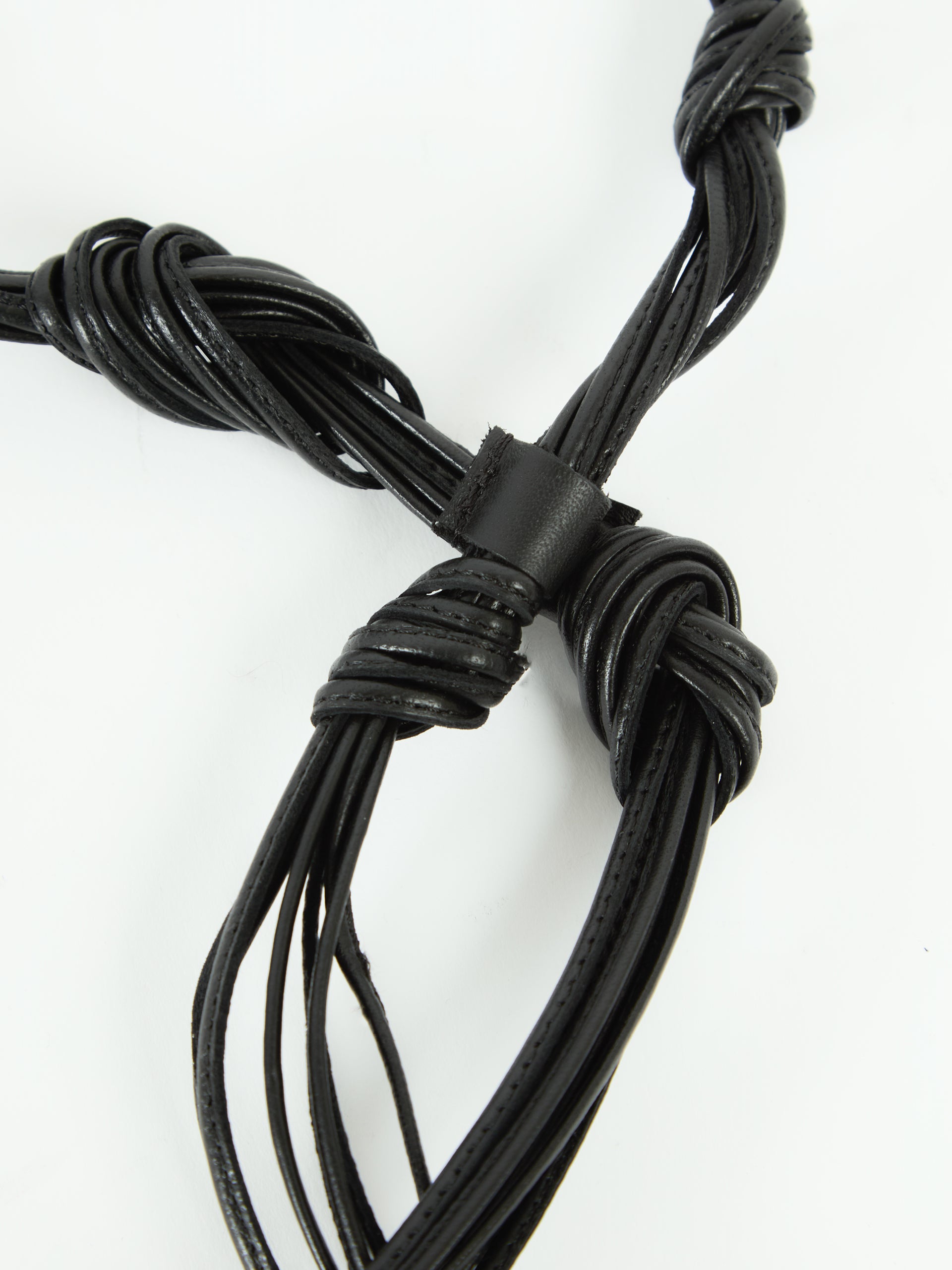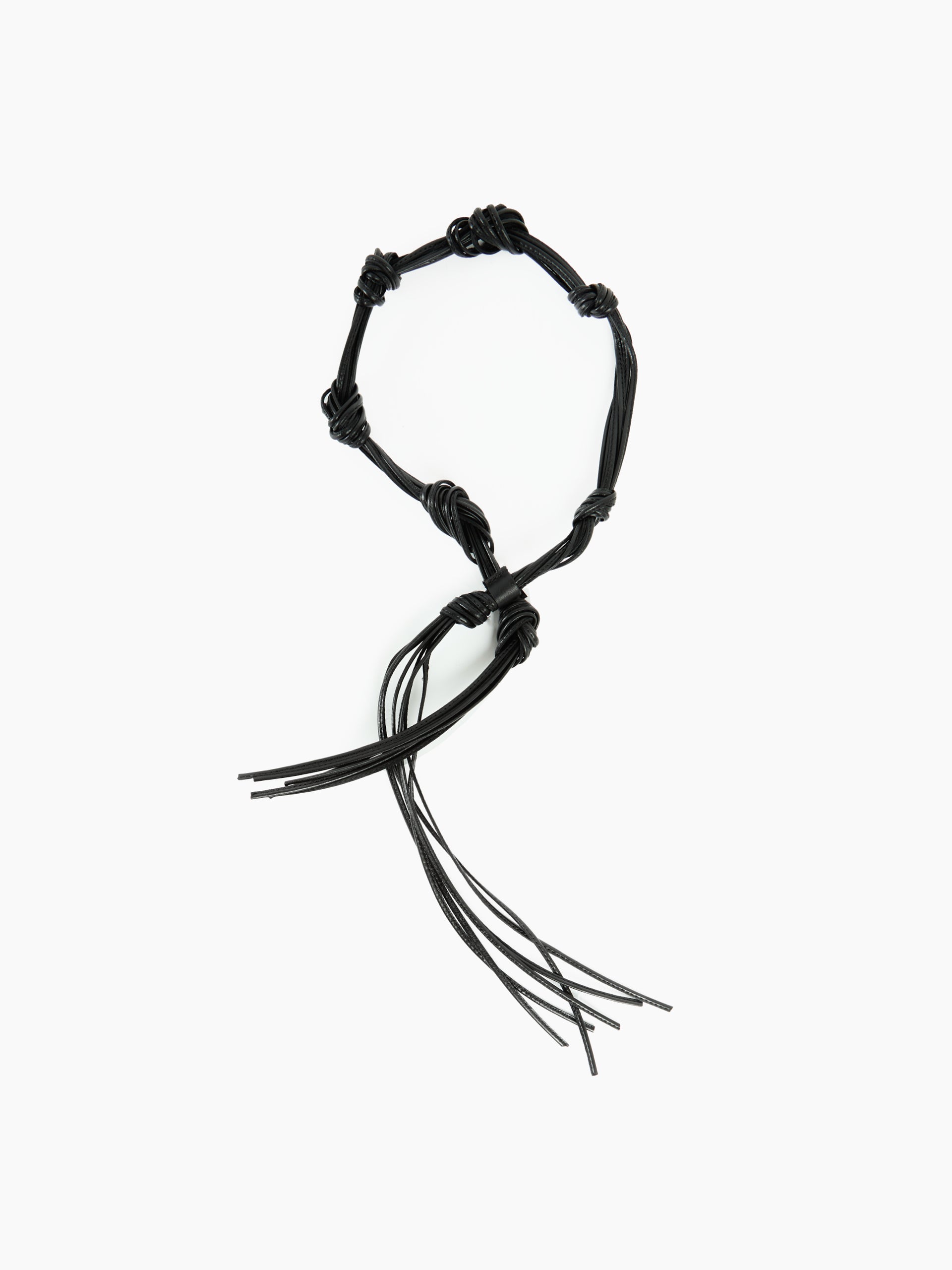 Questa collana dal carattere deciso si distingue per la lavorazione a corde intrecciate, arricchita da nodi decorativi distribuiti lungo tutta la struttura. Il design si concentra in un nodo centrale da cui si sviluppano eleganti frange sottili, creando un effetto dinamico e contemporaneo.