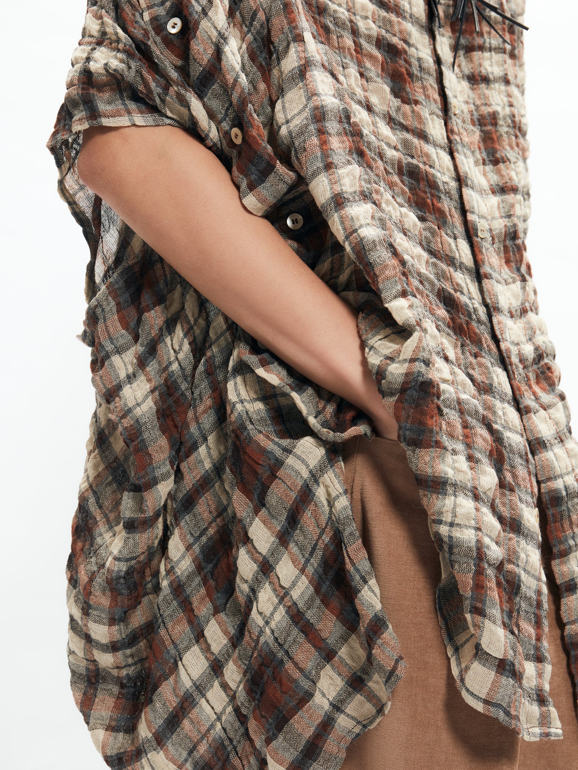 Questa camicia oversize reinterpreta il classico motivo a quadri con un volume fluido e avvolgente. La tela in misto viscosa accompagna il movimento con naturalezza, creando un effetto morbido e dinamico che valorizza la costruzione asimmetrica. I dettagli di abbottonatura frontale aggiungono versatilità al design, permettendo di modulare la silhouette in base allo stile e all’occasione. Un capo pensato per chi ama combinare comfort e ricercatezza in un’unica proposta contemporanea.