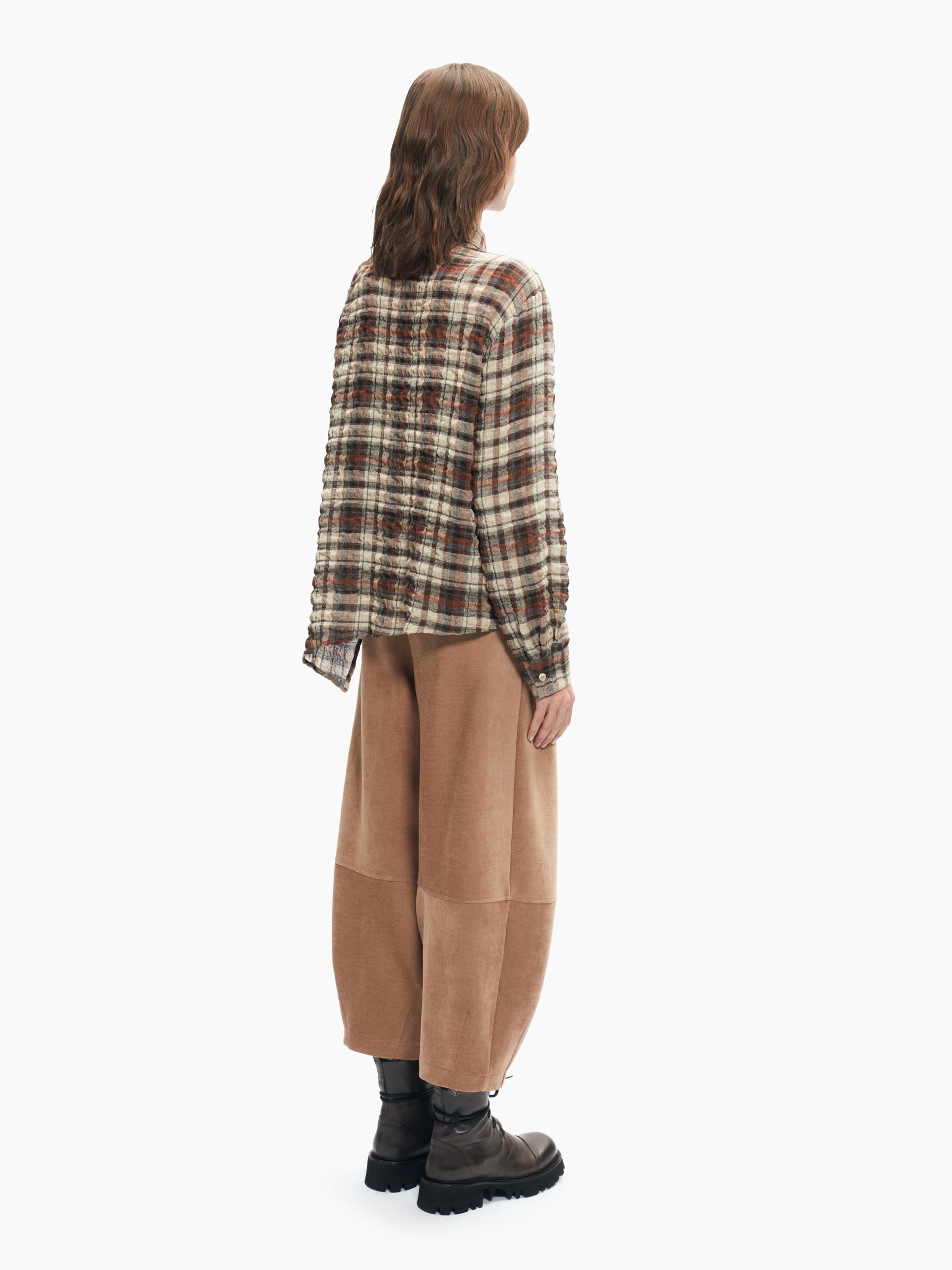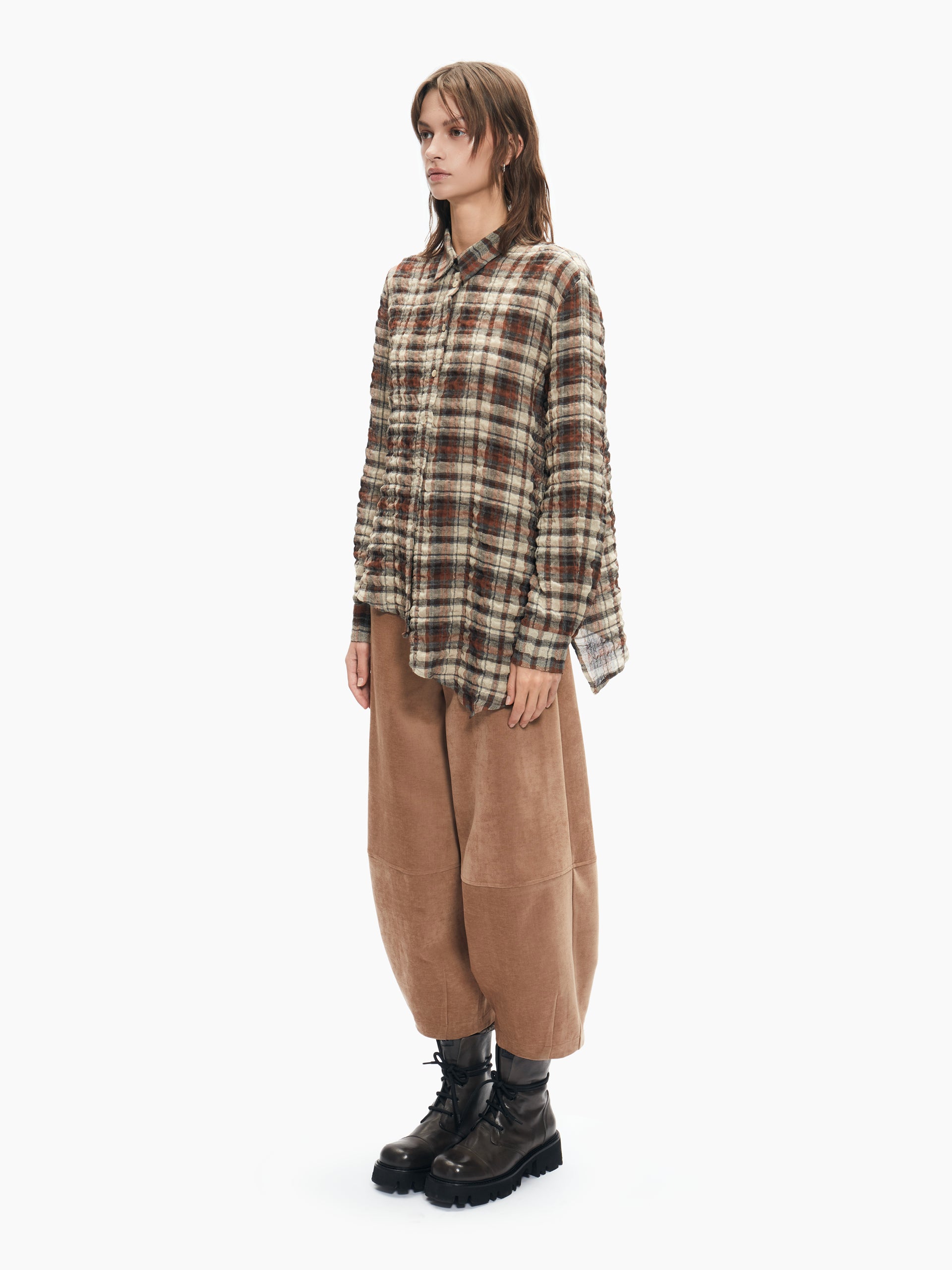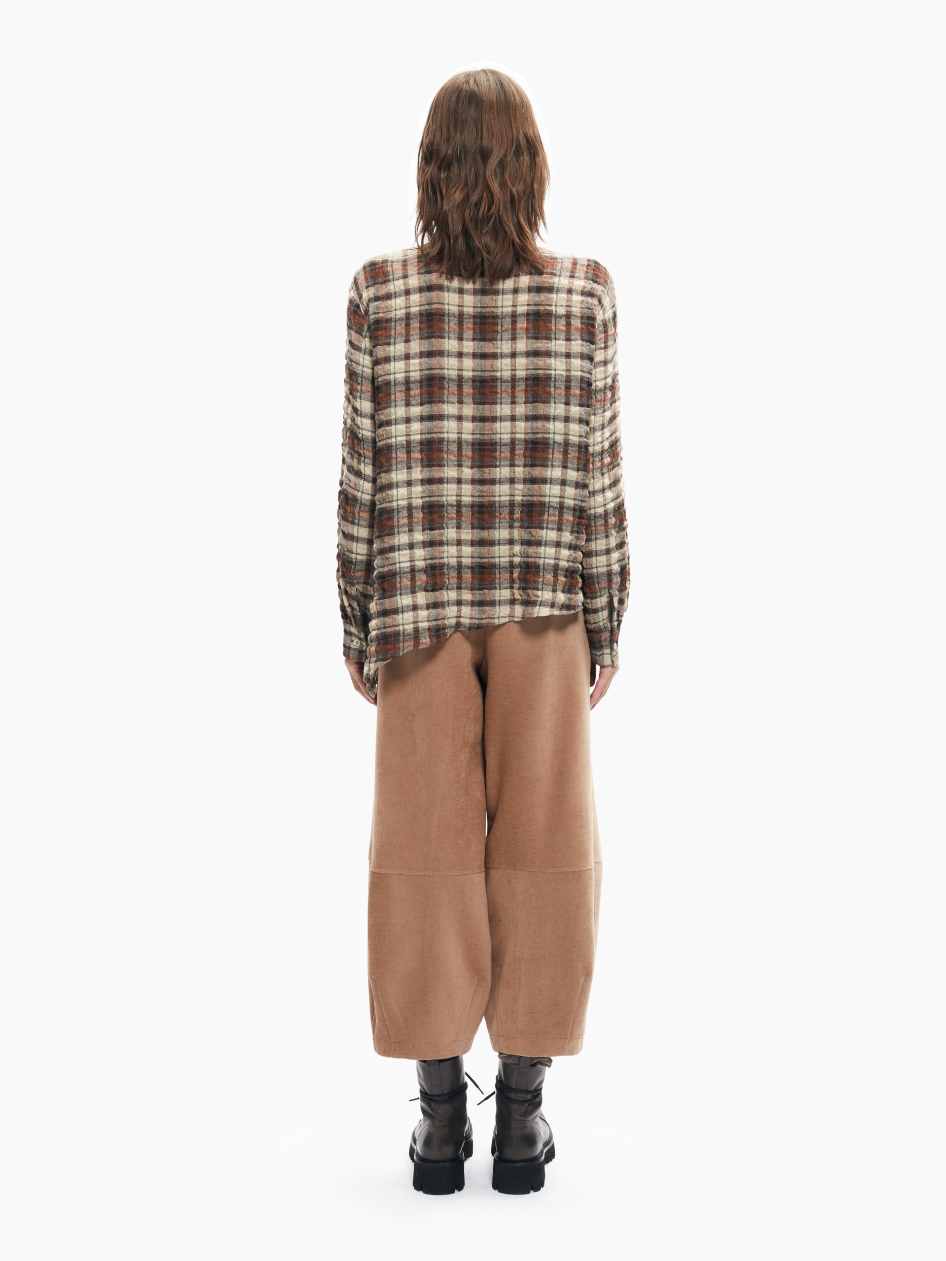 Questa camicia interpreta il motivo a quadri con un approccio morbido e moderno, grazie al tessuto che crea un effetto tridimensionale naturale. La costruzione presenta una linea scorrevole e un fondo asimmetrico che aggiunge movimento alla silhouette, mantenendo un equilibrio tra comfort e ricercatezza.