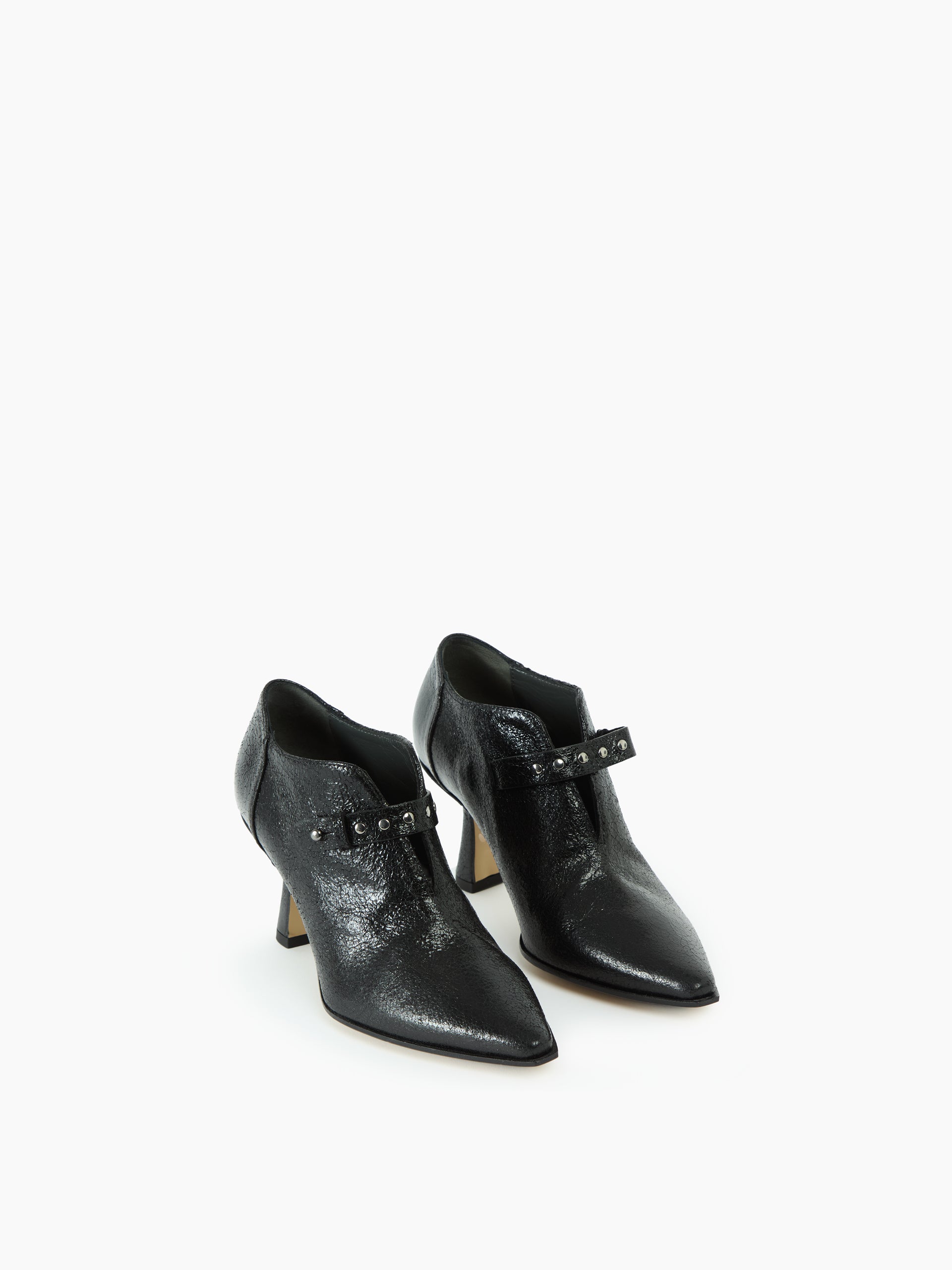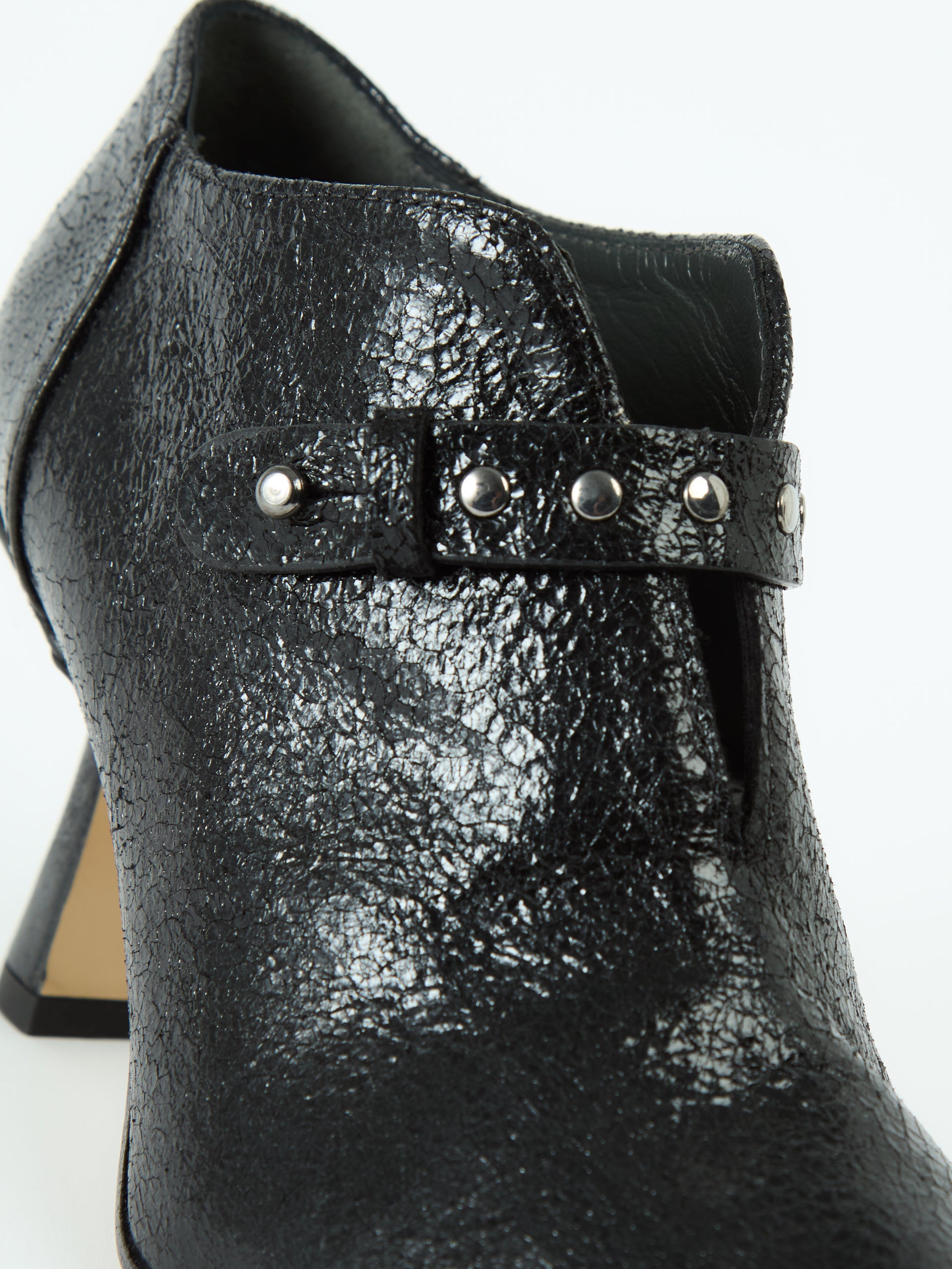 Eleganti e dal carattere deciso, questi tronchetti neri in pelle effetto craquelé aggiungono un tocco sofisticato a ogni outfit. Il design a punta slanciata valorizza la silhouette del piede, mentre il piccolo cinturino frontale con micro-borchie dona un accento moderno e ricercato.