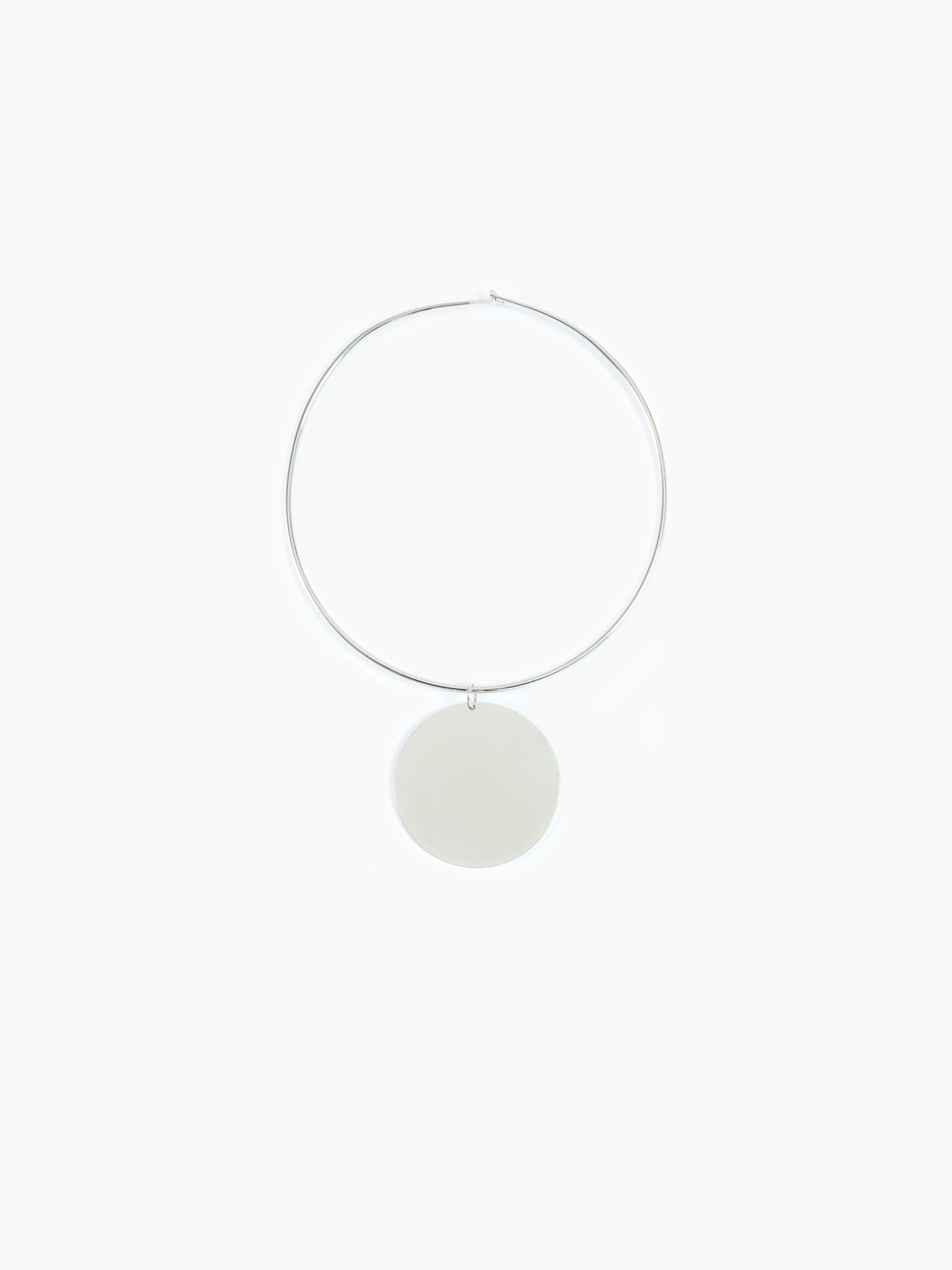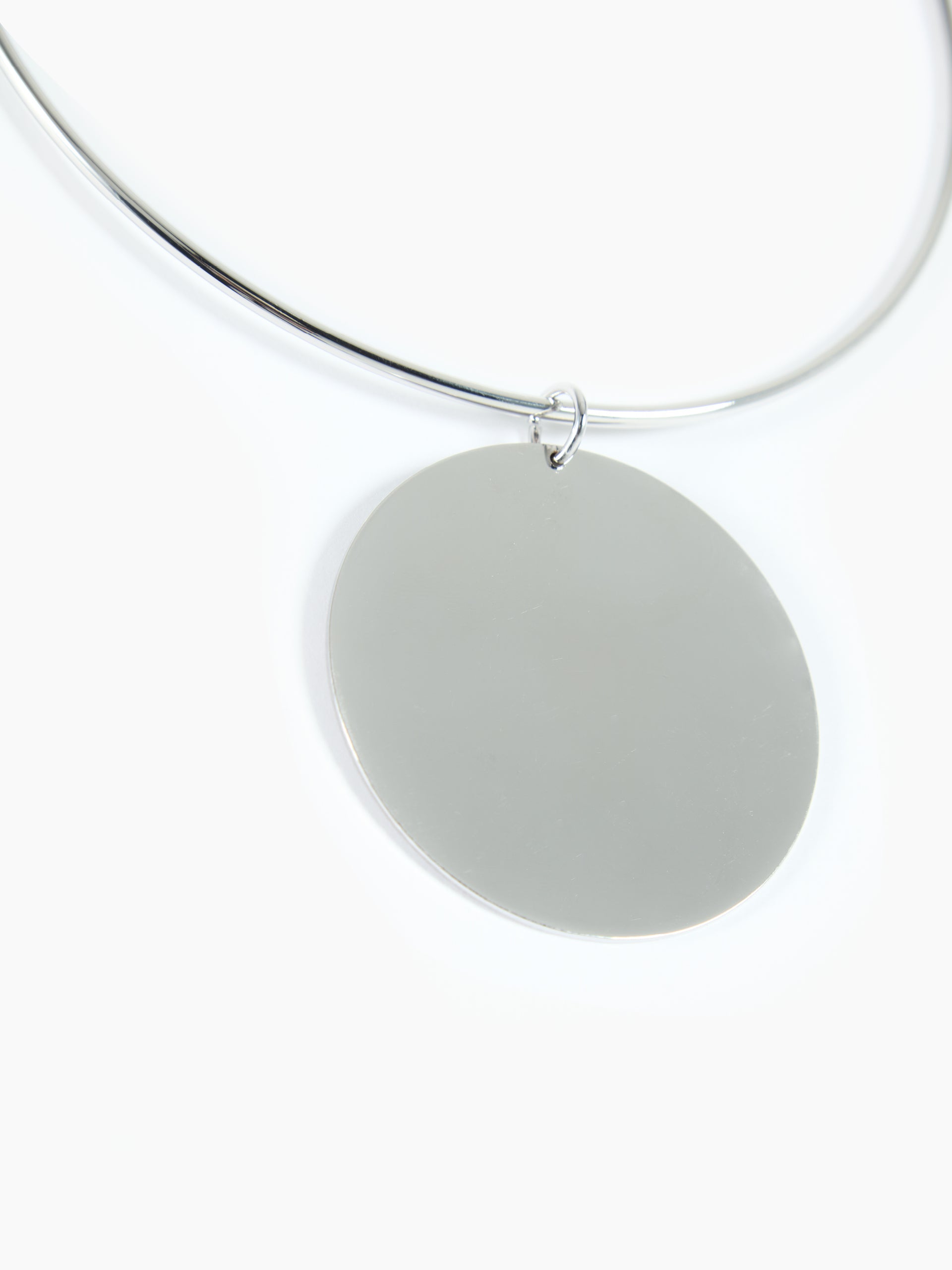 Collana composta da una struttura rigida e un ciondolo piatto dalla forma circolare. Chiusura con gancio.