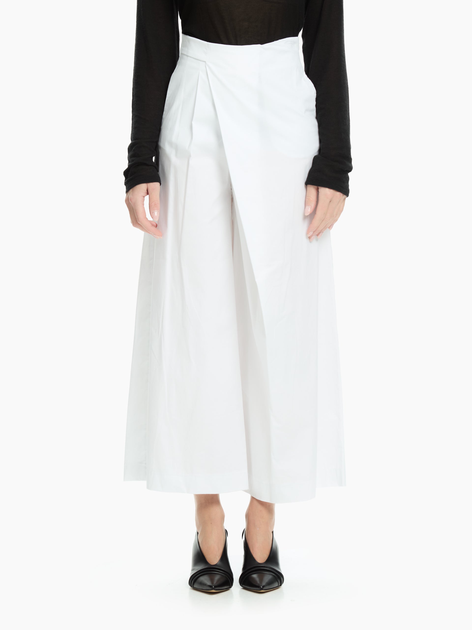 Pantalone in tessuto liscio con fascia in vita sagomata e pannello asimmetrico che attraversa elegantemente il davanti. Le pinces laterali creano volume senza appesantire, mentre le tasche laterali restano discrete e funzionali.