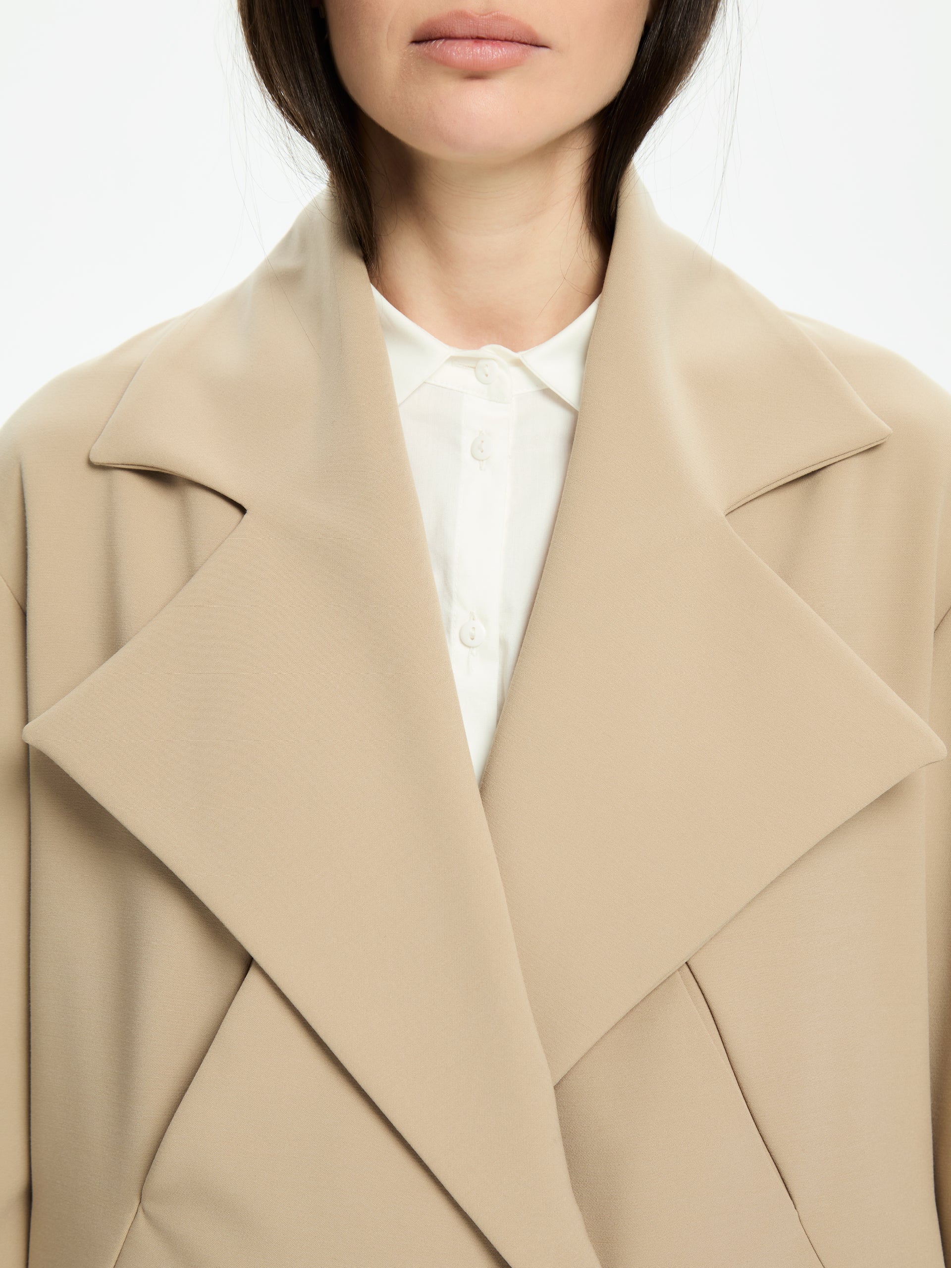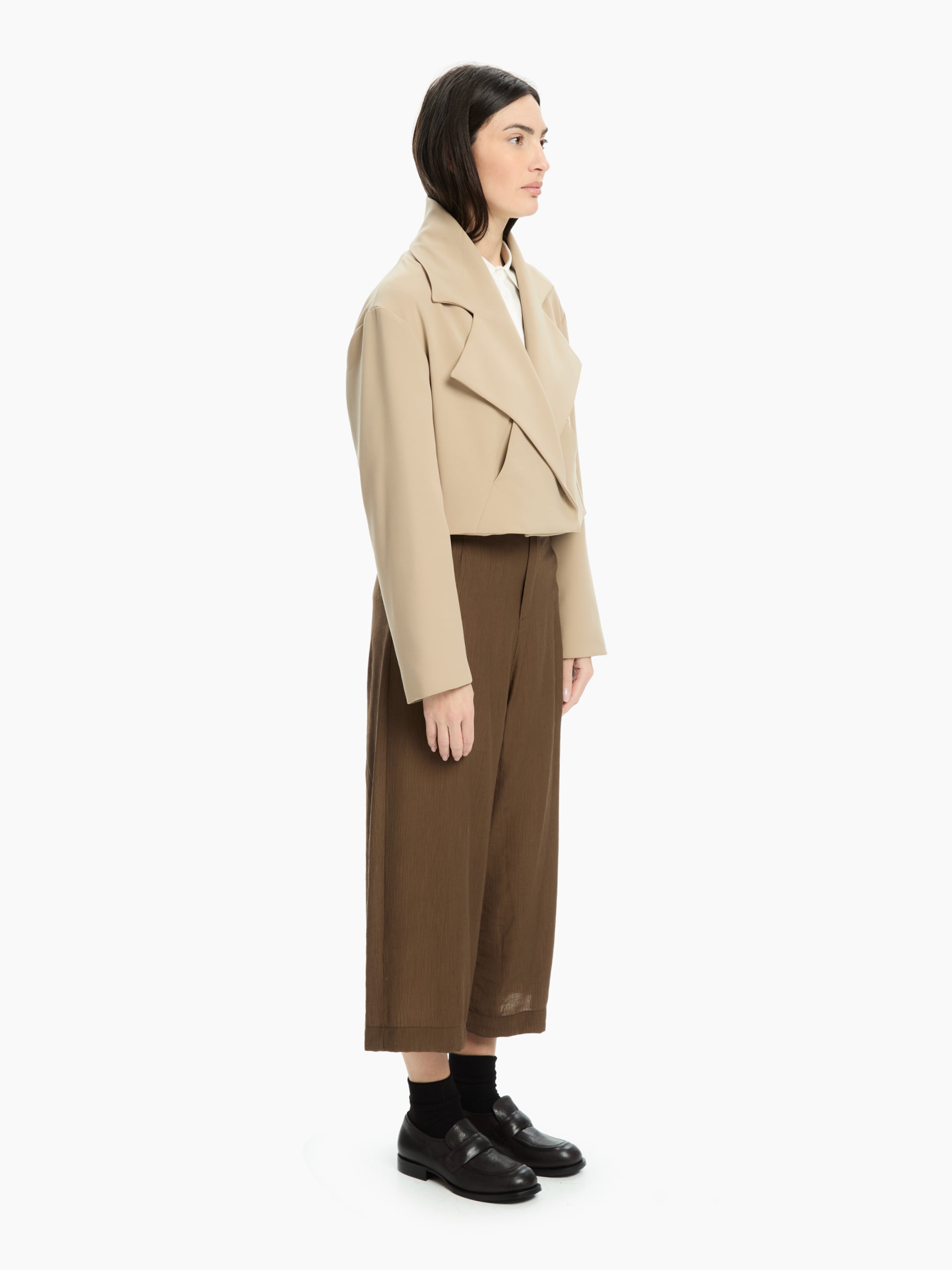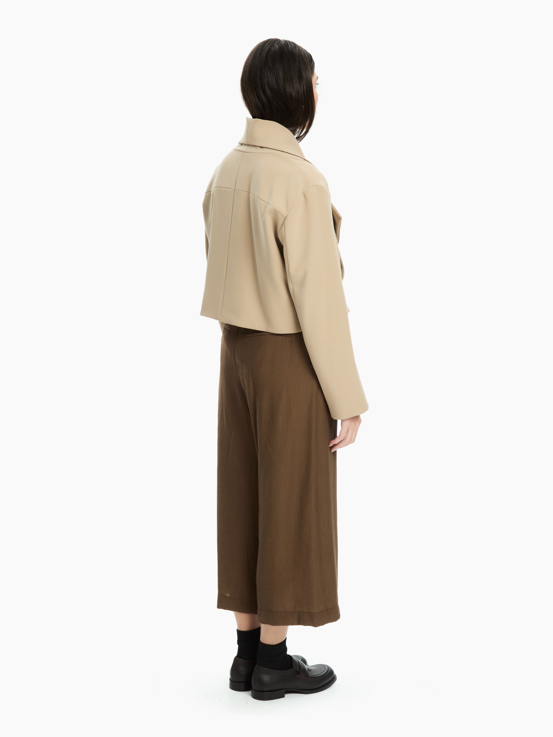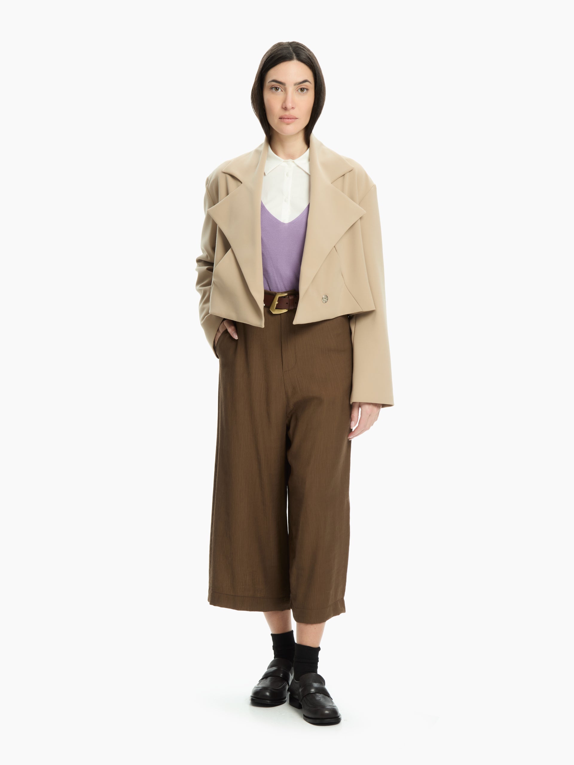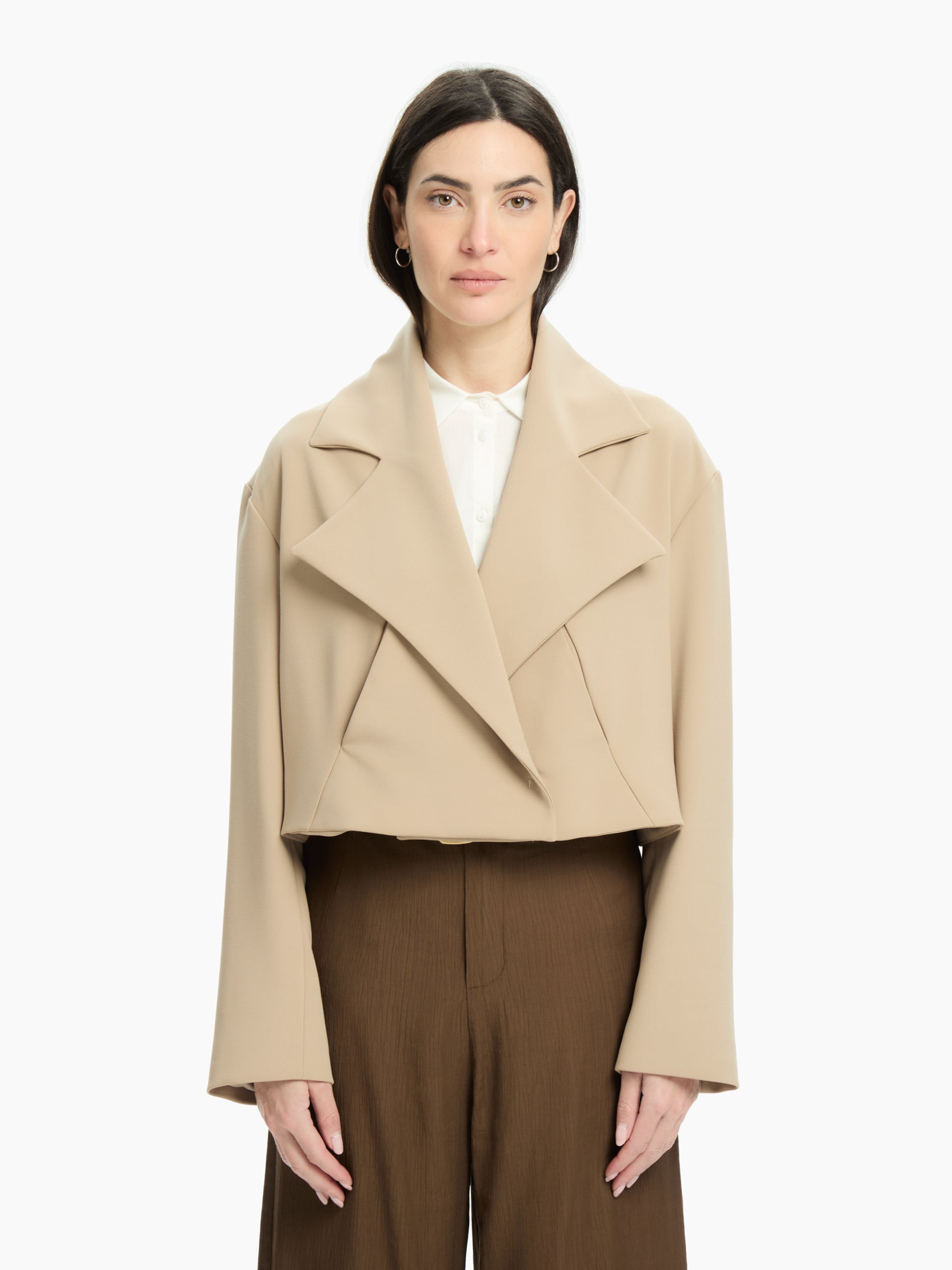 Giacca cropped dal volume a scatola e tasca sul davanti. Chiusura con bottoni automatici e bottone nascosto sul davanti. Regular-fit.