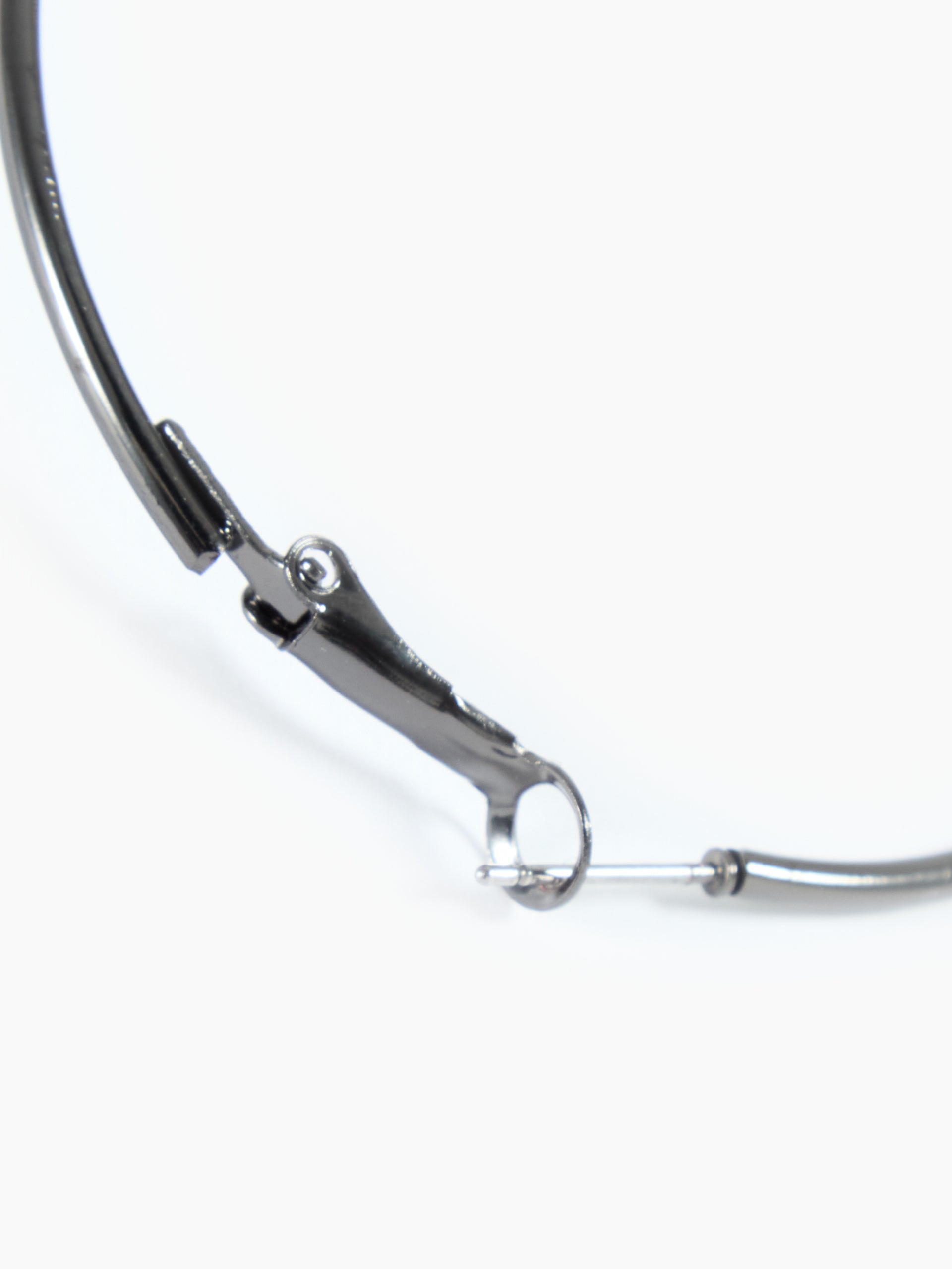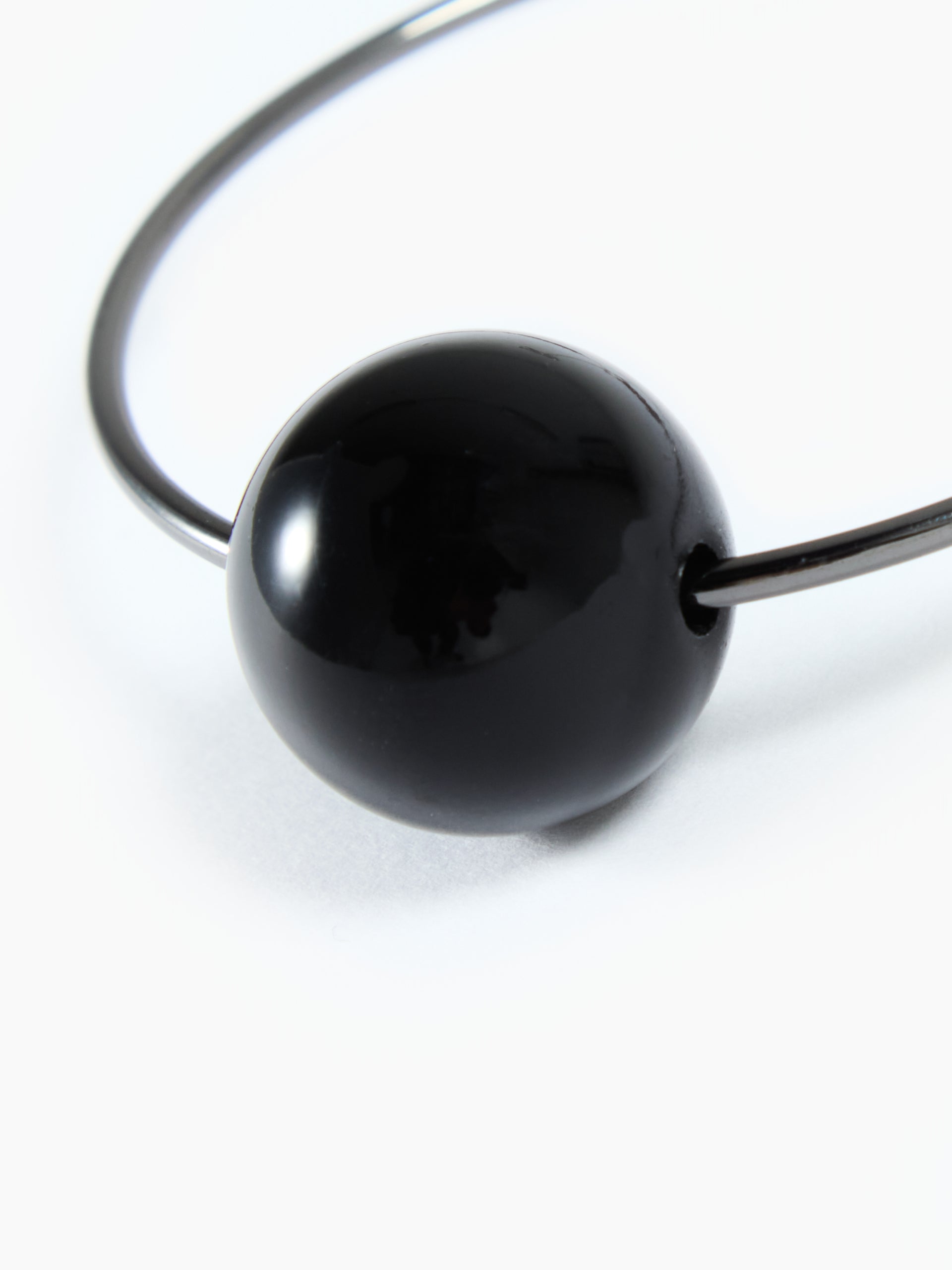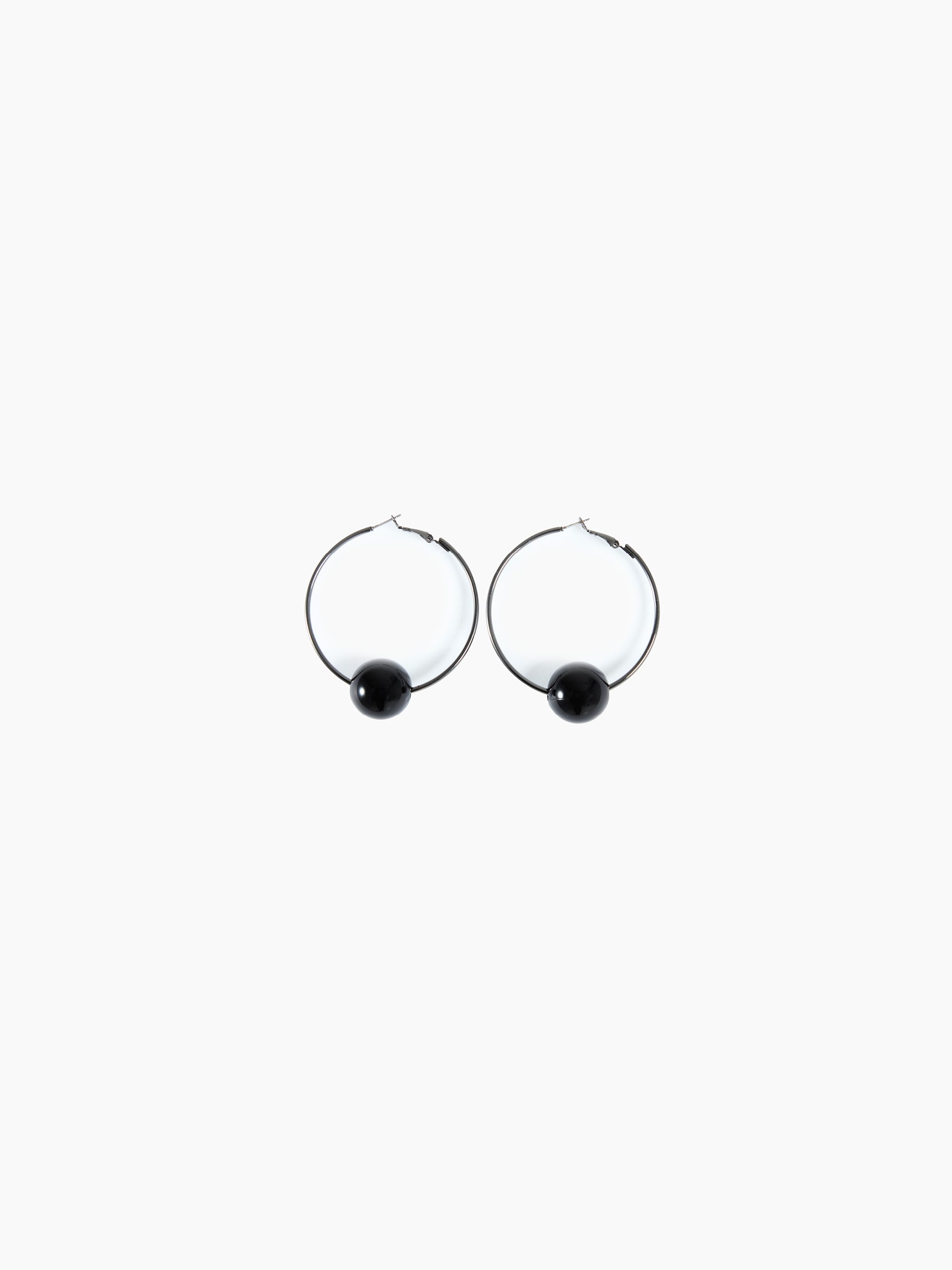 Orecchini a cerchio con struttura rigida sottile e sfera centrale a contrasto di dimensione medio-grande. Chiusura a perno.