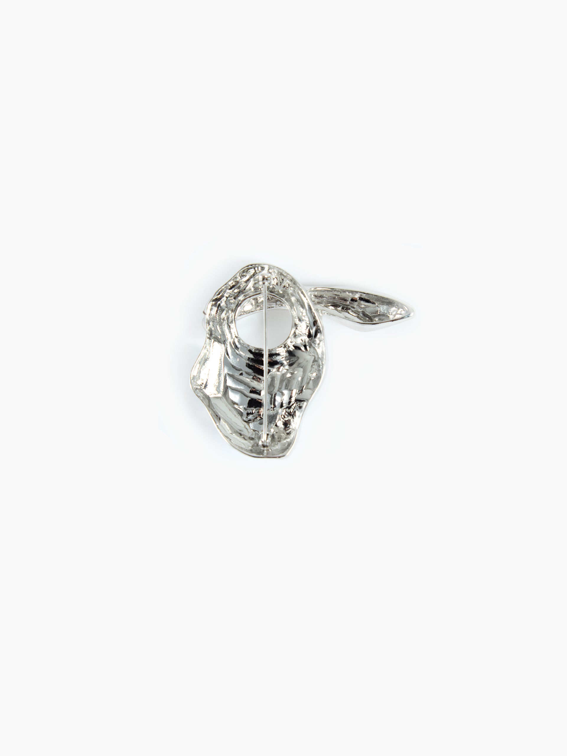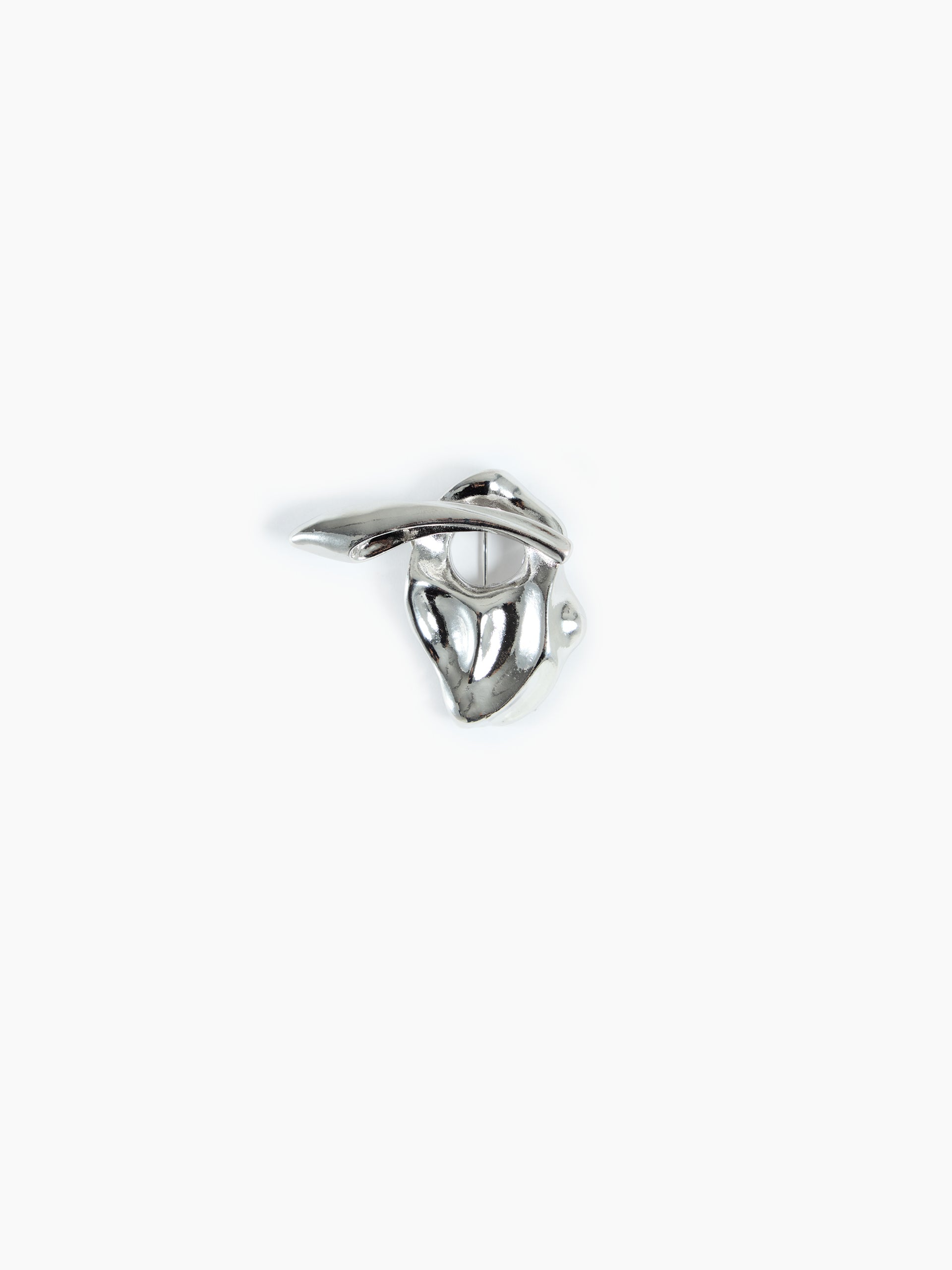 Spilla rigida dal design scultoreo, caratterizzata da una struttura irregolare con profili fluidi. Chiusura a perno integrata per un fissaggio stabile.