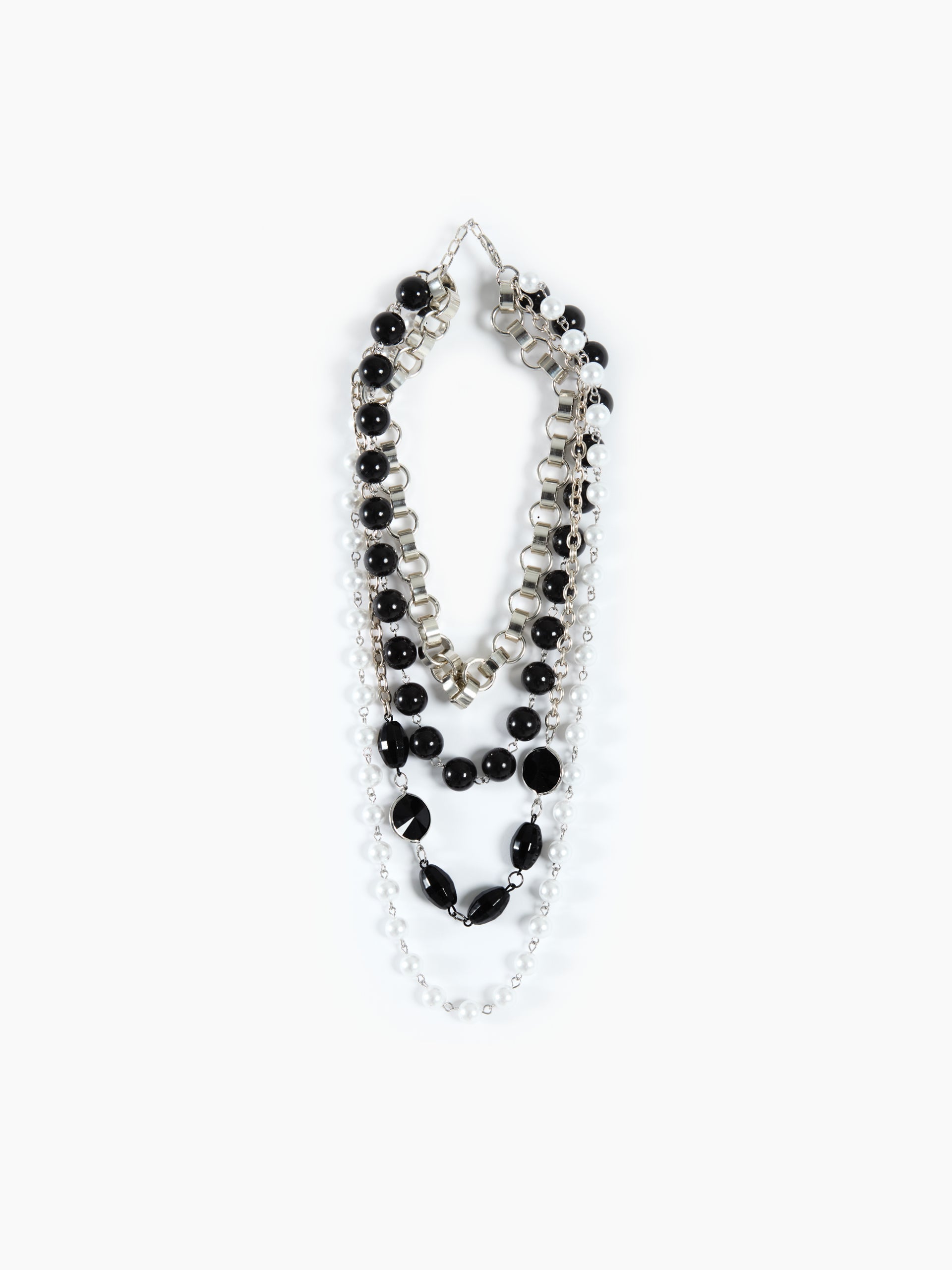 Collana multistrato con catene a maglia larga e fili di perle decorative. Alternanza di elementi lisci e sferici. Chiusura regolabile.