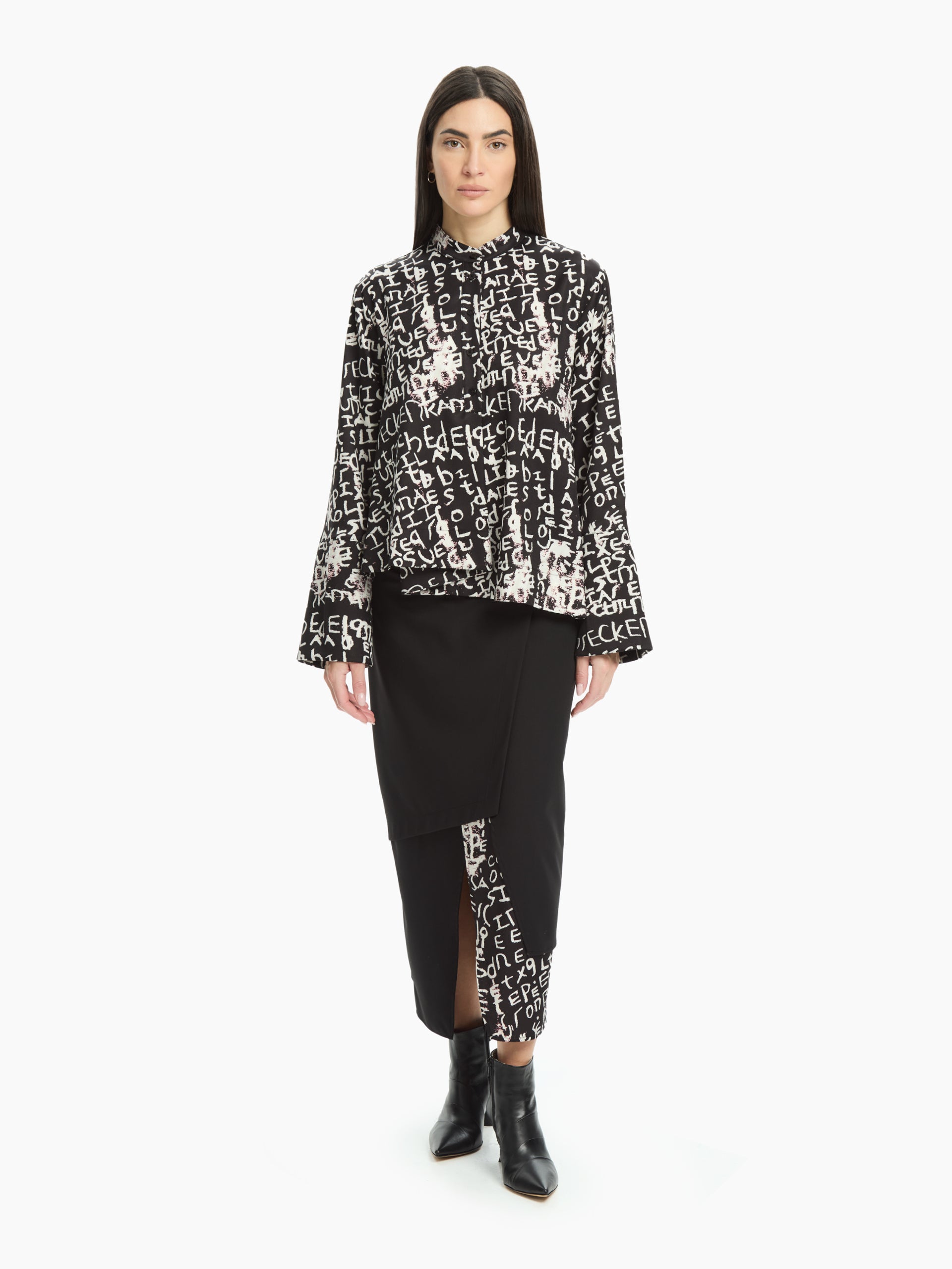 Realizzata in tessuto tecnico compatto, presenta una costruzione a pannelli sovrapposti con spacco frontale asimmetrico che rivela un inserto stampato con motivo grafico a contrasto.