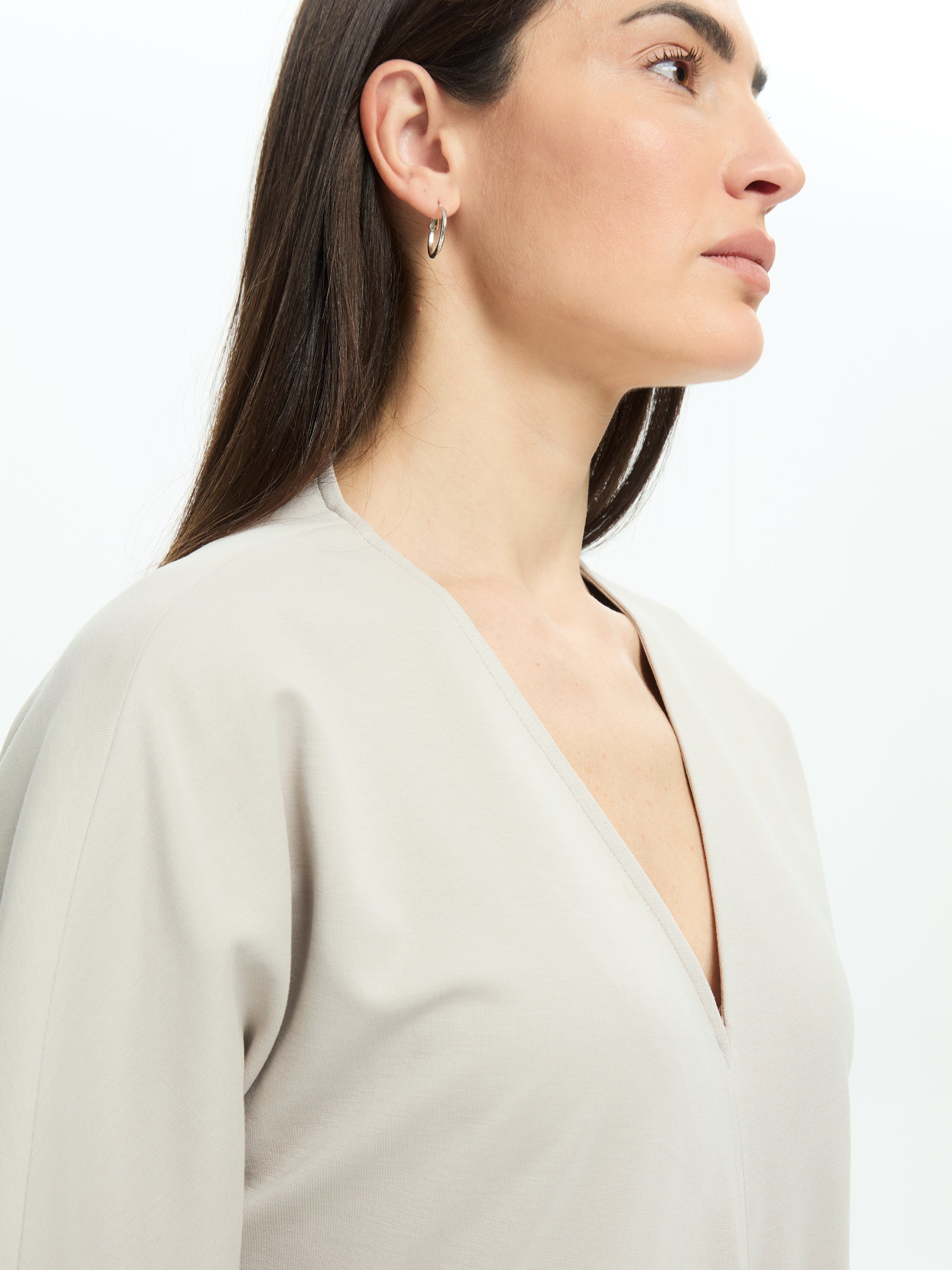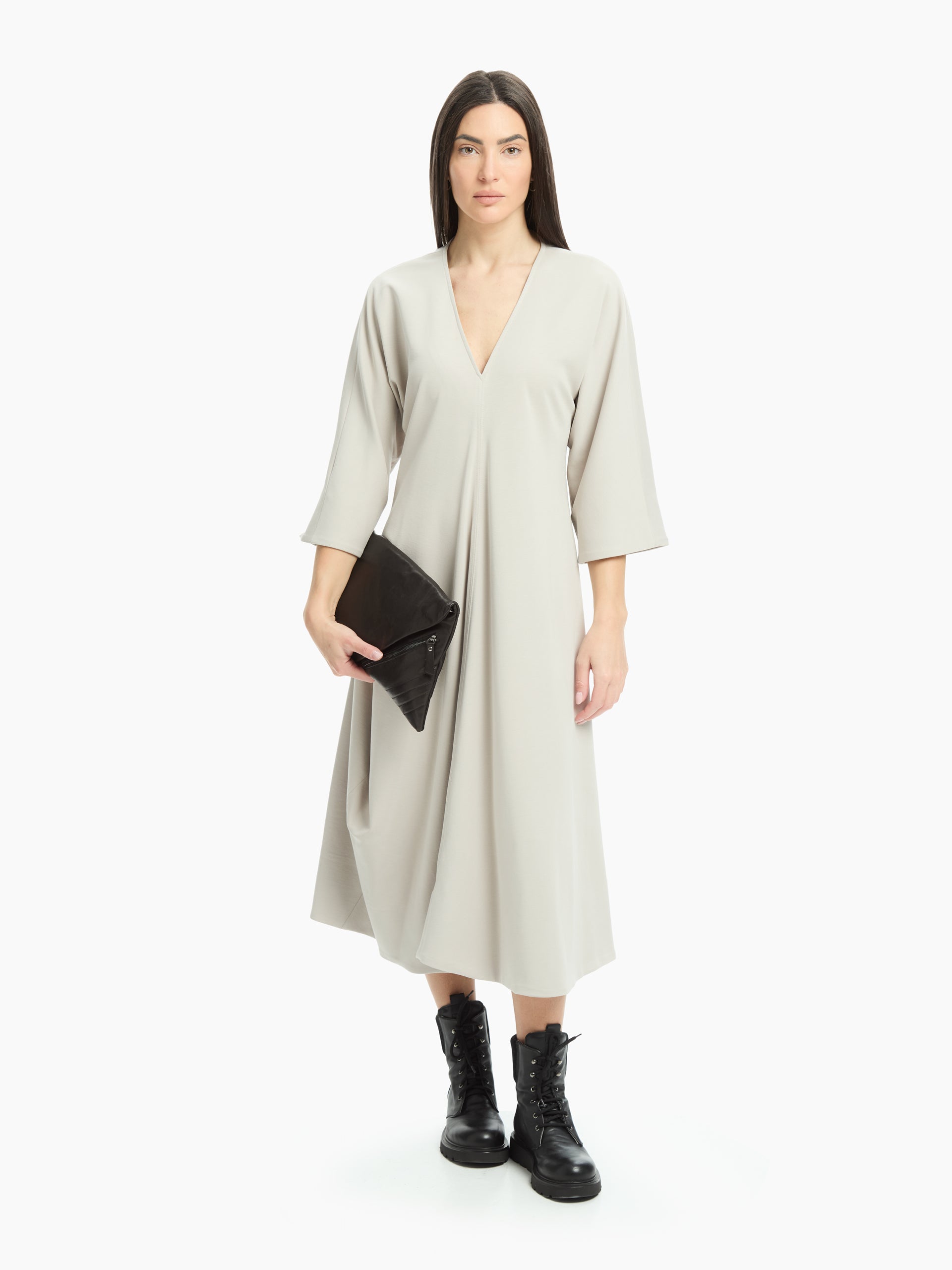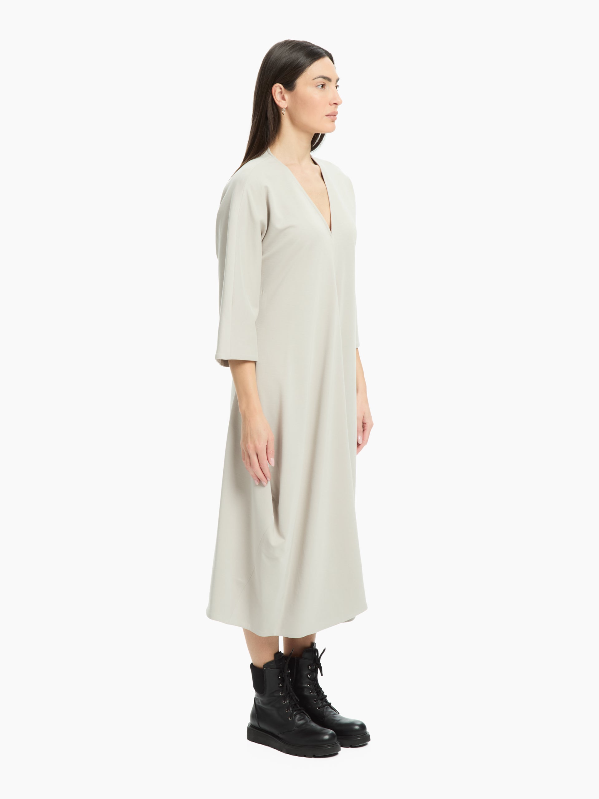 Un modello essenziale e dal fascino rilassato. La linea ampia scivola fluida sul corpo, creando un movimento naturale. Lo scollo a V e le maniche ampie a tre quarti aggiungono equilibrio e leggerezza al design, rendendolo perfetto per look minimal e contemporanei.