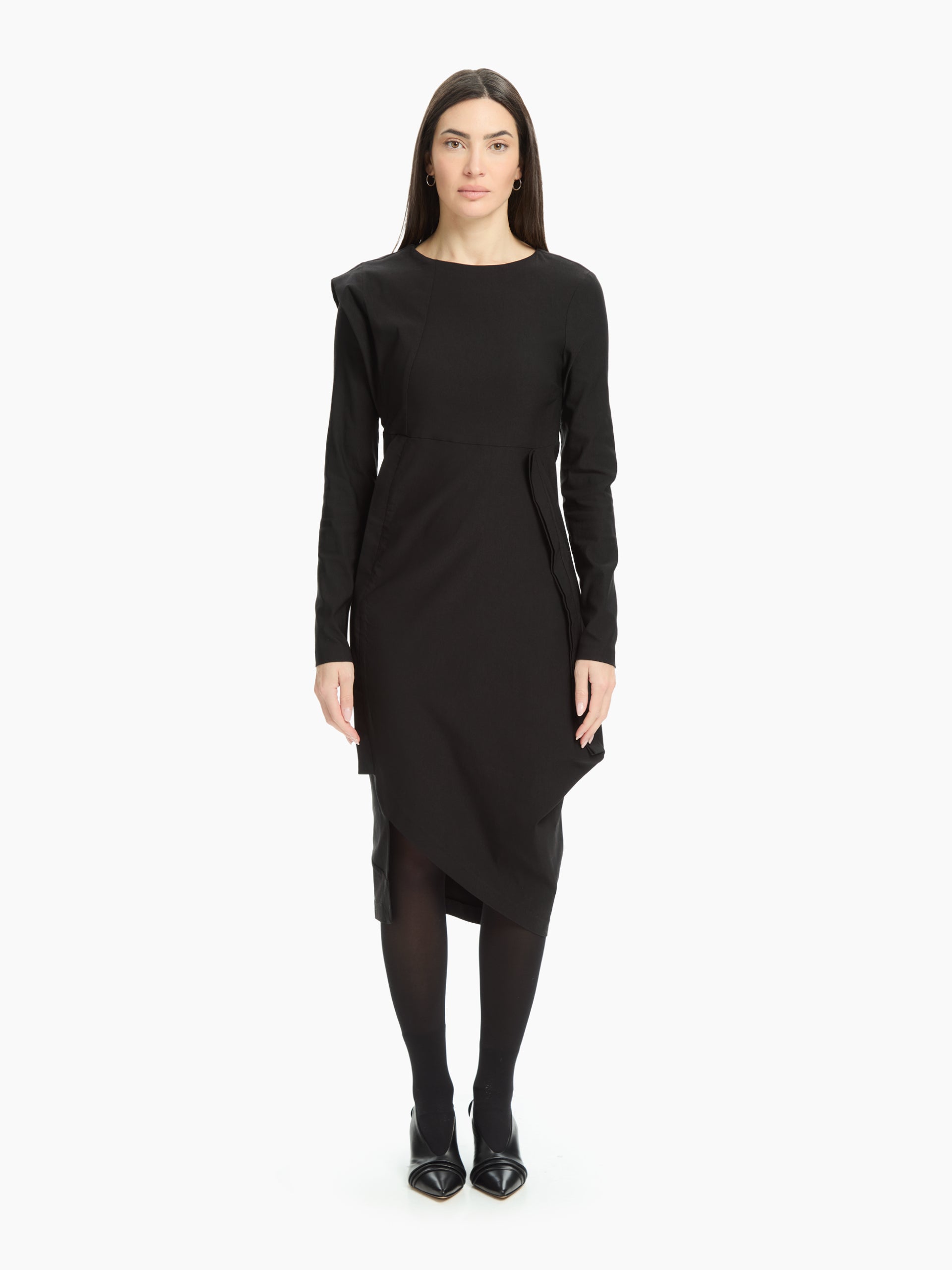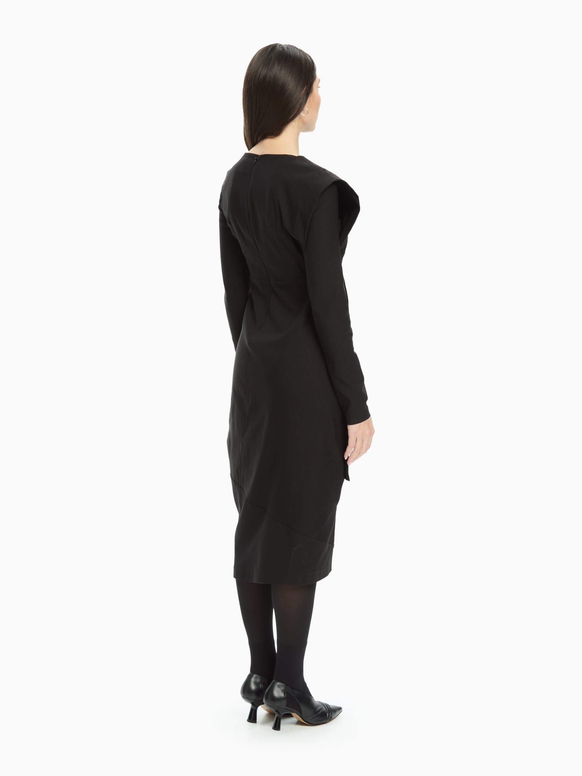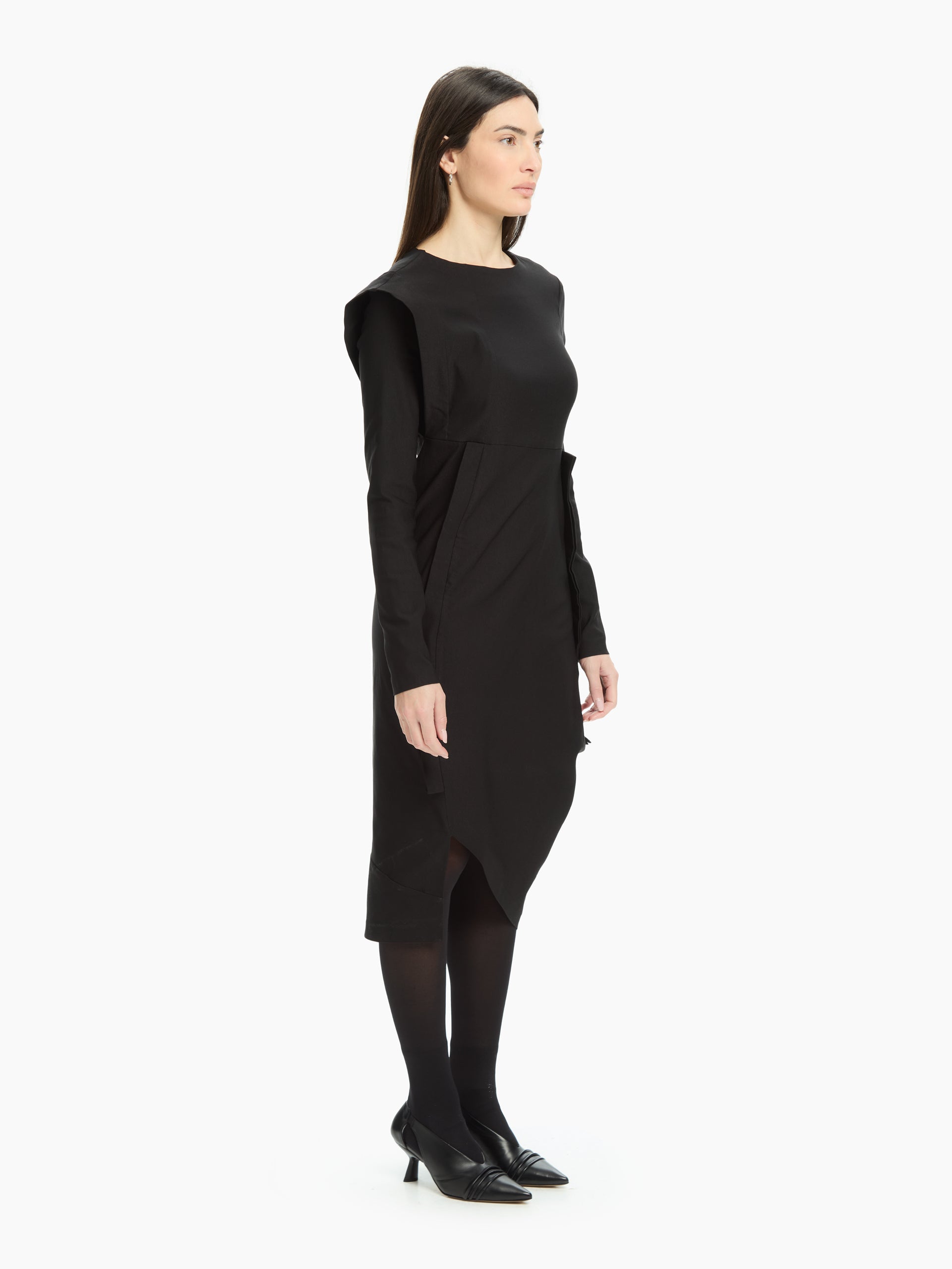 Questo abito IXOS reinterpreta la femminilità contemporanea attraverso un design essenziale ma ricco di dettagli architettonici. La linea asciutta e pulita viene valorizzata da costruzioni sartoriali mirate, mentre l’asimmetria sul fondo dona movimento e un carattere deciso al capo.