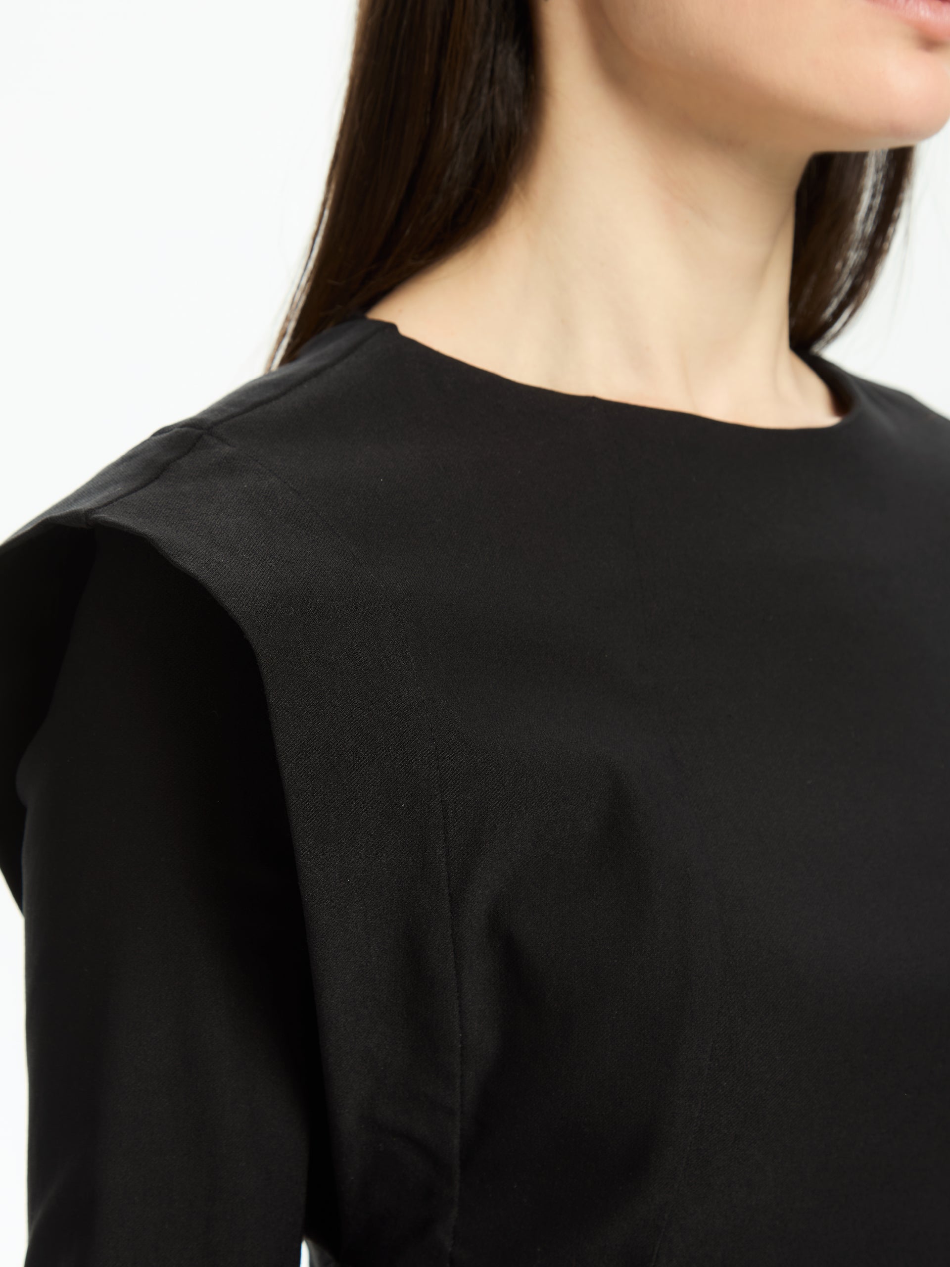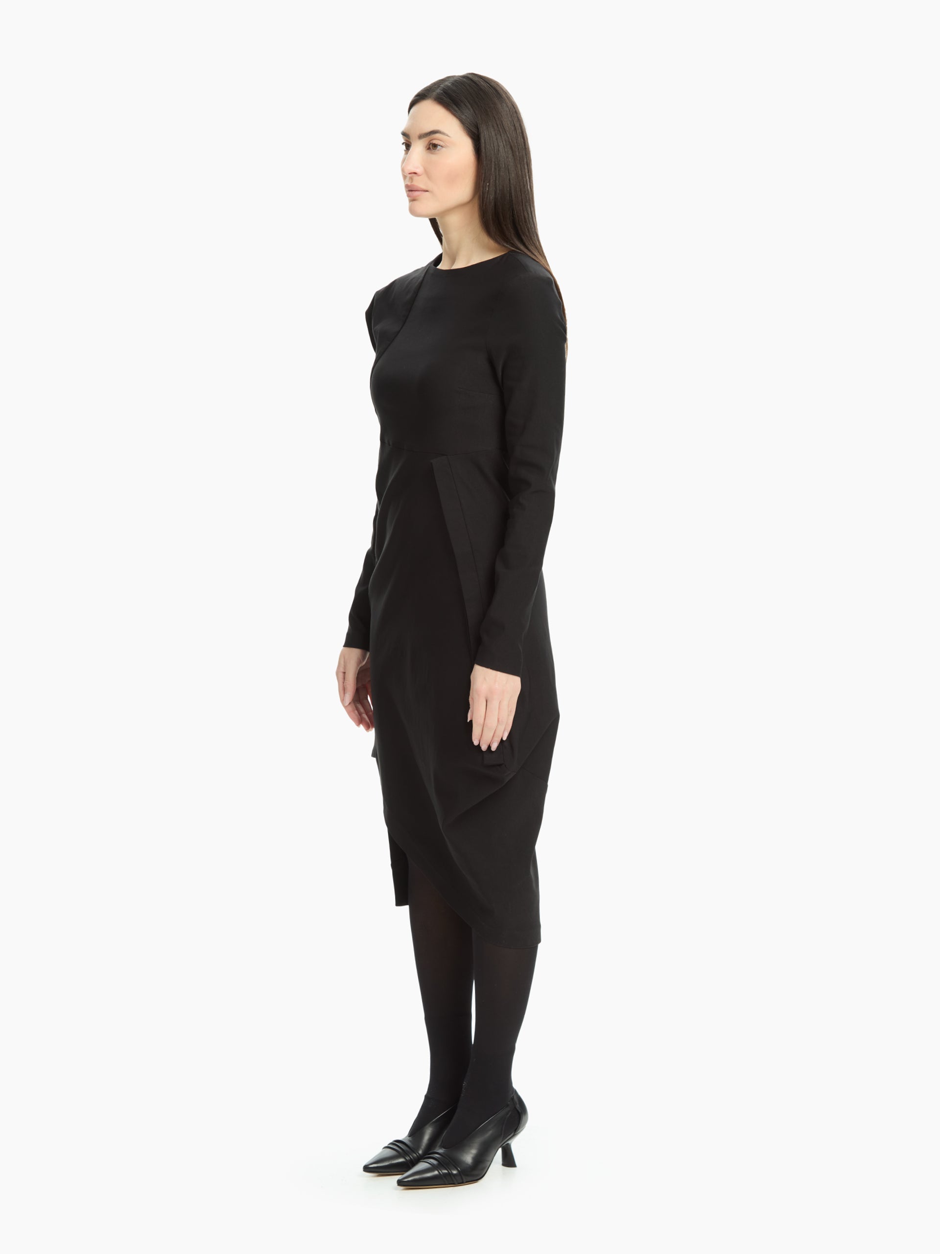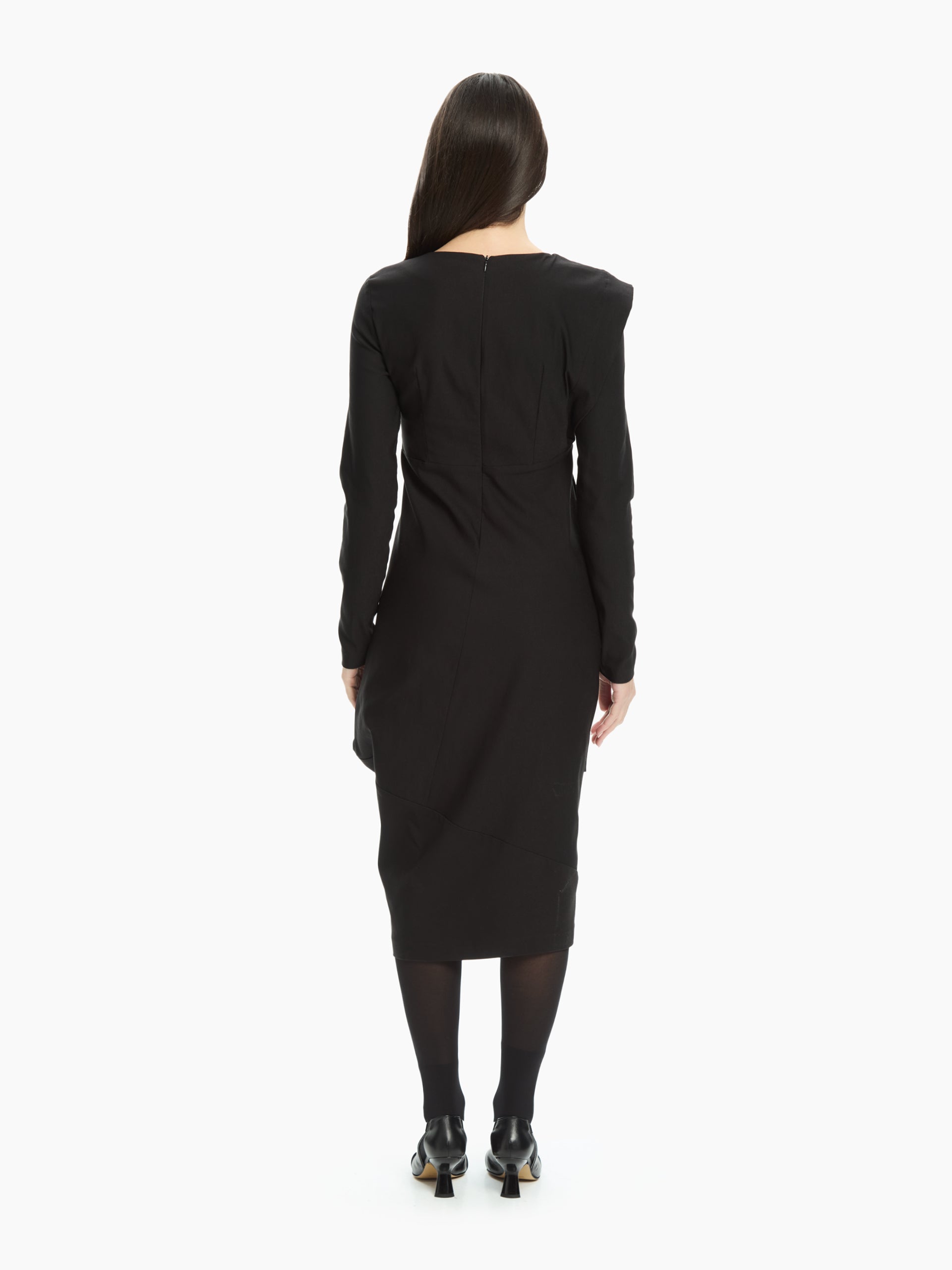 Questo abito IXOS reinterpreta la femminilità contemporanea attraverso un design essenziale ma ricco di dettagli architettonici. La linea asciutta e pulita viene valorizzata da costruzioni sartoriali mirate, mentre l’asimmetria sul fondo dona movimento e un carattere deciso al capo.