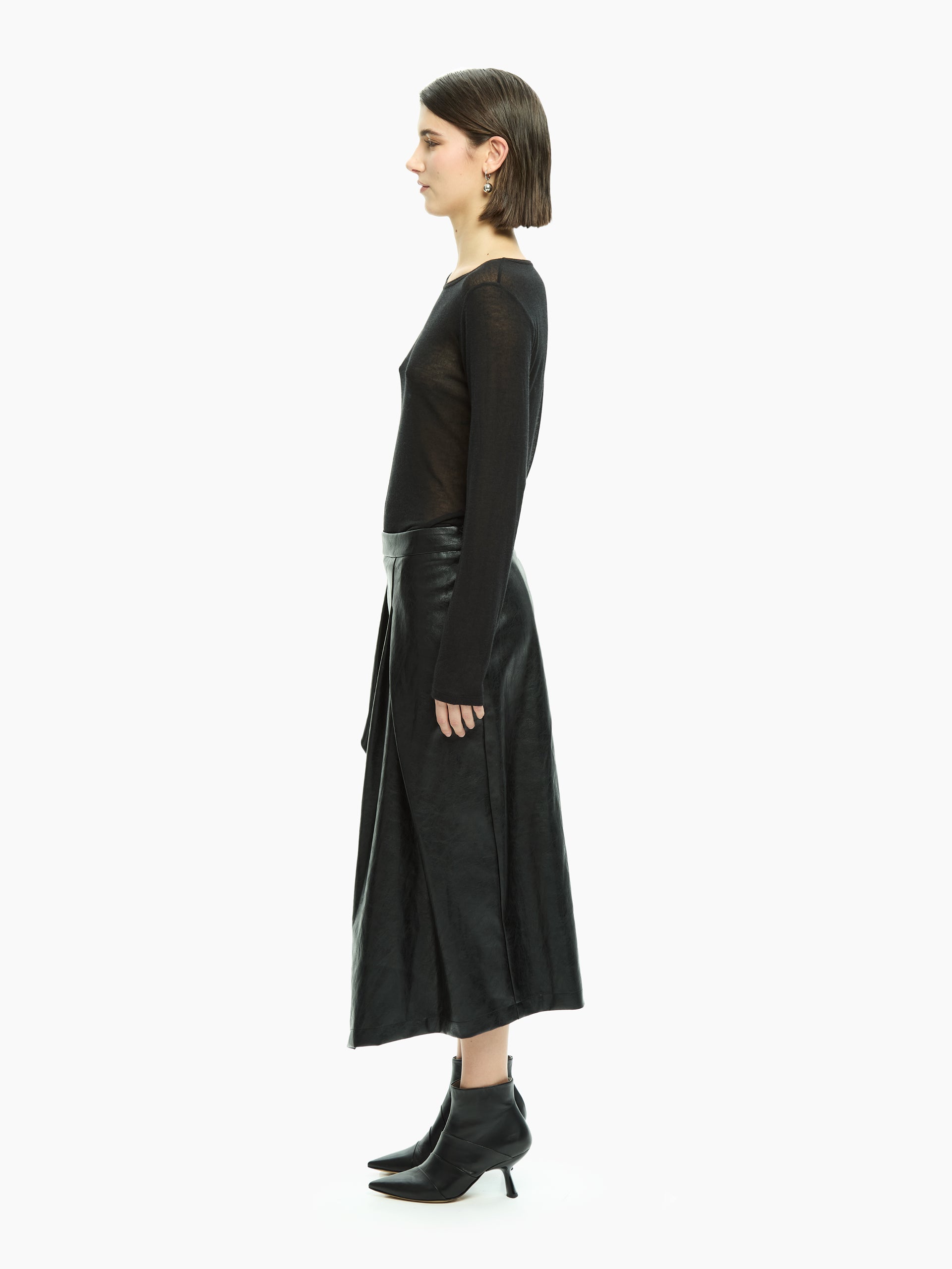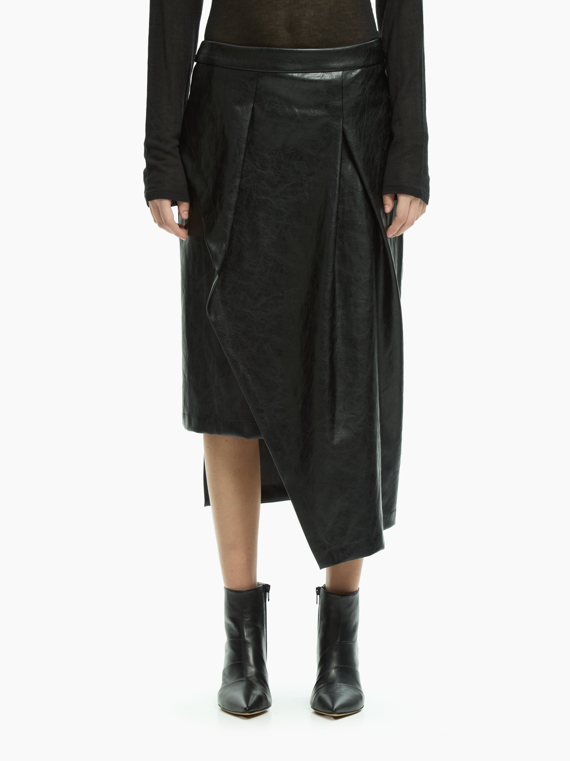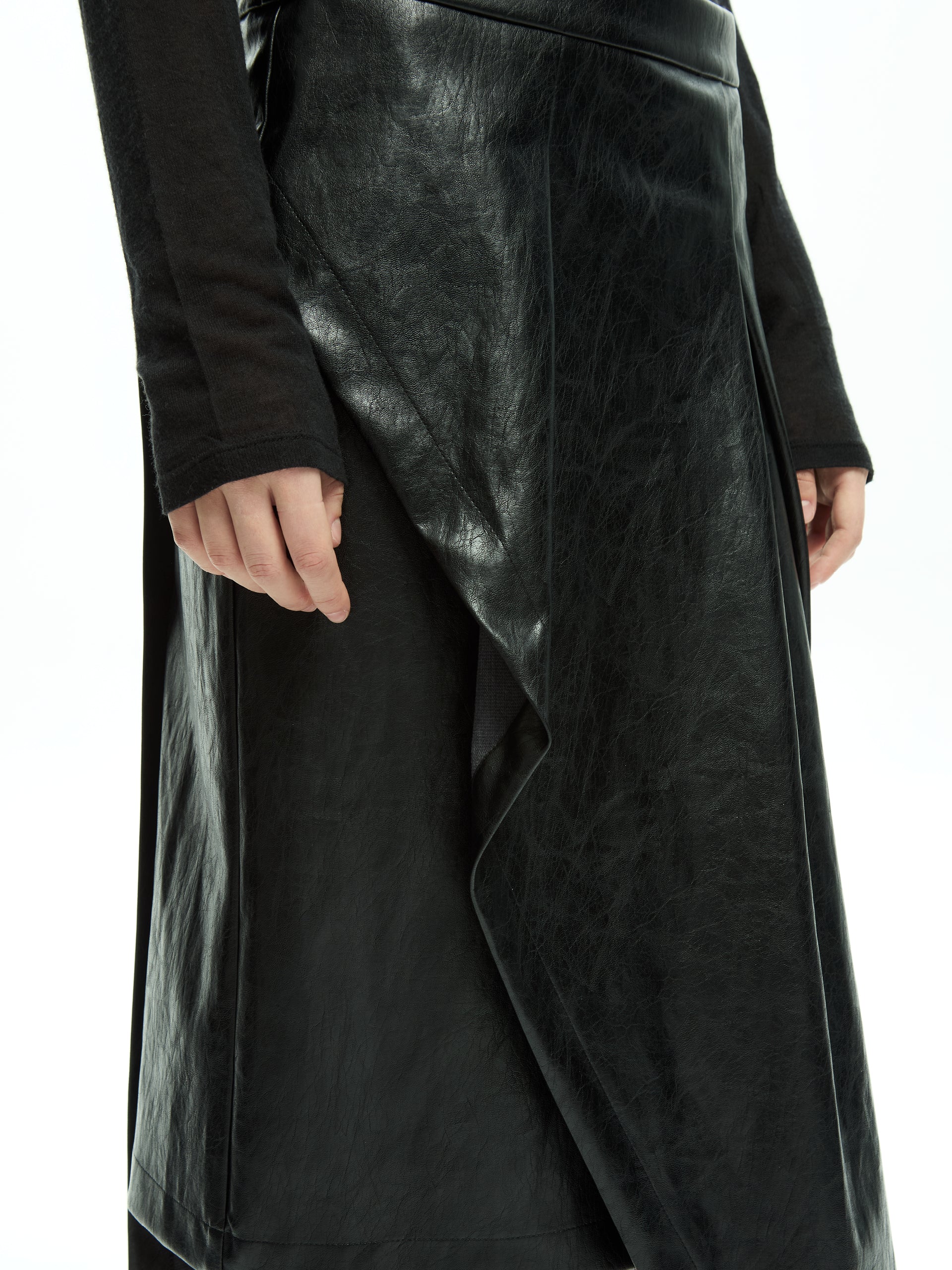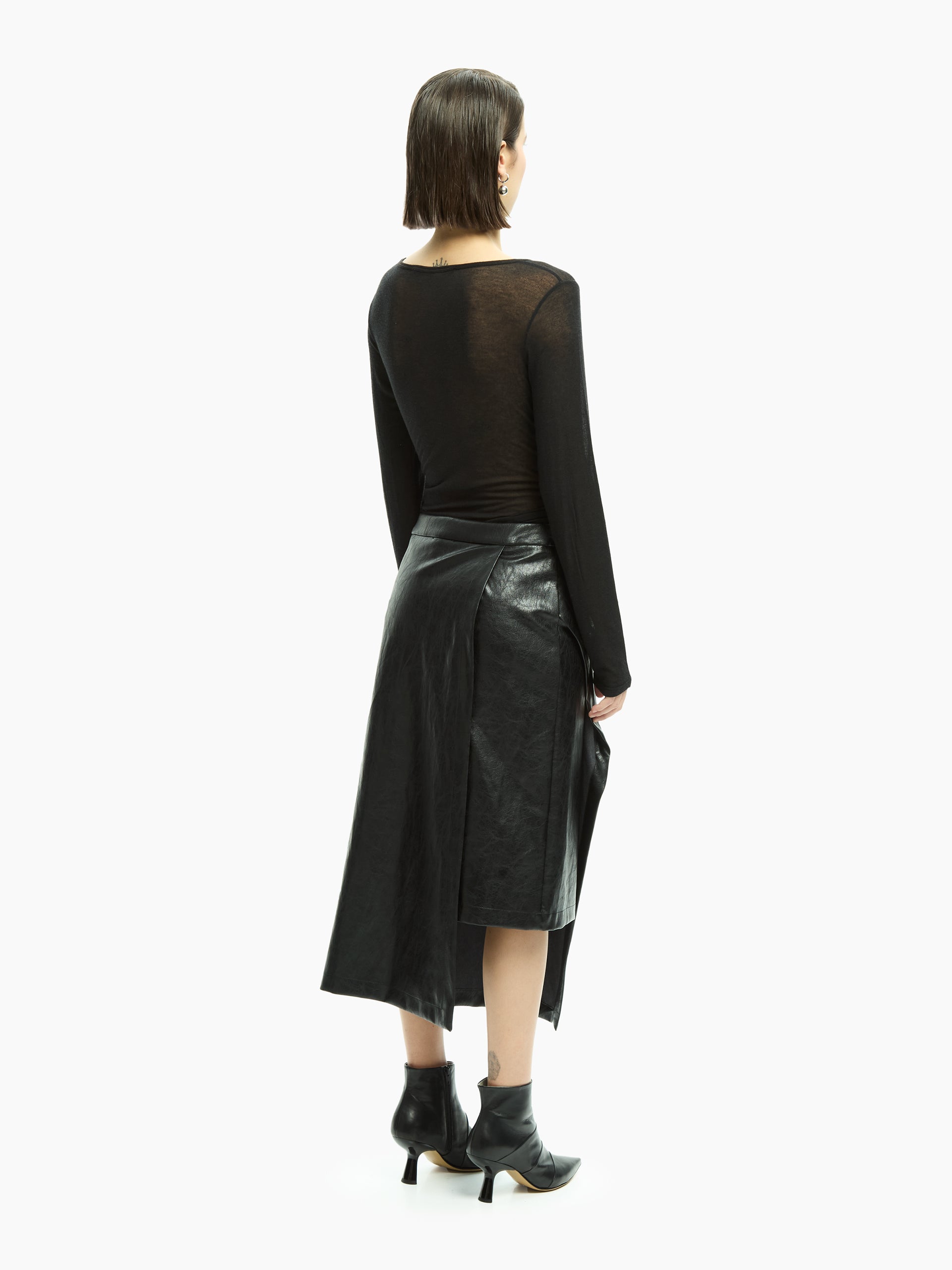 Gonna dal design deciso e contemporaneo, caratterizzata da un pannello sovrapposto che definisce una silhouette architettonica e fluida allo stesso tempo. La costruzione pulita valorizza il volume del capo, mentre il gioco di sovrapposizioni introduce movimento e profondità visiva.
