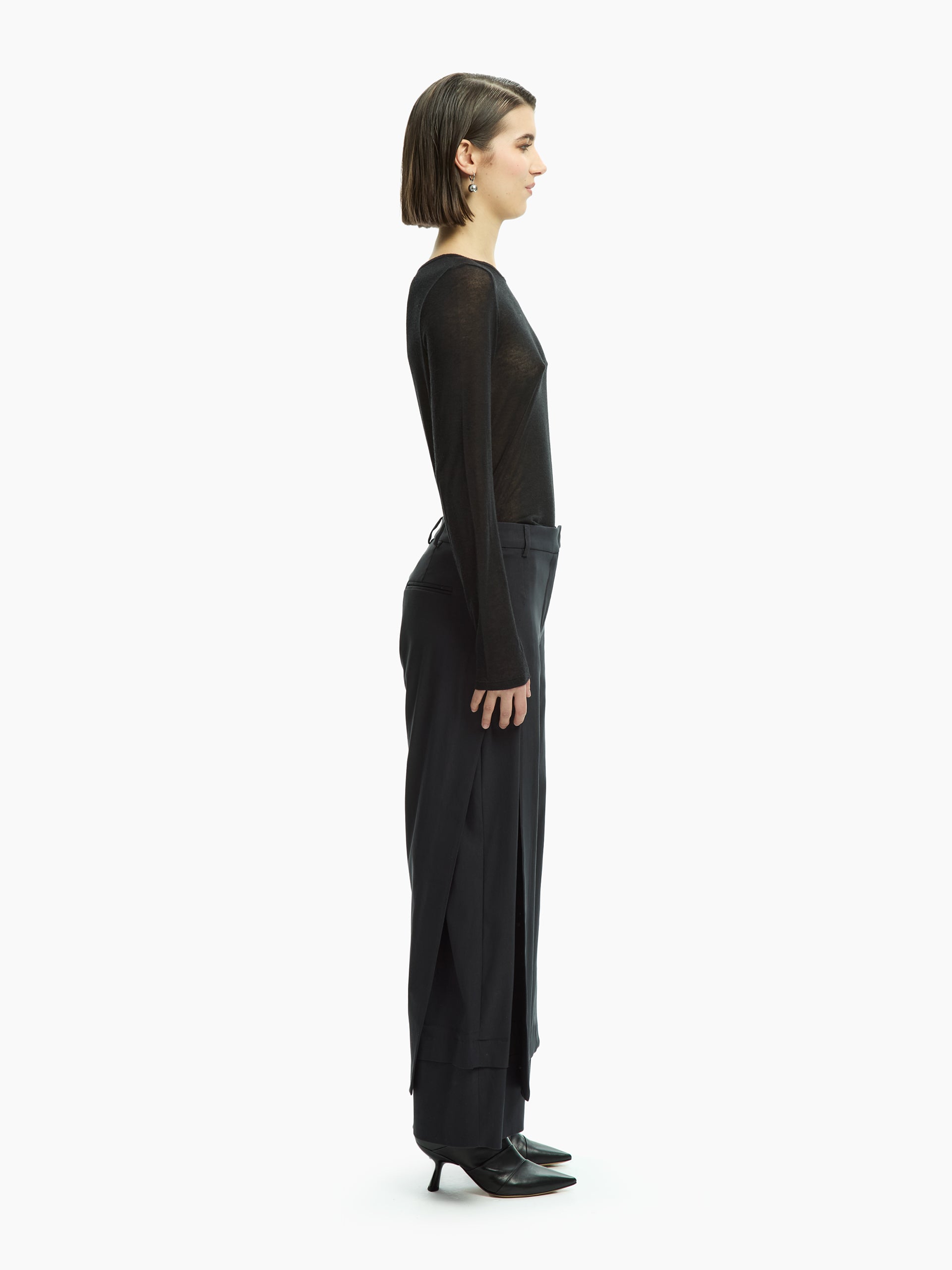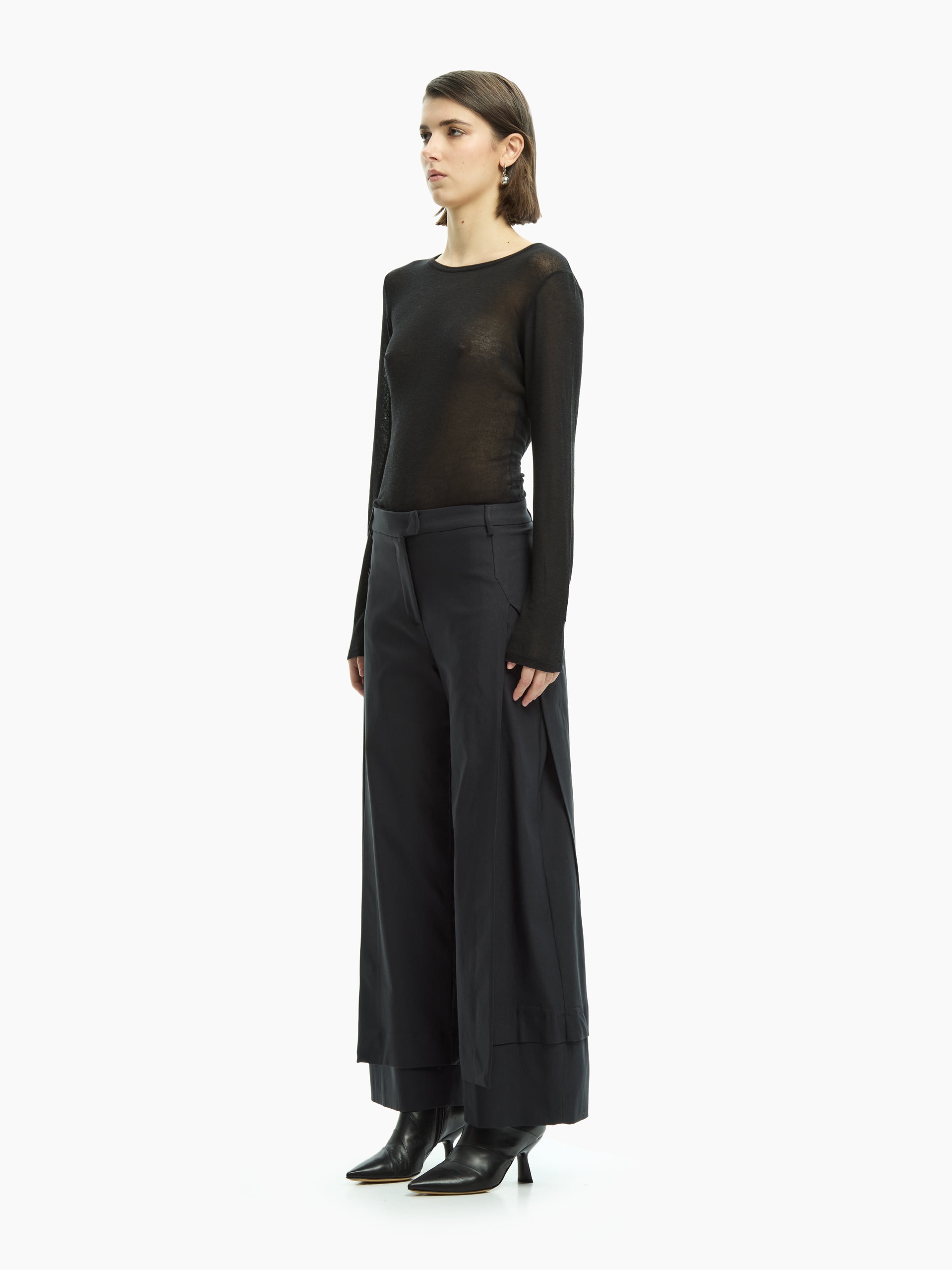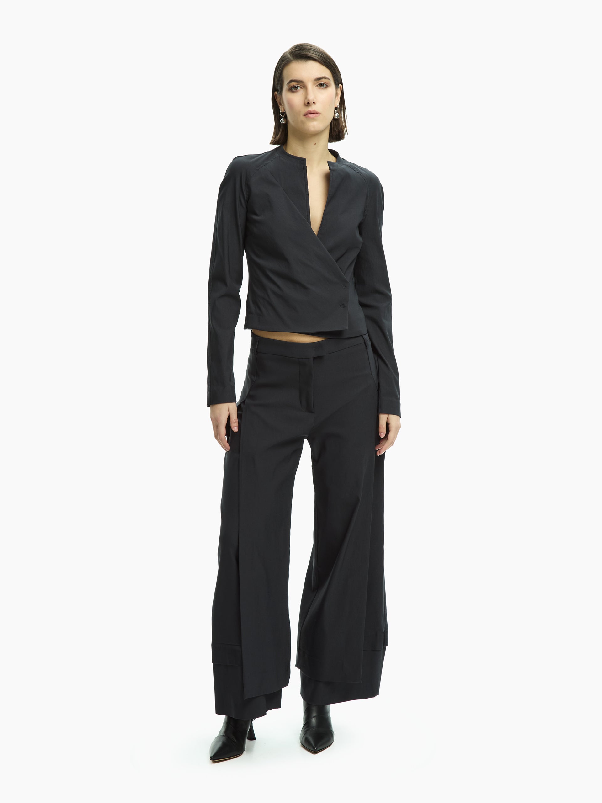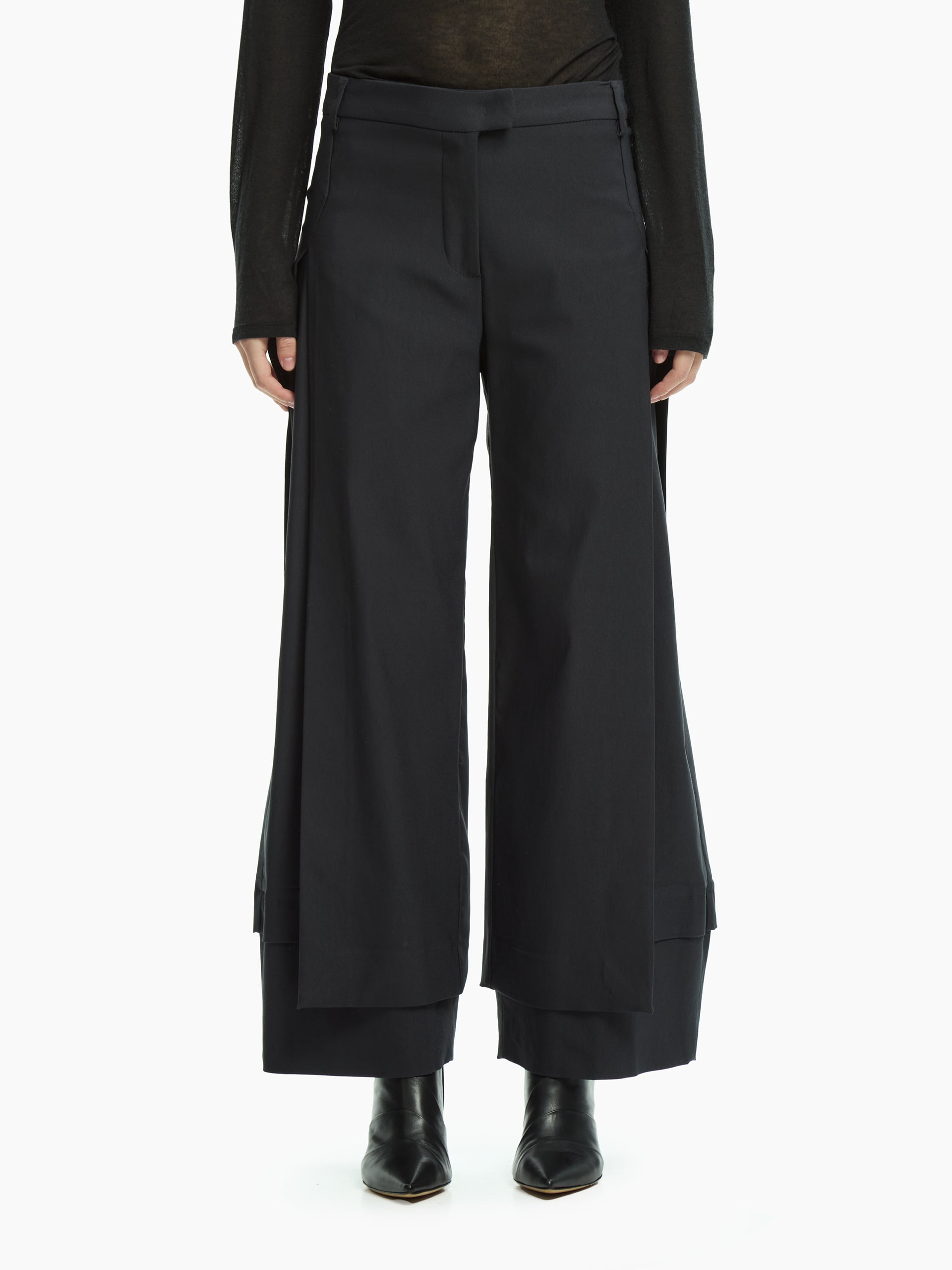 Pantalone dal design pulito e sofisticato, caratterizzato da una costruzione sartoriale che incontra una vestibilità fluida. La linea ampia scende morbida lungo la gamba, mentre i pannelli sovrapposti introducono movimento e profondità, definendo un’estetica contemporanea ed equilibrata.