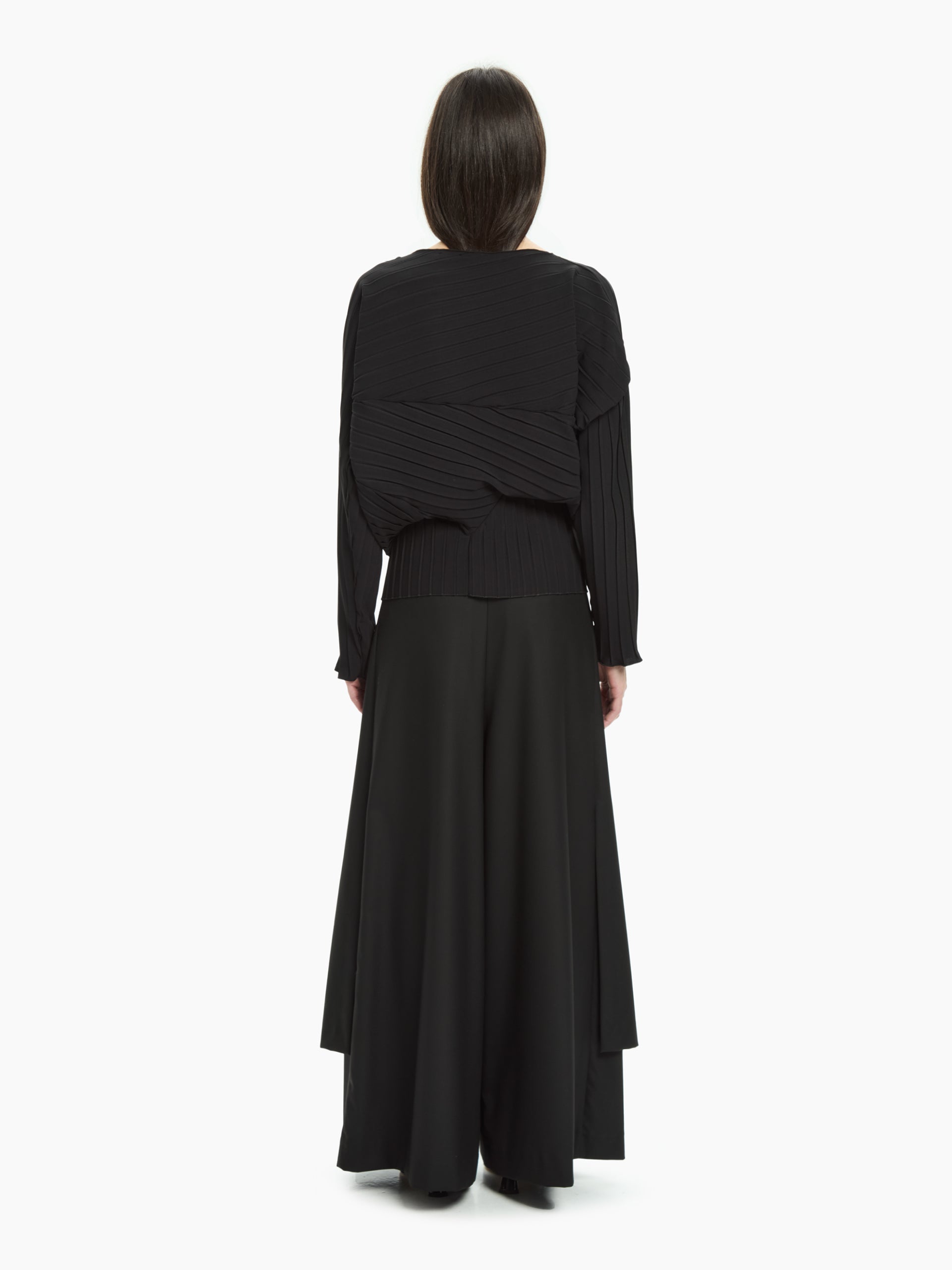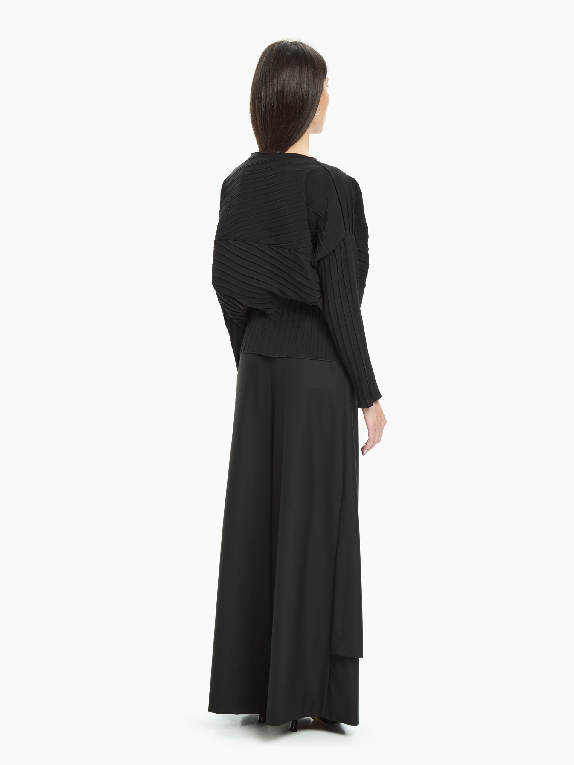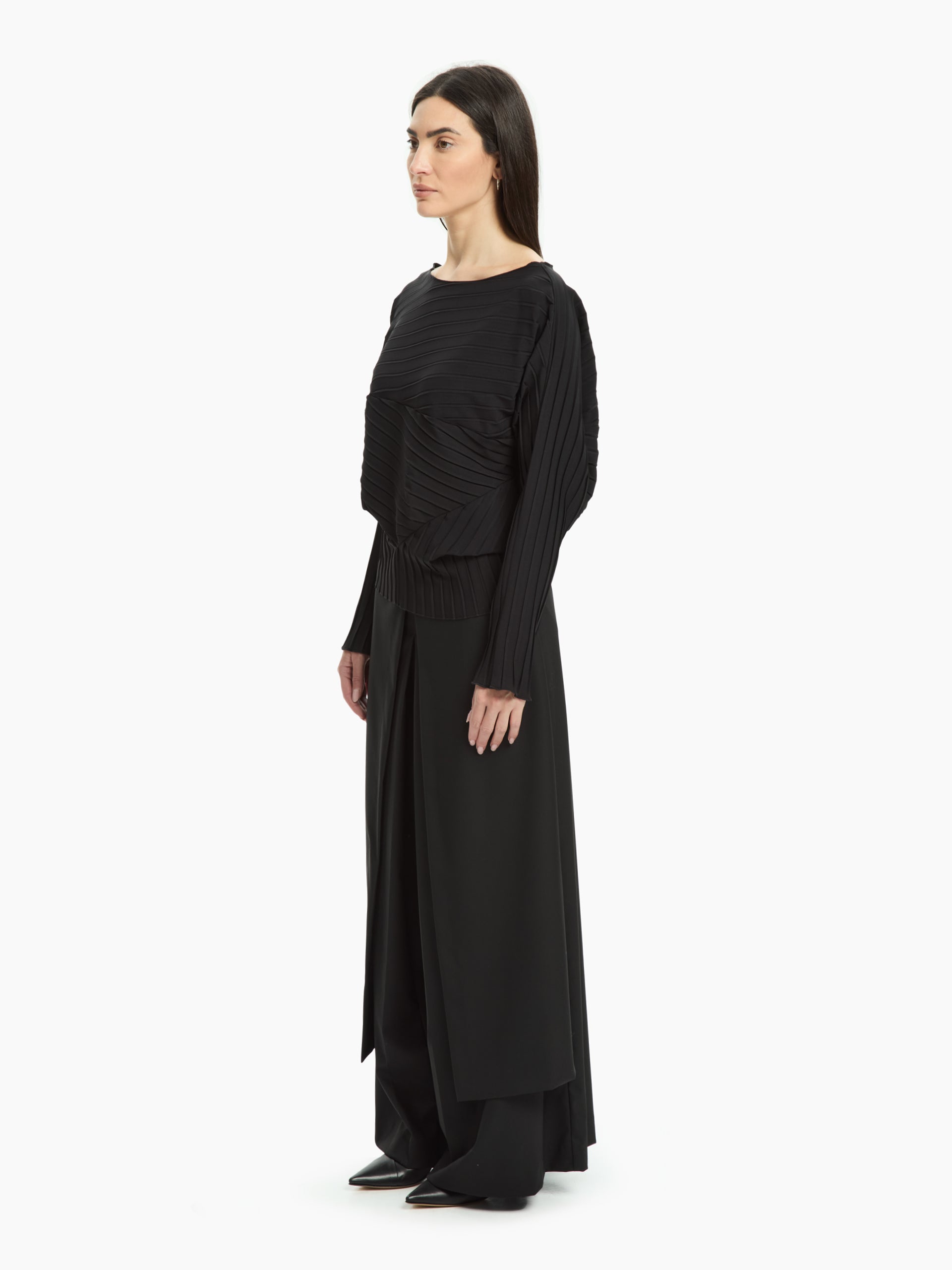 Un capo dal design scultoreo e raffinato. Le pieghe diagonali creano volumi morbidi e dinamici, ridefinendo la silhouette con equilibrio e movimento. L’ampiezza del corpo contrasta con la linea più aderente del fondo, per un effetto architettonico ma disinvolto, ideale per look urbani dal carattere distintivo.