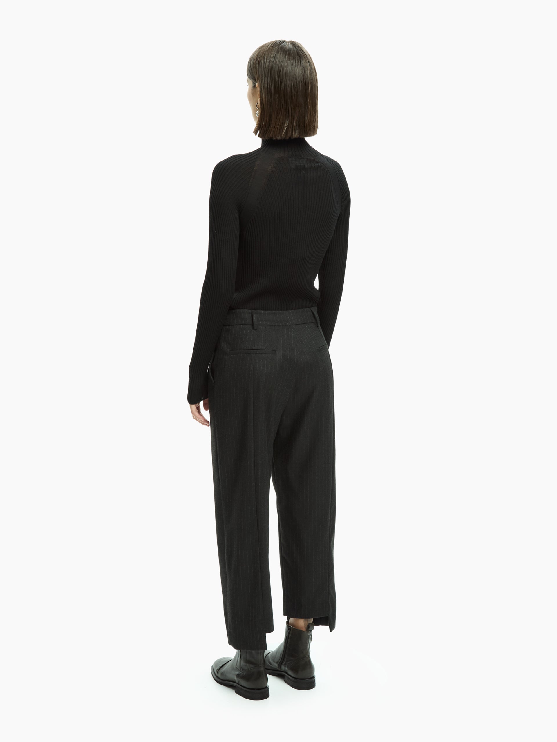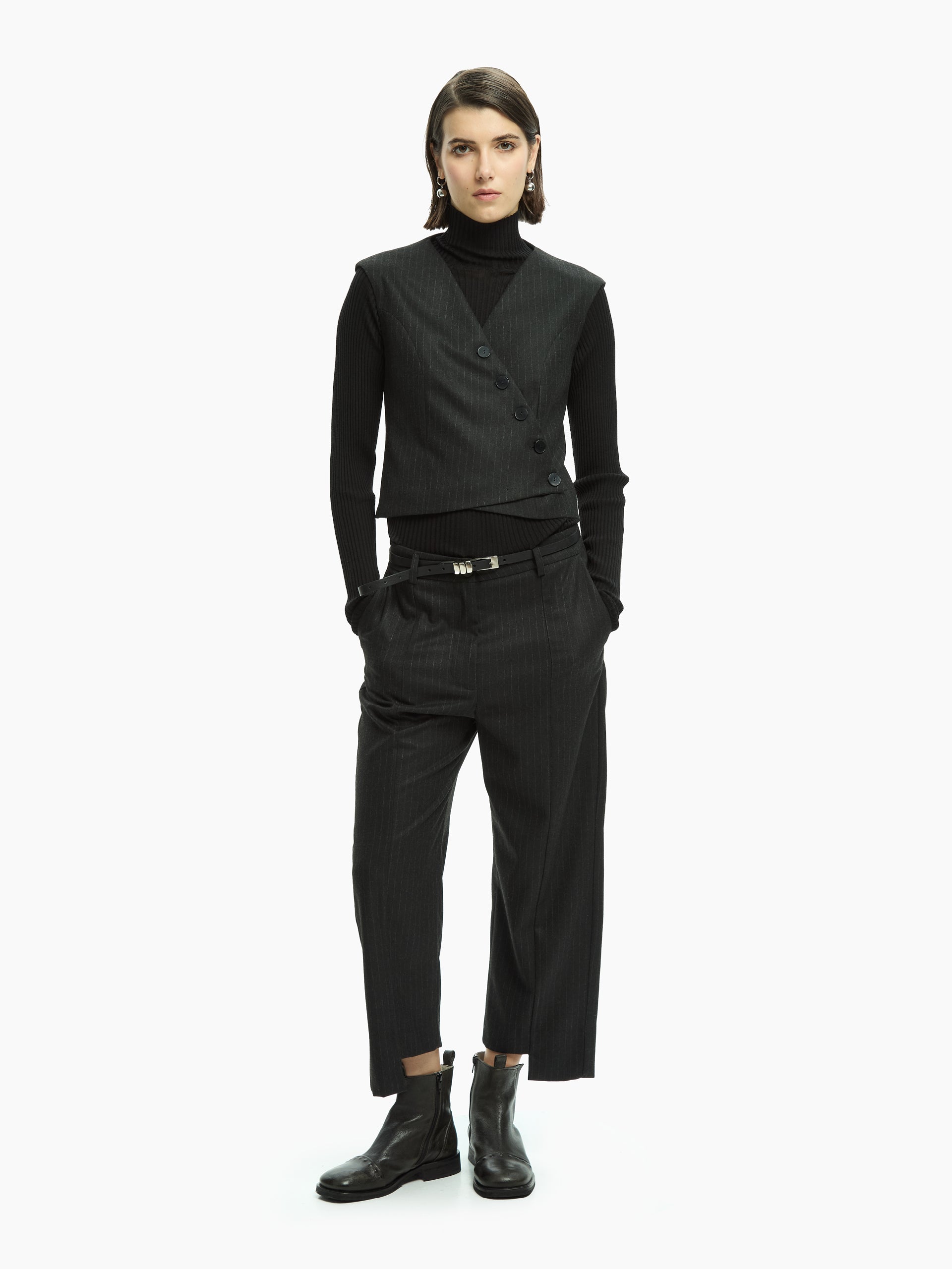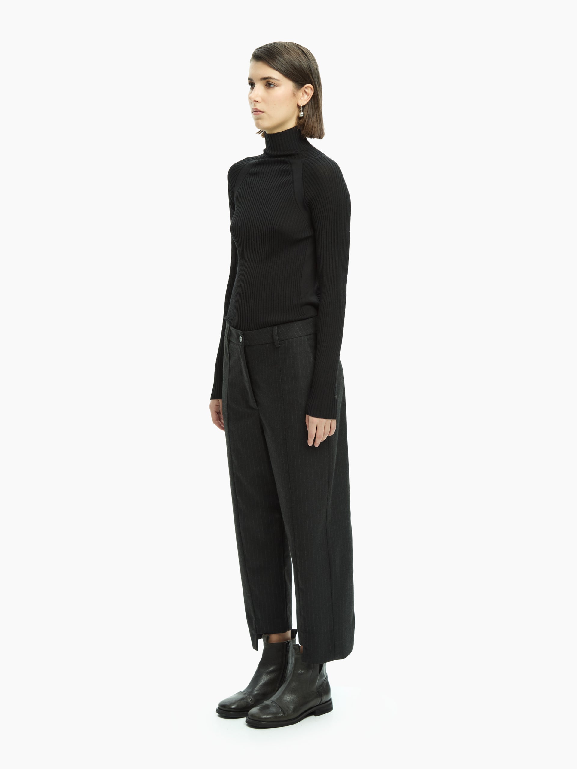 Pantalone dal design pulito e rigoroso, ispirato alla sartorialità classica rivisitata in chiave contemporanea. La silhouette dritta accompagna la figura con equilibrio, mentre i dettagli discreti definiscono un’estetica sobria e raffinata.