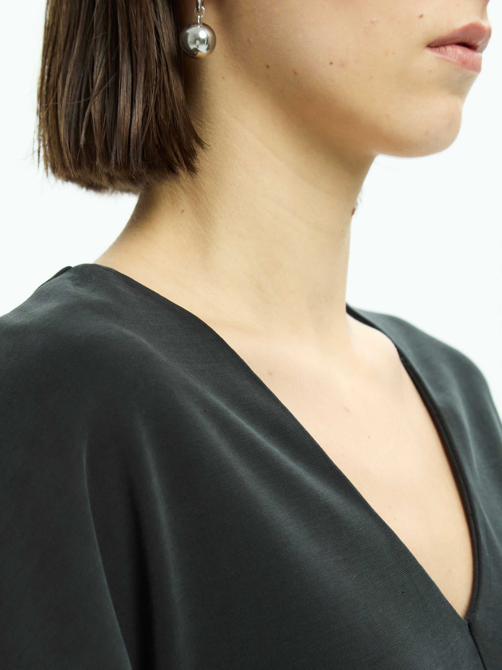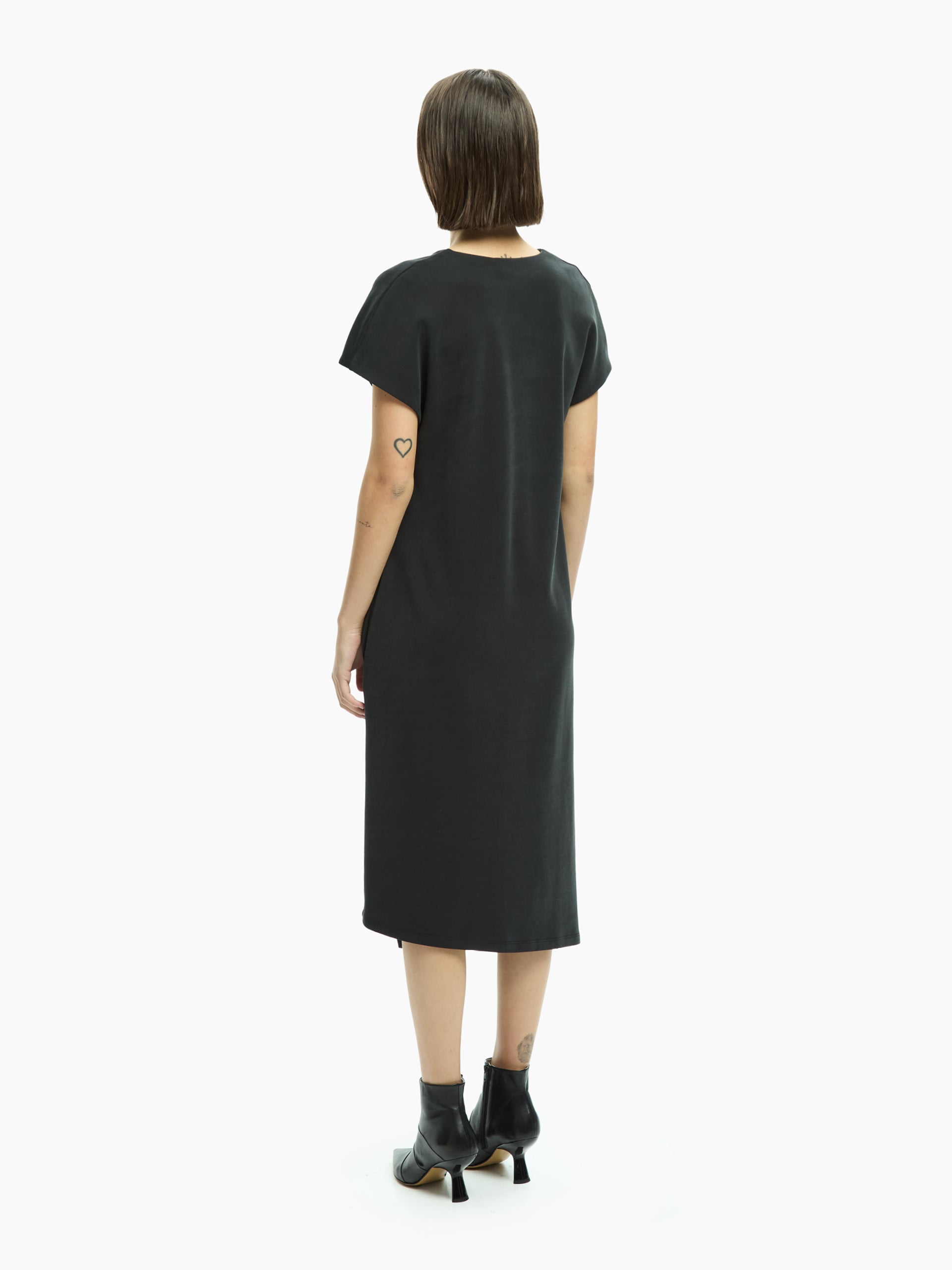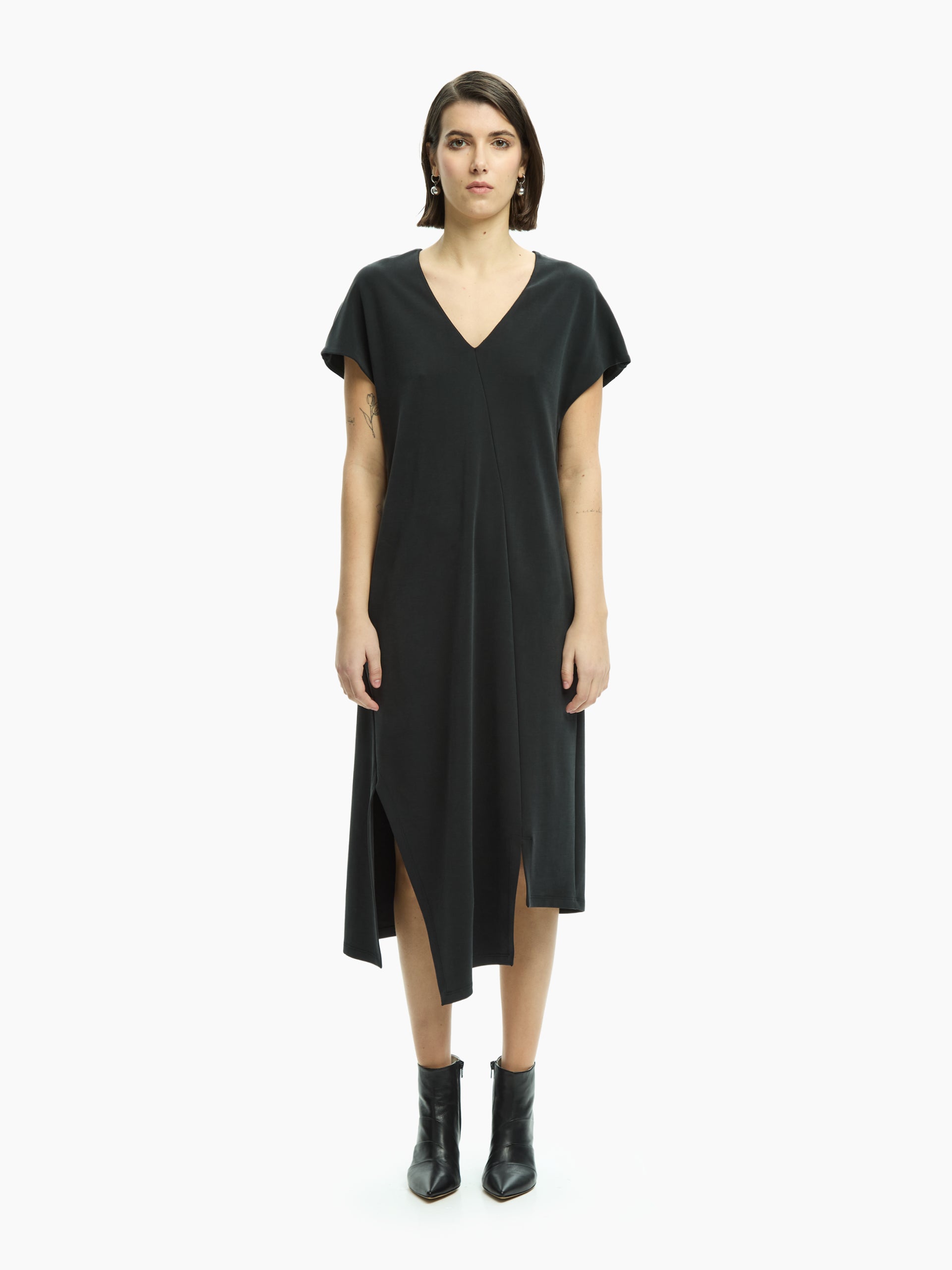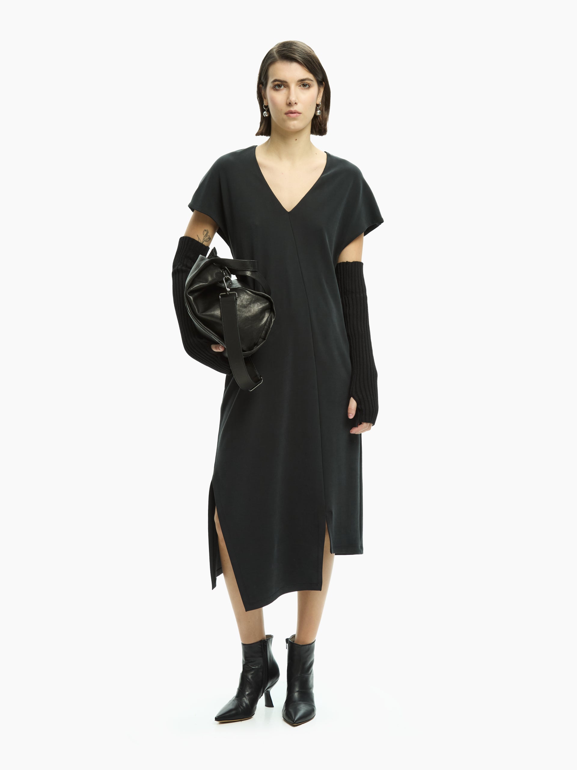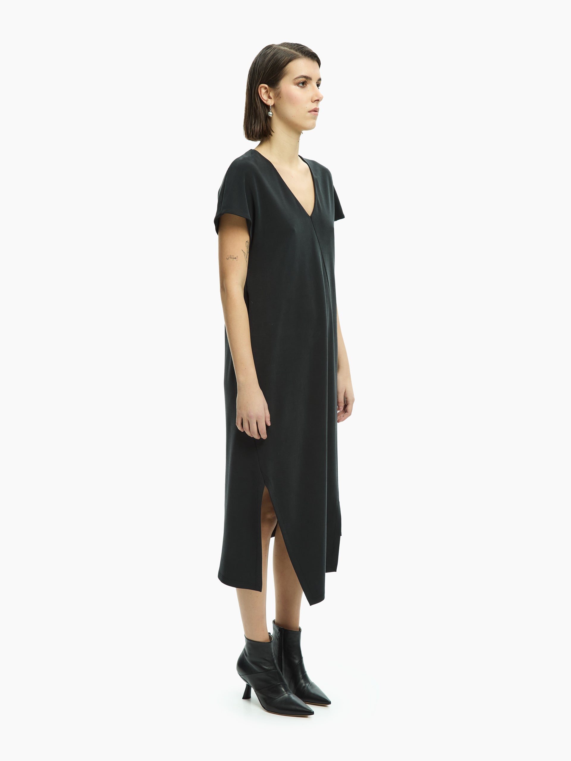 A garment that interprets simplicity with fluid, contemporary elegance. The deep V-neck defines a clean, feminine line, while the linear construction naturally accompanies the body. The side slits introduce movement and lightness, breaking up the rigidity of the shape and enhancing the walk.
