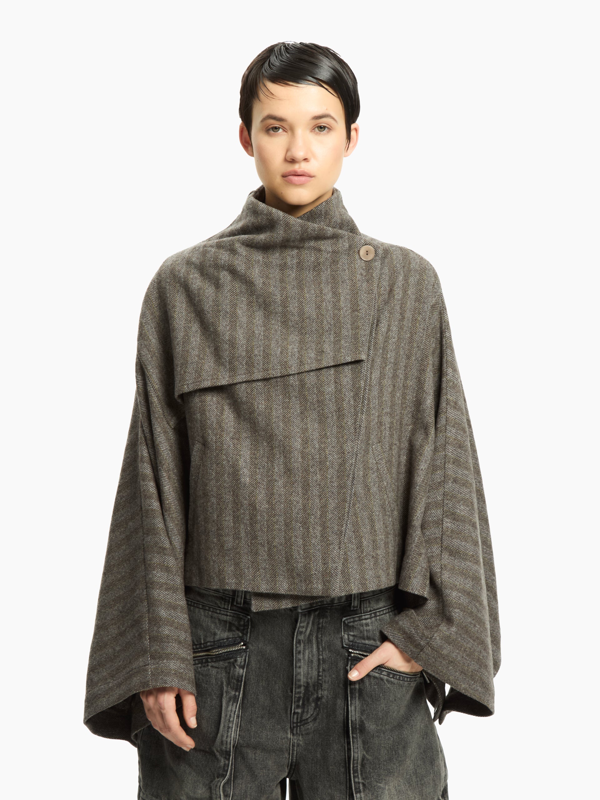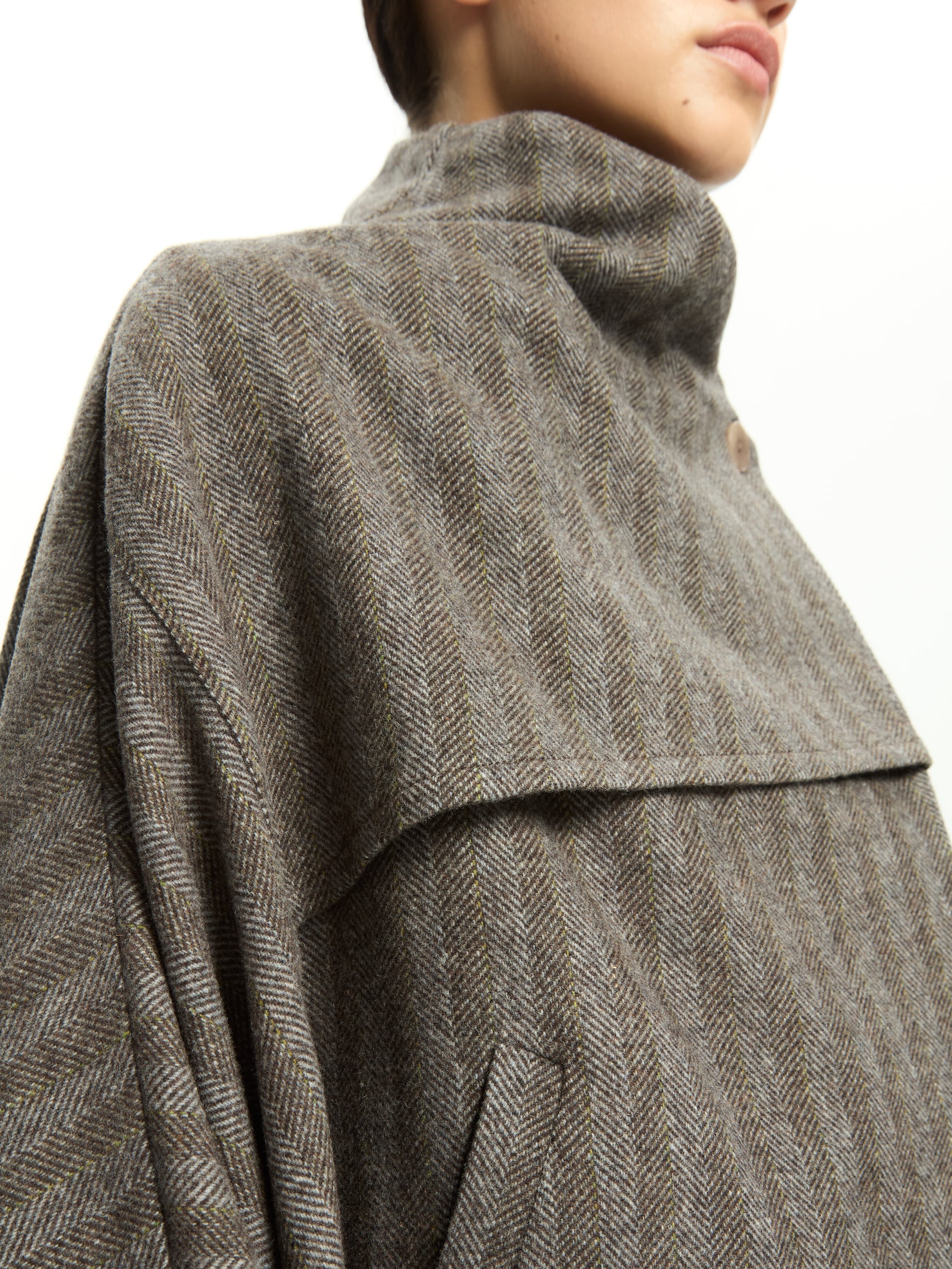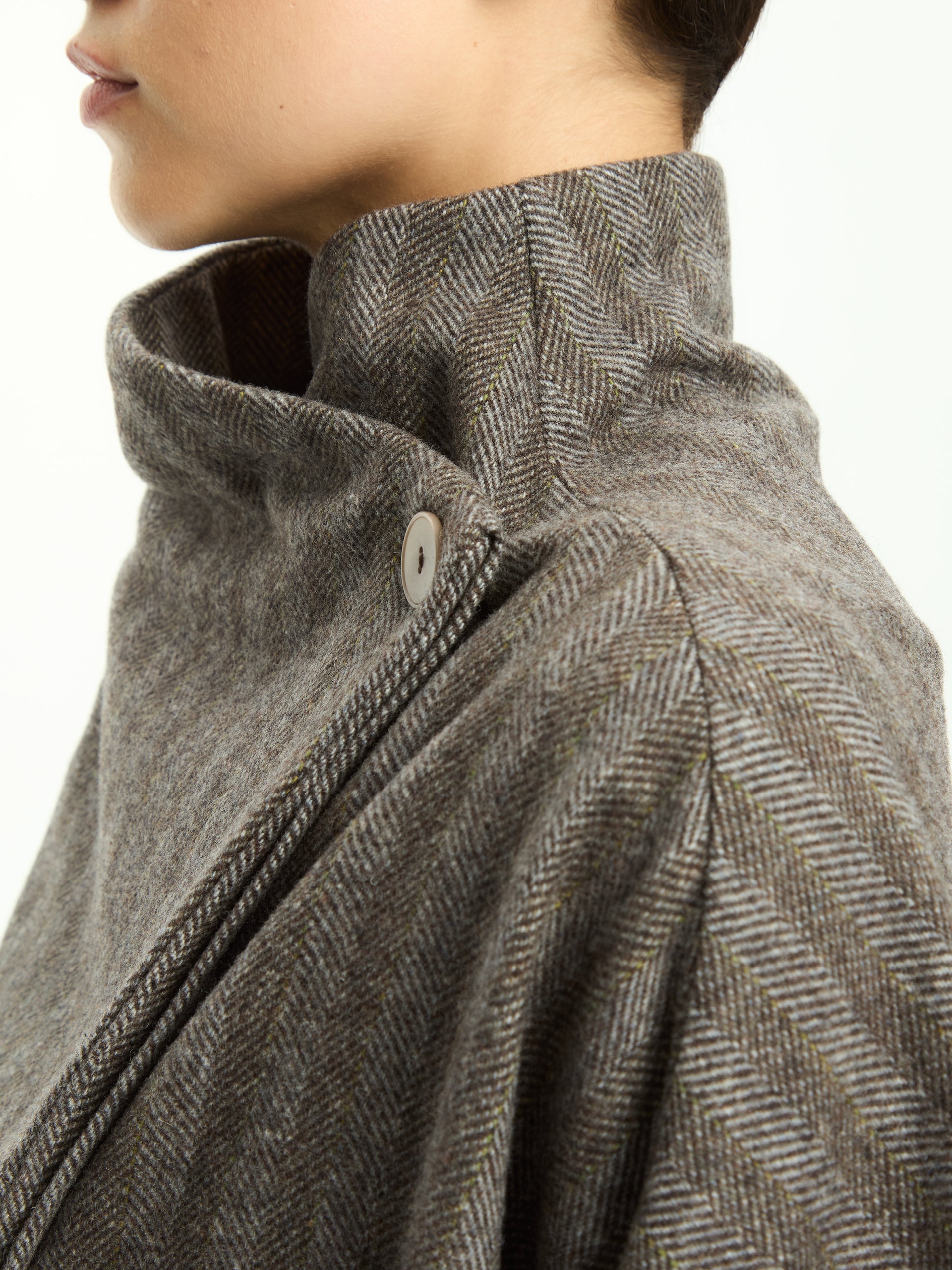 Wool fabric cape with a herringbone pattern, designed for relaxed, contemporary elegance. The loose, enveloping design features a high collar with button closure and an asymmetrical cut at the front, which adds movement and personality. The wide sleeves and flowing line offer comfort and freedom, making it perfect for layering in seasonal looks.